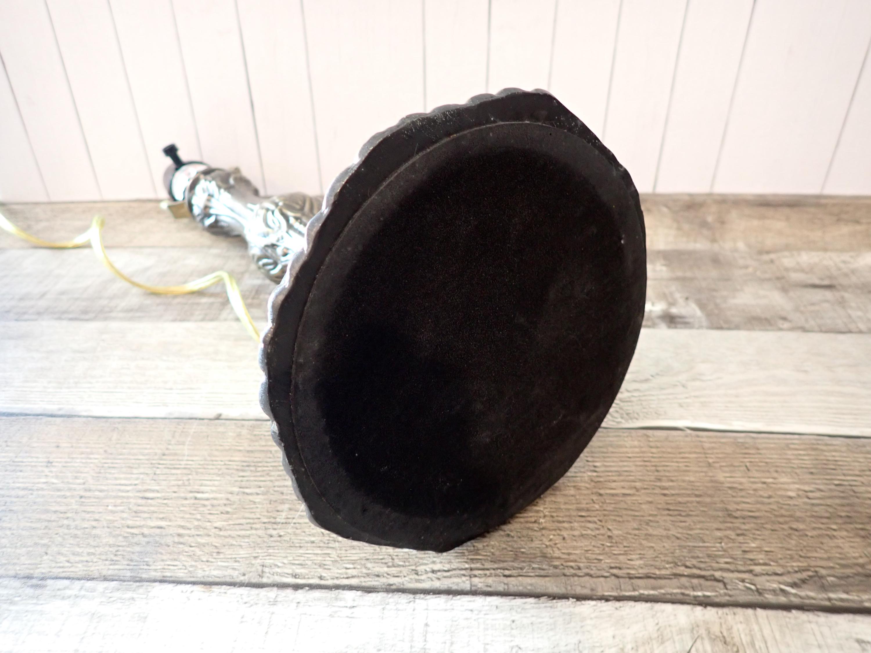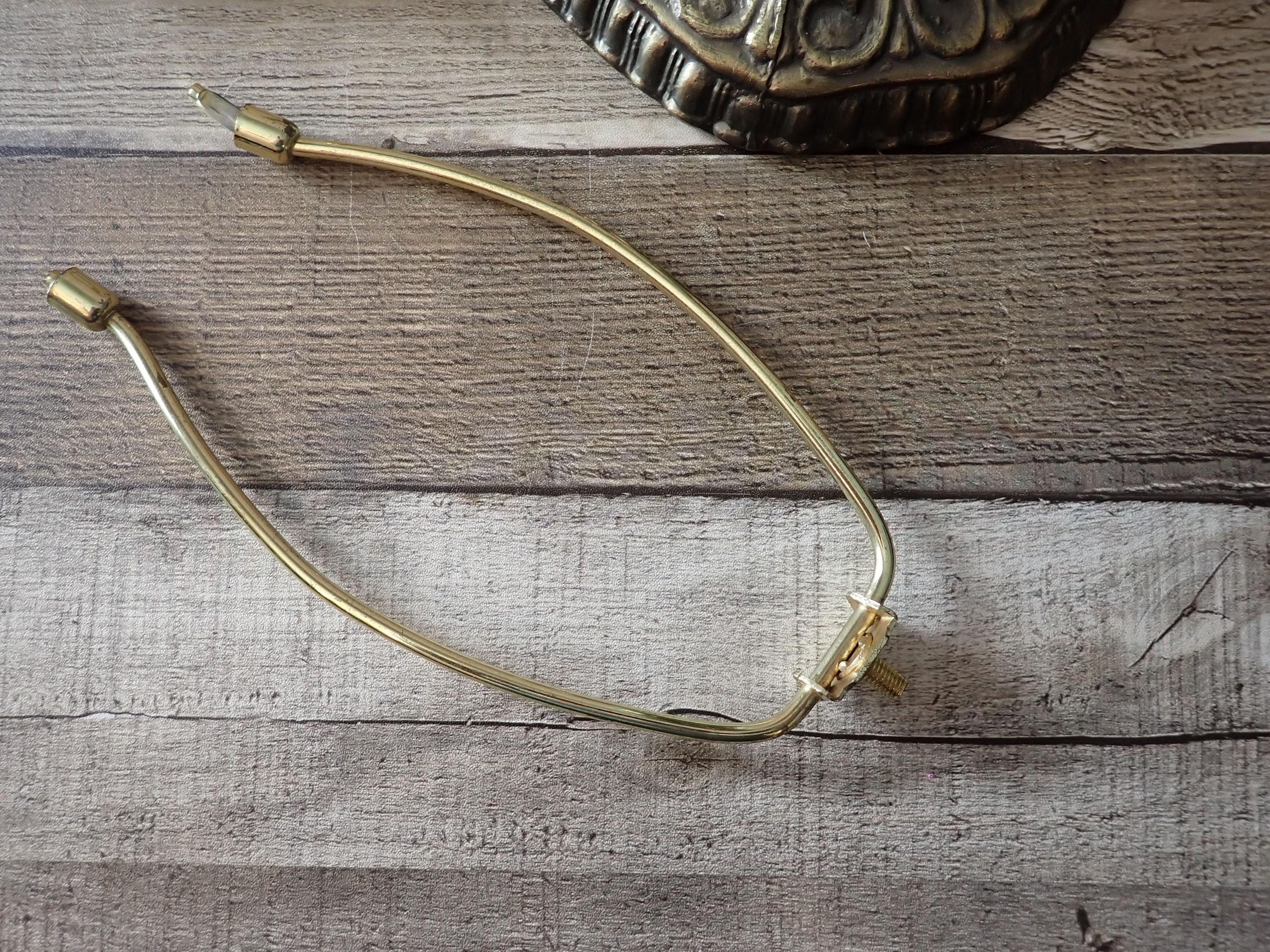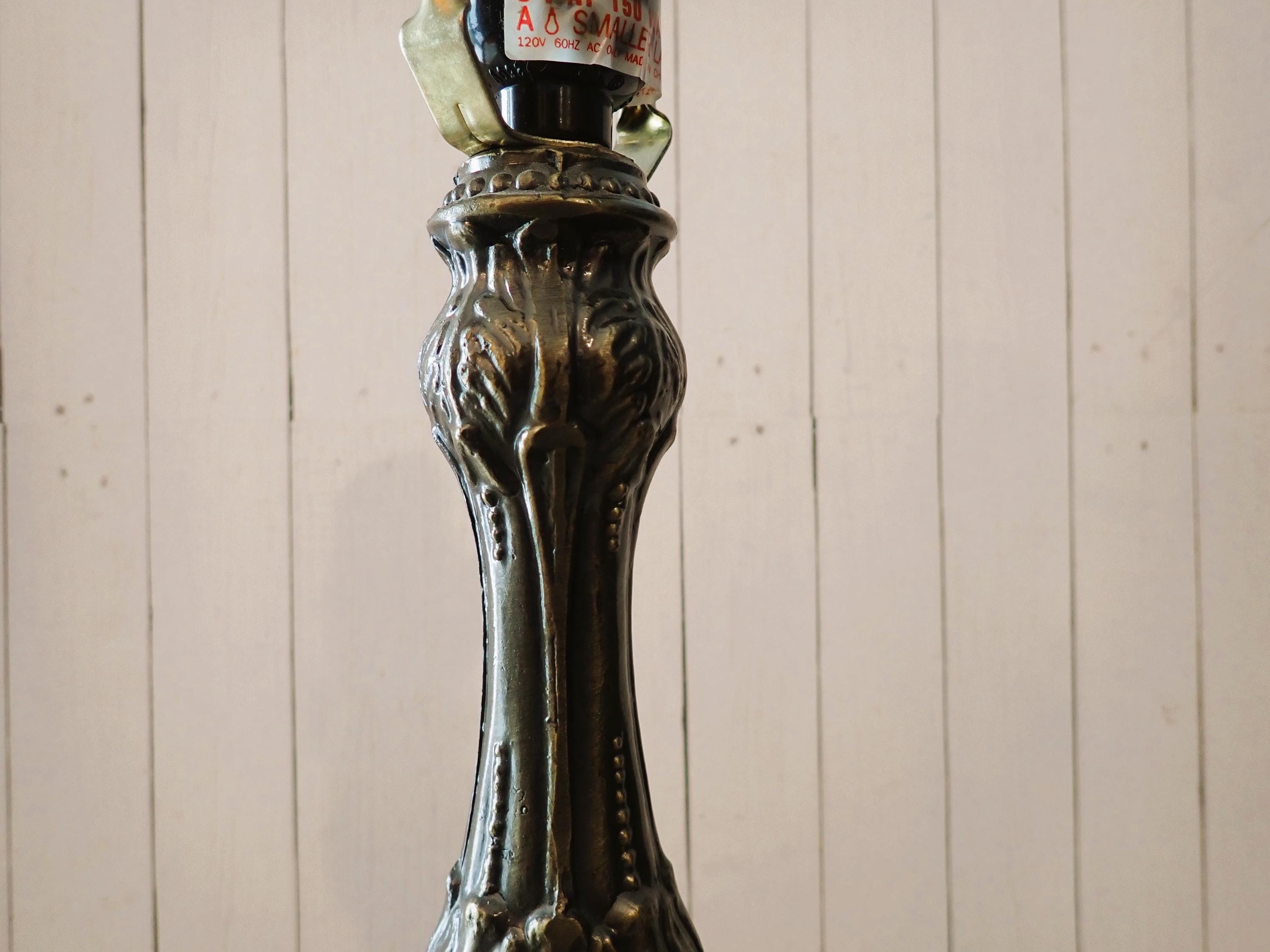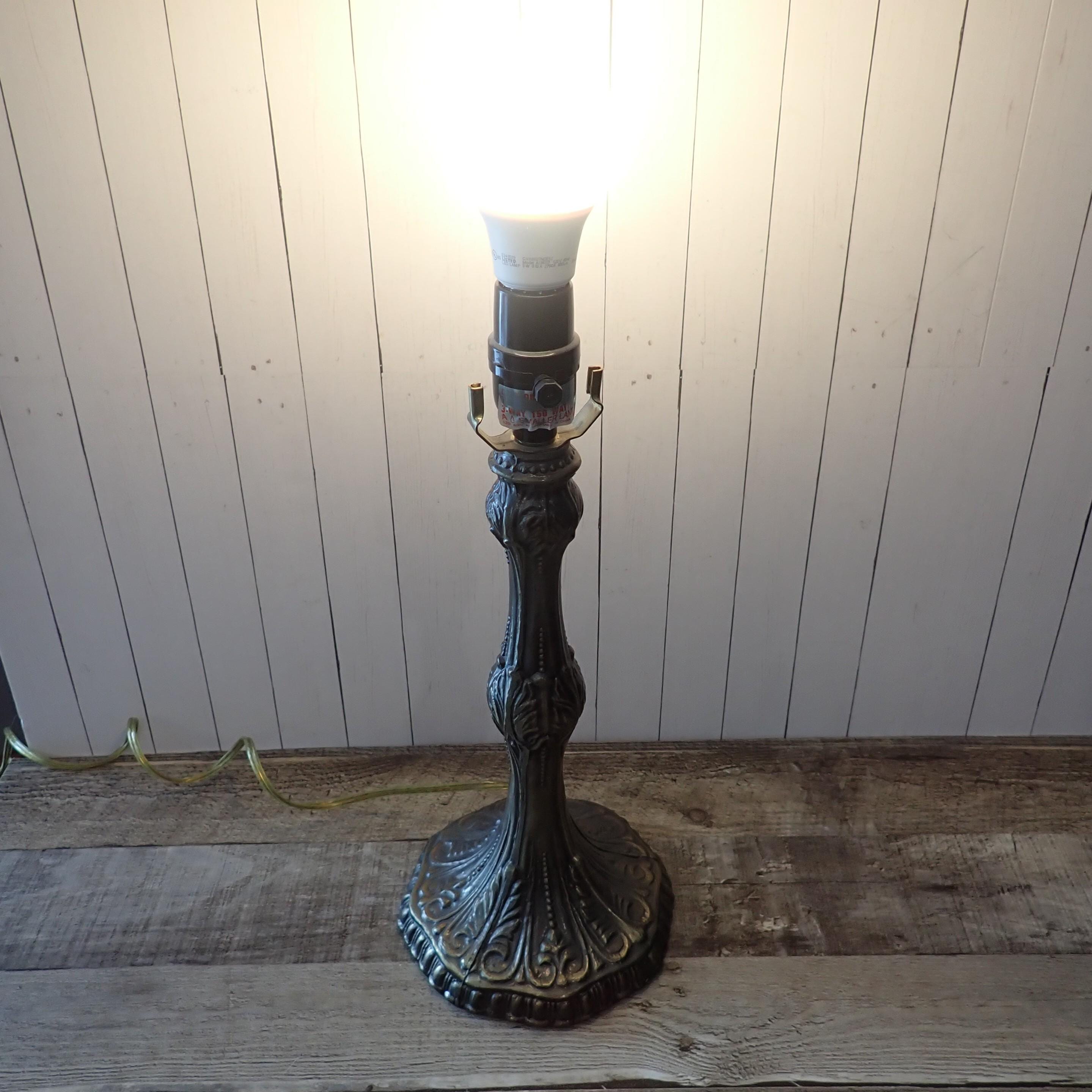 This aged bronze colored metal lamp base is a Tiffany style lamp with Art Nouveau botanical leaf designs. The base is 6.5" in diameter and is 15" tall to the top of the lamp itself (the light bulb holder.) The lamp includes a gold clamp-on shade holder but there is no finial. The height of the lamp from base to the top of the shade holder is 21" tall. The lamp is an aged bronze color and has an ornate leaf design on the base and body of the lamp. The lamp has a yellow/gold electrical cord and a round click switch. The lamp is in very nice condition and in working order. There is NO shade with this lamp.