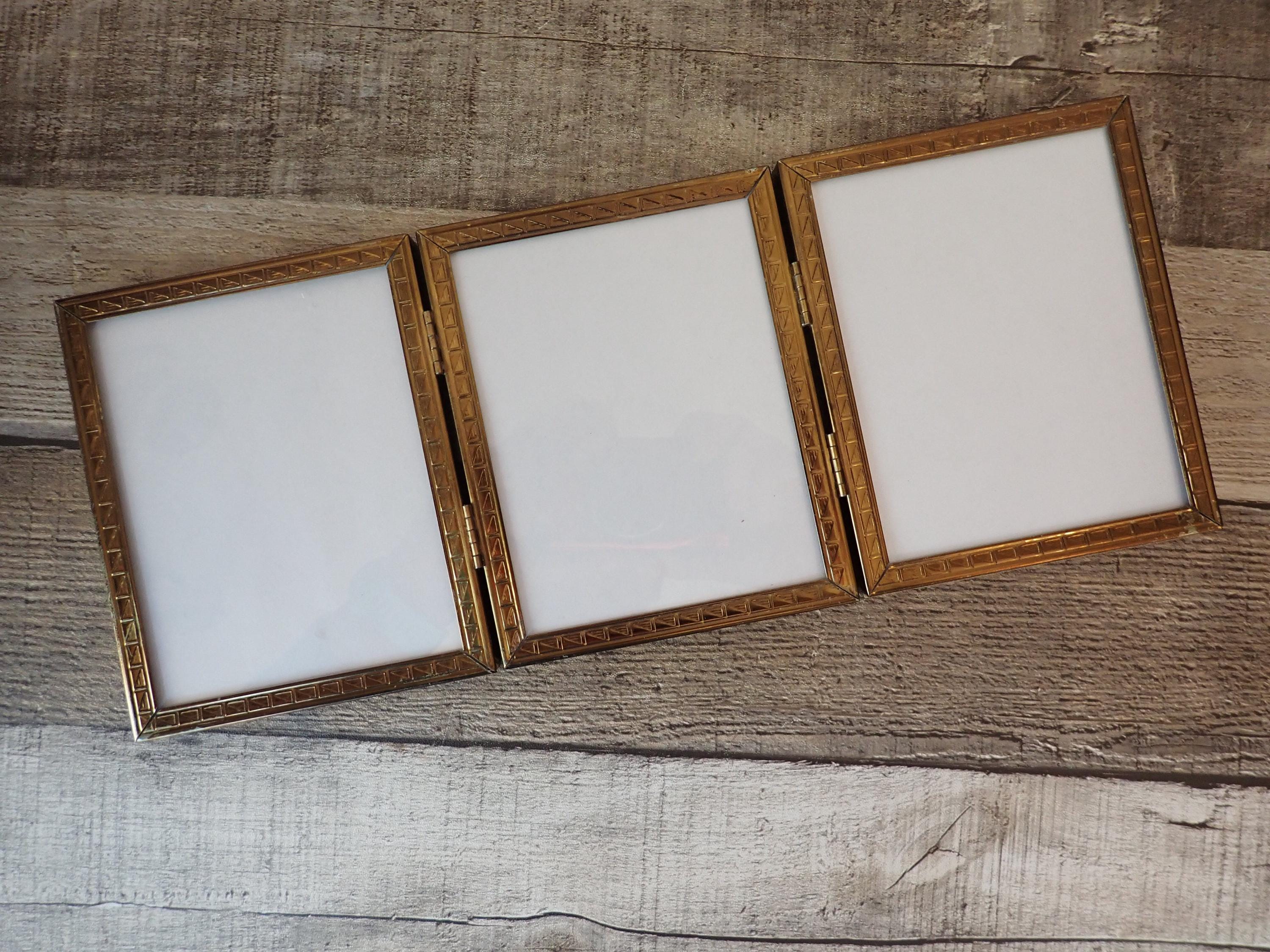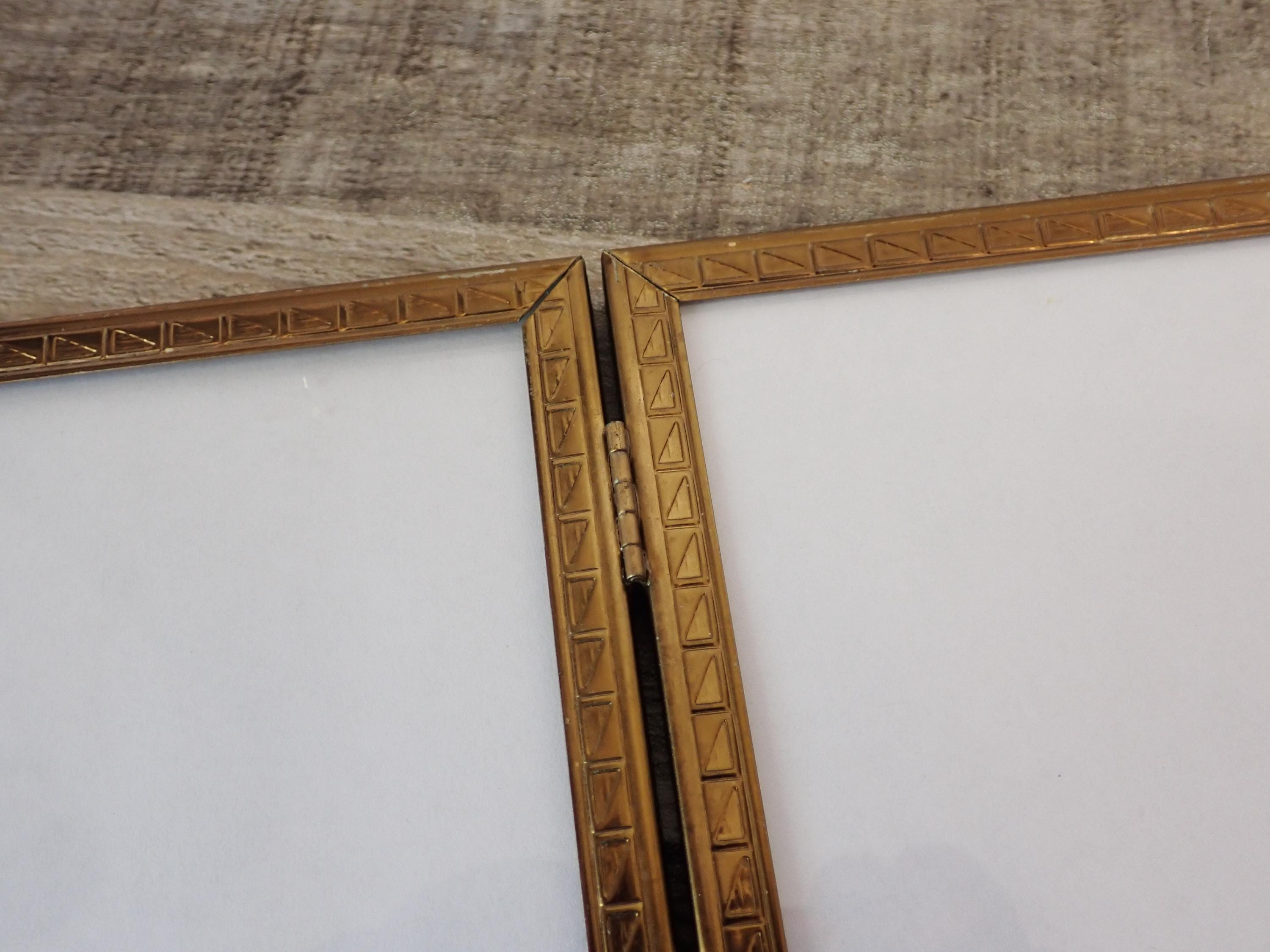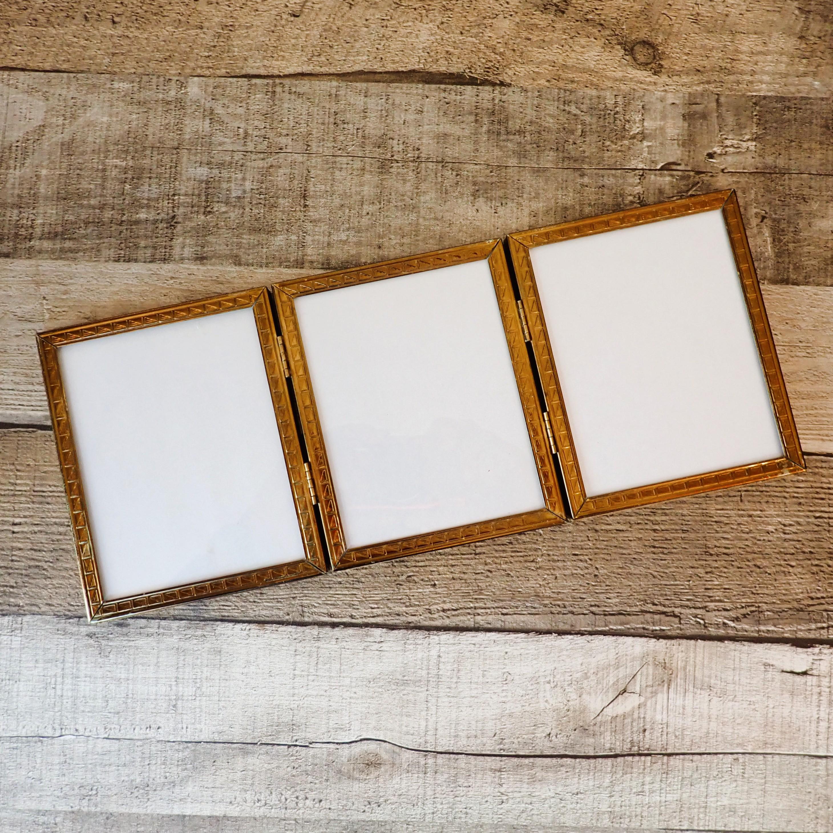 This 4x5 brass colored metal photo frames is a 3-part hinged frame with 3 4x5 frames. The frame is nicely detailed with etched designs along the front and sides of the frames. The frame is in very nice condition with no damage, and has clear glass inserts over the photo openings and cardboard backing pieces on all 3 frame sections. There is some wear and tarnish visible on this frame - this is shown in detail in the last 2 photos.