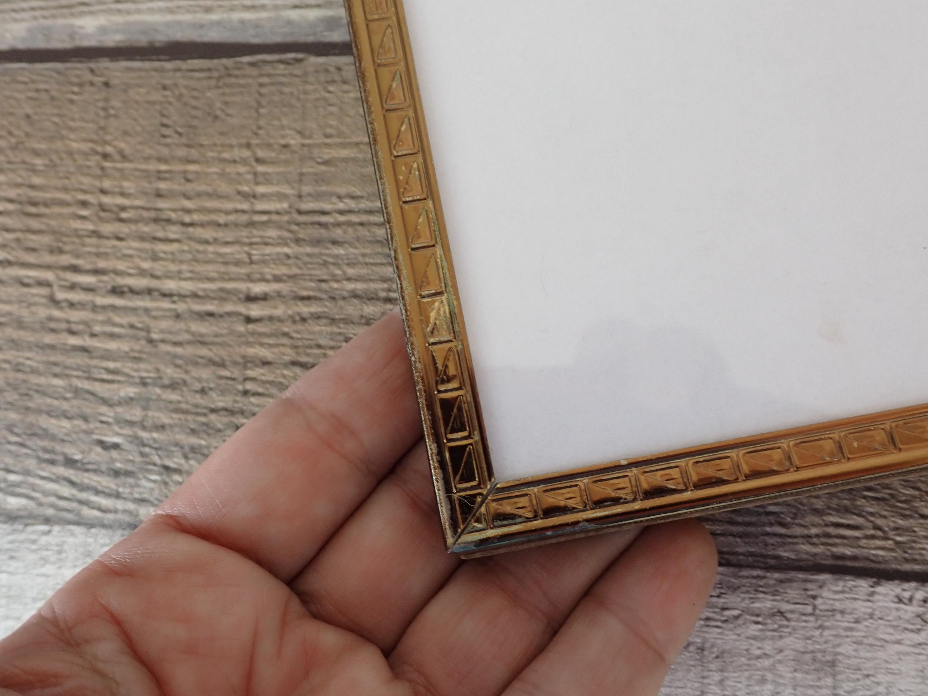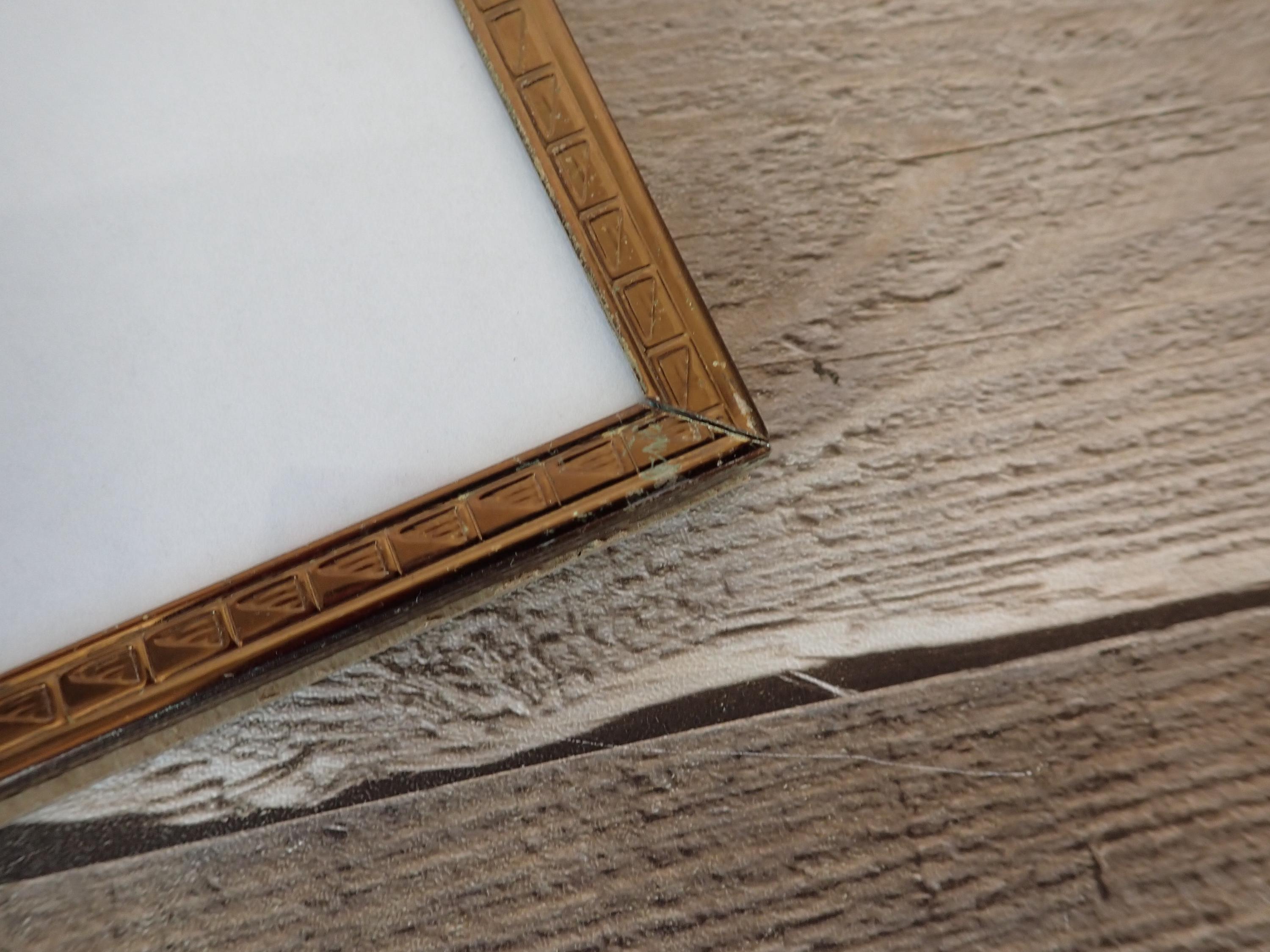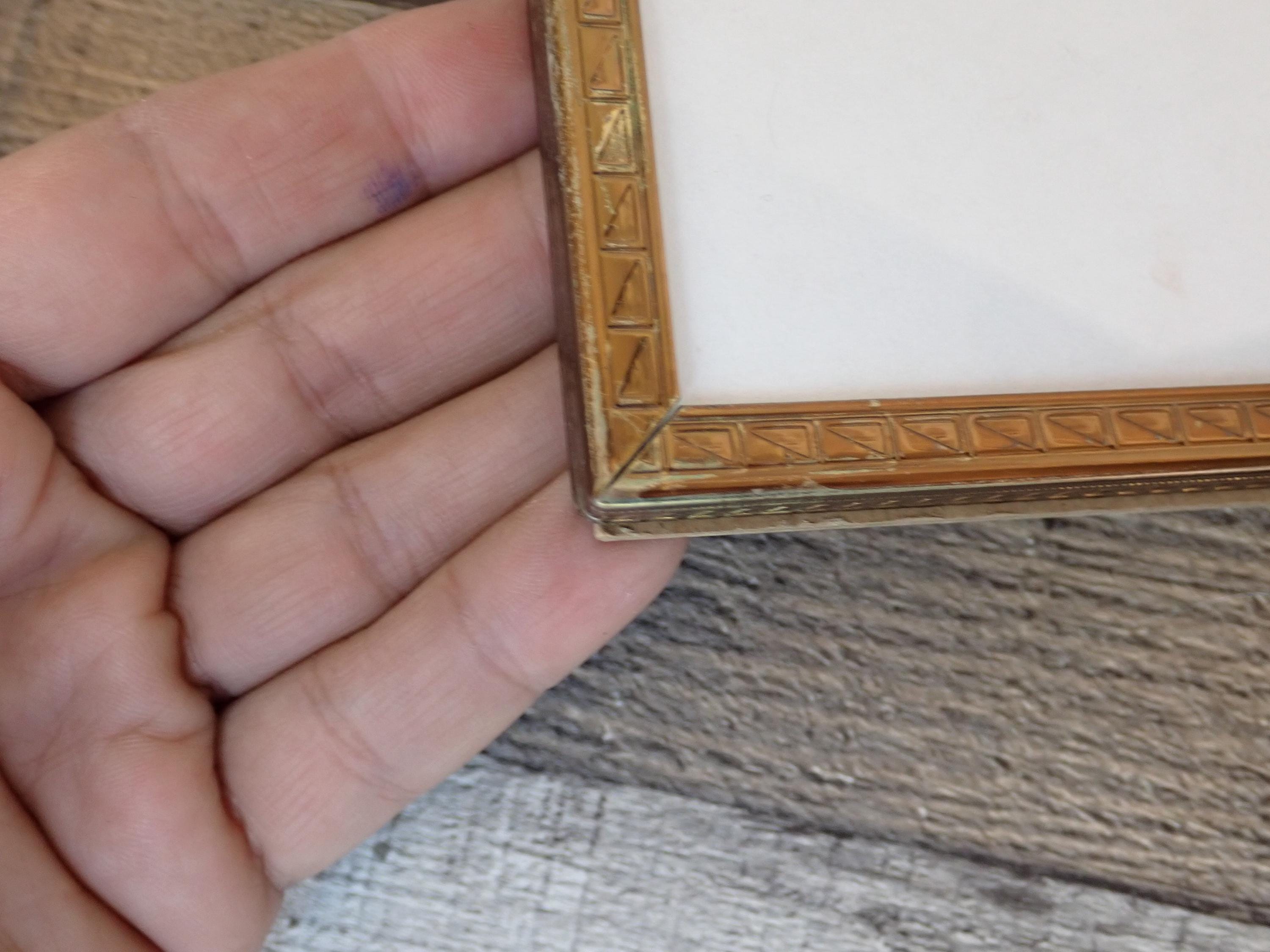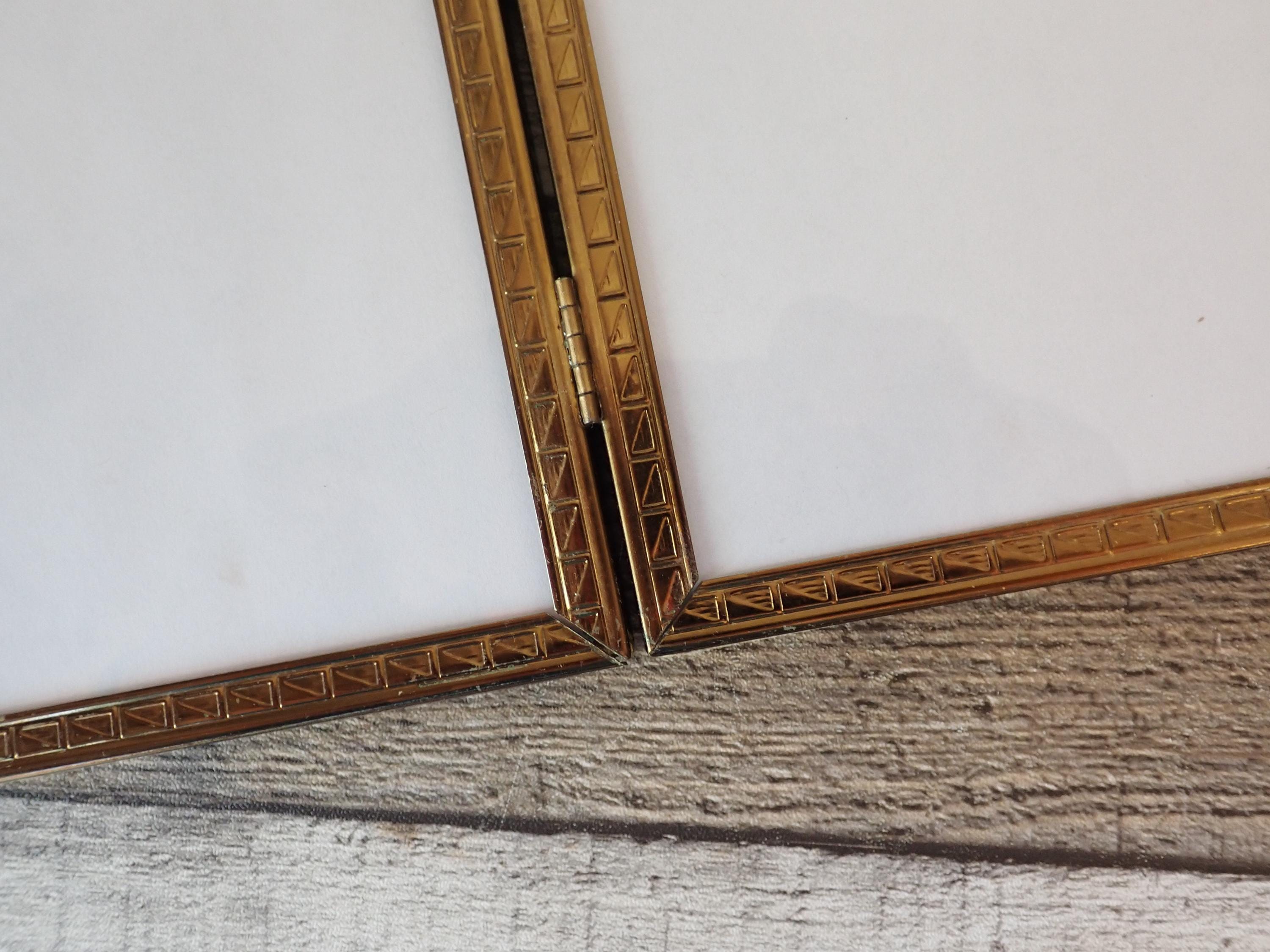 This 4x5 brass colored metal photo frames is a 3-part hinged frame with 3 4x5 frames. The frame is nicely detailed with etched designs along the front and sides of the frames. The frame is in very nice condition with no damage, and has clear glass inserts over the photo openings and cardboard backing pieces on all 3 frame sections. There is some wear and tarnish visible on this frame - this is shown in detail in the last 2 photos.