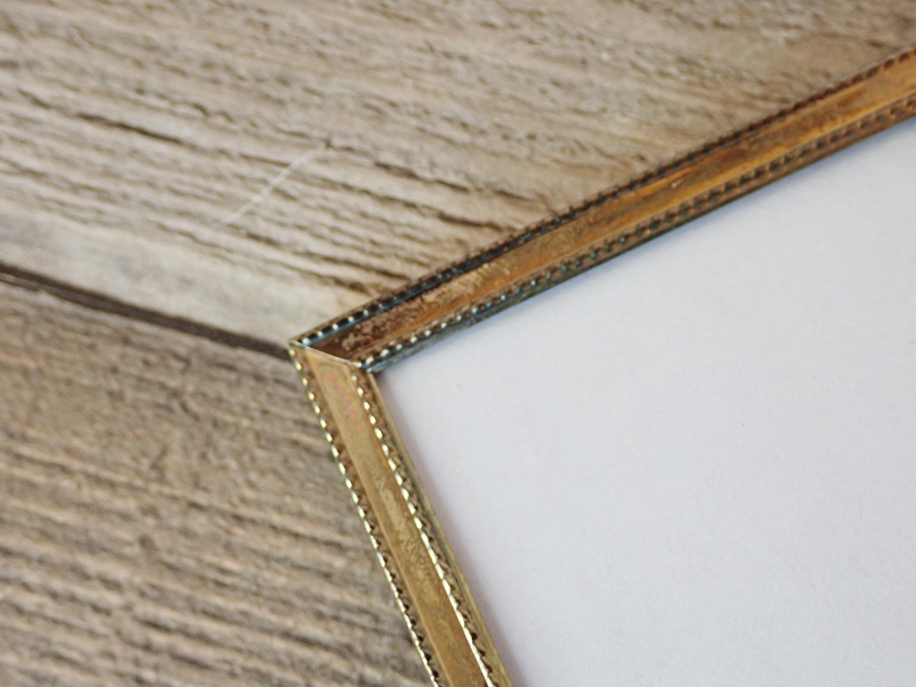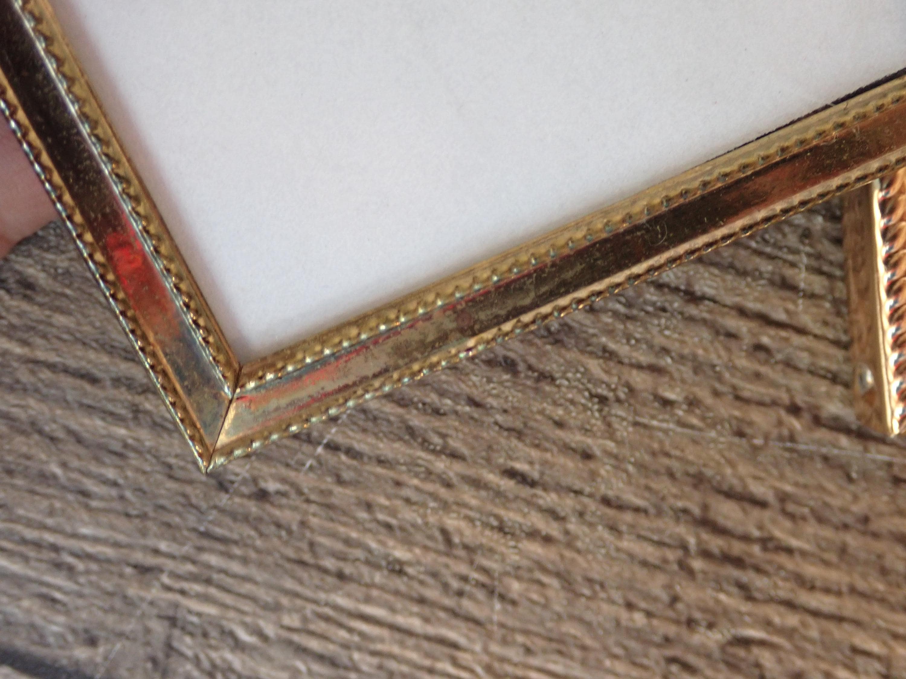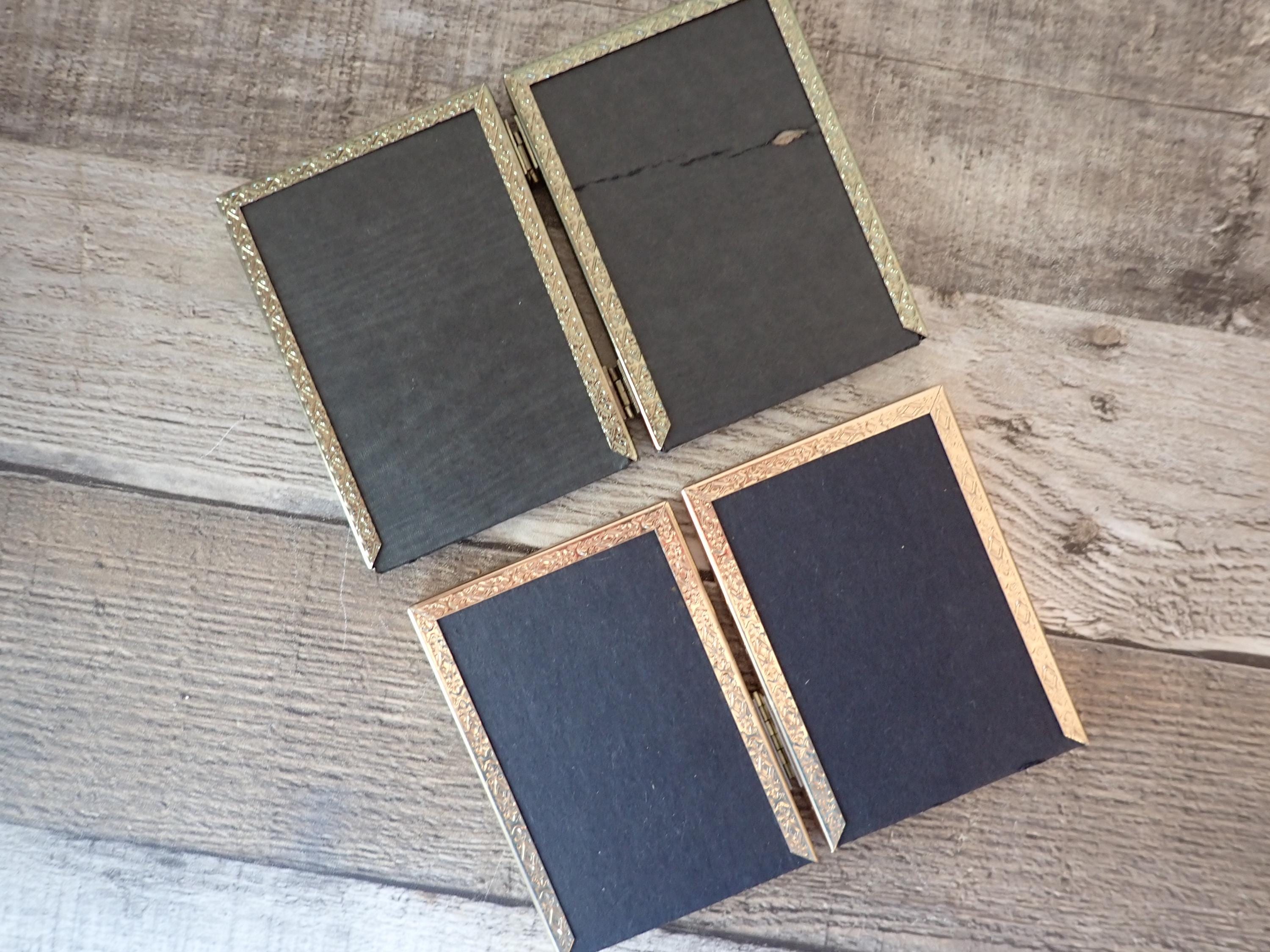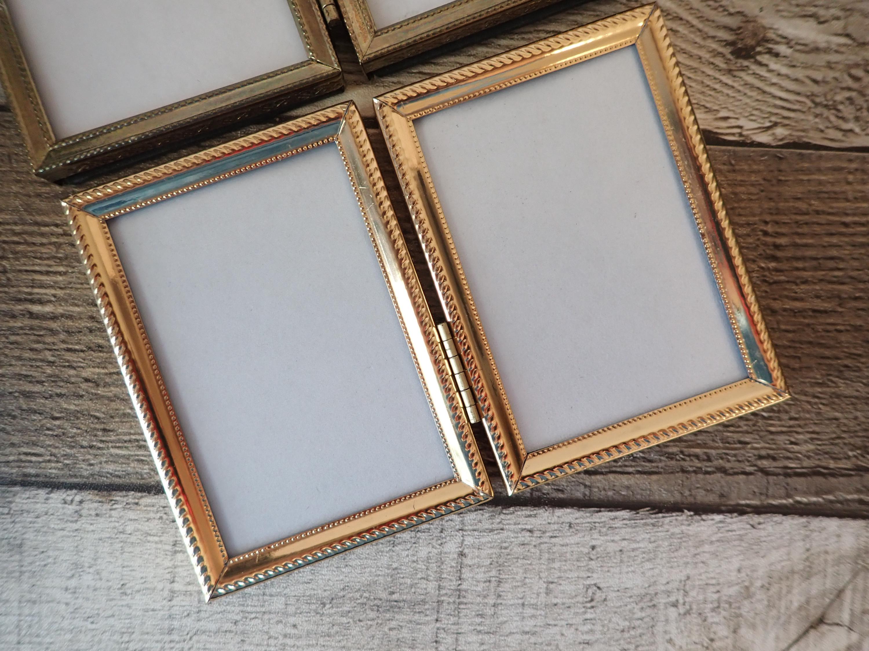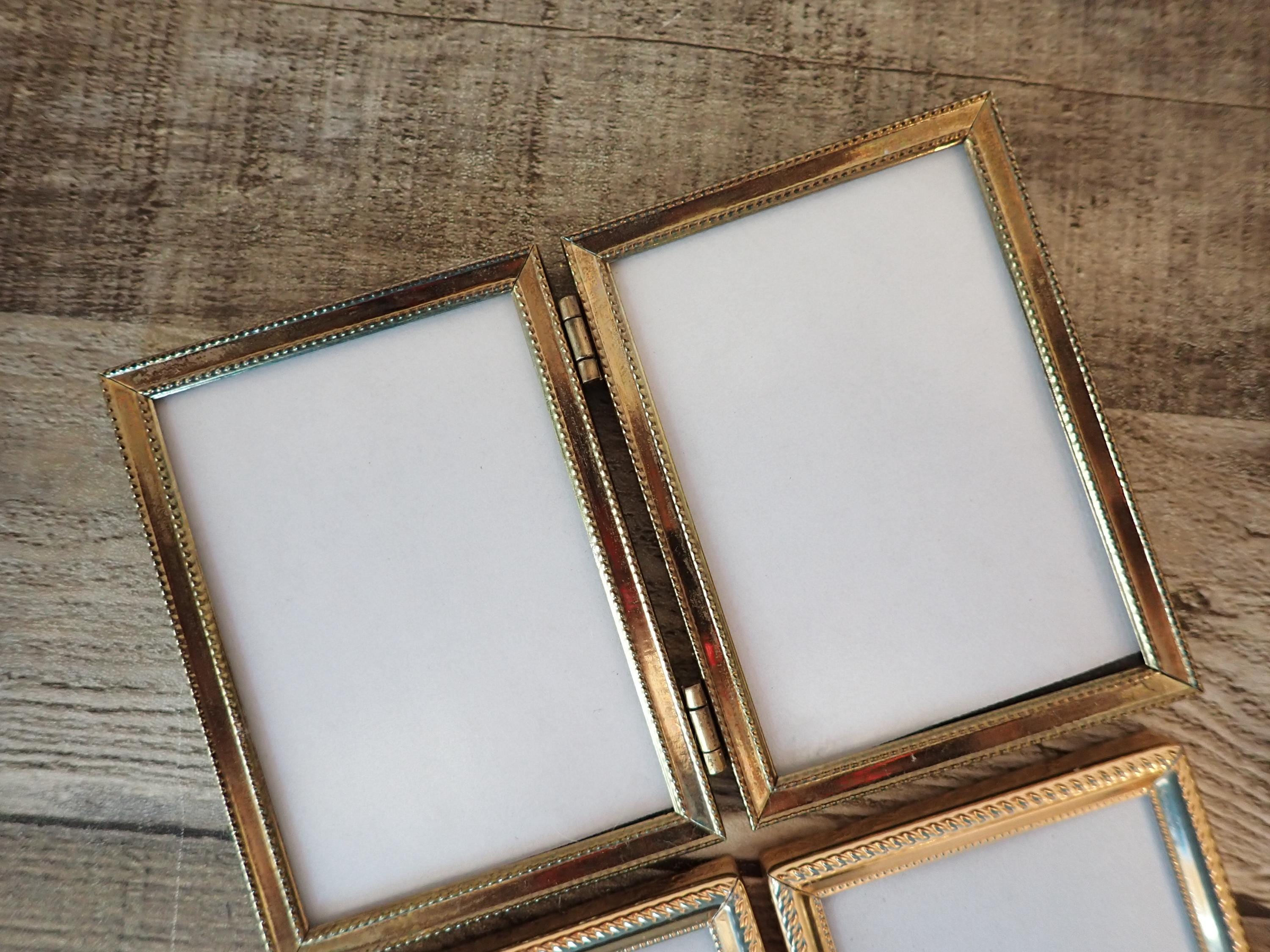 This set of brass colored metal frames includes two 2" x 3" double hinged frames, in different designs and patterns. They are all a golden brass colored metal, and have nicely detailed designs around the edges. The overall dimensions of the frames are 5.25" wide by 3.5" tall. They each have a clear glass insert that covers the photo opening. The frames are in nice condition but do have some light tarnish here and there. Great set of vintage brass frames!