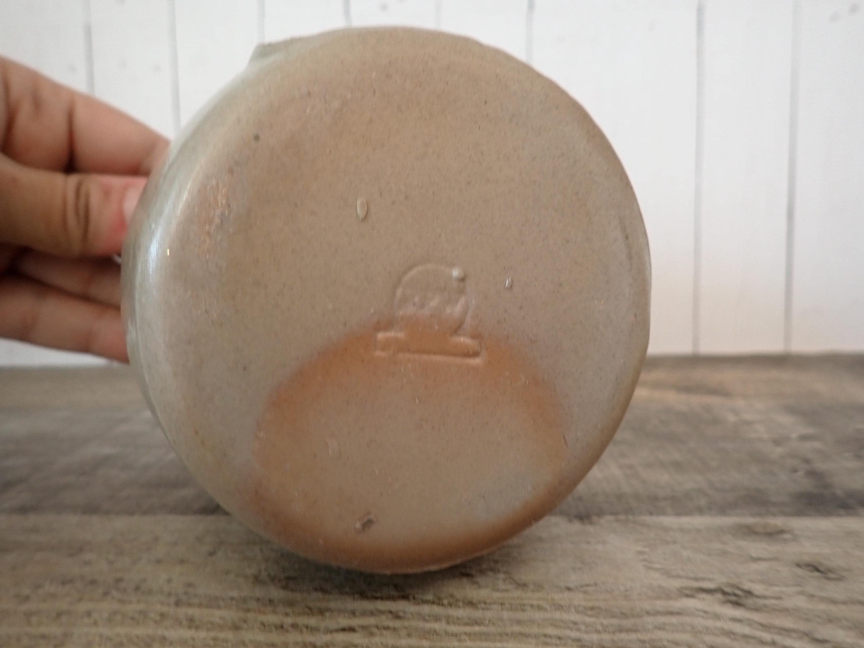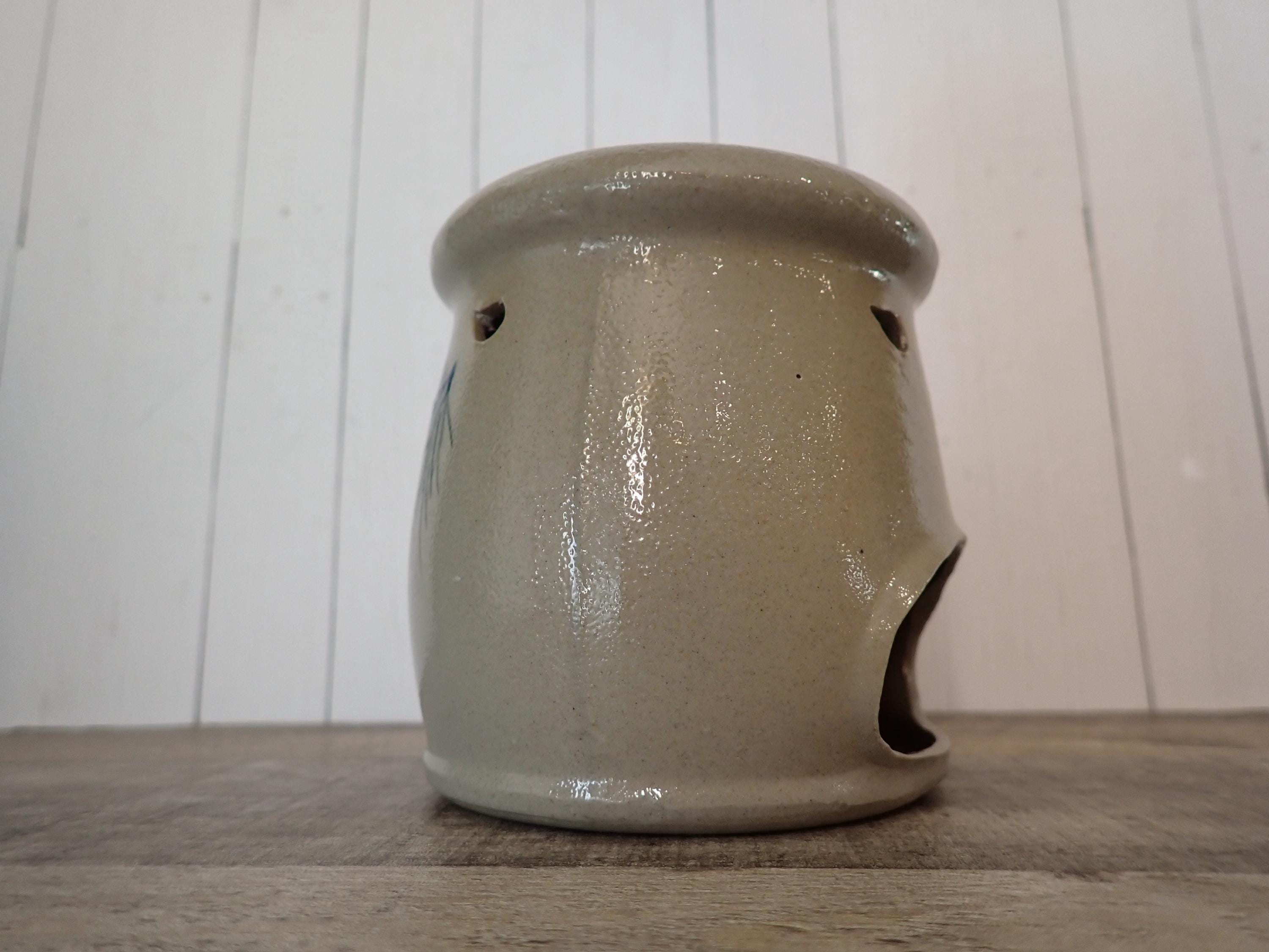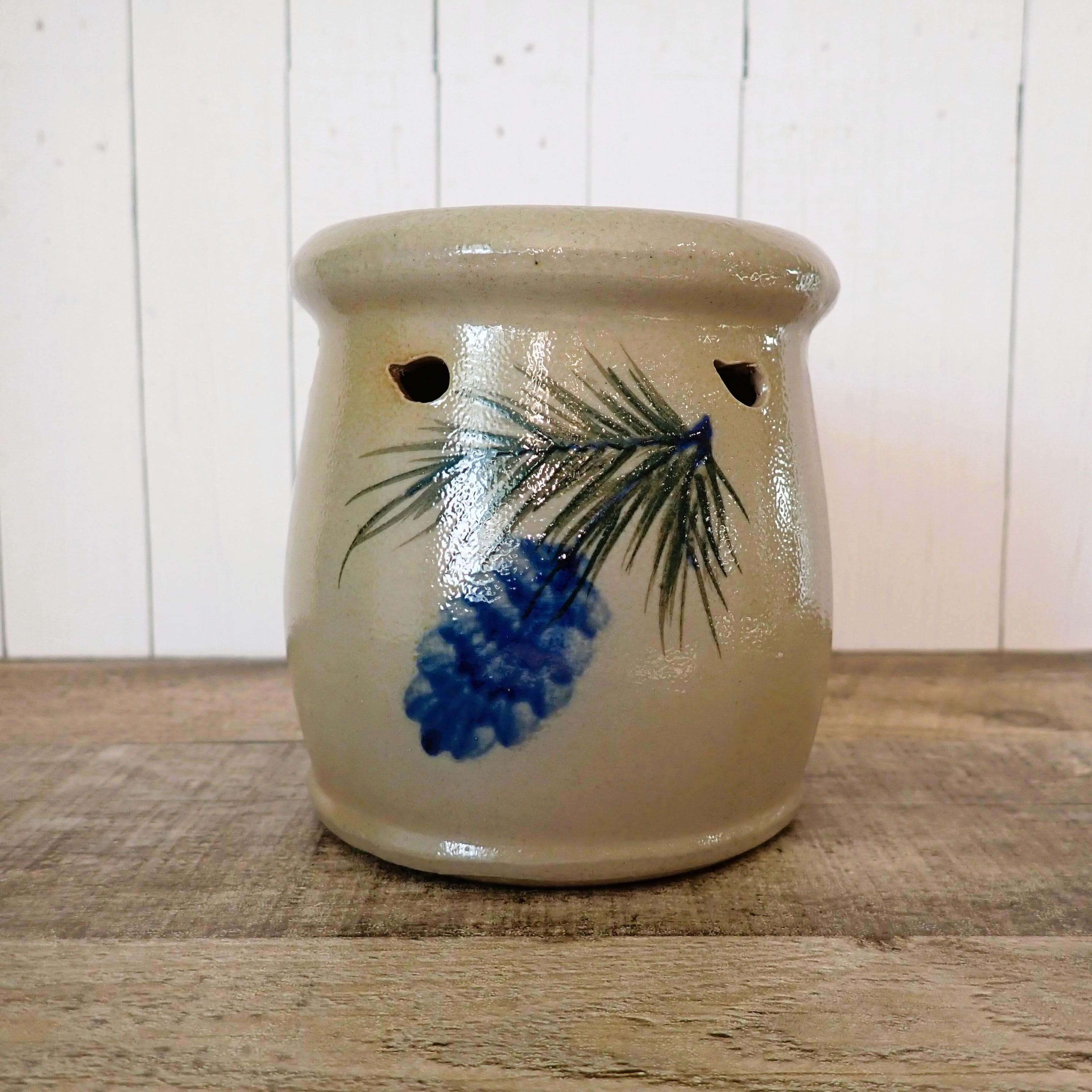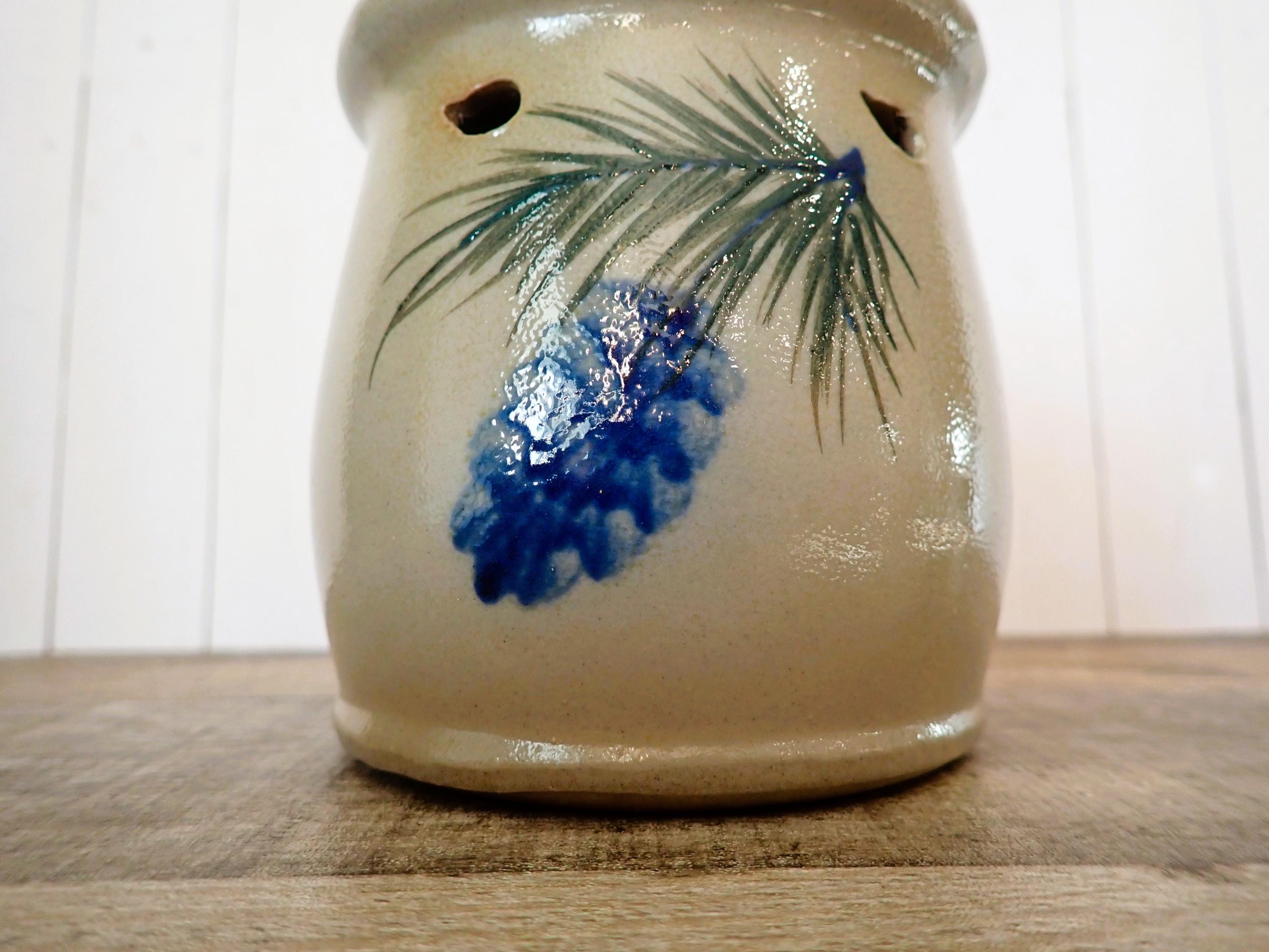 This Rowe Pottery Works wax candle melter is 4.25" tall and 3.75" in diameter. It is a gray/tan stoneware piece, and has a blue pinecone and green evergreen branch on the front. The top of the piece as a wide, round lip for the wax or candle to rest in, and there is an opening on the back to place a candle inside. The bottom of the piece is marked with the Rowe Potter Works logo. The melter is in very good condition with no chips or cracks.