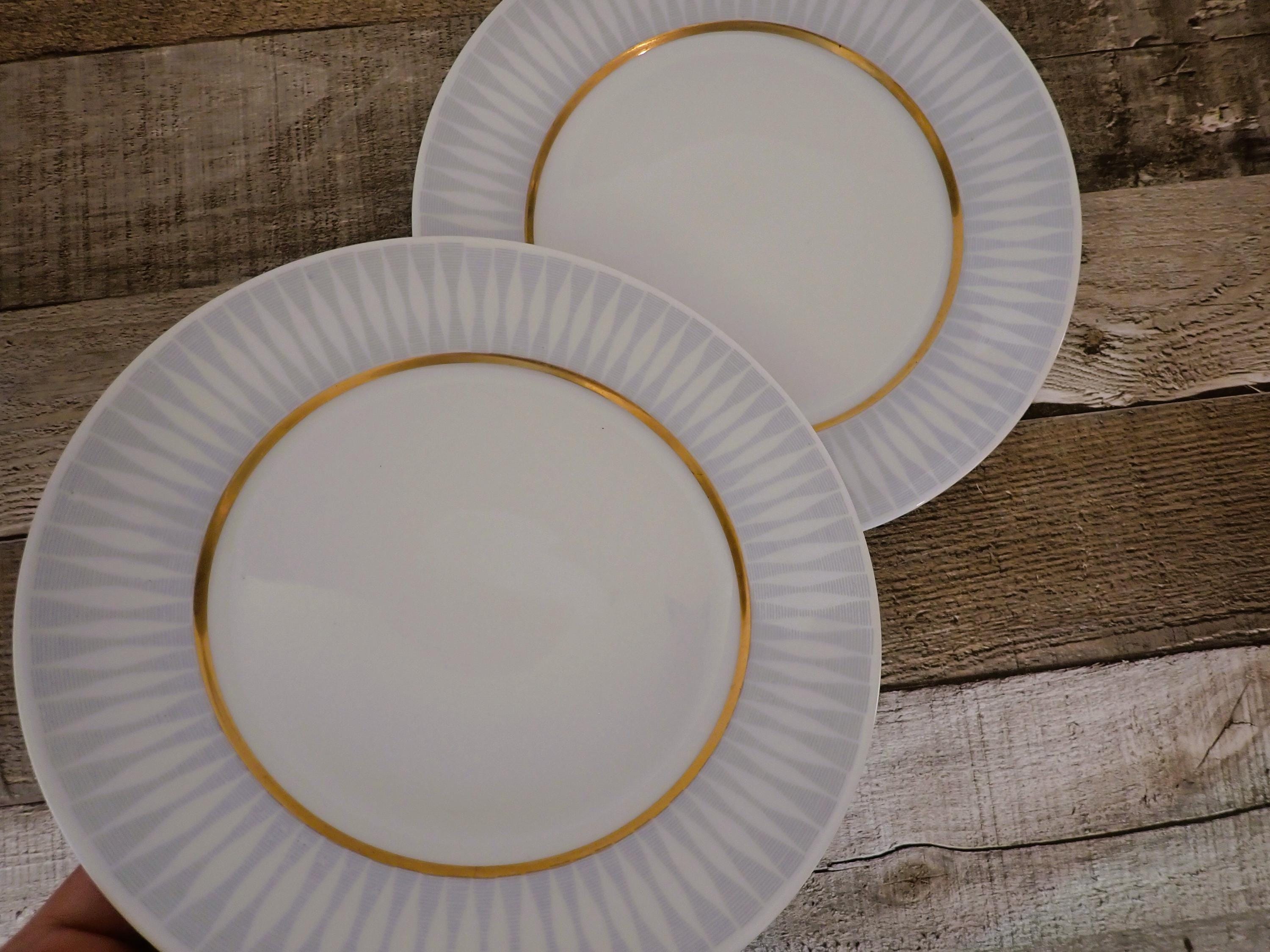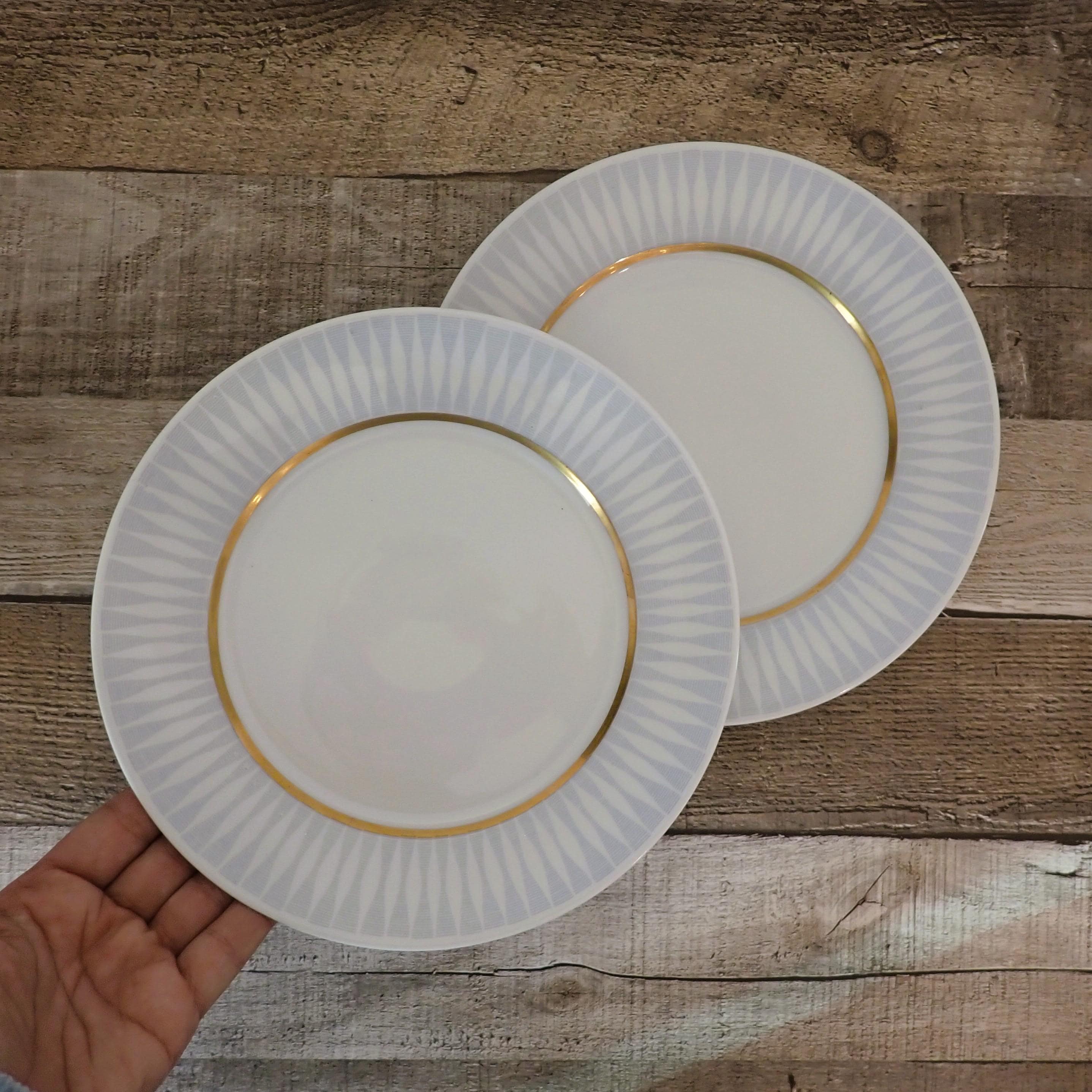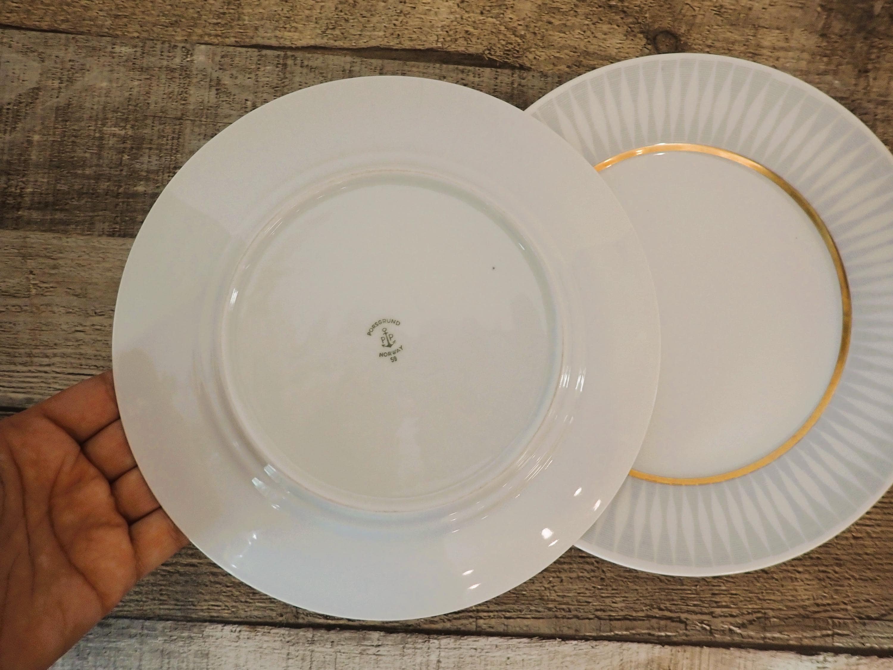 This set of 2 plates by Porsgrund Norway are white ceramic plates with a gray geometric design made of thin lines arund the outer rim. The plates are 8.5" in diameter. The bottoms of the plates are marked with the Porsgrund logo. Both plates are in very good condition with no chips or cracks.