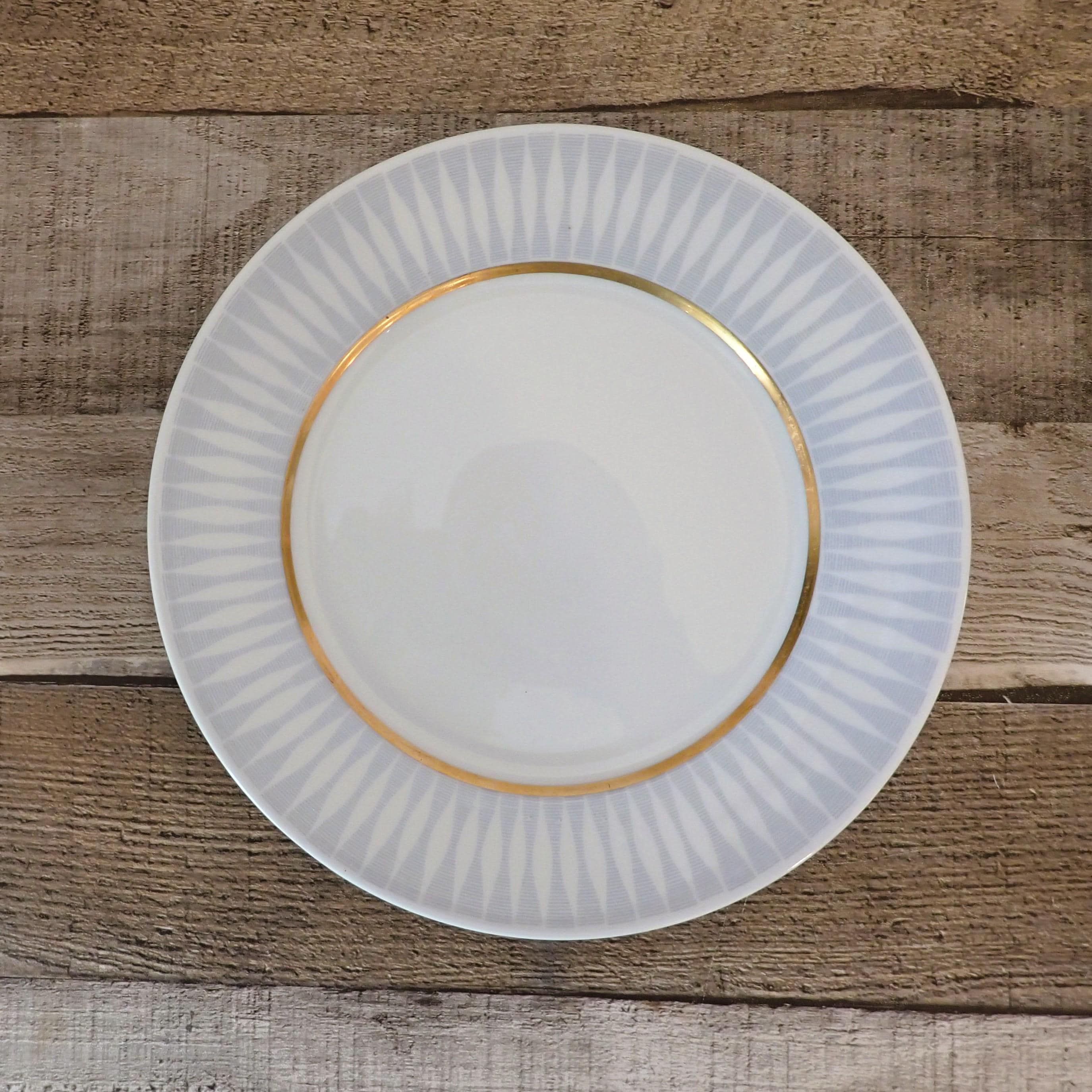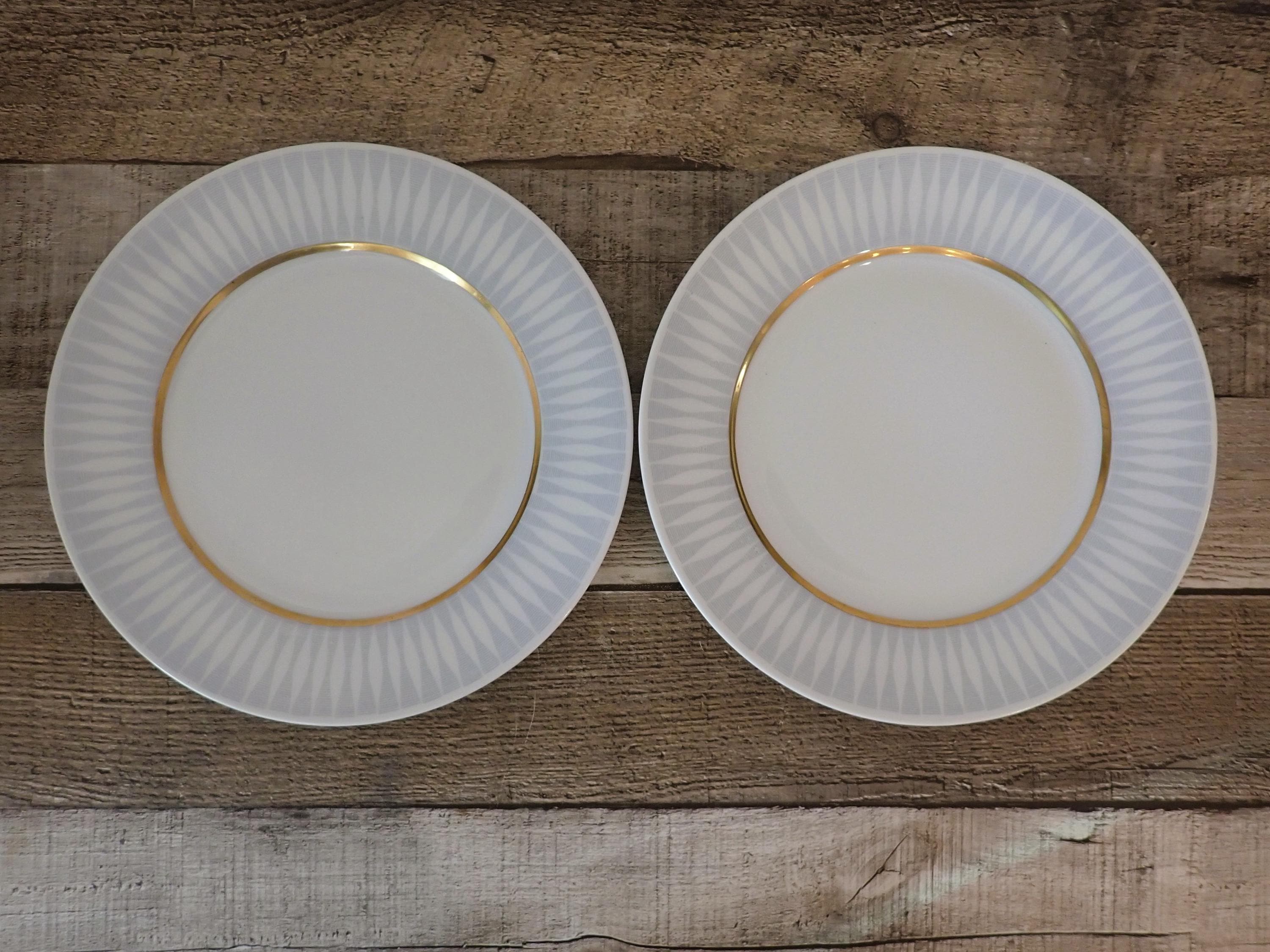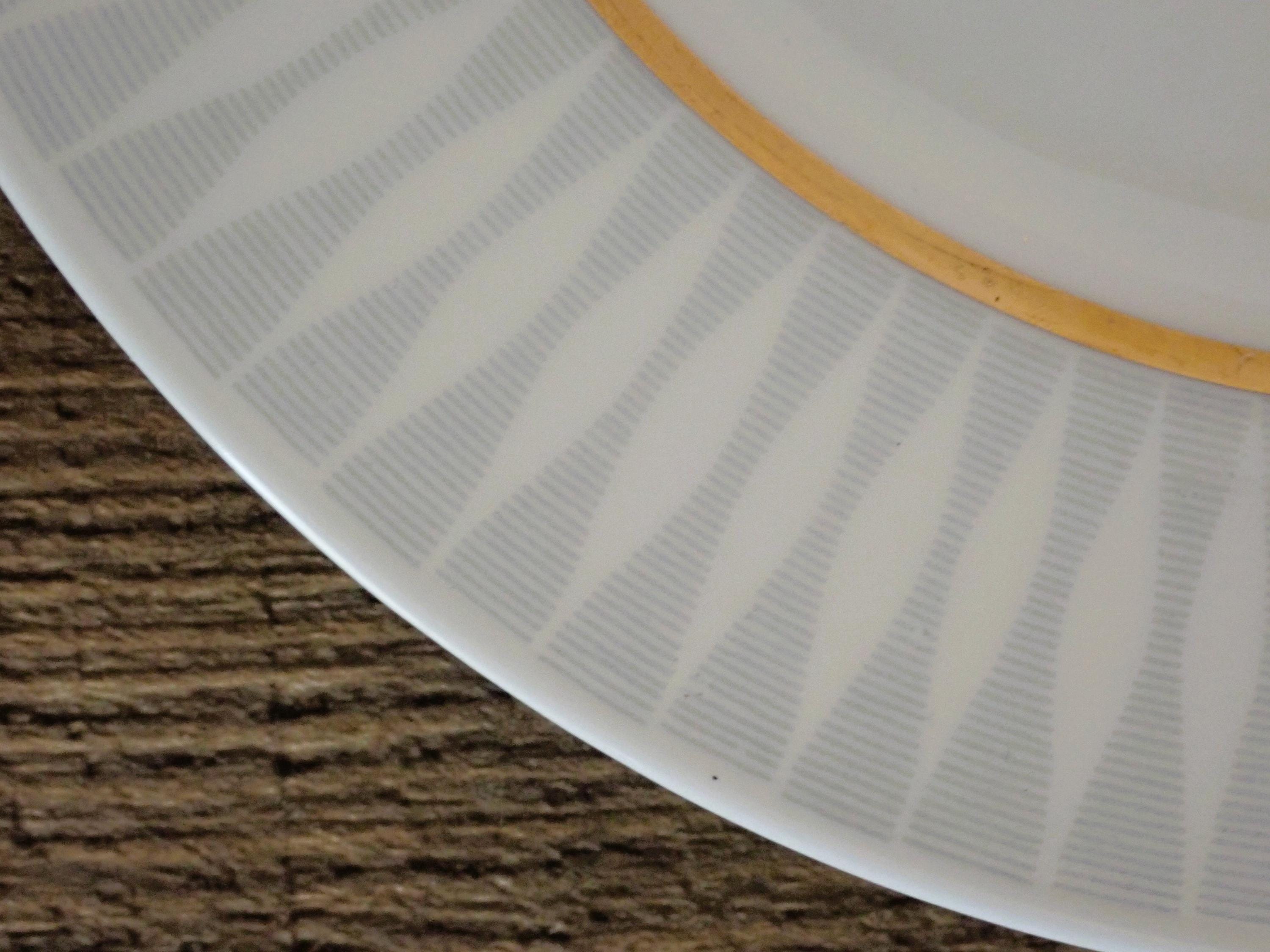 This set of 2 plates by Porsgrund Norway are white ceramic plates with a gray geometric design made of thin lines arund the outer rim. The plates are 8.5" in diameter. The bottoms of the plates are marked with the Porsgrund logo. Both plates are in very good condition with no chips or cracks.
