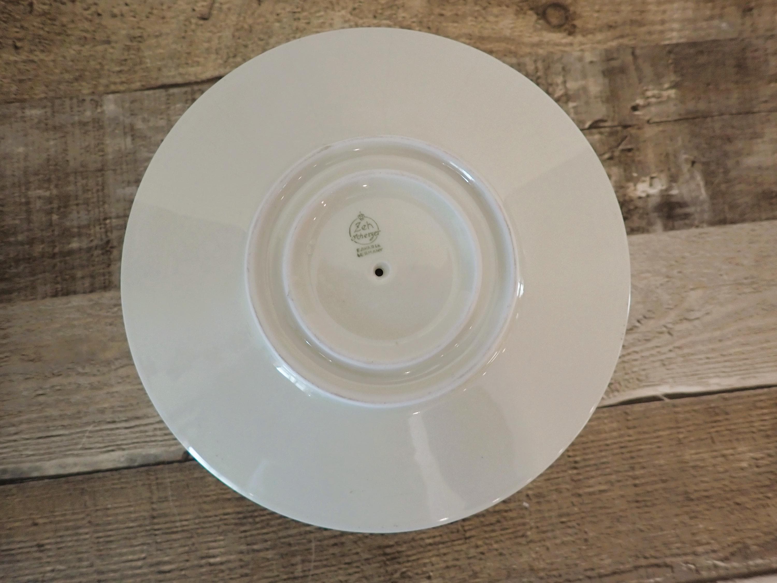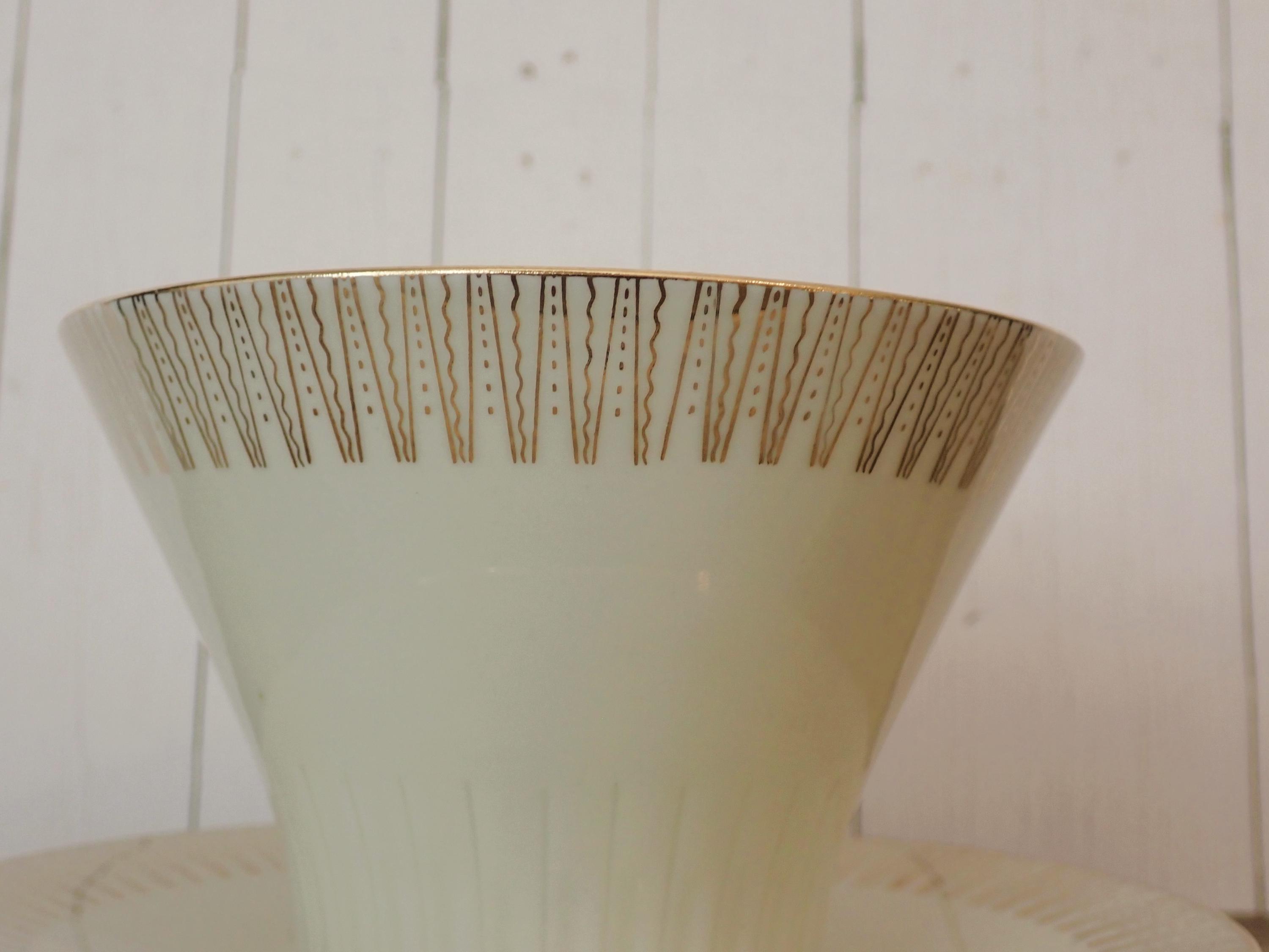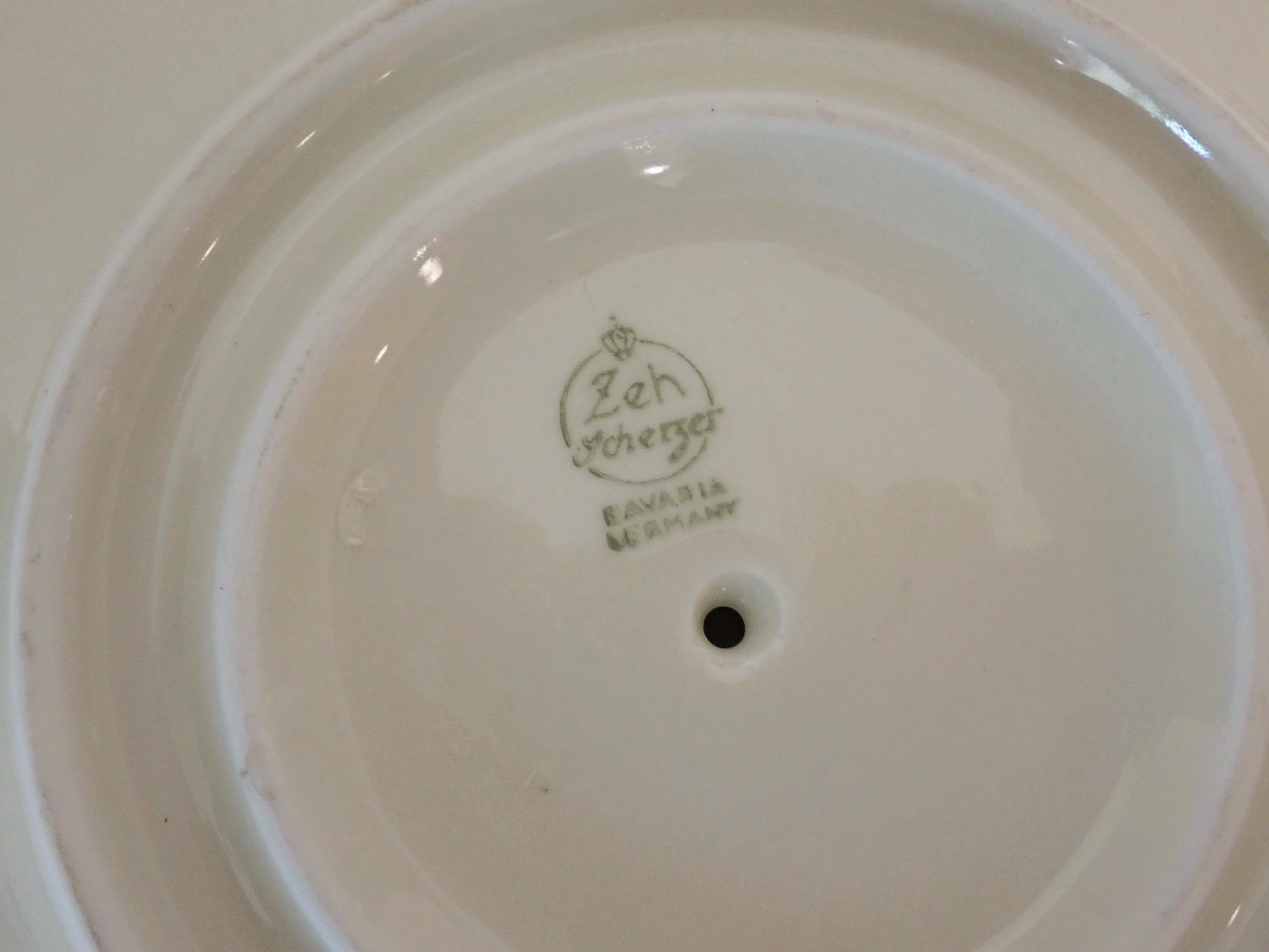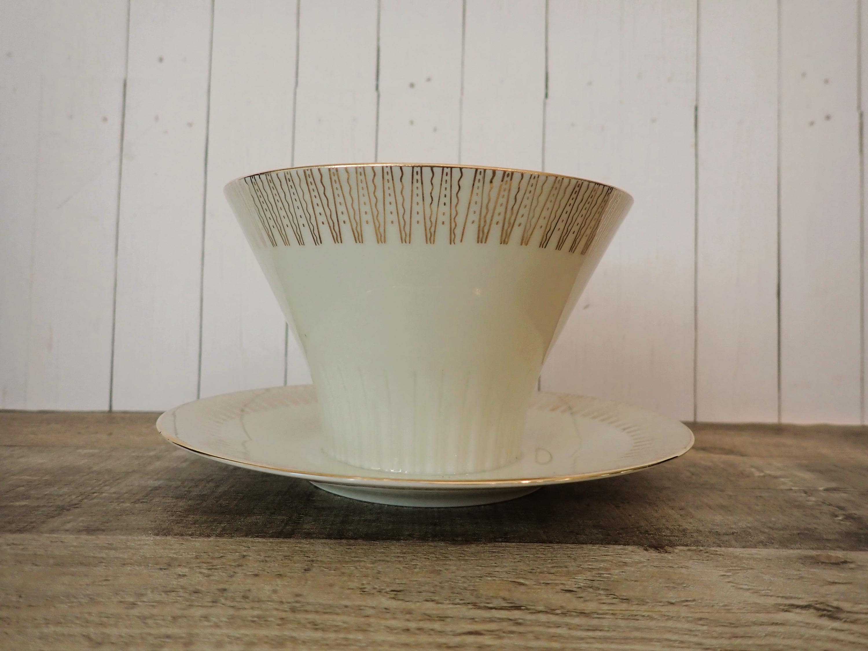 This ceramic gravy boat with attached underplate by Scherzer is an ivory ceramic with a gold geometric line design around the bowl and plate. The gravy boat plate is 6.5" in diameter and the piece is 3.75" tall. The bottom is marked: Zeh Scherzer / Bavaria Germany. The gravy boat is in very good condition with no chips or cracks.