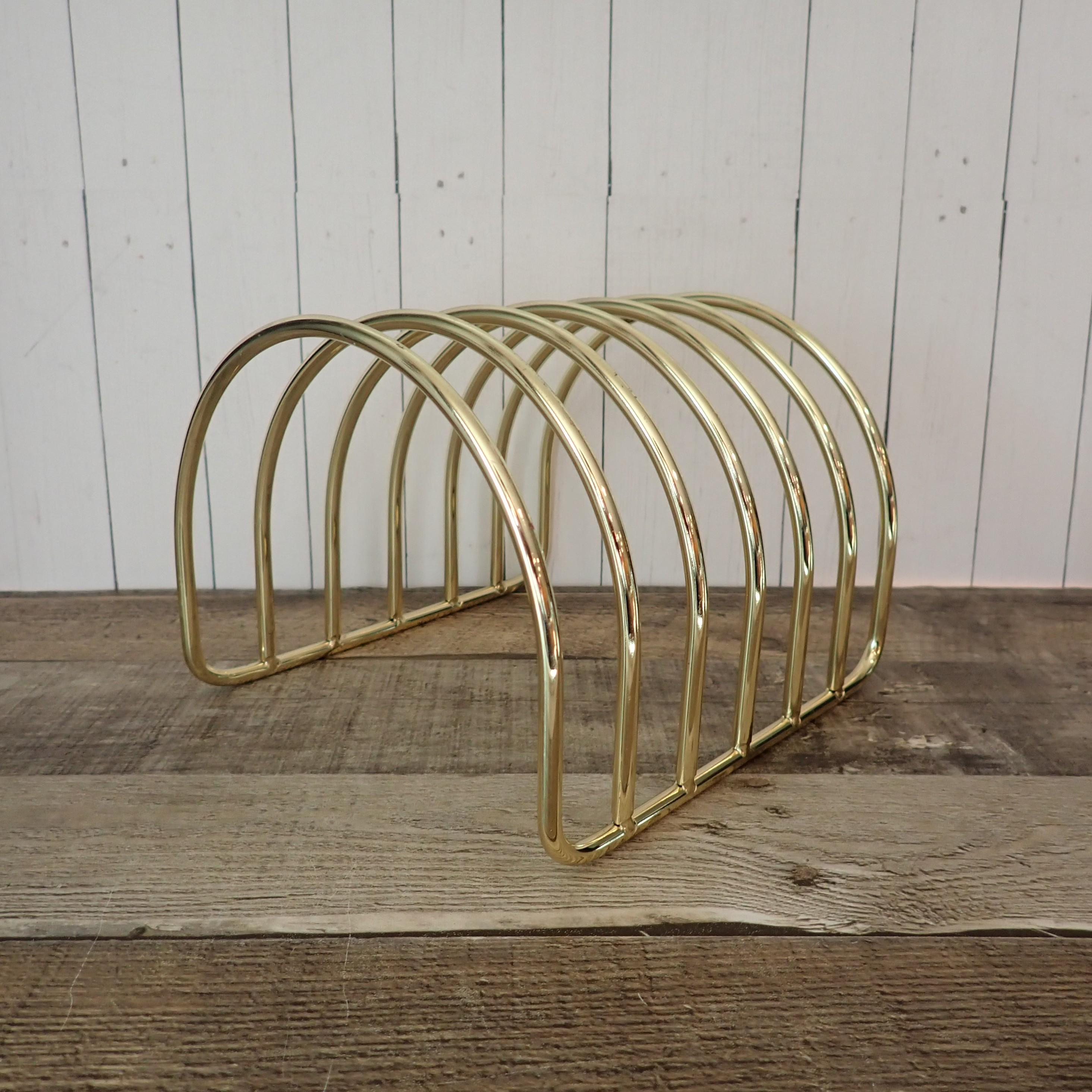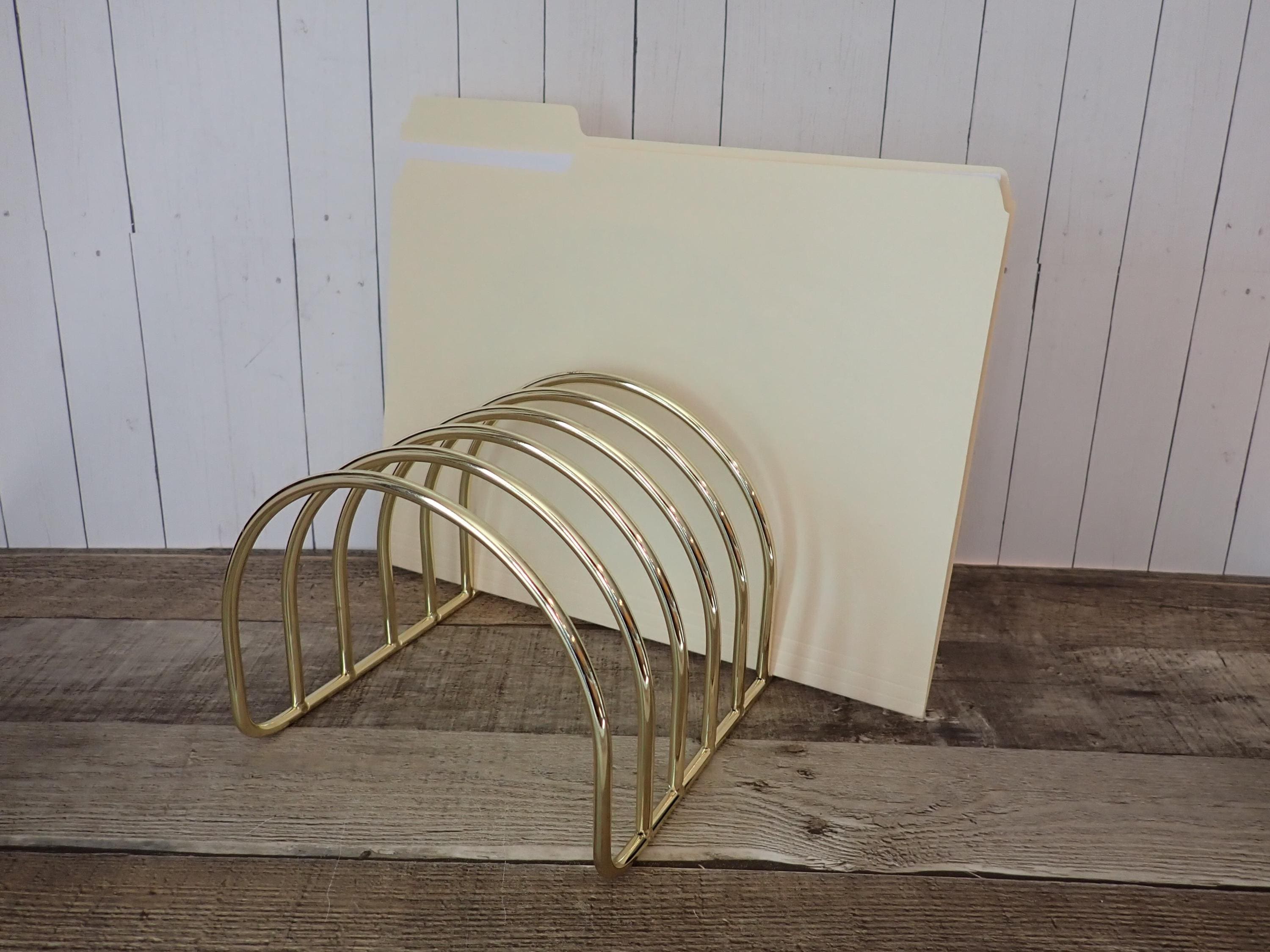 This gold metal file folder holder is 7" long, 6.5" wide, and 5.5" tall. It is a gold-colored metal piece with straight bottom edges and curved, rounded dividers. There are 6 slots for folders. The organizer is in very nice condition with no damage.