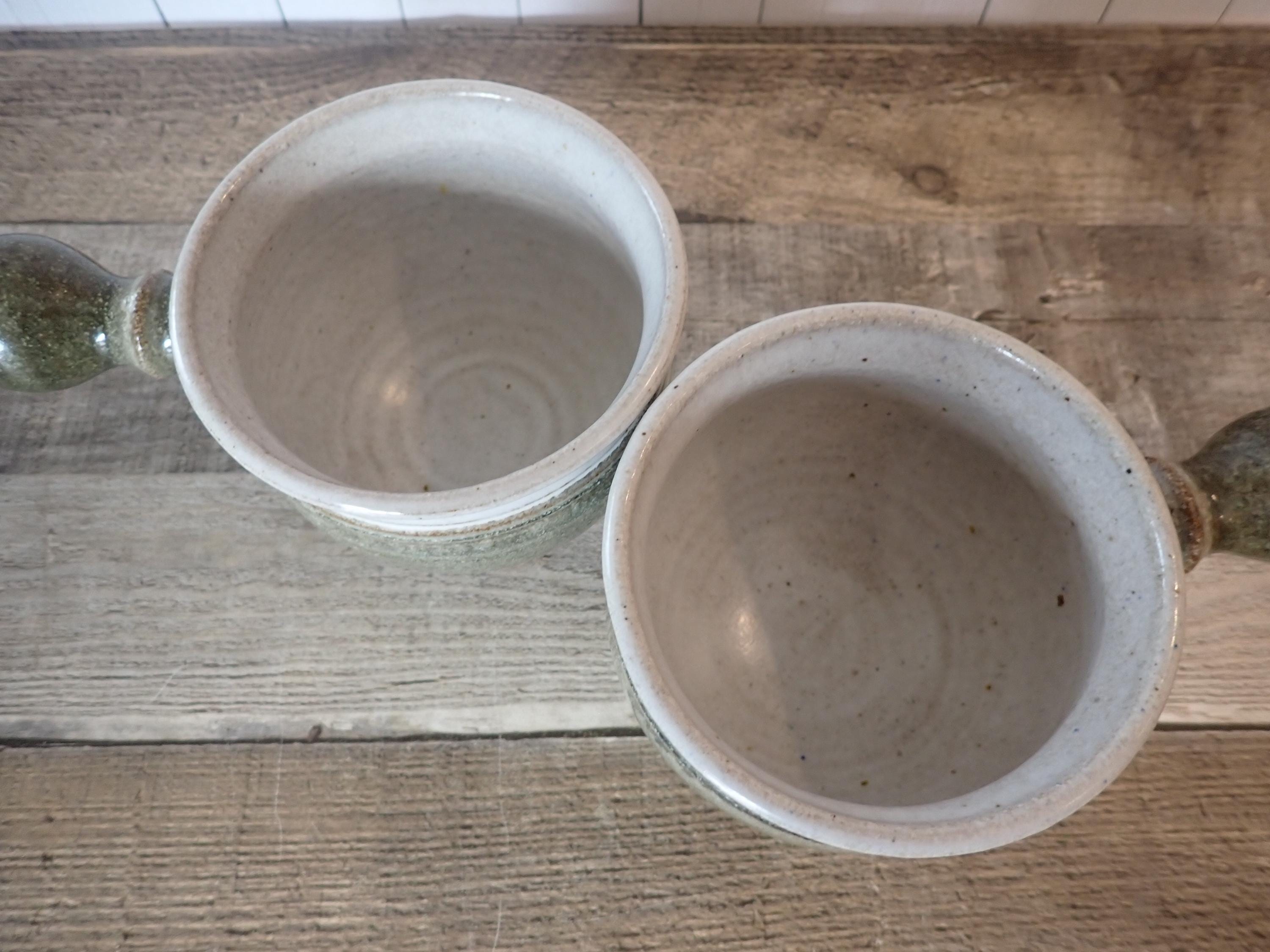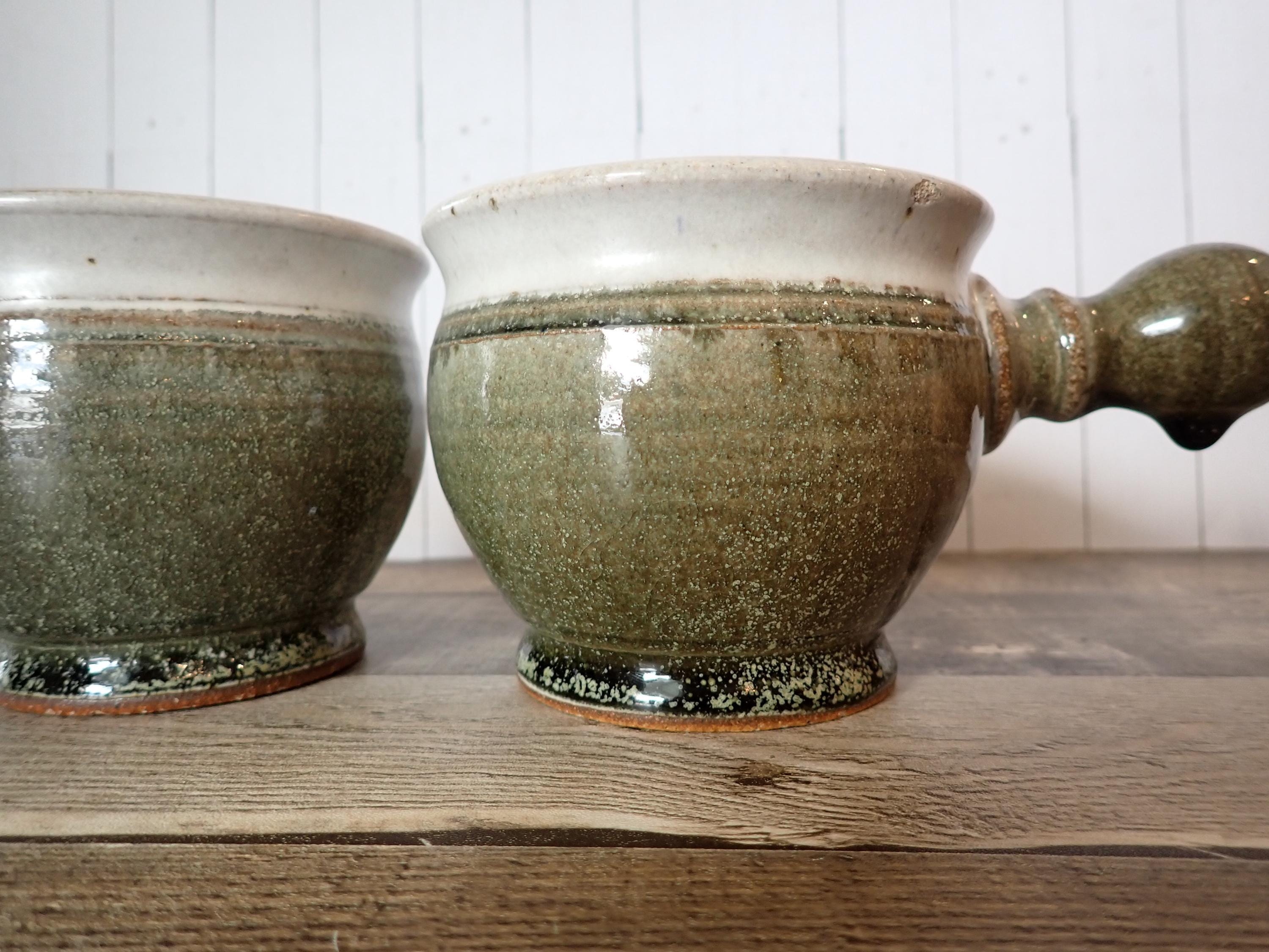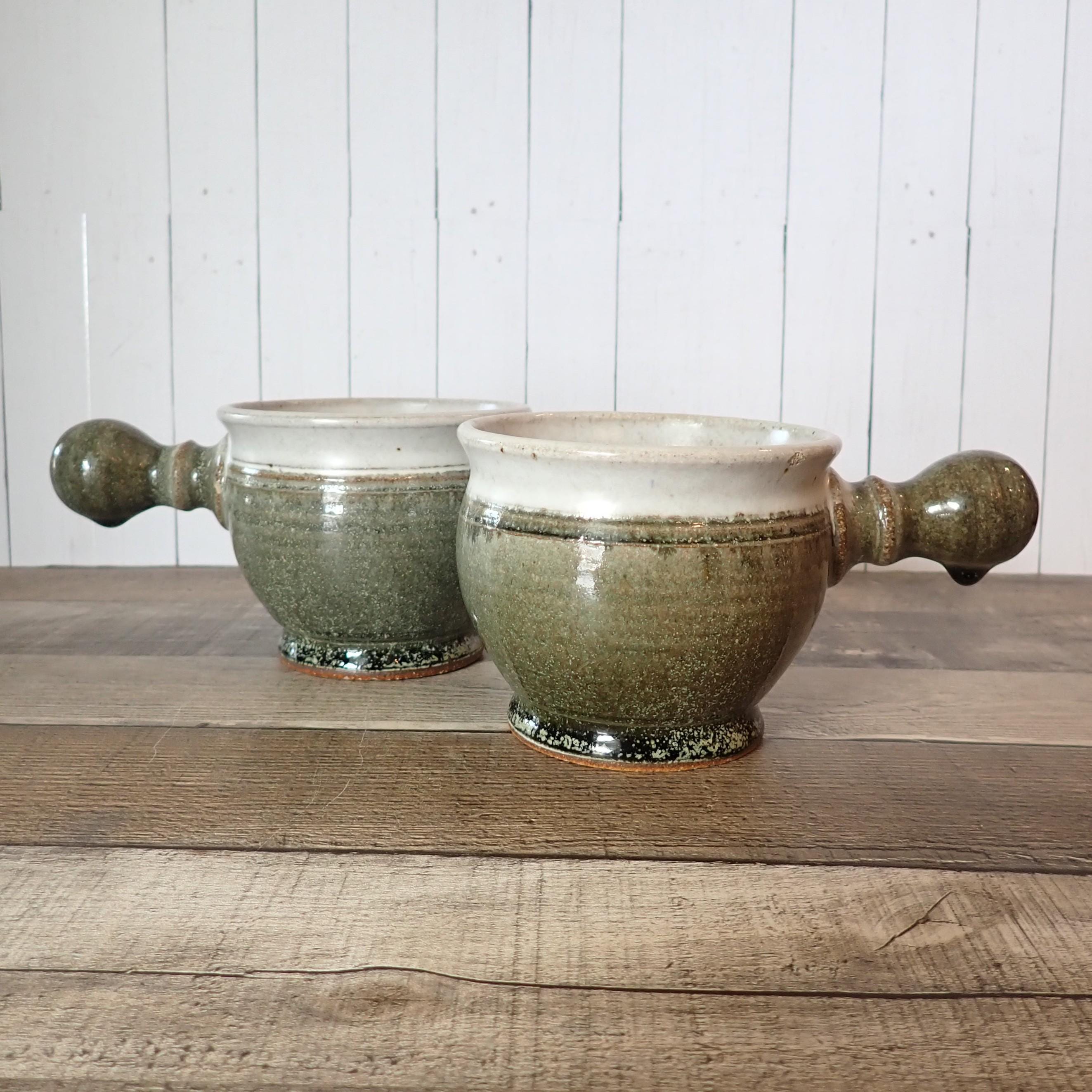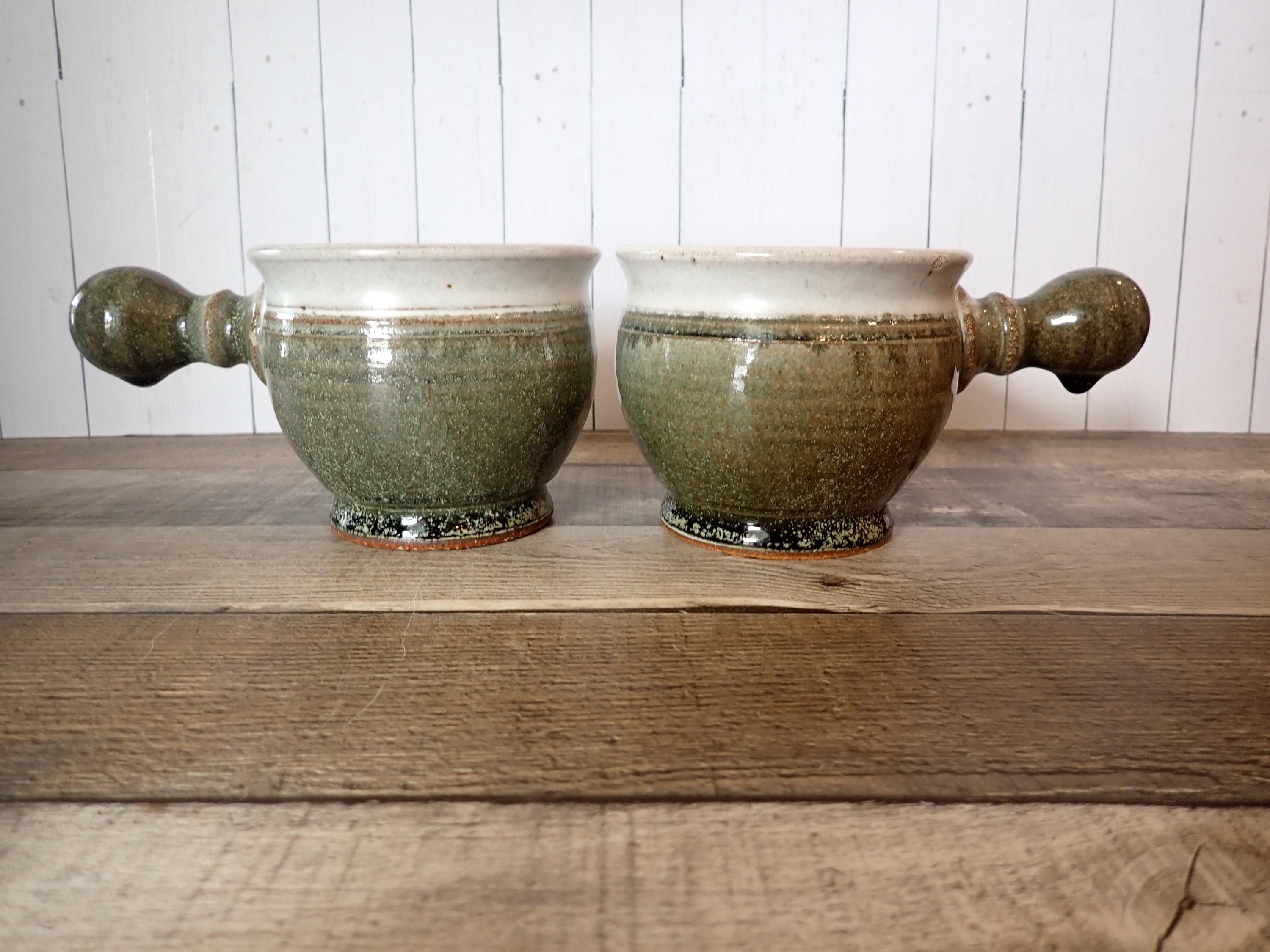 This set of stoneware soup bowls includes 2 matching soup bowls in the same pattern. The bowls are 4.25" in diameter and 3.75" high. With the handles, they are 6.75" wide. The bowls are a light gray and green stoneware with a drip glaze around the rim. The bottoms are signed by the artist. Both bowls are in good condition, however there is one small nick on the rim of one of the bowls as shown in the last photo.