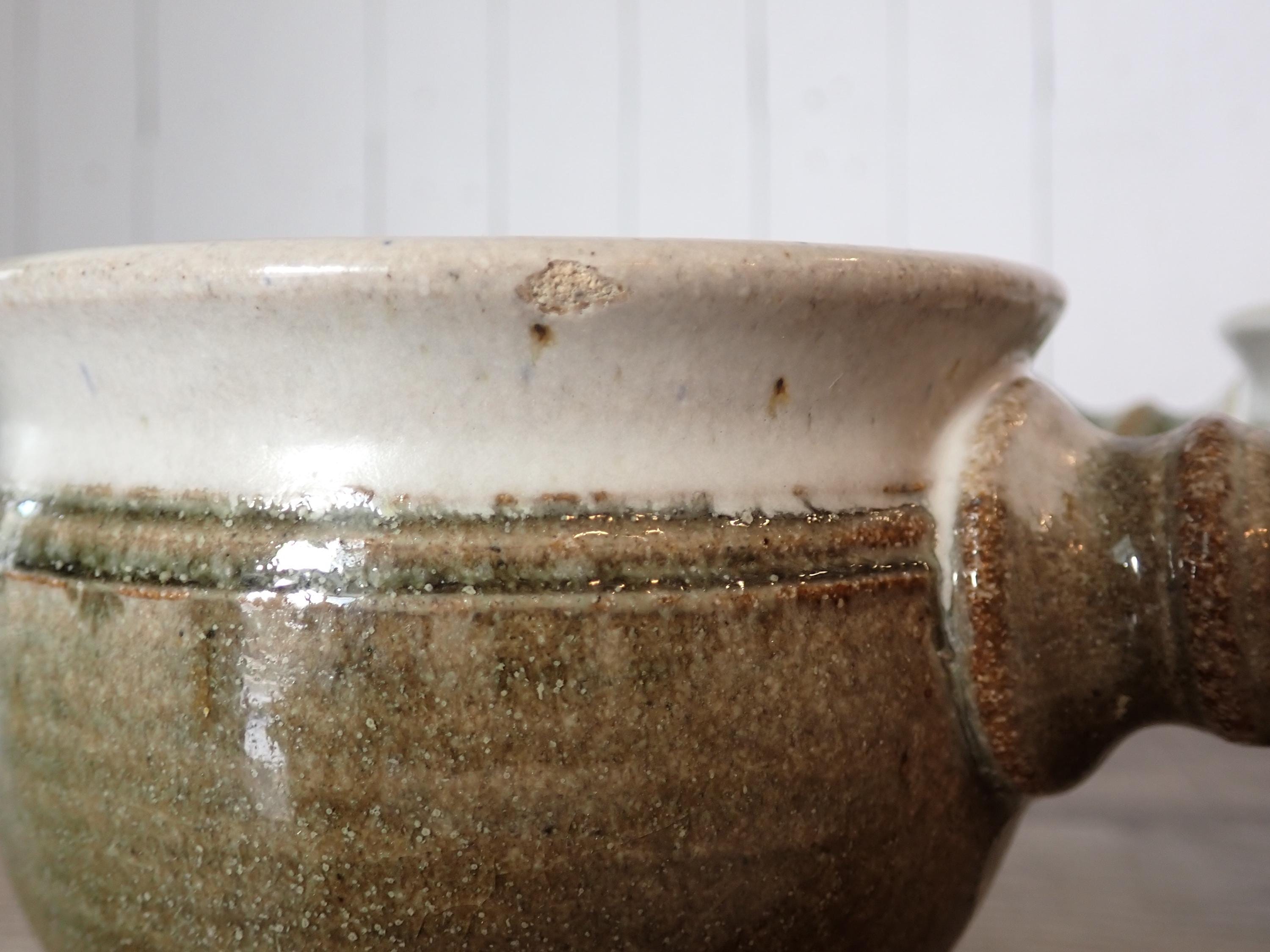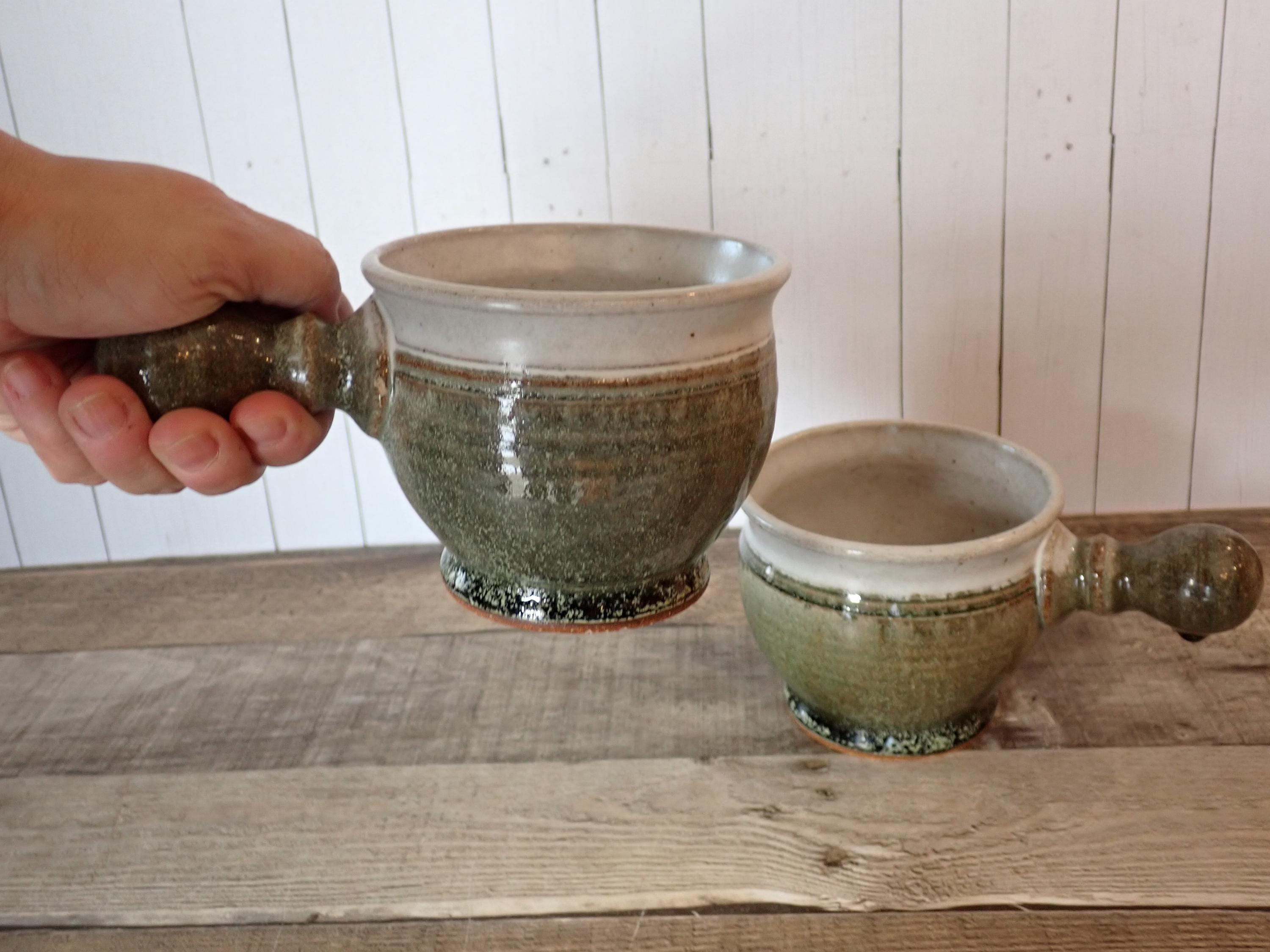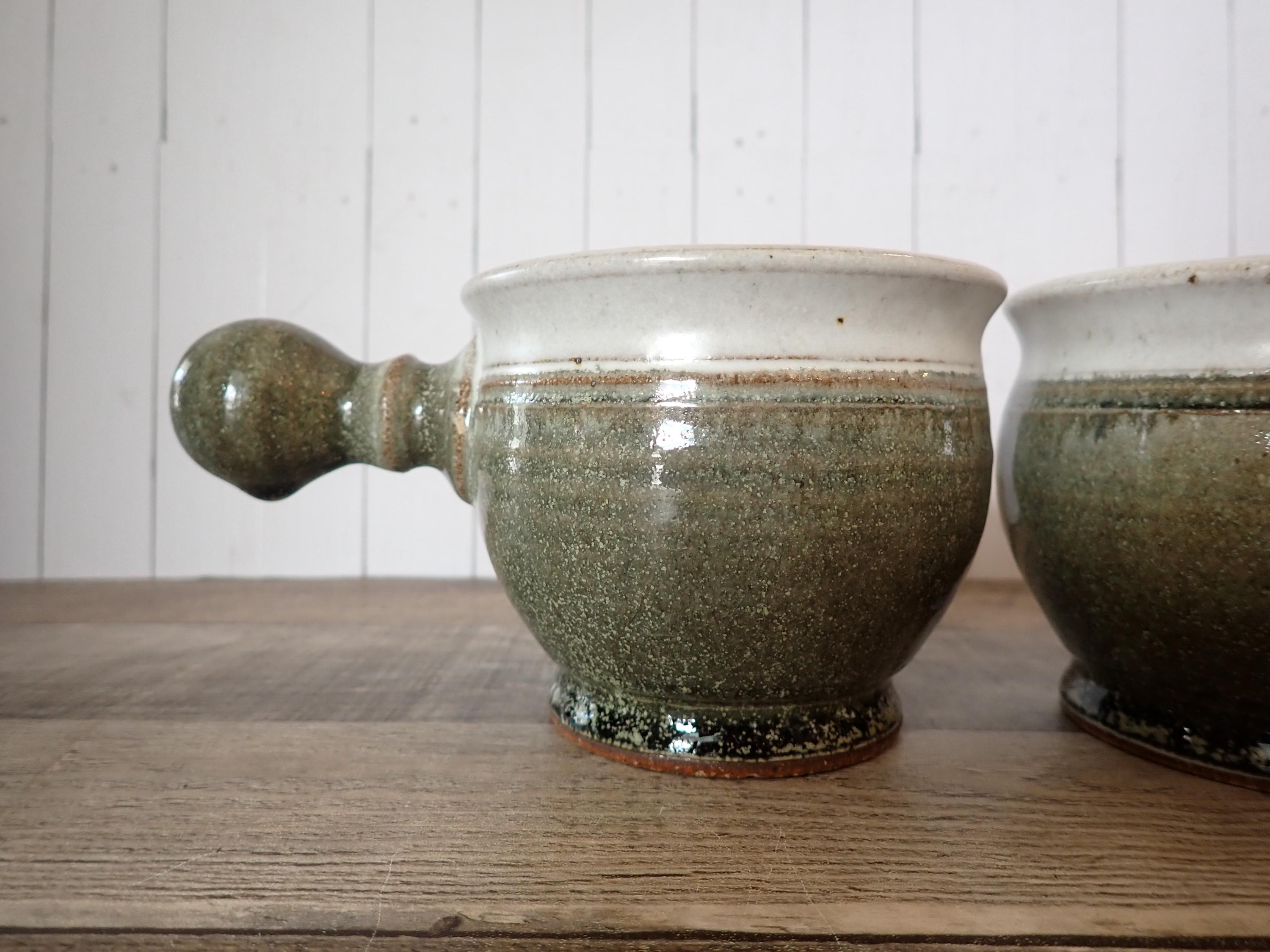 This set of stoneware soup bowls includes 2 matching soup bowls in the same pattern. The bowls are 4.25" in diameter and 3.75" high. With the handles, they are 6.75" wide. The bowls are a light gray and green stoneware with a drip glaze around the rim. The bottoms are signed by the artist. Both bowls are in good condition, however there is one small nick on the rim of one of the bowls as shown in the last photo.