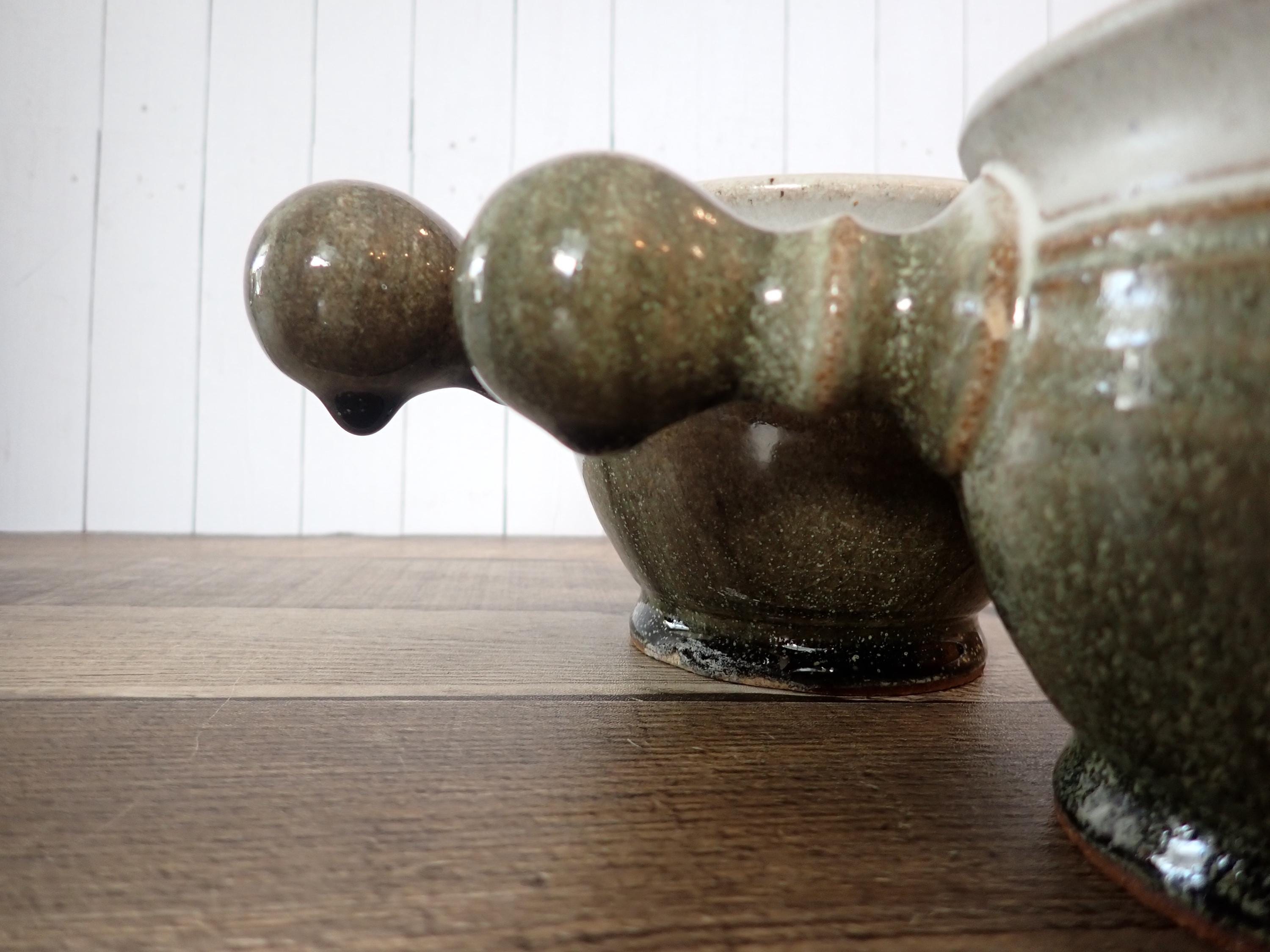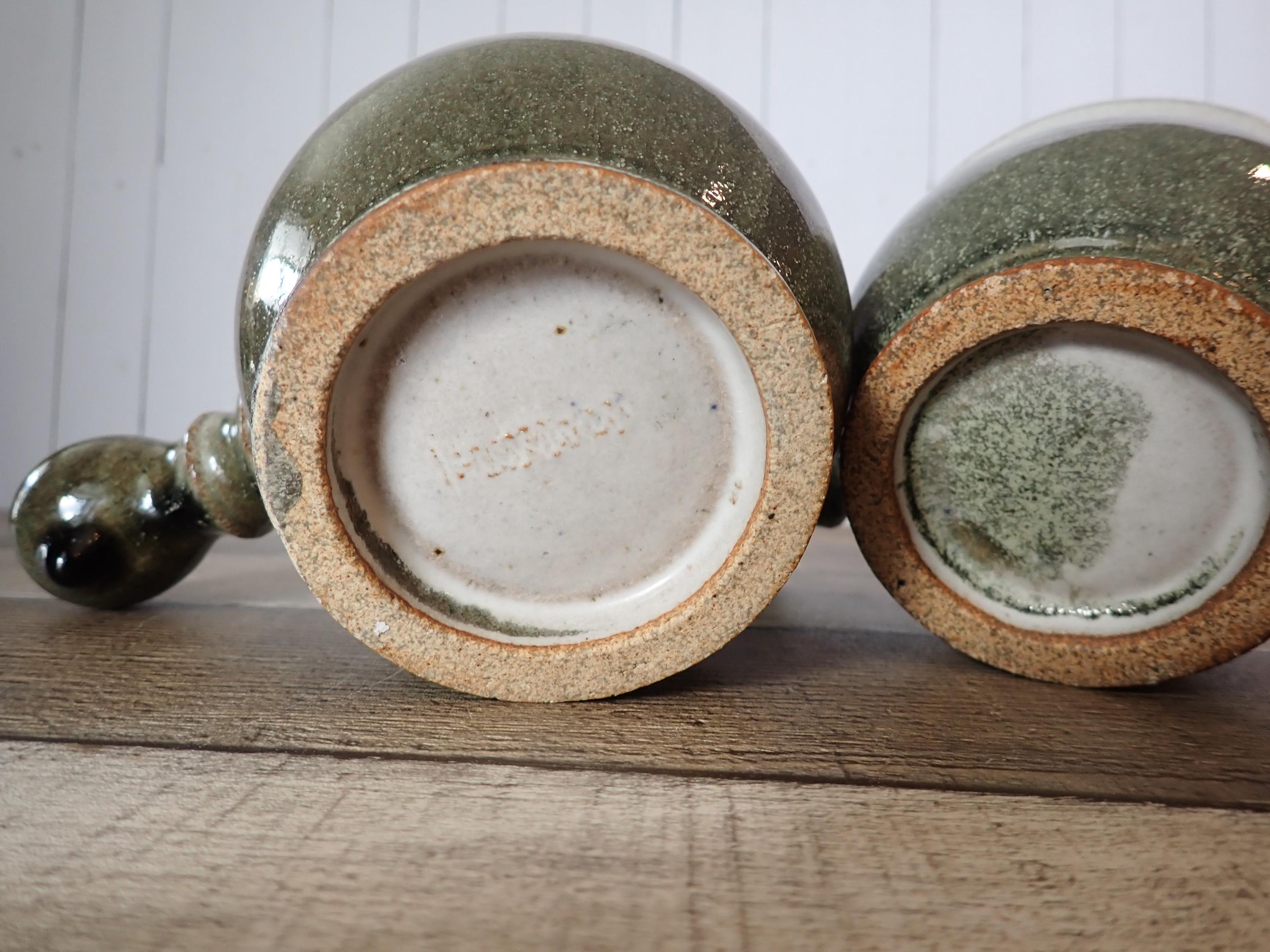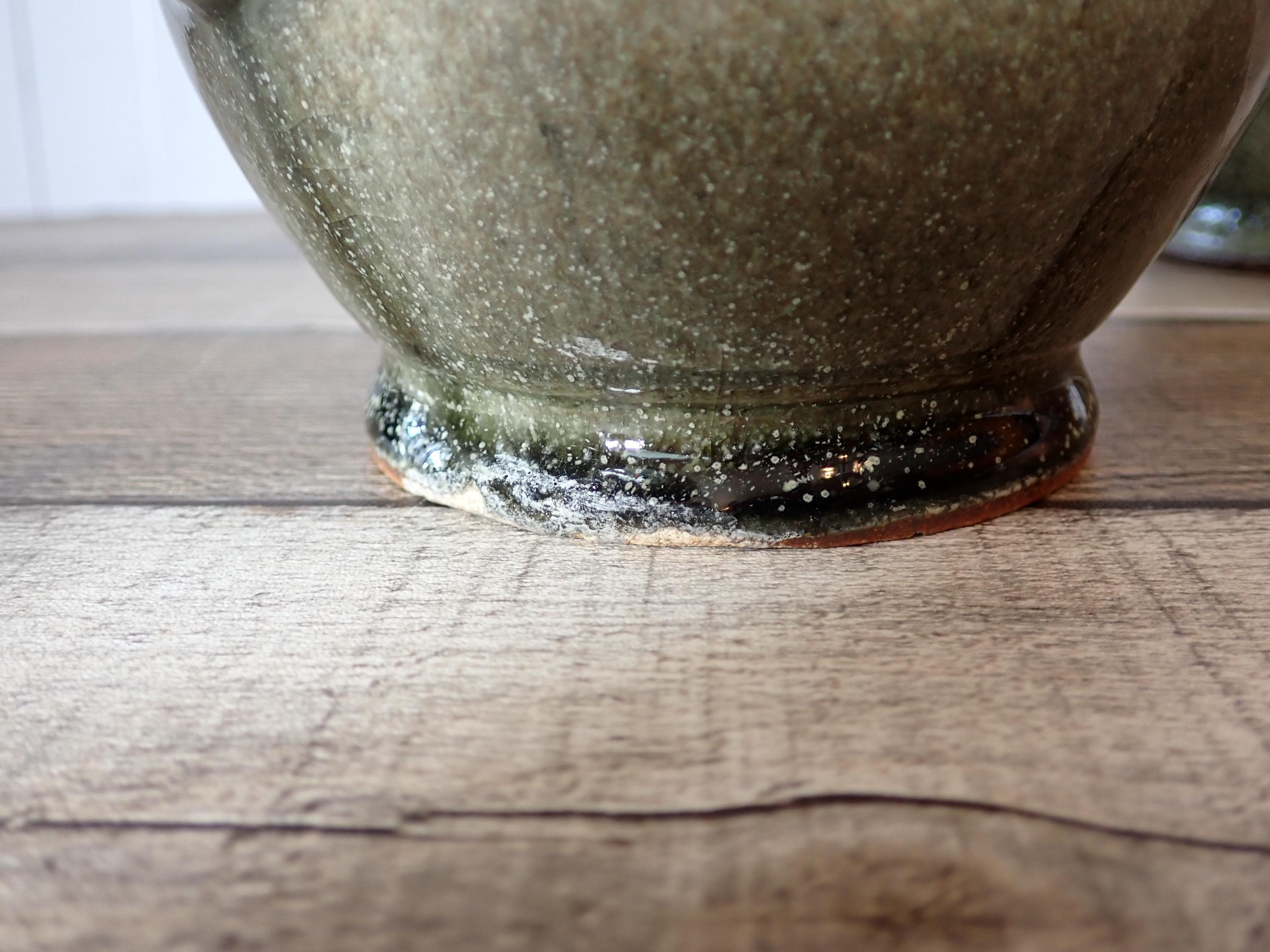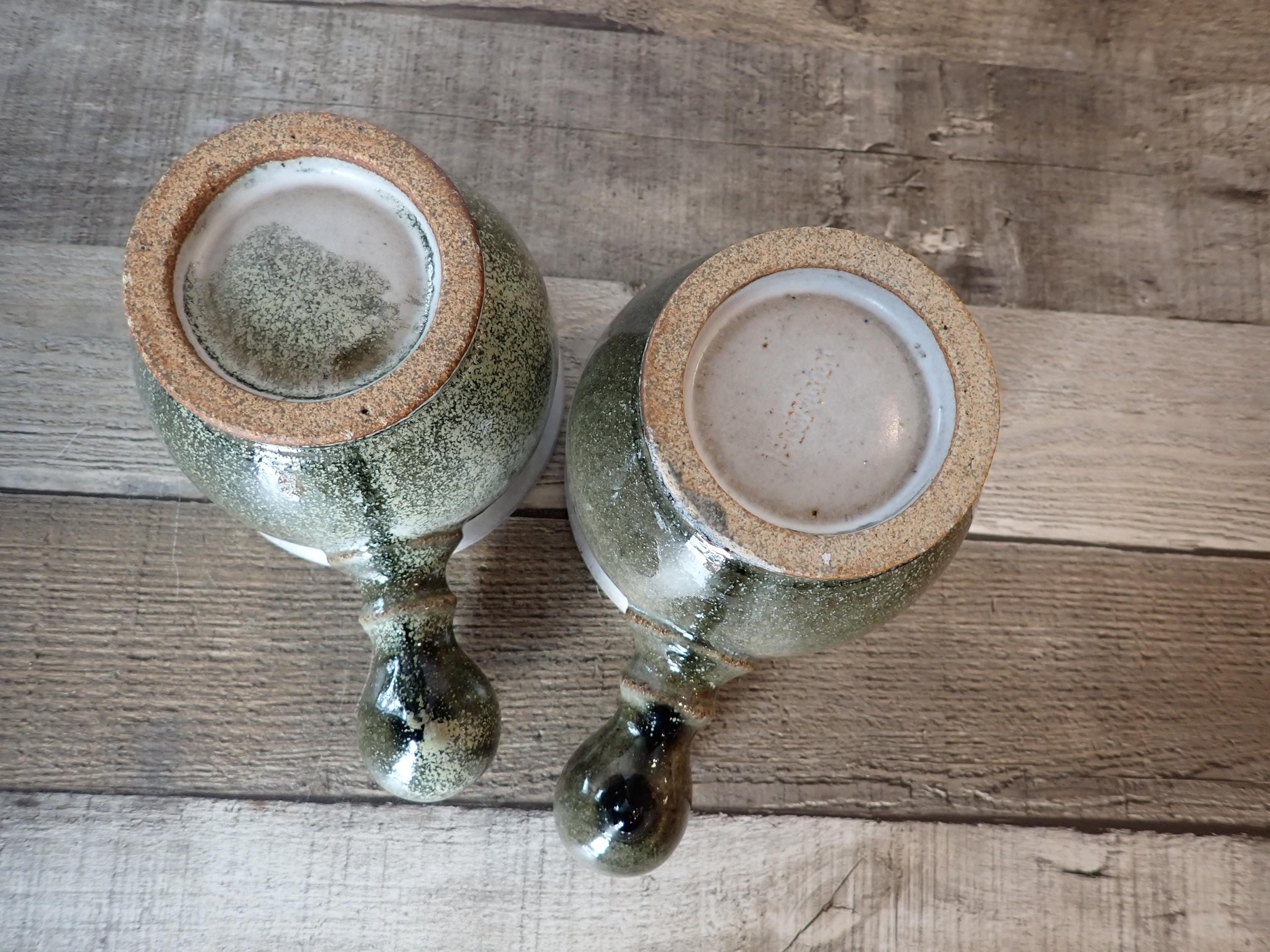 This set of stoneware soup bowls includes 2 matching soup bowls in the same pattern. The bowls are 4.25" in diameter and 3.75" high. With the handles, they are 6.75" wide. The bowls are a light gray and green stoneware with a drip glaze around the rim. The bottoms are signed by the artist. Both bowls are in good condition, however there is one small nick on the rim of one of the bowls as shown in the last photo.
