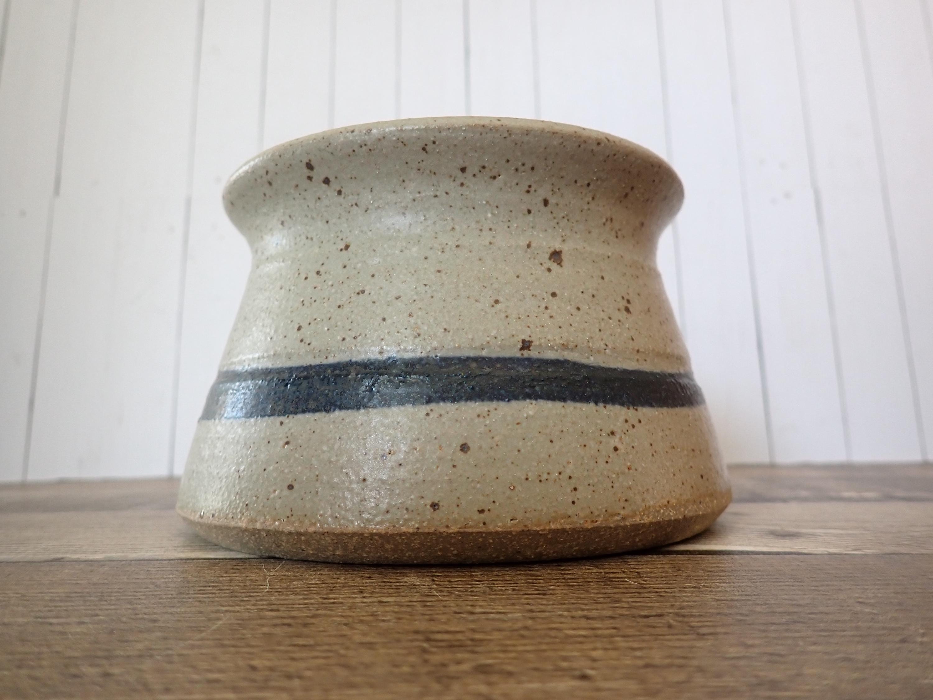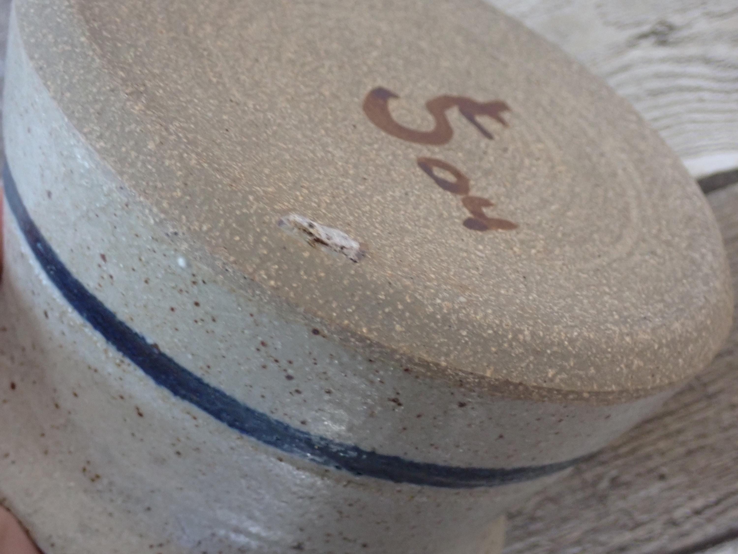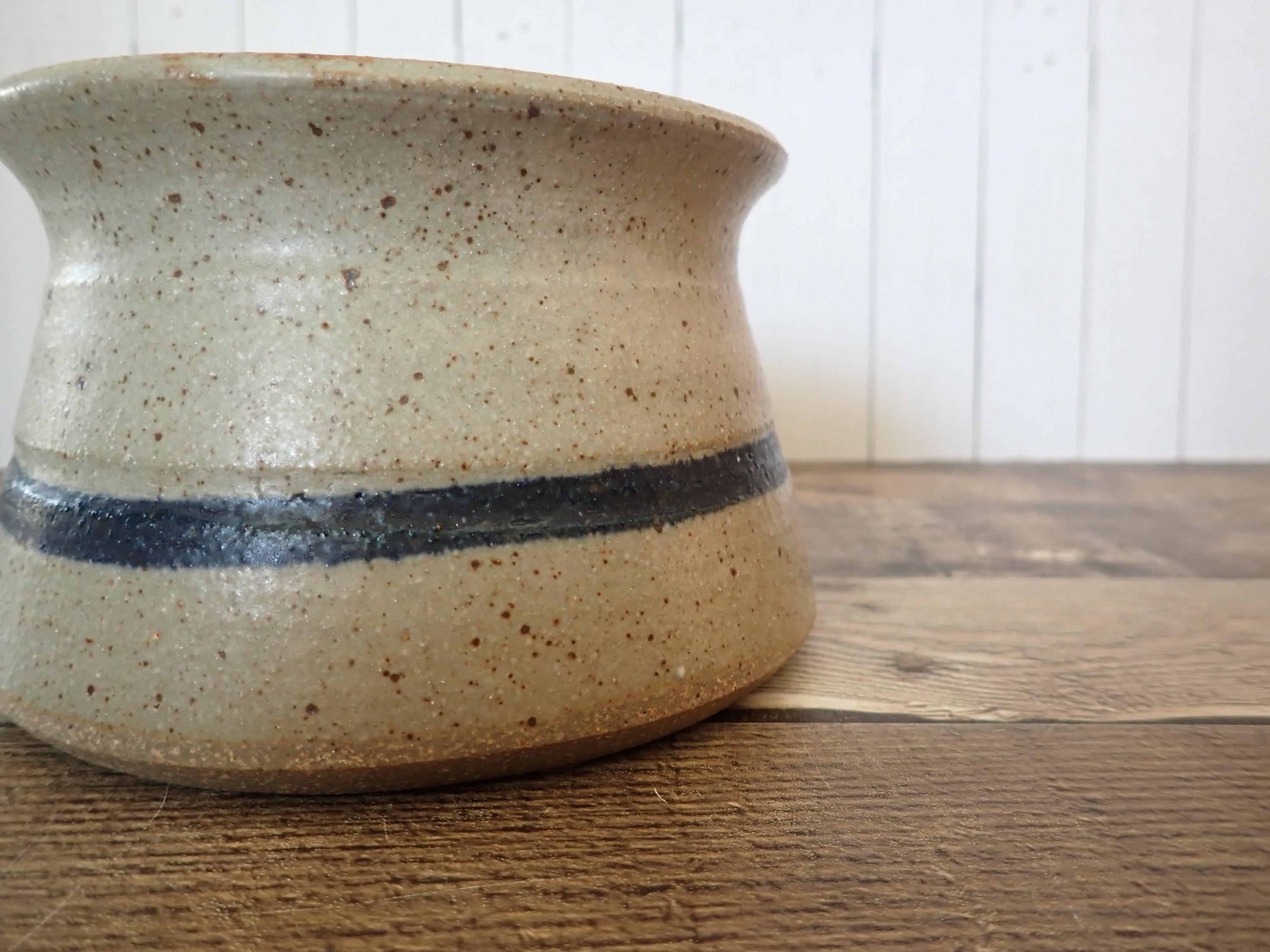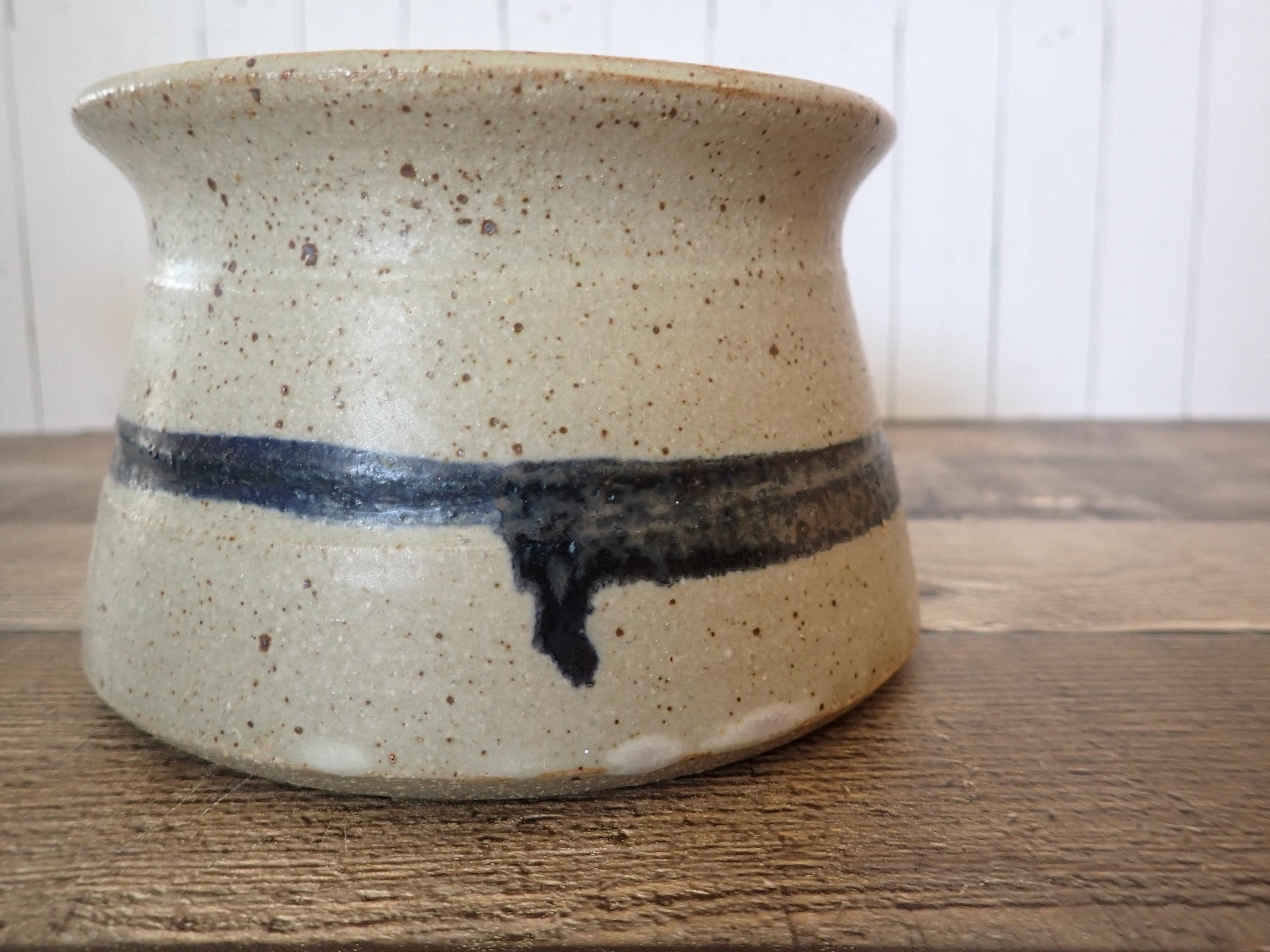 This stoneware planter is 6" in diameter and 3.75" tall. It is a handmade pottery piece and is a gray stoneware with brown flecking, and has a dark blue band around the planter. The bottom is signed by the artist. The planter is in very nice condition with no chips or cracks. There is a blue glaze drip where the blue band starts and ends, and a small, rough piece of ceramic on the base. There are no drainage holes in this planter.