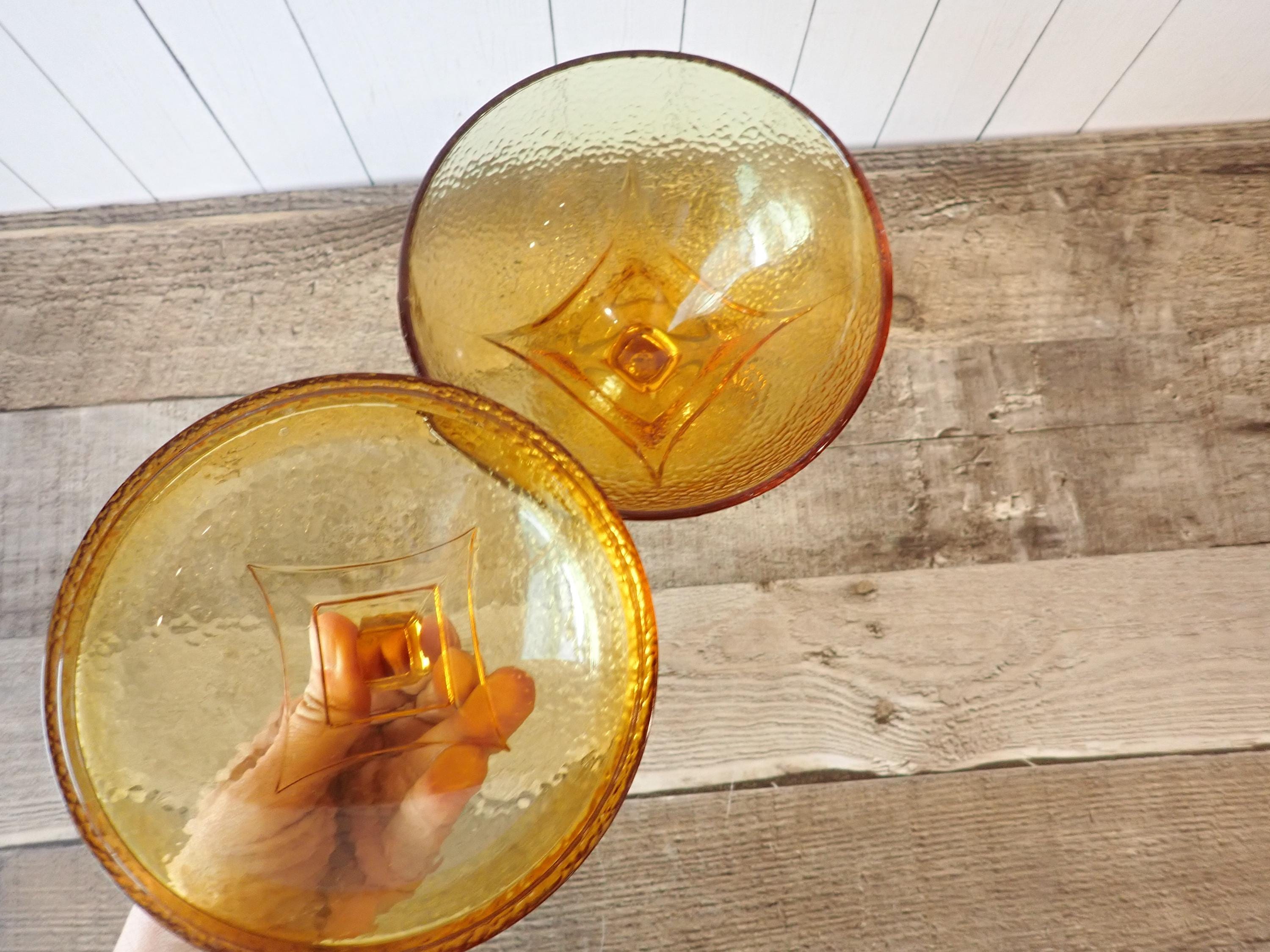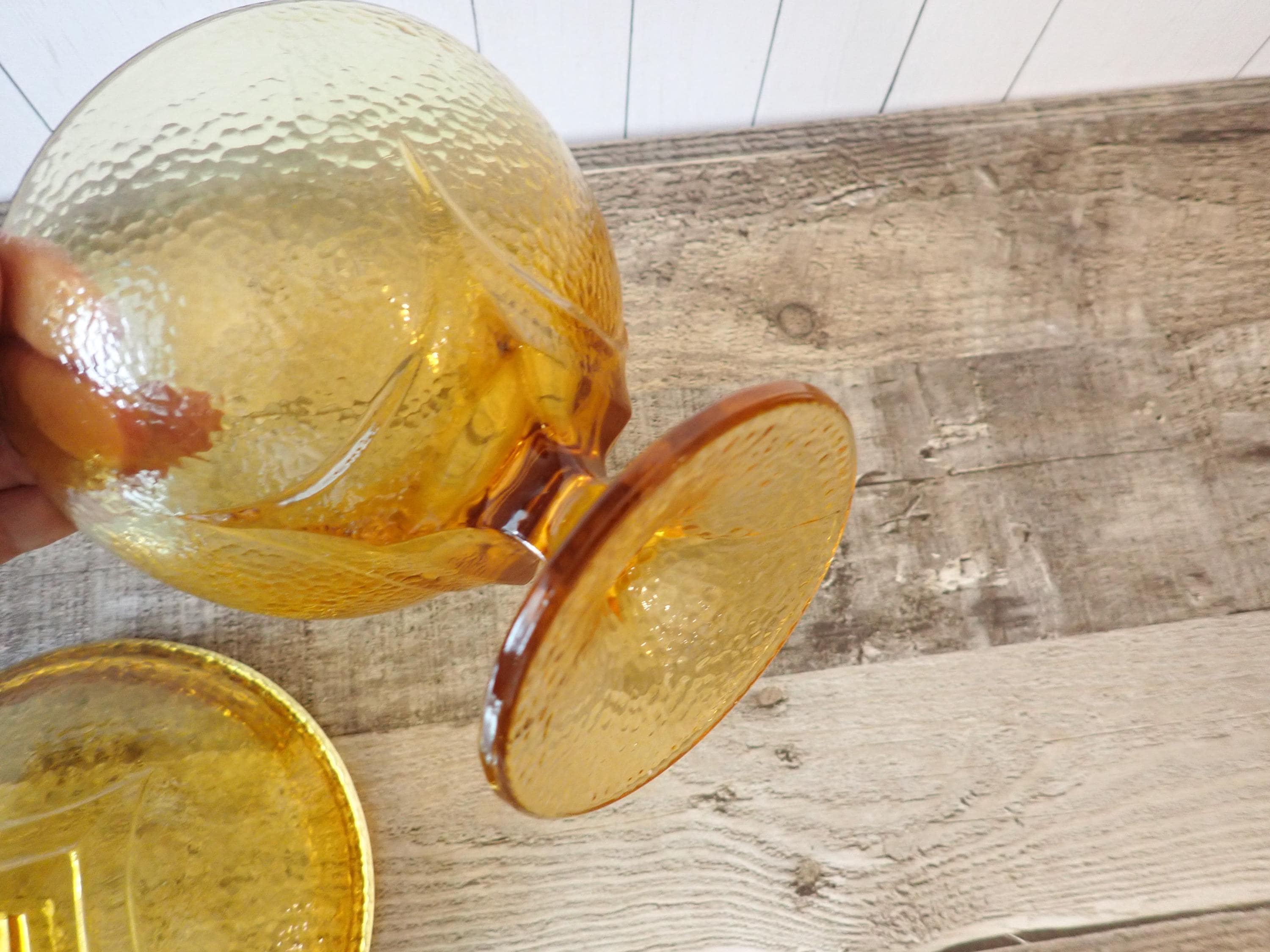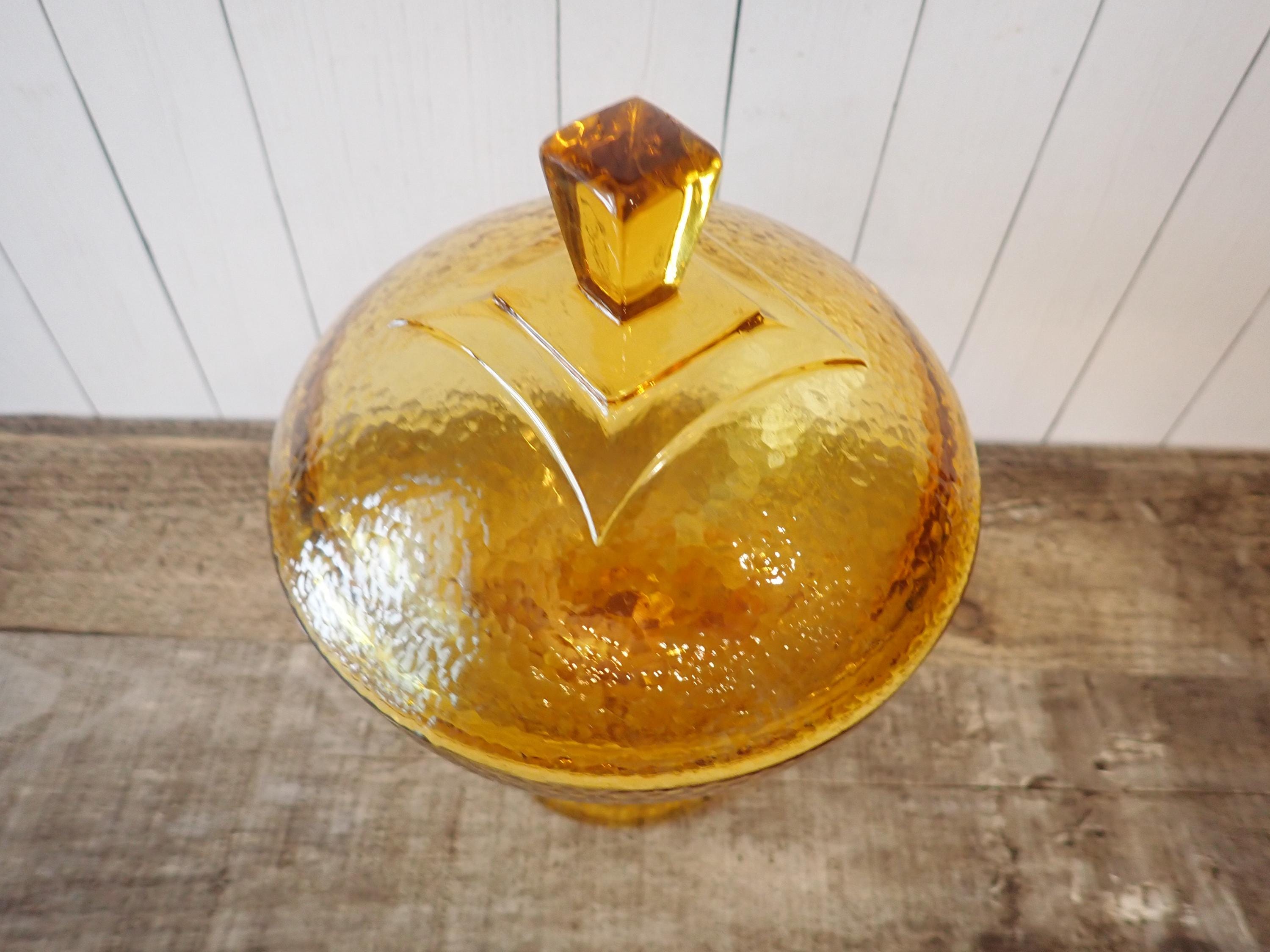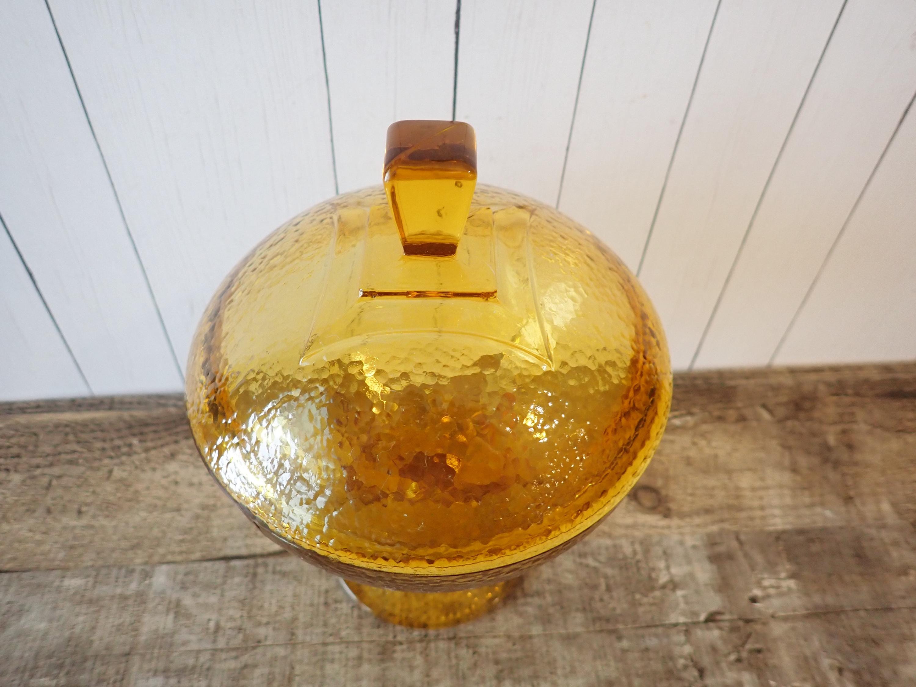 This yellow/amber glass candy dish 5.5" in diameter and 8" tall with the lid on. It is a light amber glass with a textured glass and a modern square design on the lid and underside of the bowl. The dish is in very good condition with no chips or cracks.