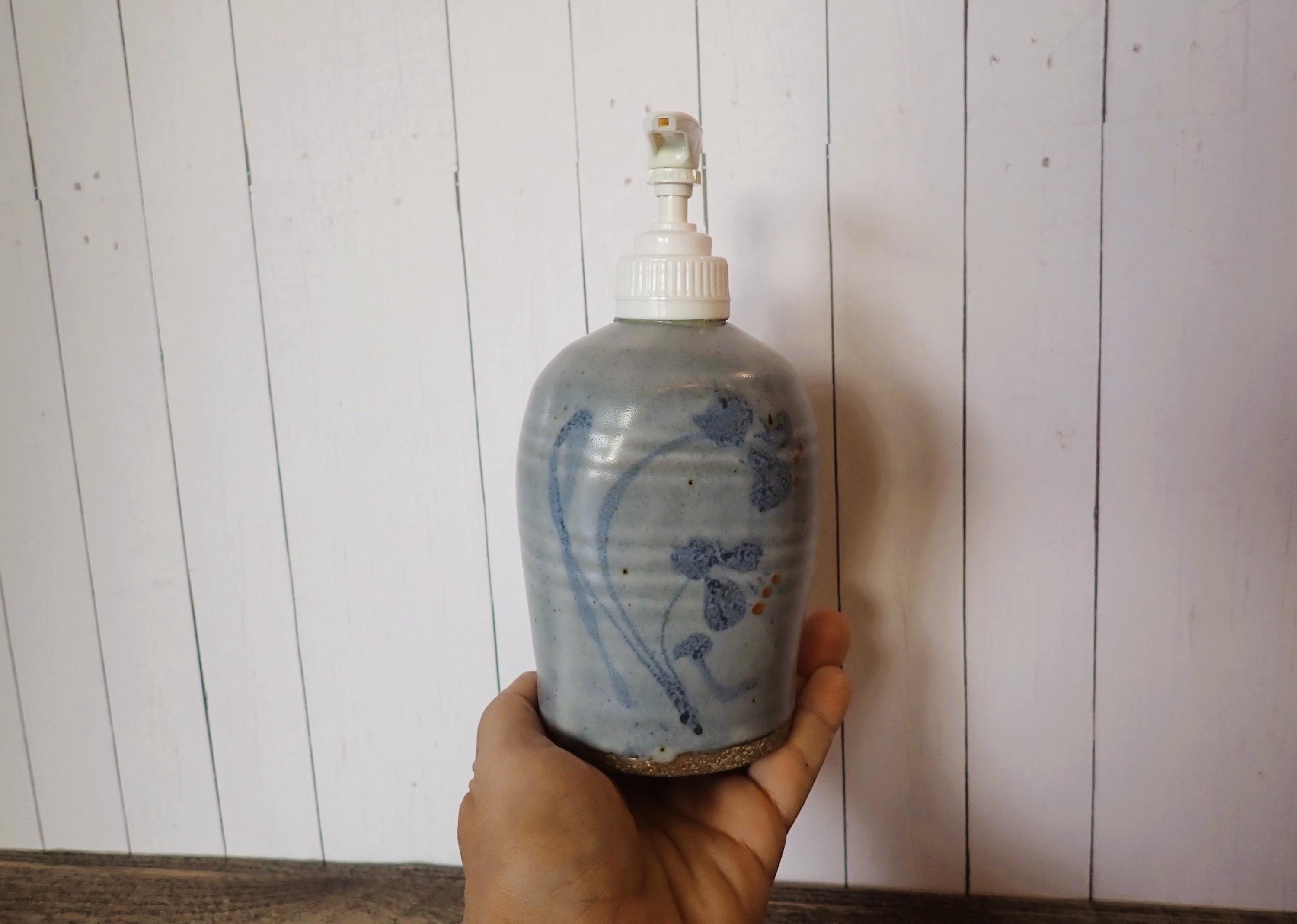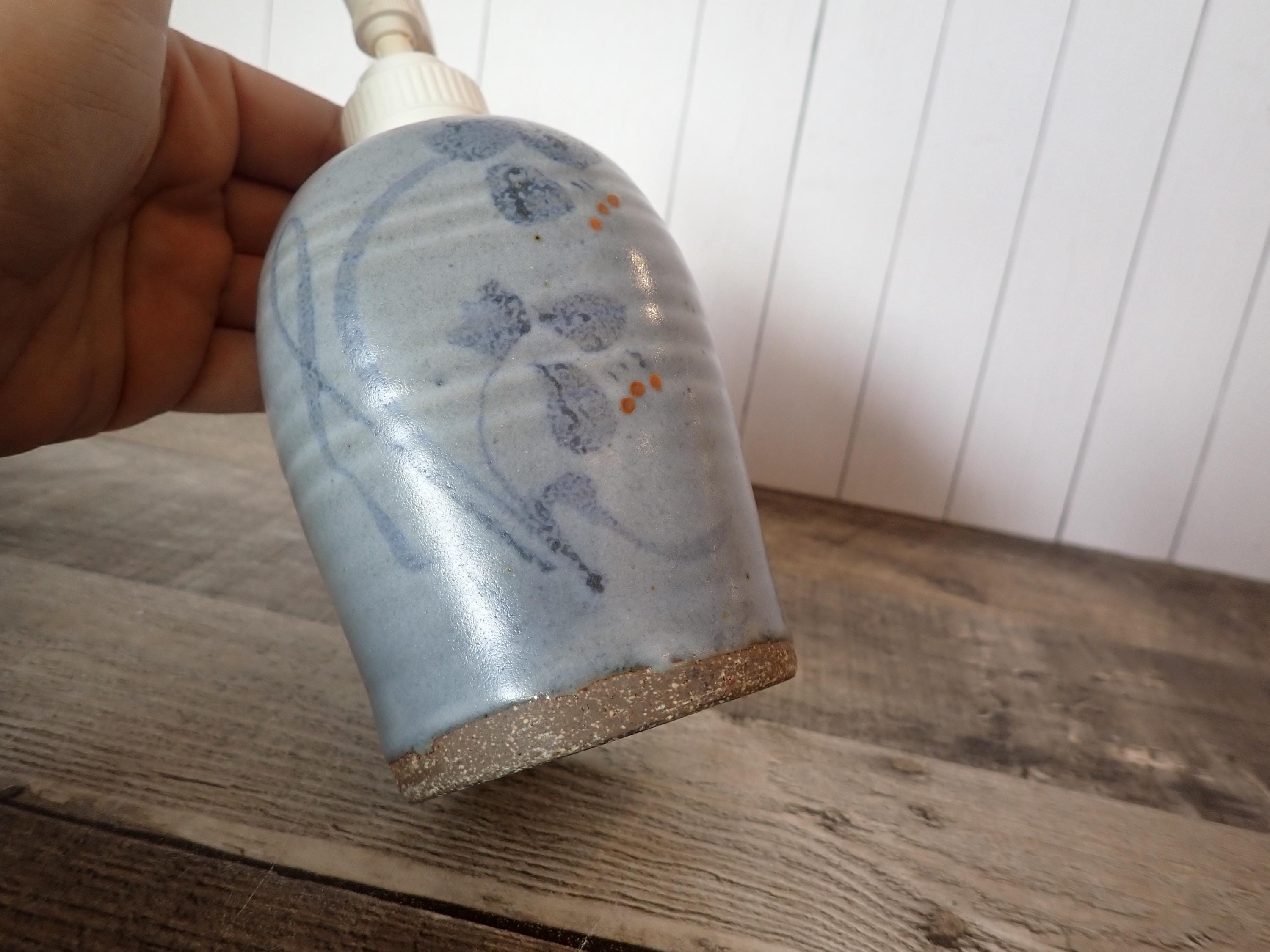 This stoneware soap dispenser was made by artist Peggy Ahlgren of Wilson Creek Pottery from Spring Green, Wisconsin. The dispenser is 7" tall to the top of the pump (4.75" tall to the top of the bottle) and 3.25" wide. The dispenser is a tan stoneware with a blue glaze, and has a floral design in a darker blue glaze. The bottom is signed by the artist Peggy Ahlgren. The top of the bottle has a white plastic pump mechanism. The dispenser is in very good condition with no chips or cracks. The pump mechanism has been cleaned and is in working order. Please visit my shop for additional Peggy Ahlgren pieces!