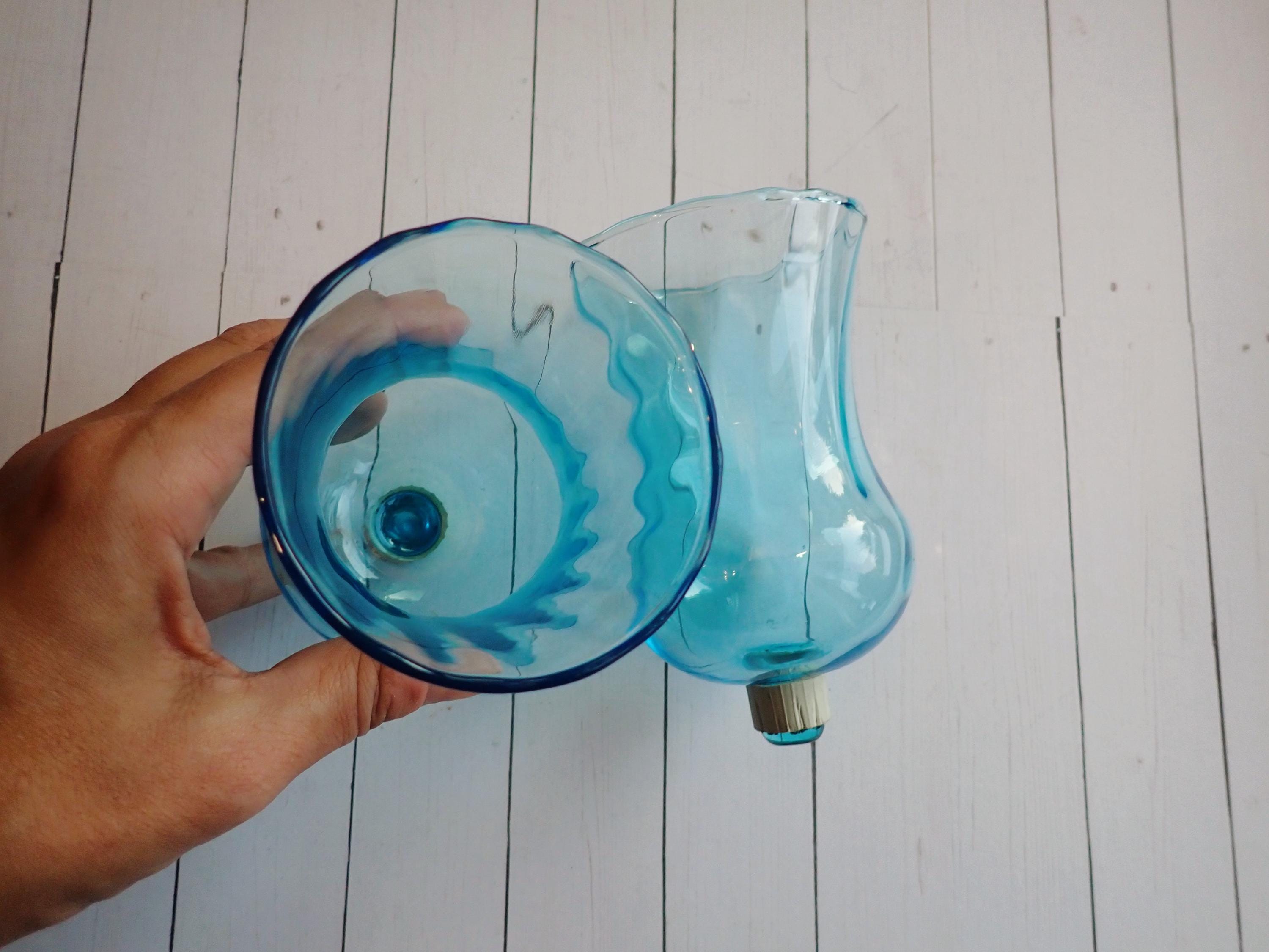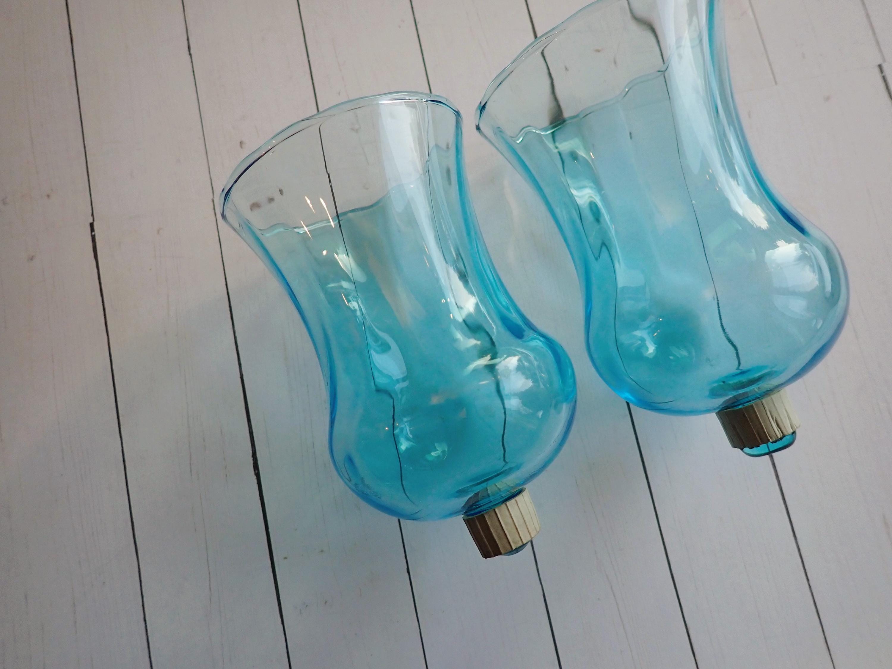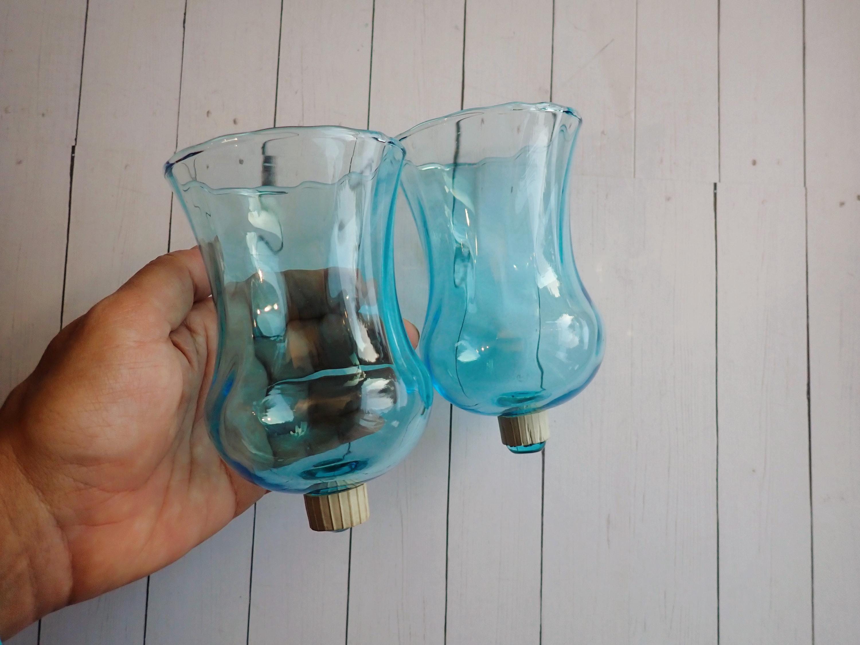 These blue glass votive cups are light blue colored glass and measure 4.5" tall (without the peg on the bottom) and 3.25" in diameter. They have a curved and rounded shape with a light swirl design in the glass, and the rim flares slightly outward. They can hold a small tealight of votive candle. They include the rubber grommets to secure into a candlestick or sconce. The holders are in very good condition with no chips or cracks.