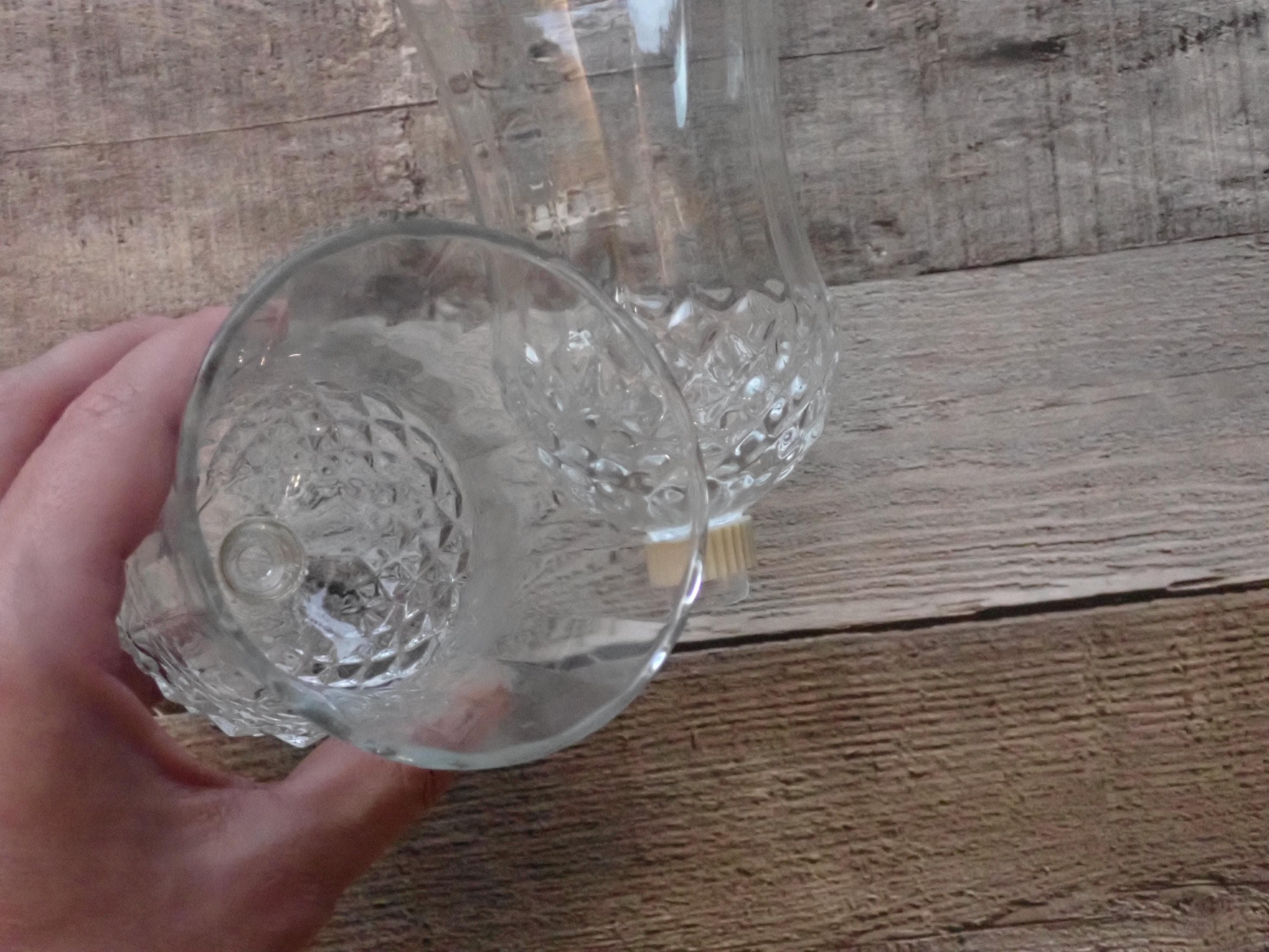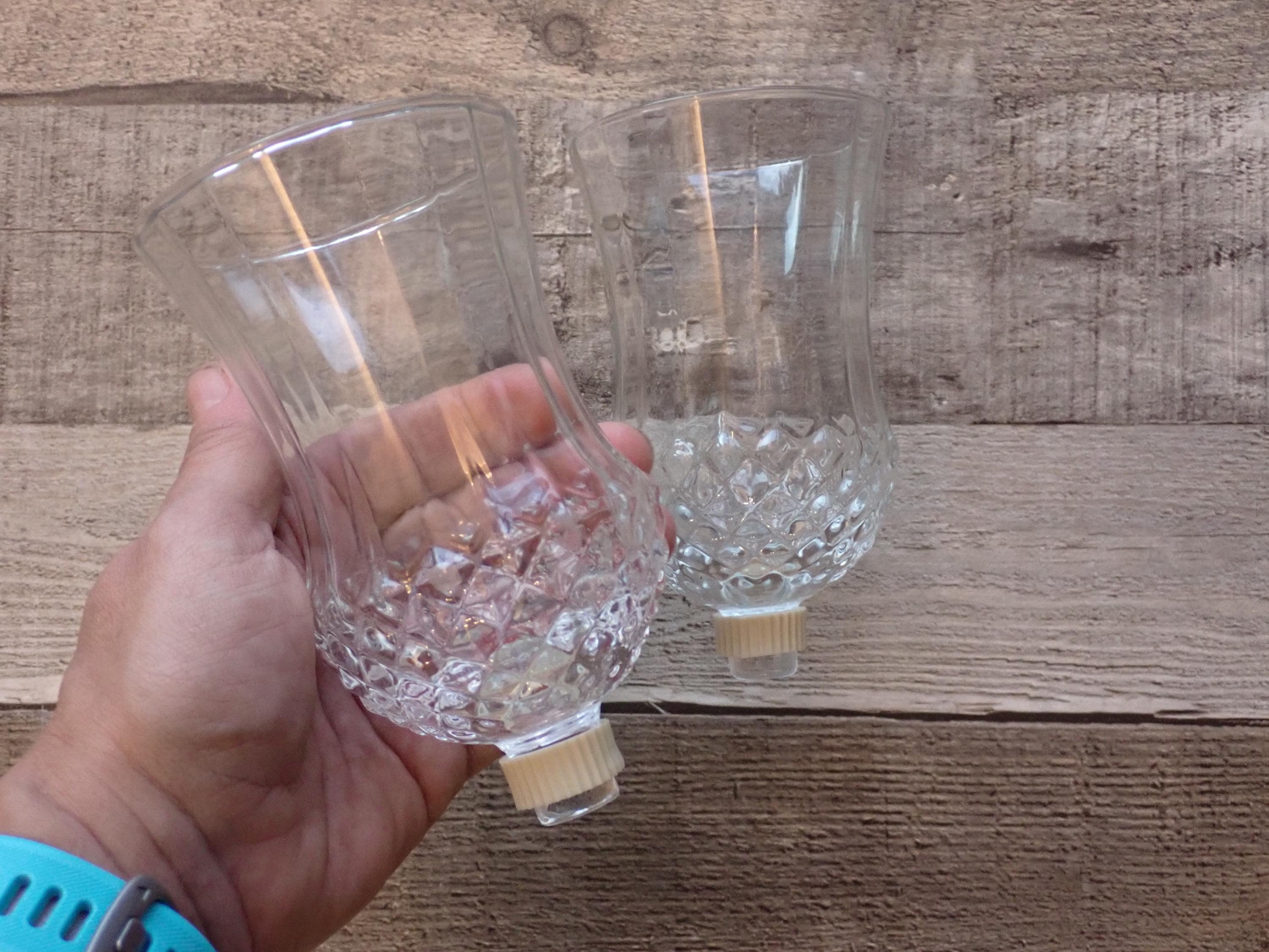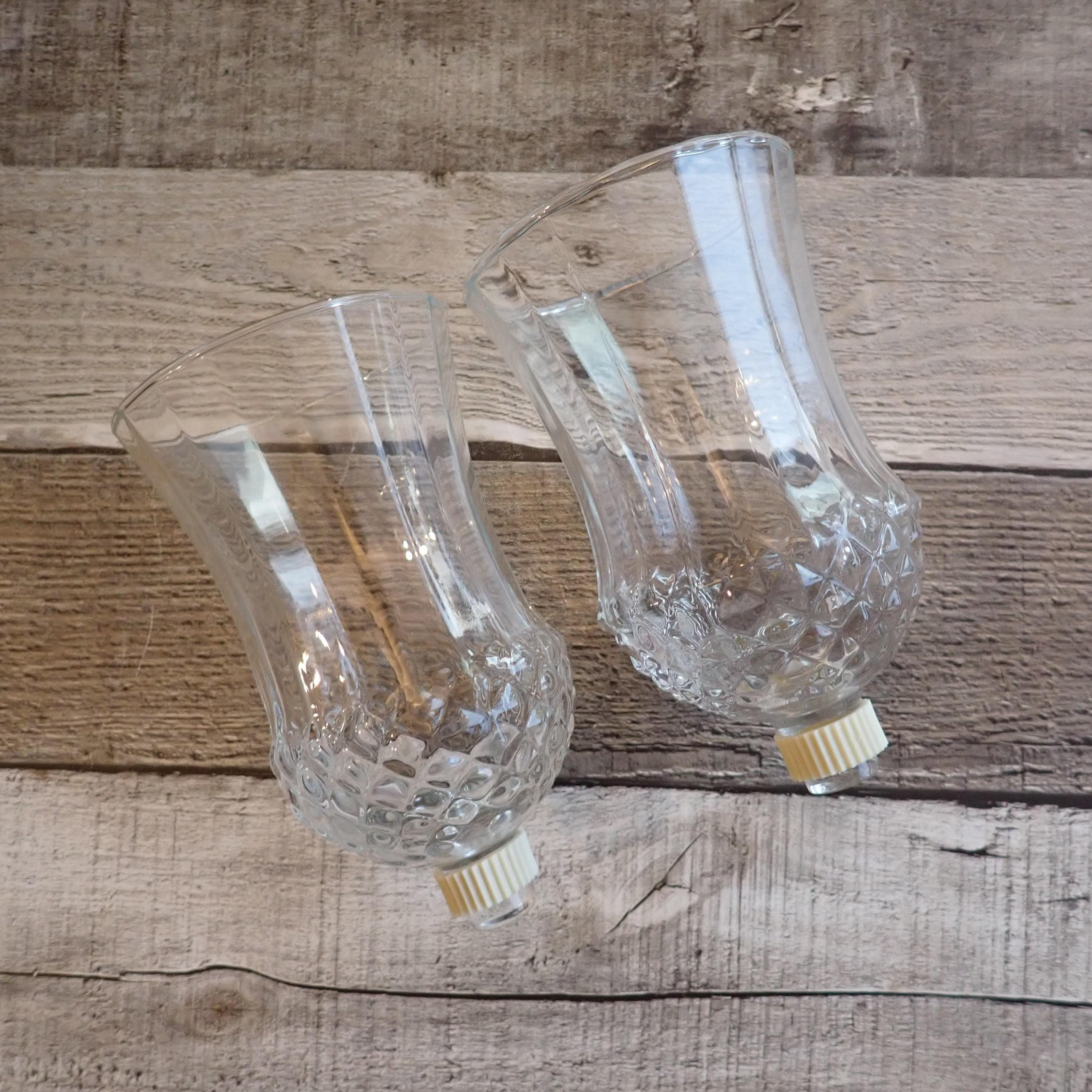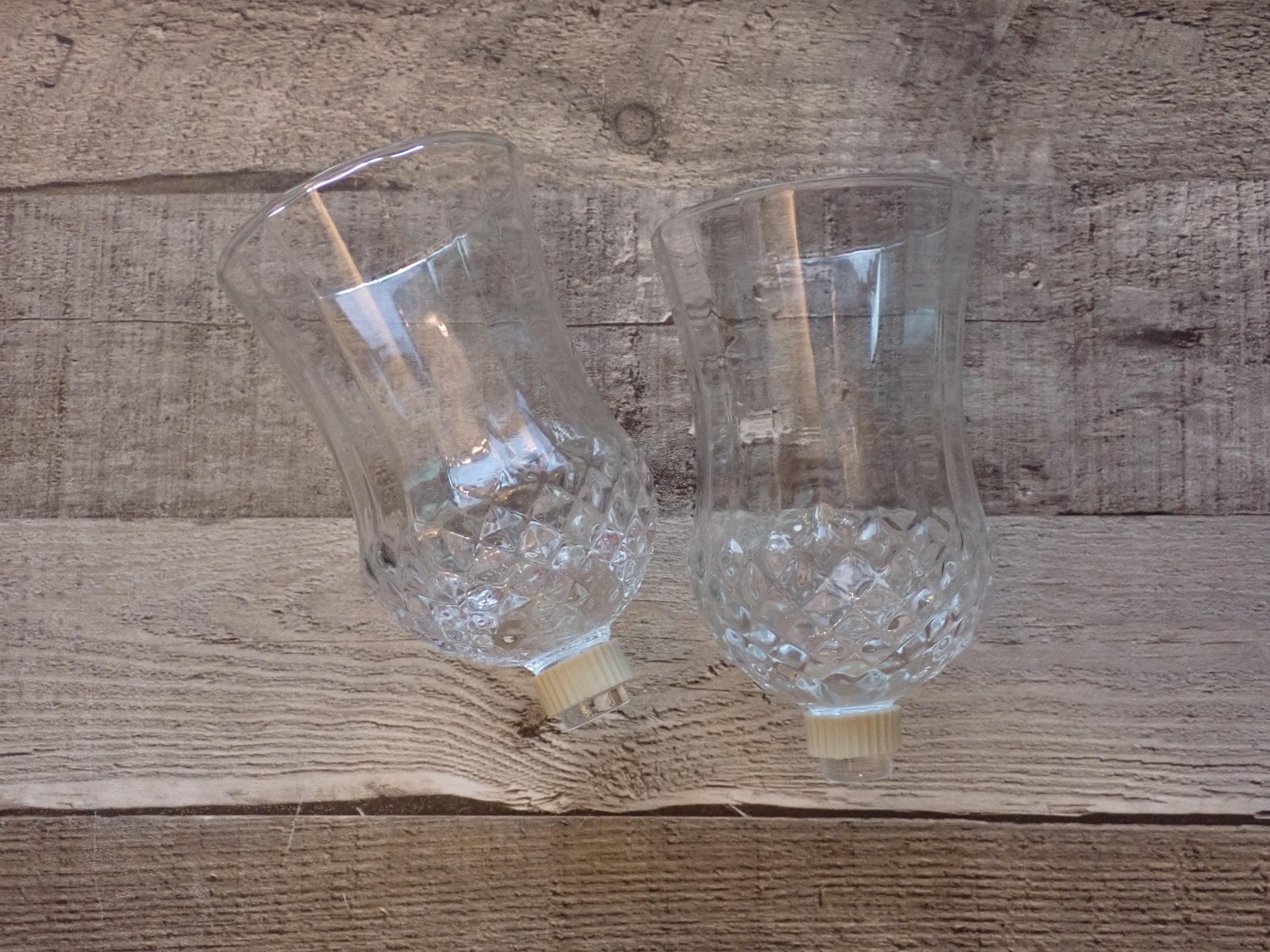 This set of 2 clear glass candle holders are 5" tall and 3" in diameter. They are clear glass and have a diamond pattern around the bottom and a flat paneled design around the upper portion. The bottom of each holder has a glass peg to insert into a candle sconce or a candlestick holder. The votive cups are in very good condition with no chips or cracks. The holders will include the rubber grippy attachments to help hold them into your sconce or candlestick.