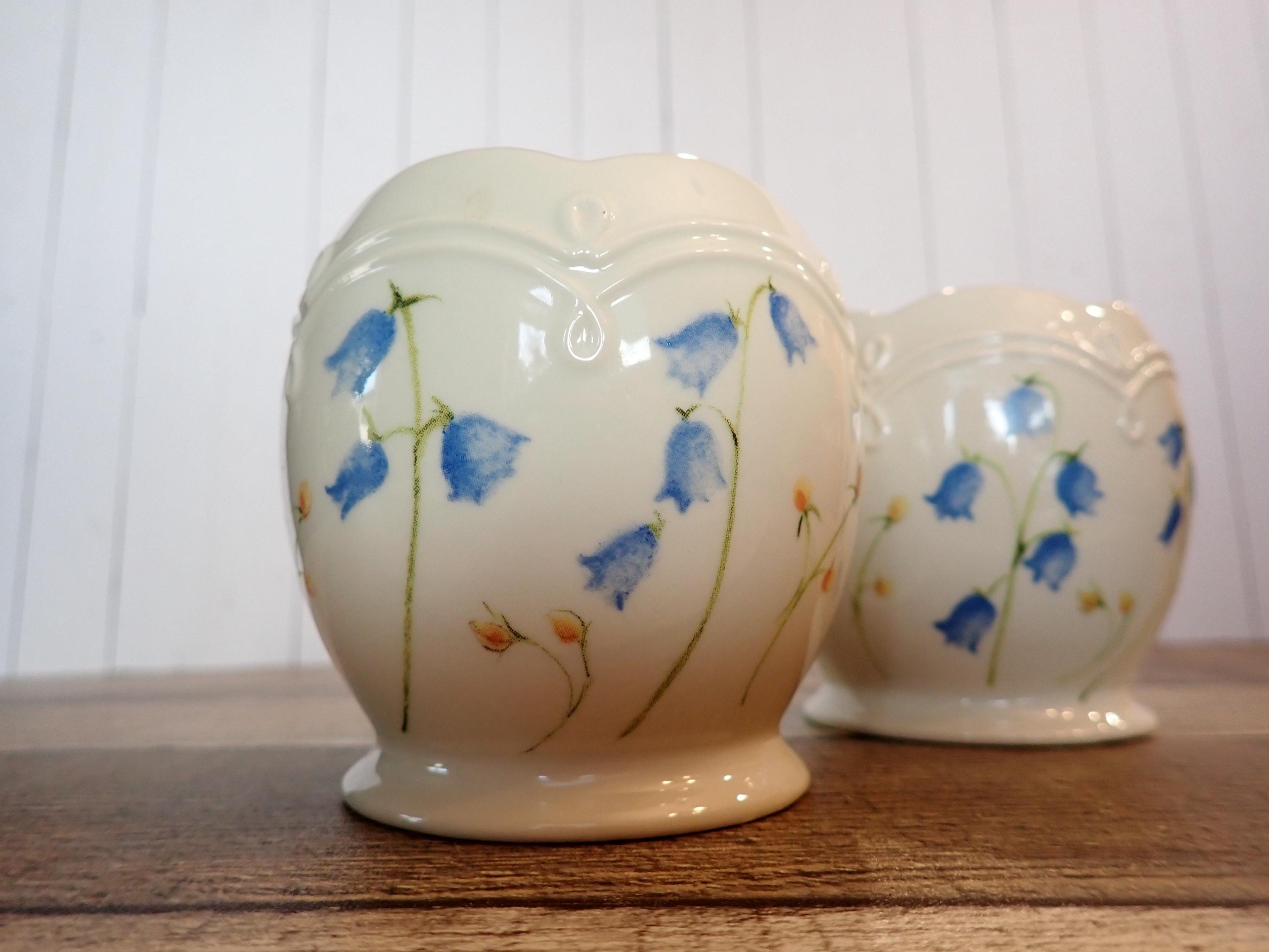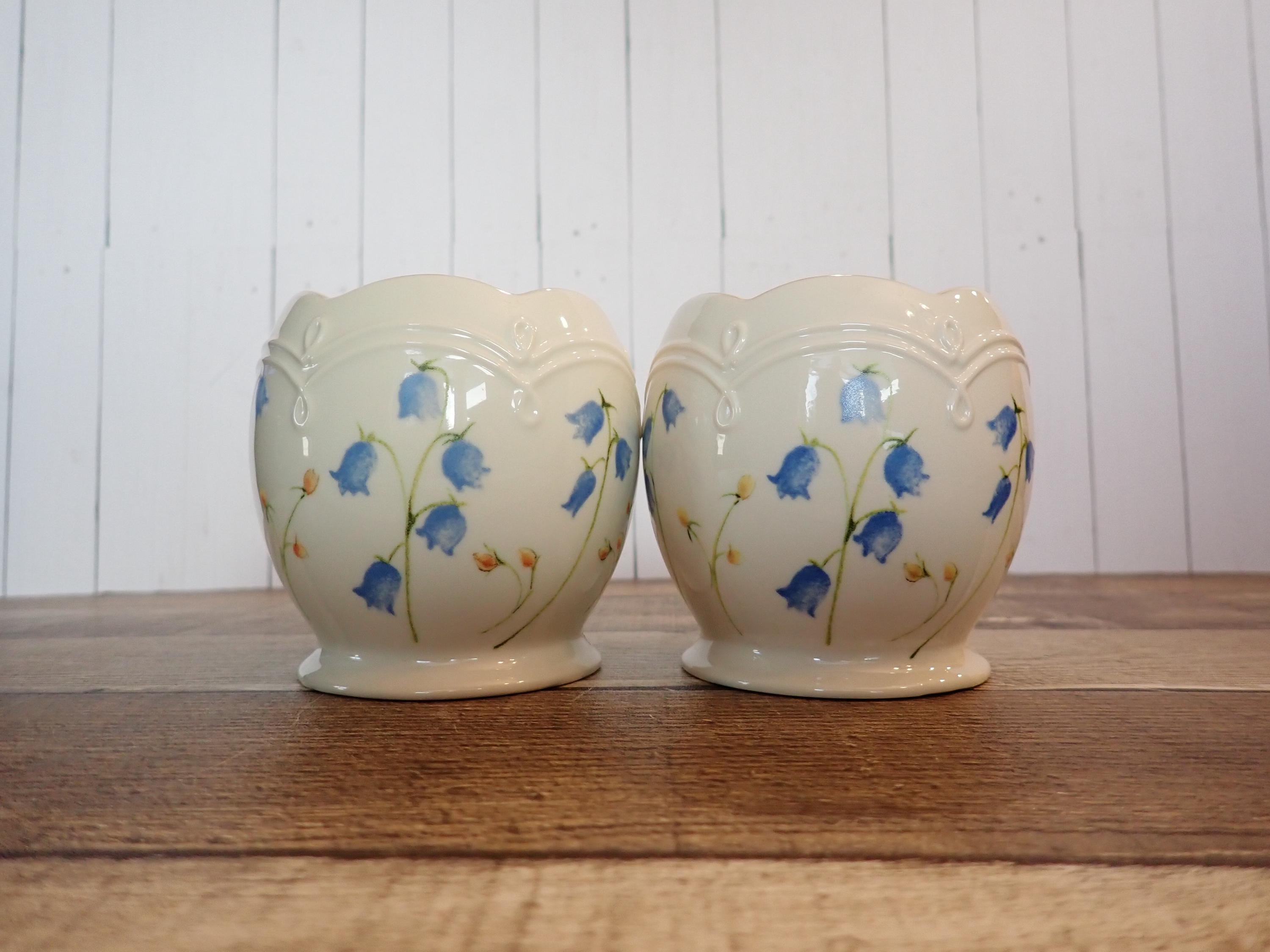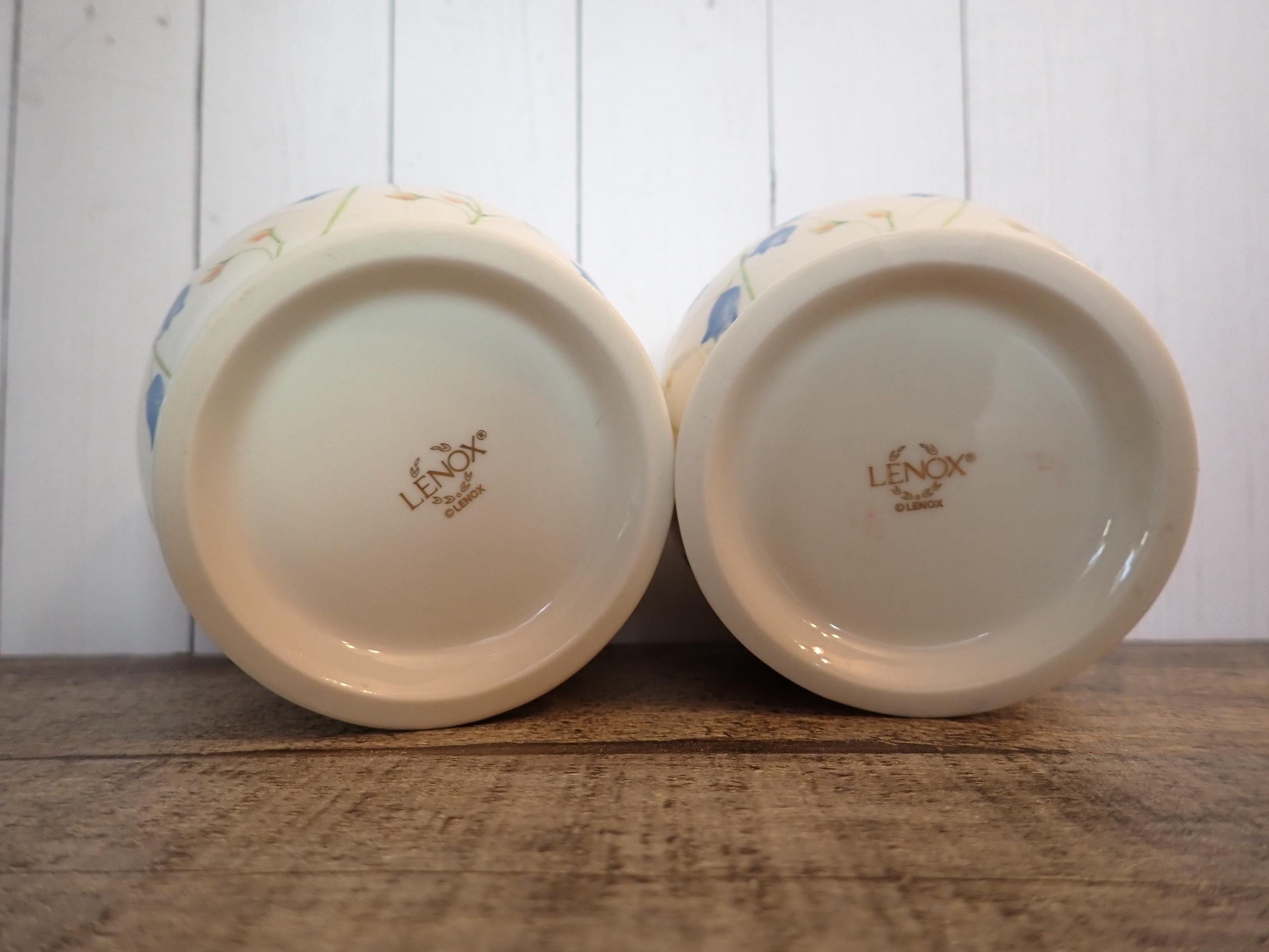 This set of 2 Lenox candleholders includes 2 matching holders in the same pattern. They are3.25" tall and 3.25" wide at the widest point. They are an ivory colored ceramic with a blue flower design around the holders. They are marked Lenox on the bottom. Both candle holders are in very good condition with no chips or cracks.