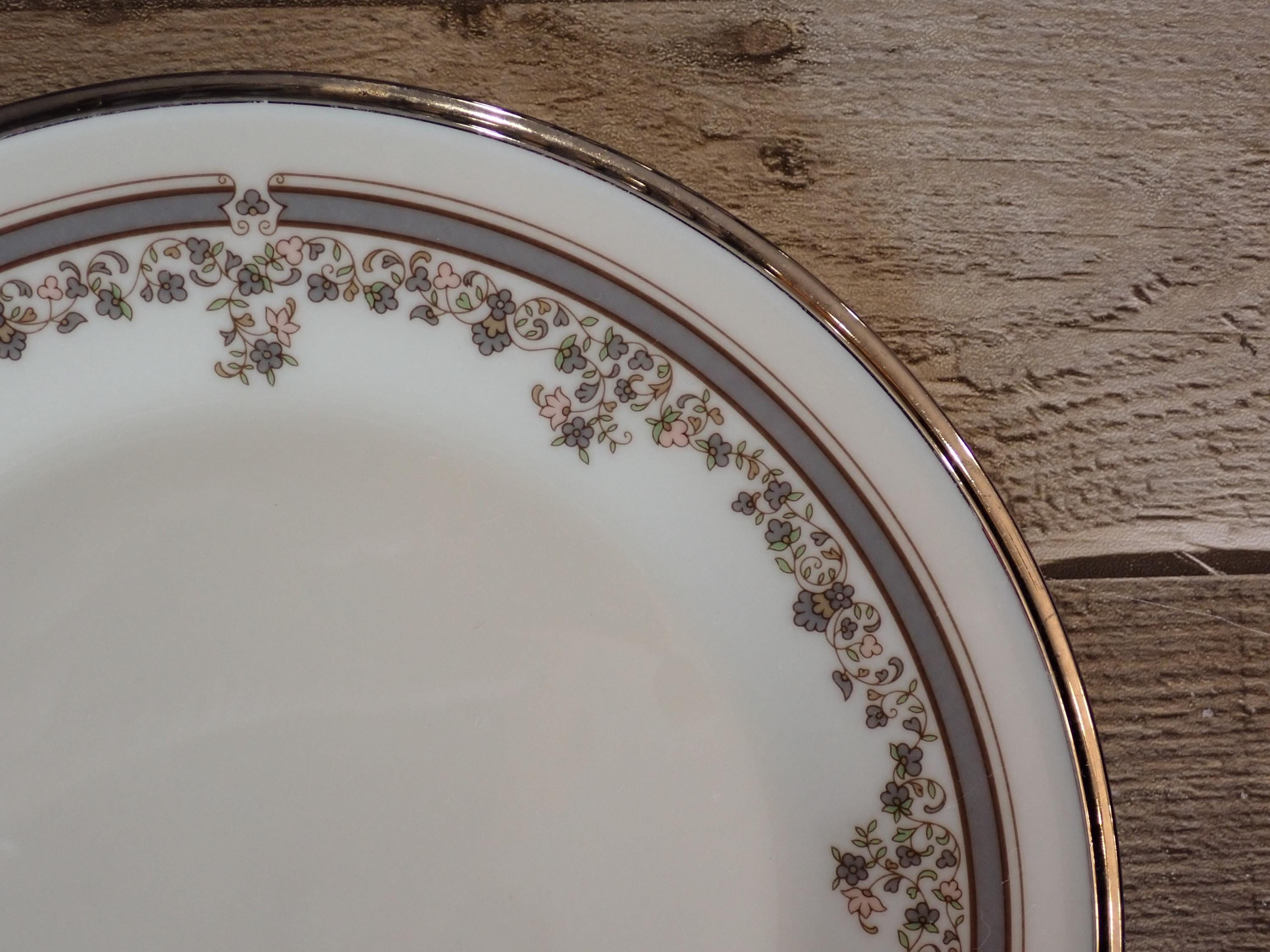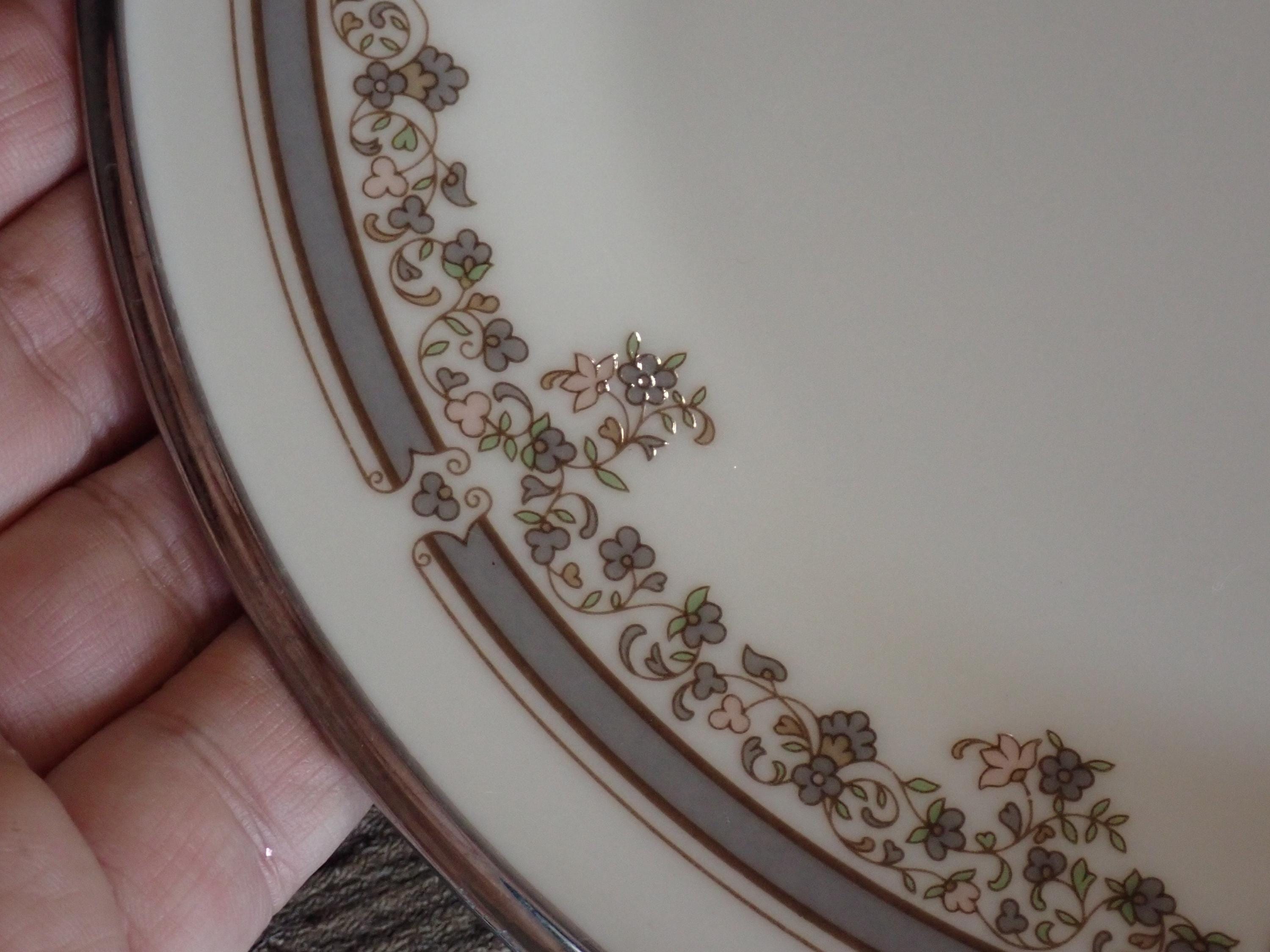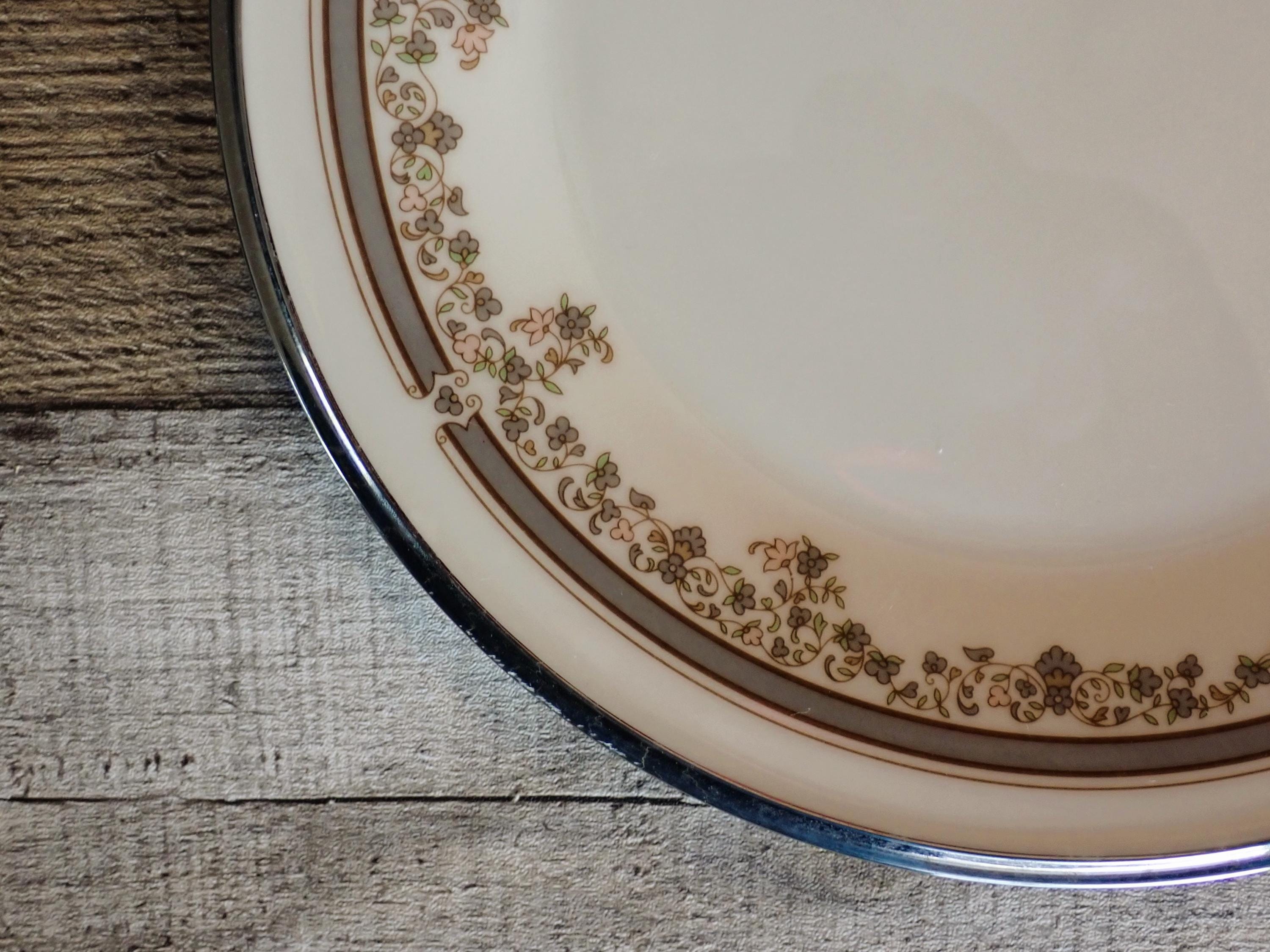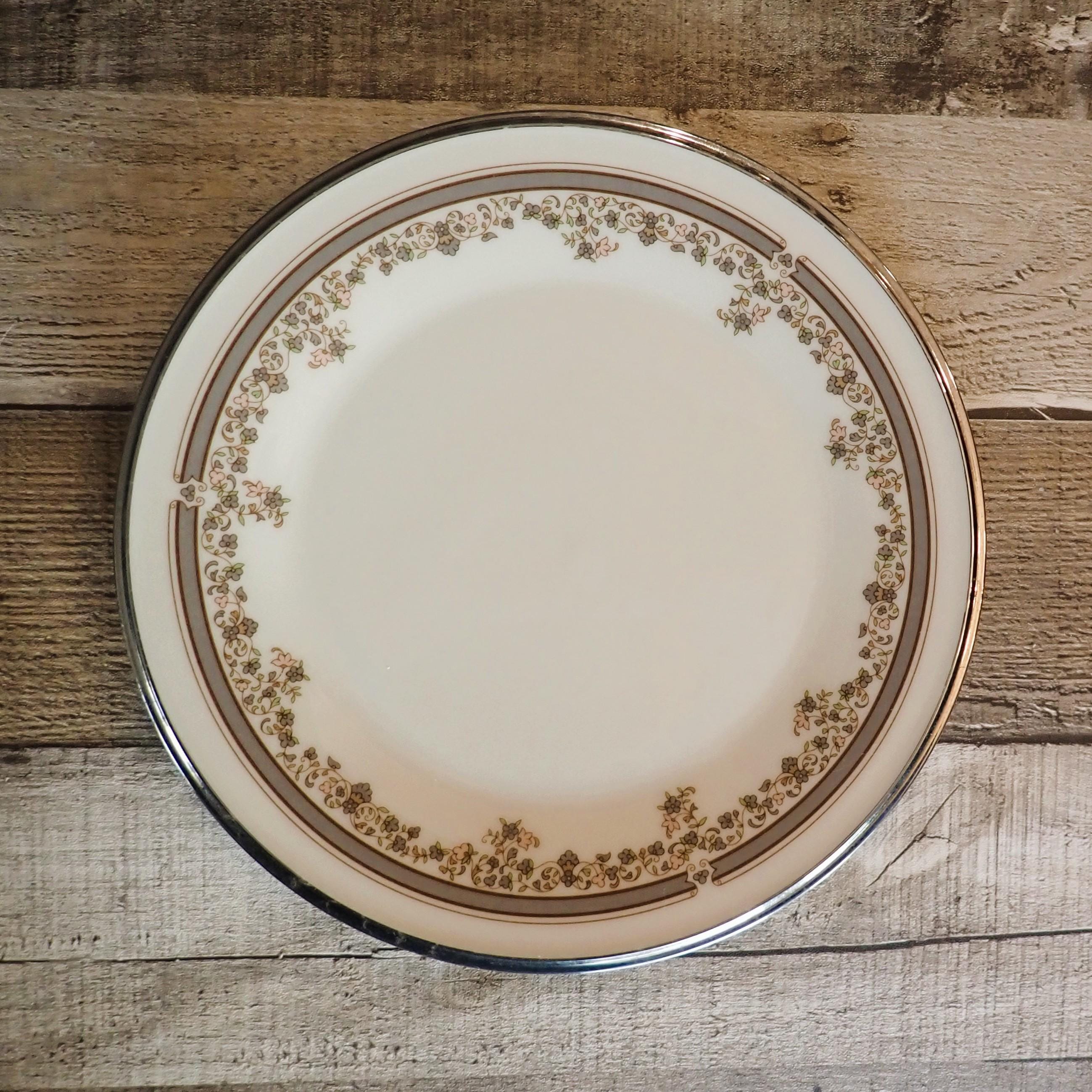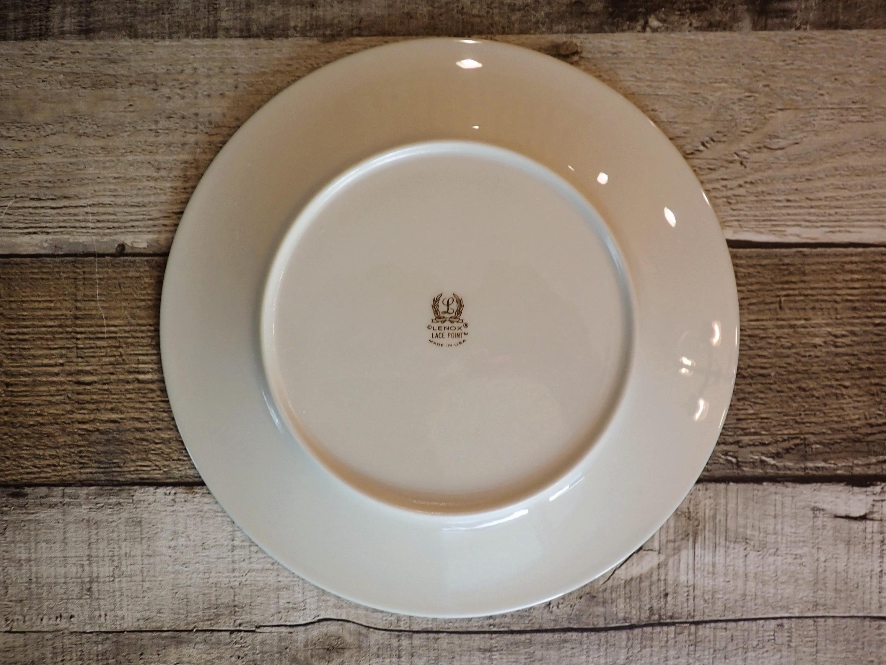 This single plate by Lenox is in the Lace Point pattern and is an 8" Salad Plate. The plate is an ivory colored ceramic, and has a gray and pink flower and leaf design around the rim. It is accented with a silver band around the rim. The bottom is marked: LENOX / LACE POINT / MADE IN USA. The plate is in very good condition with no chips or cracks. All of the graphics are bright and clear. This listing is for one single plate.