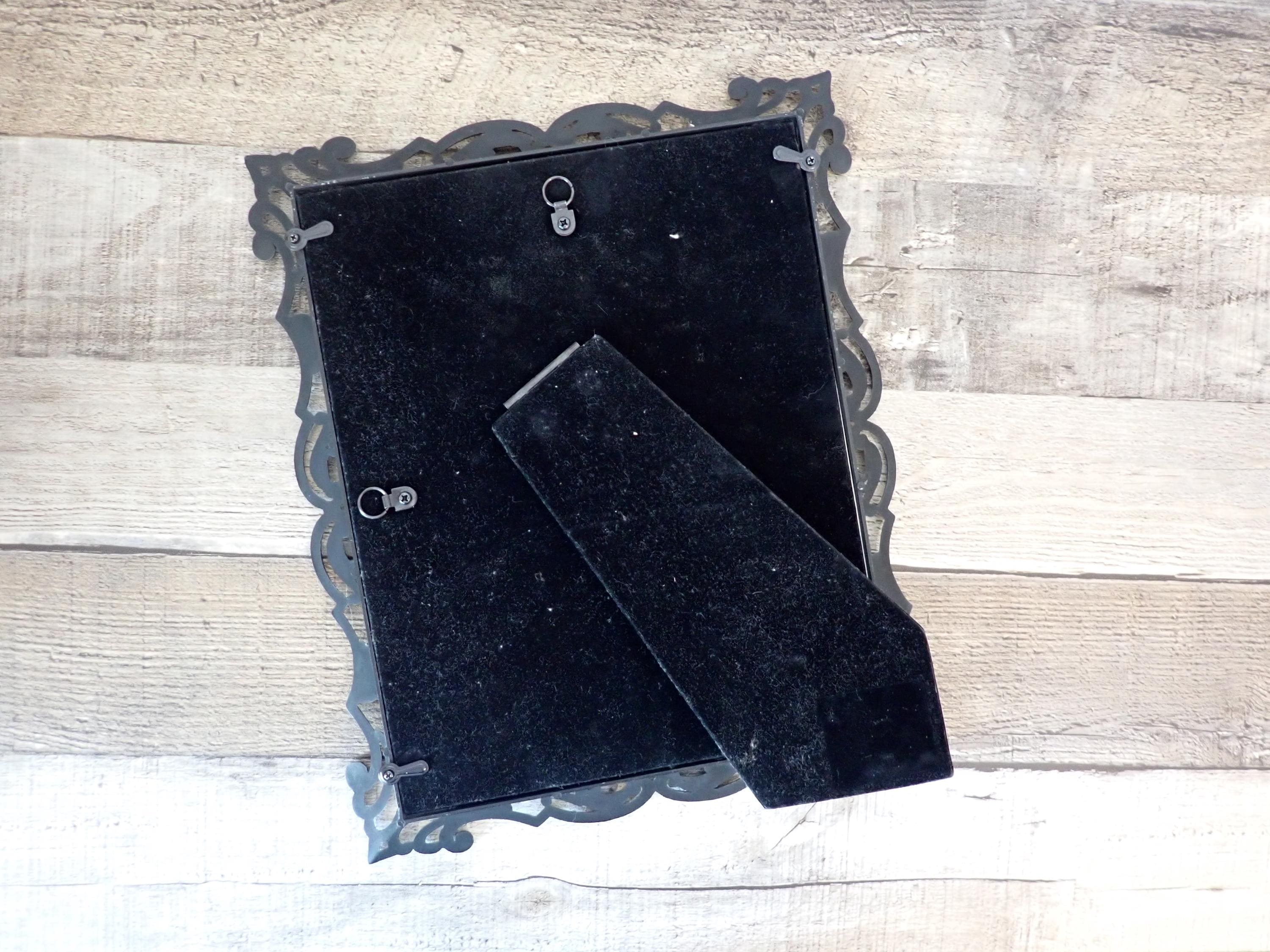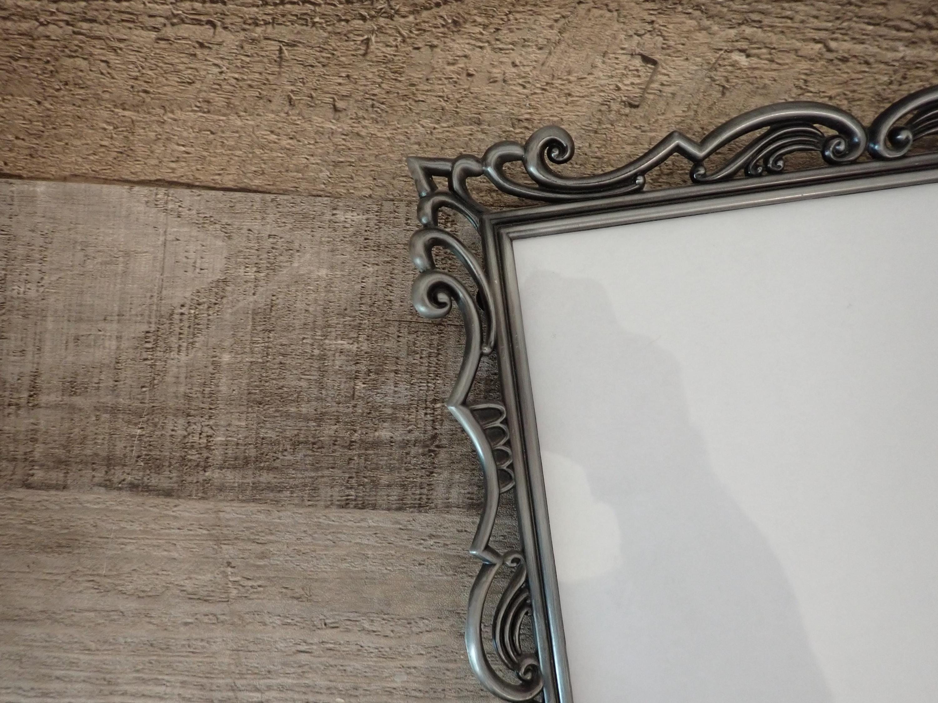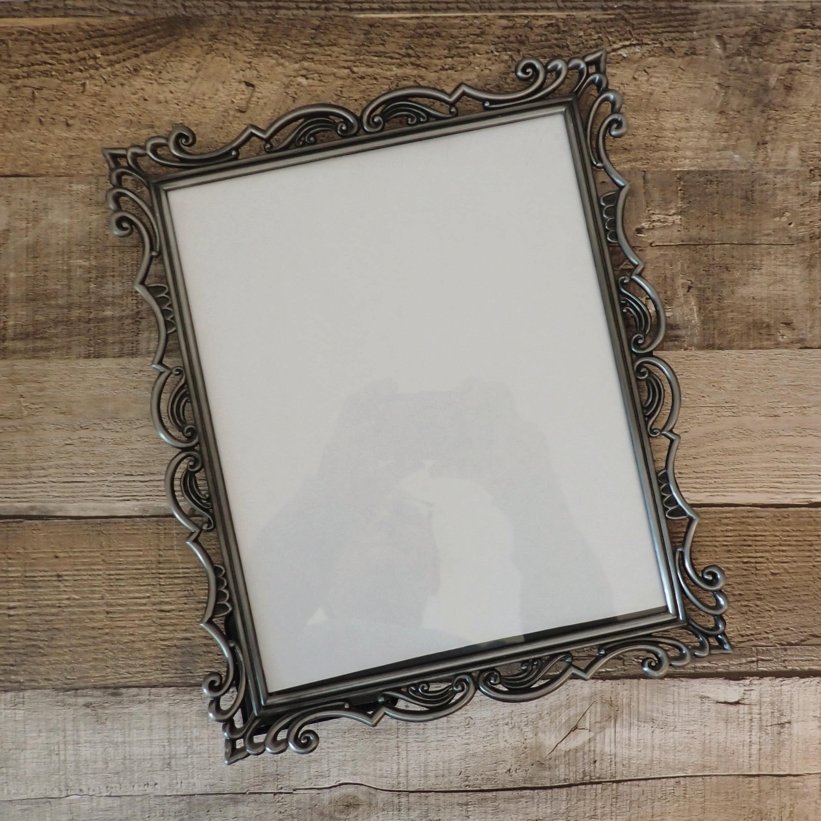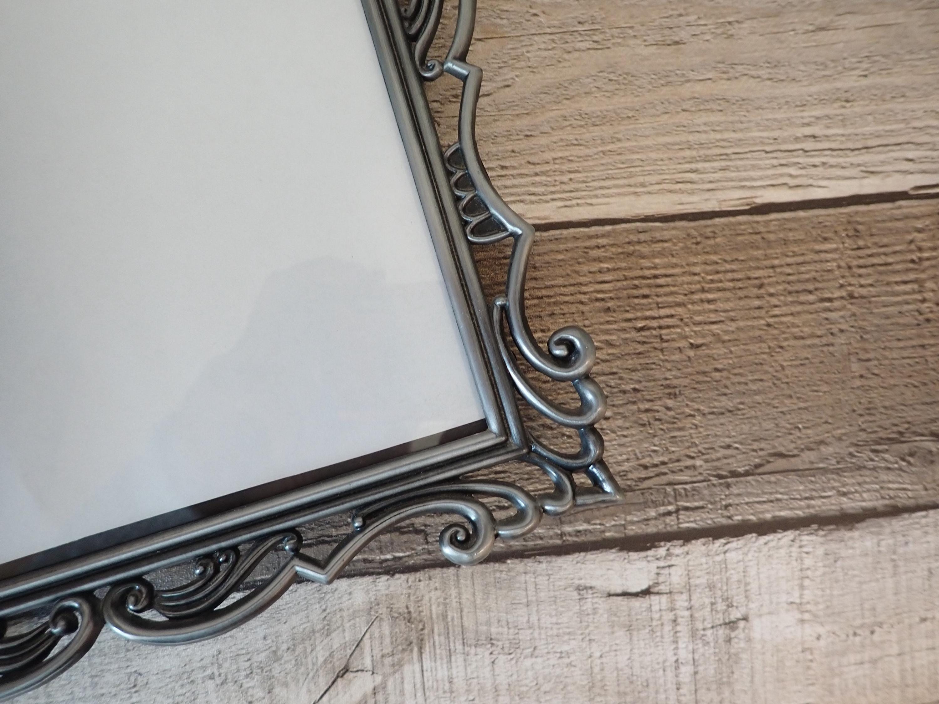 This silver metal photo frame is 11.75" tall by 9.75" wide and can hold one 8x10 photo vertically or horizontally. The frame is a silver metal and has an openwork scroll design. The frame has a clear glass insert over the photo opening, and a cardboard backing piece with a photo stand. The frame is in very good condition, however there are some light scratches here and there.