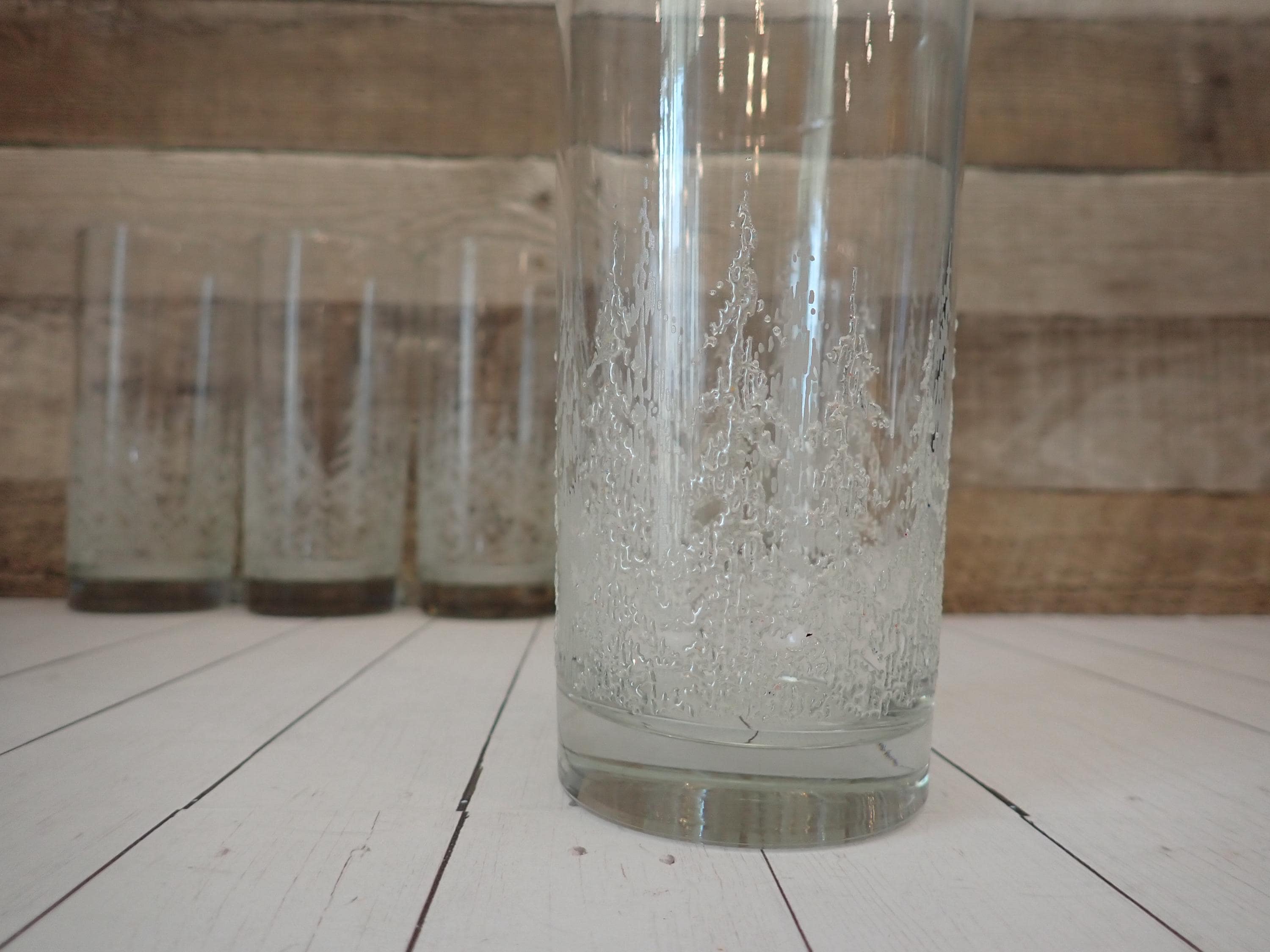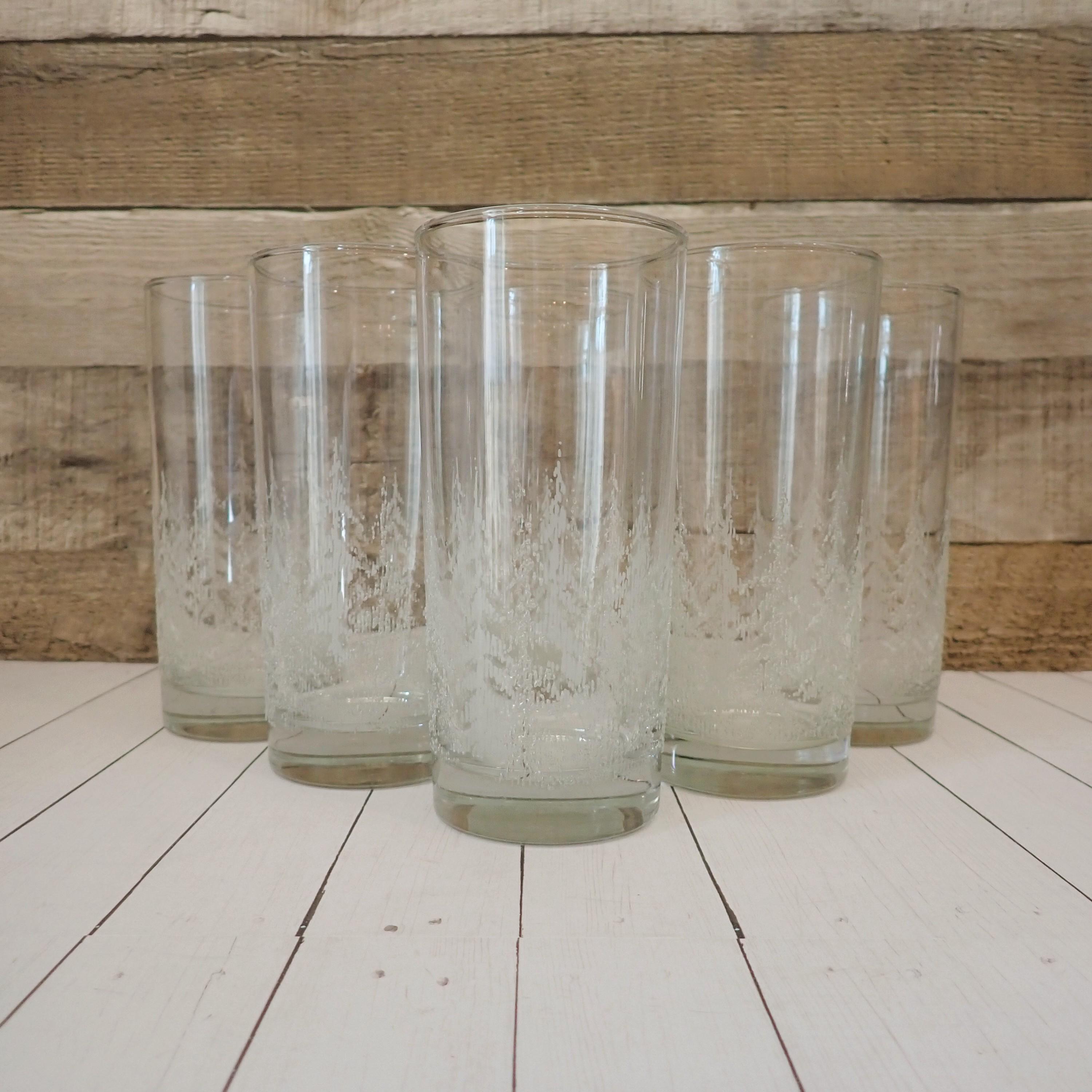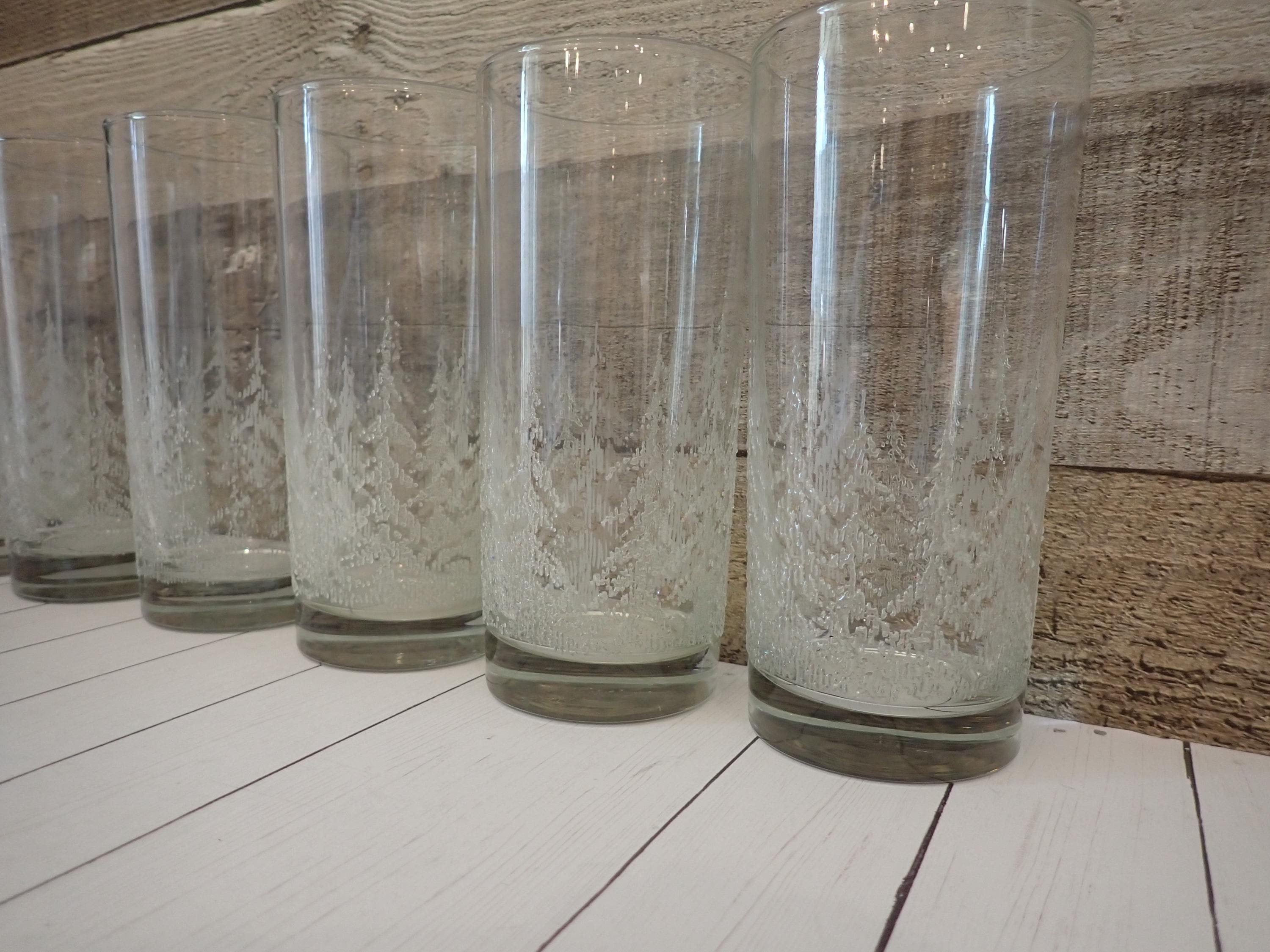This set 6 tumbler glasses by Libbey are a clear glass with a frosted pine tree design. Each glass is 6.25" tall and 3" in diameter and can hold 14 oz. The glasses are in very good condition with no chips or cracks.
