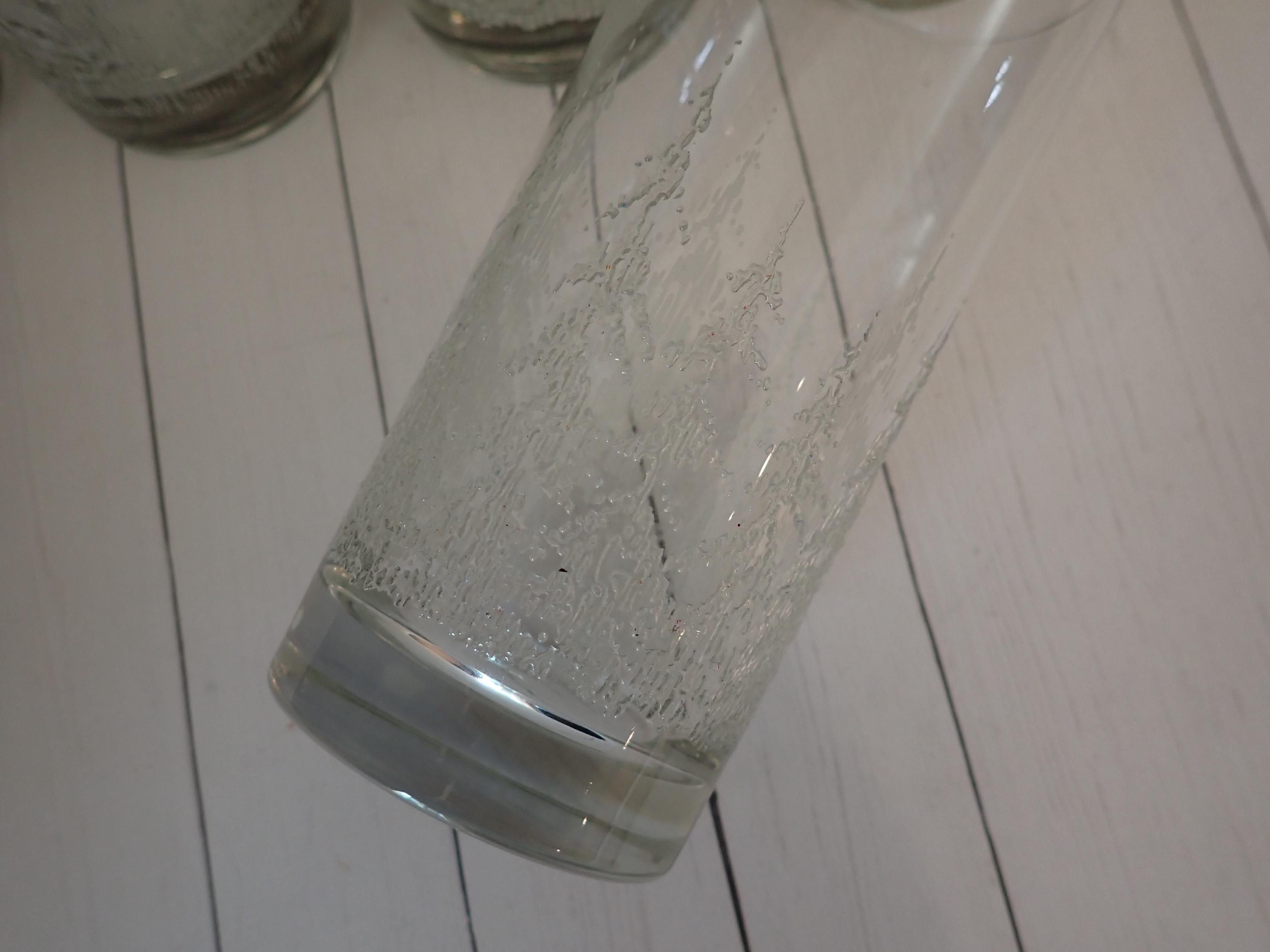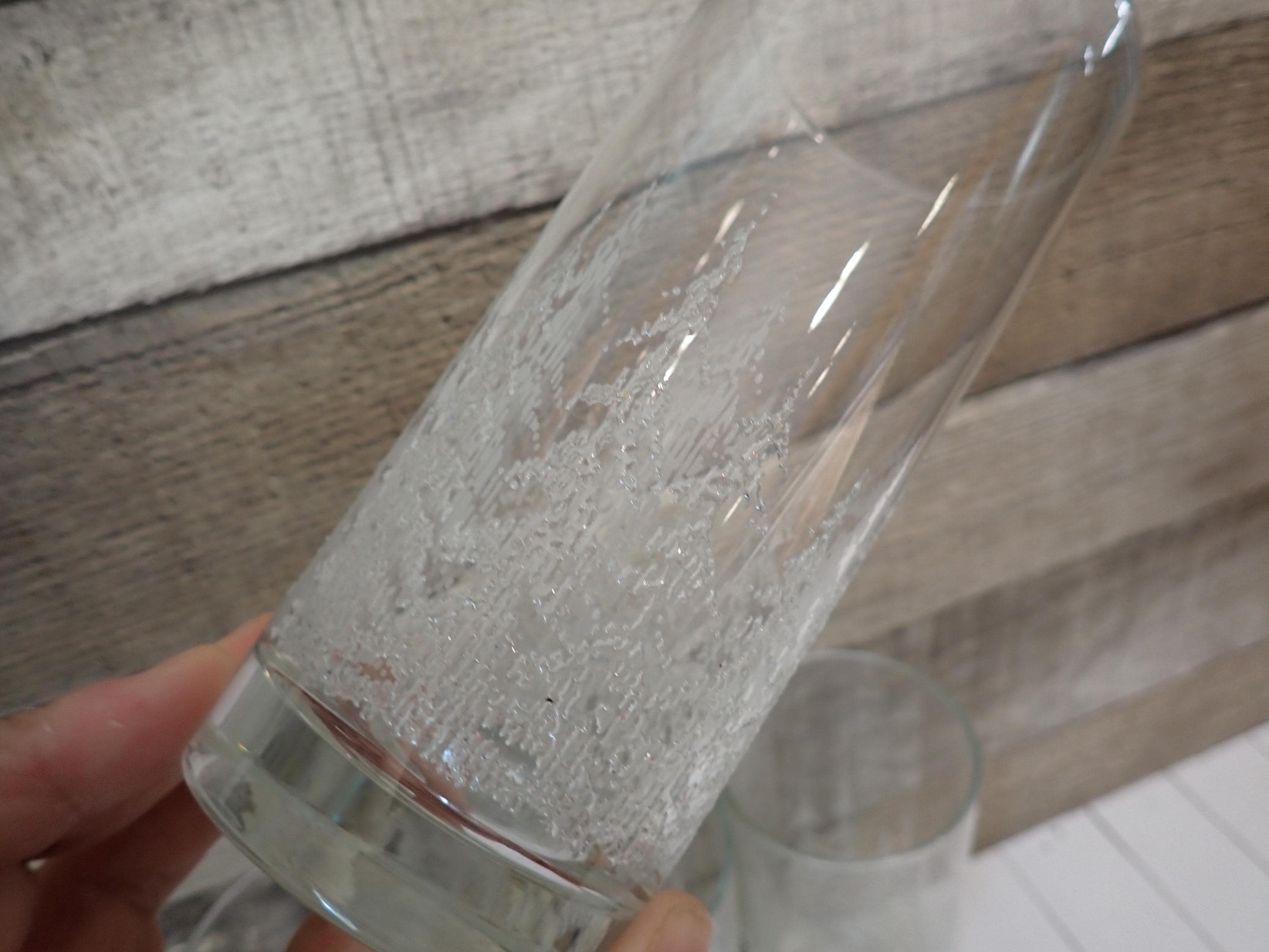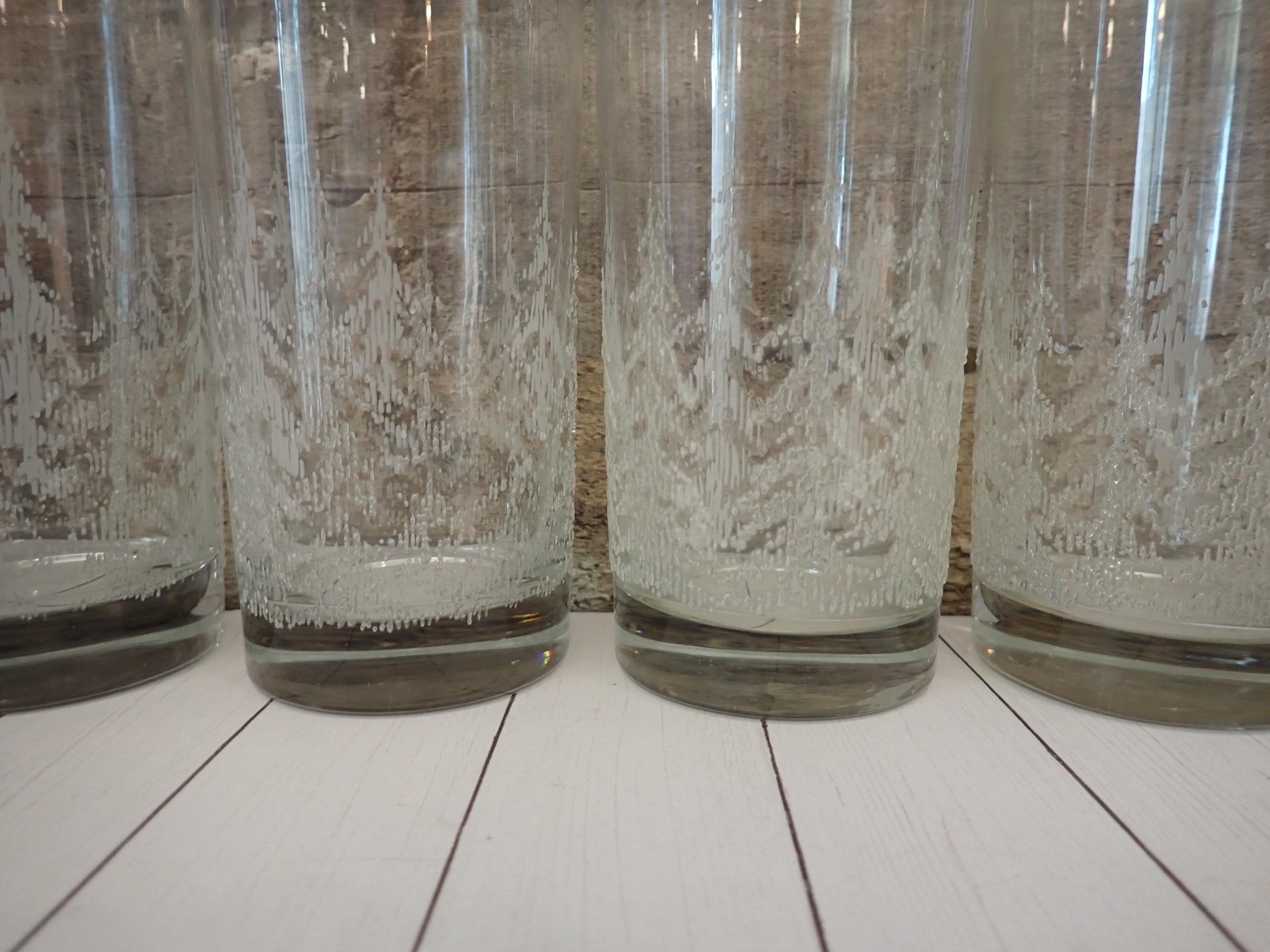 This set 6 tumbler glasses by Libbey are a clear glass with a frosted pine tree design. Each glass is 6.25" tall and 3" in diameter and can hold 14 oz. The glasses are in very good condition with no chips or cracks.