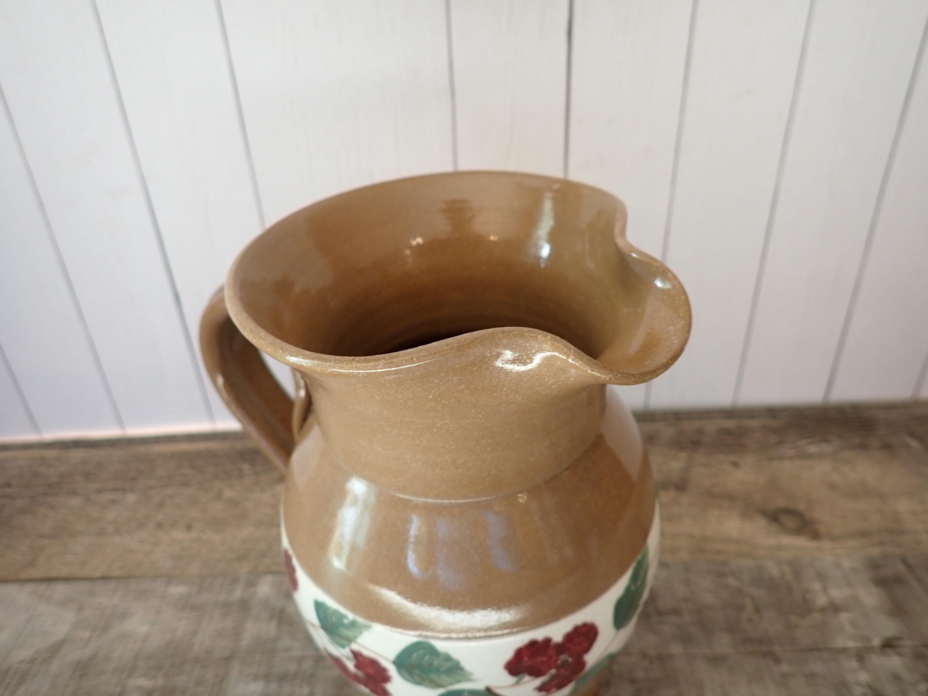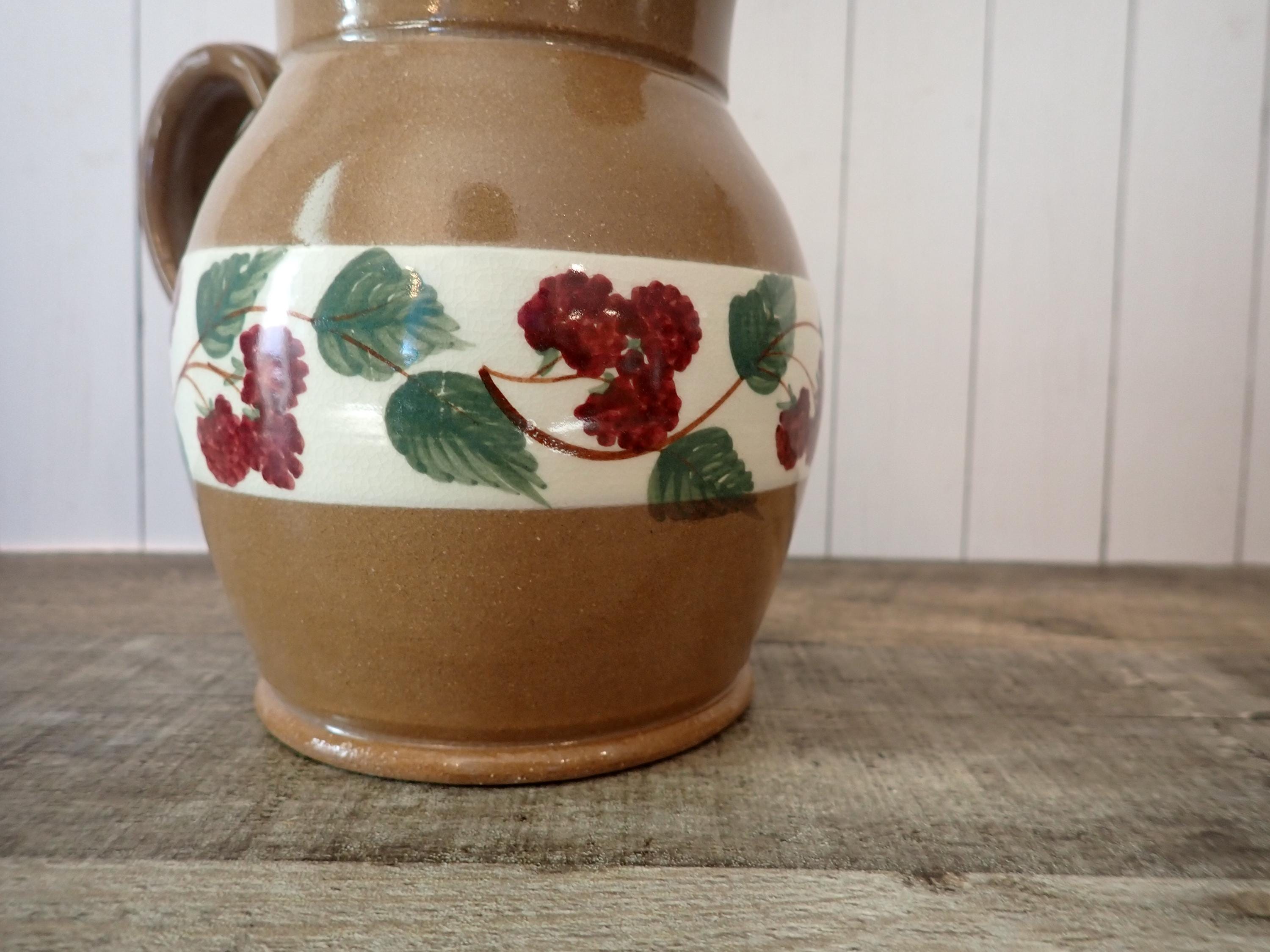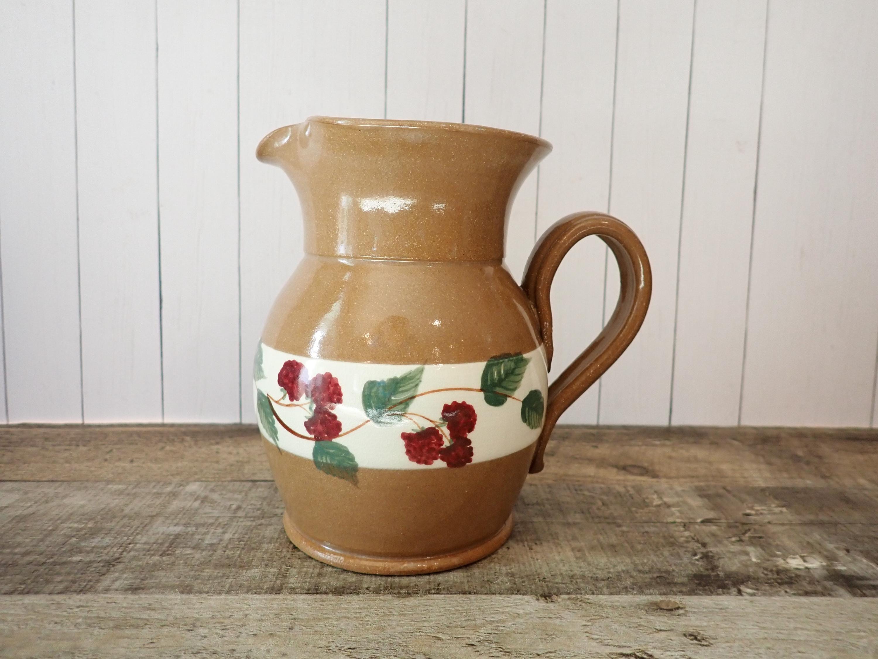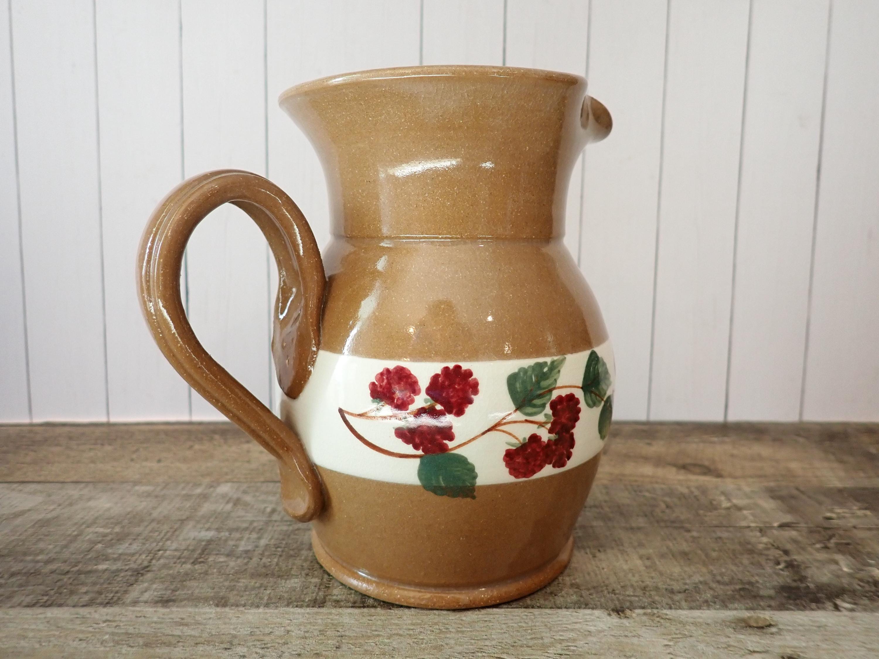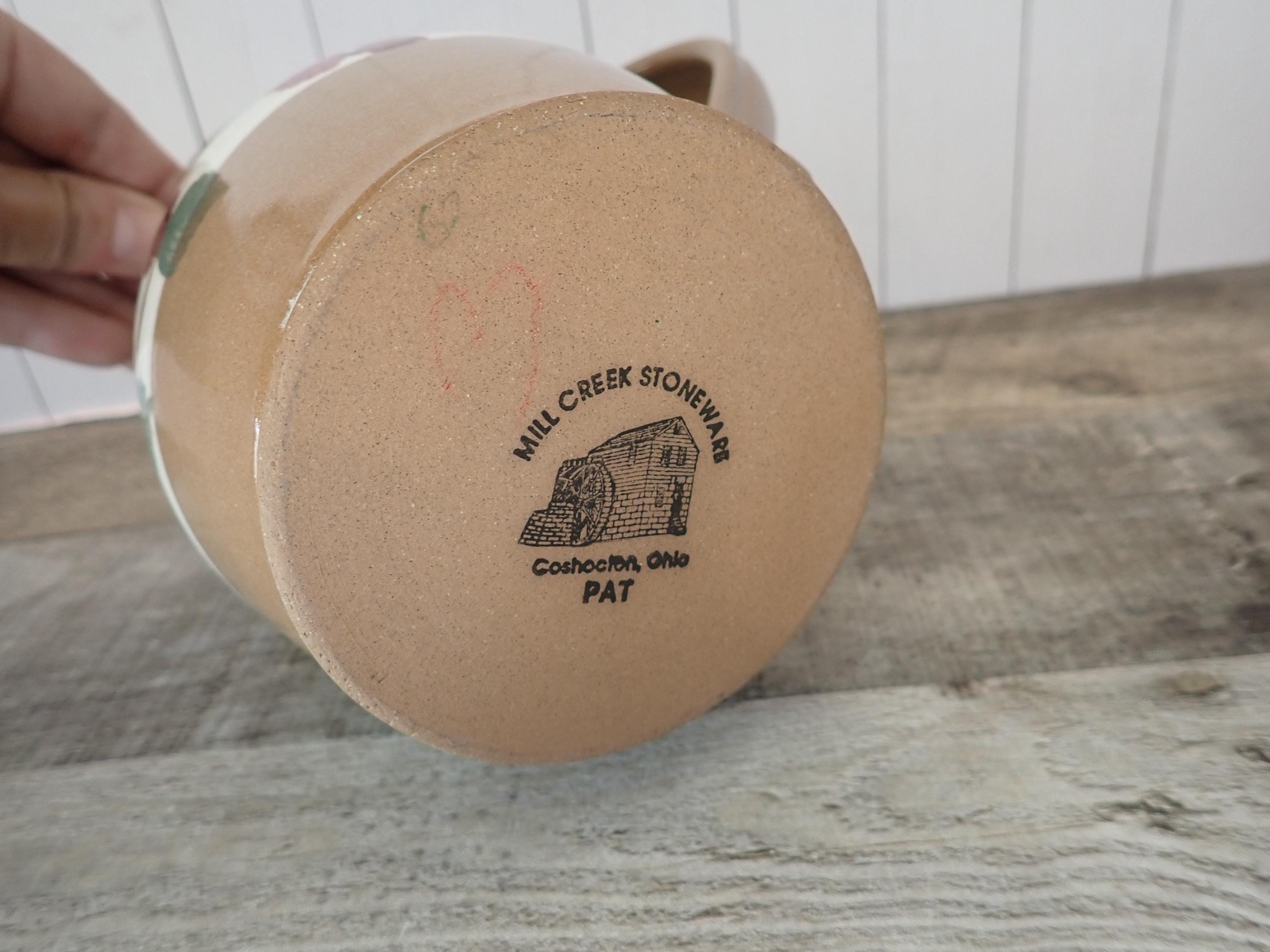 This lovely stoneware pitcher is 6" tall and 5" in diameter. It is a tan stoneware with a white band around the middle with a band of green leaves and red berries. The pitcher has a handle on one side. It is marked on the bottom: MILL CREEK STONEWARE. The pitcher is in very good condition with no chips or cracks.