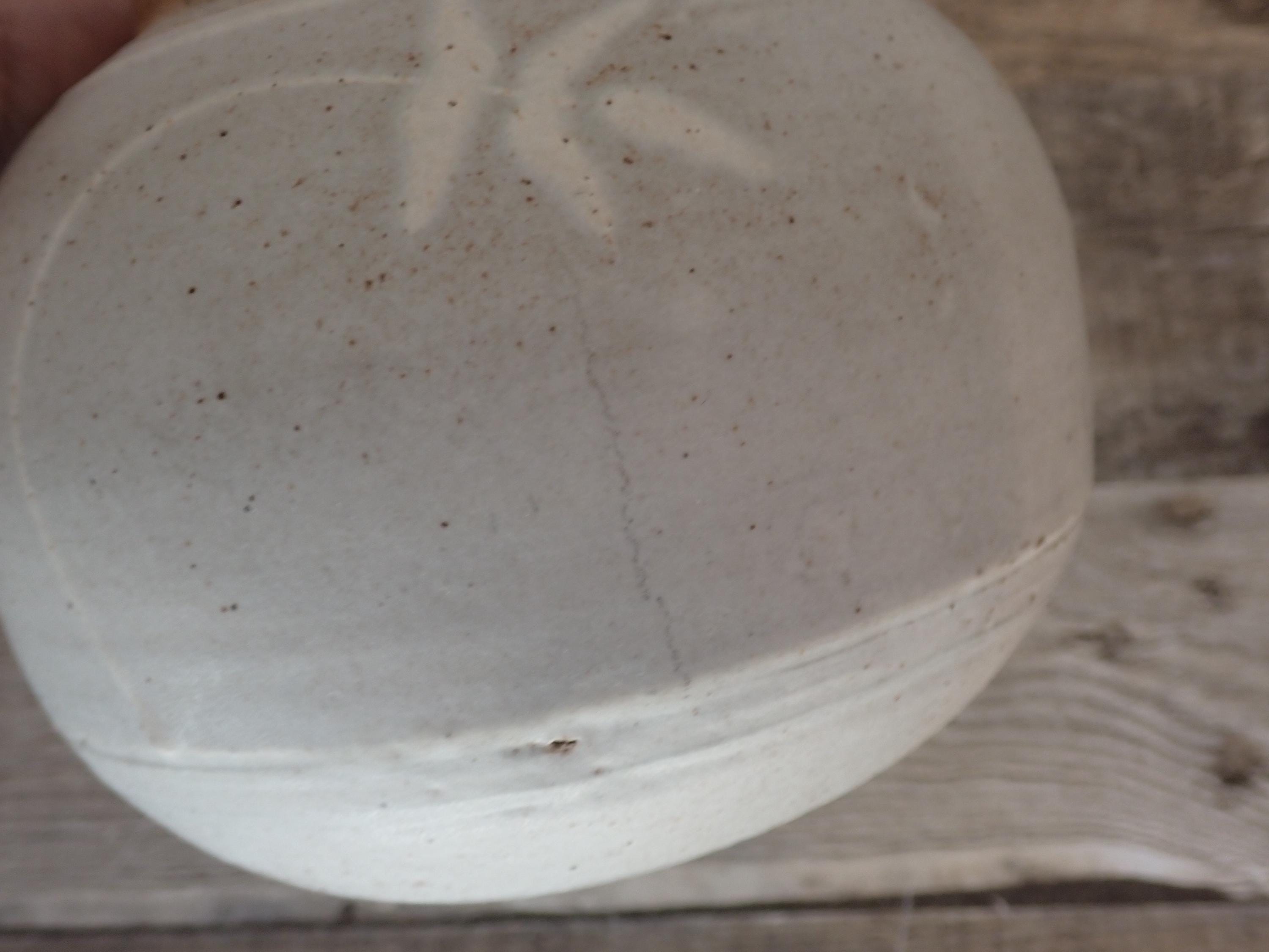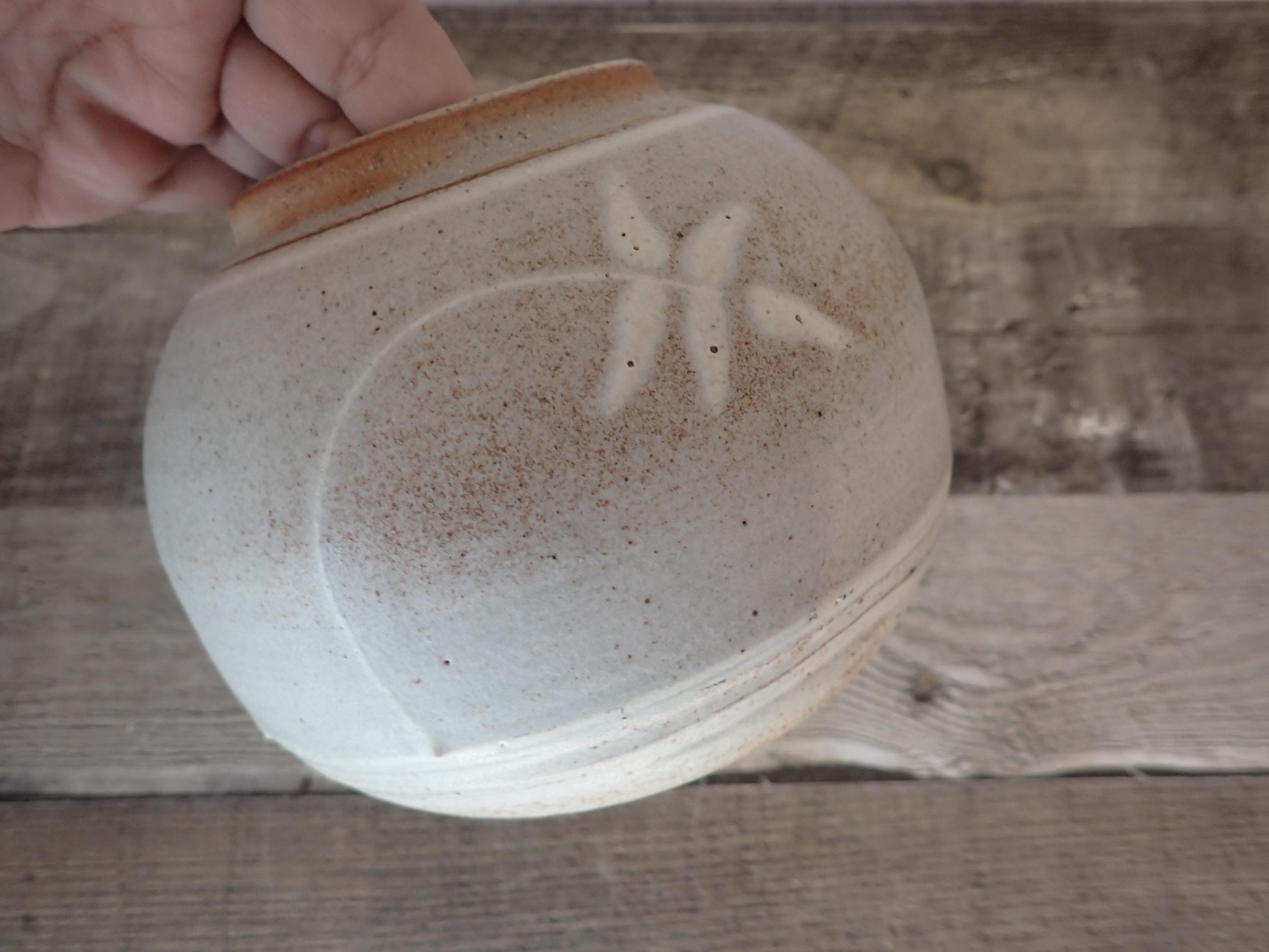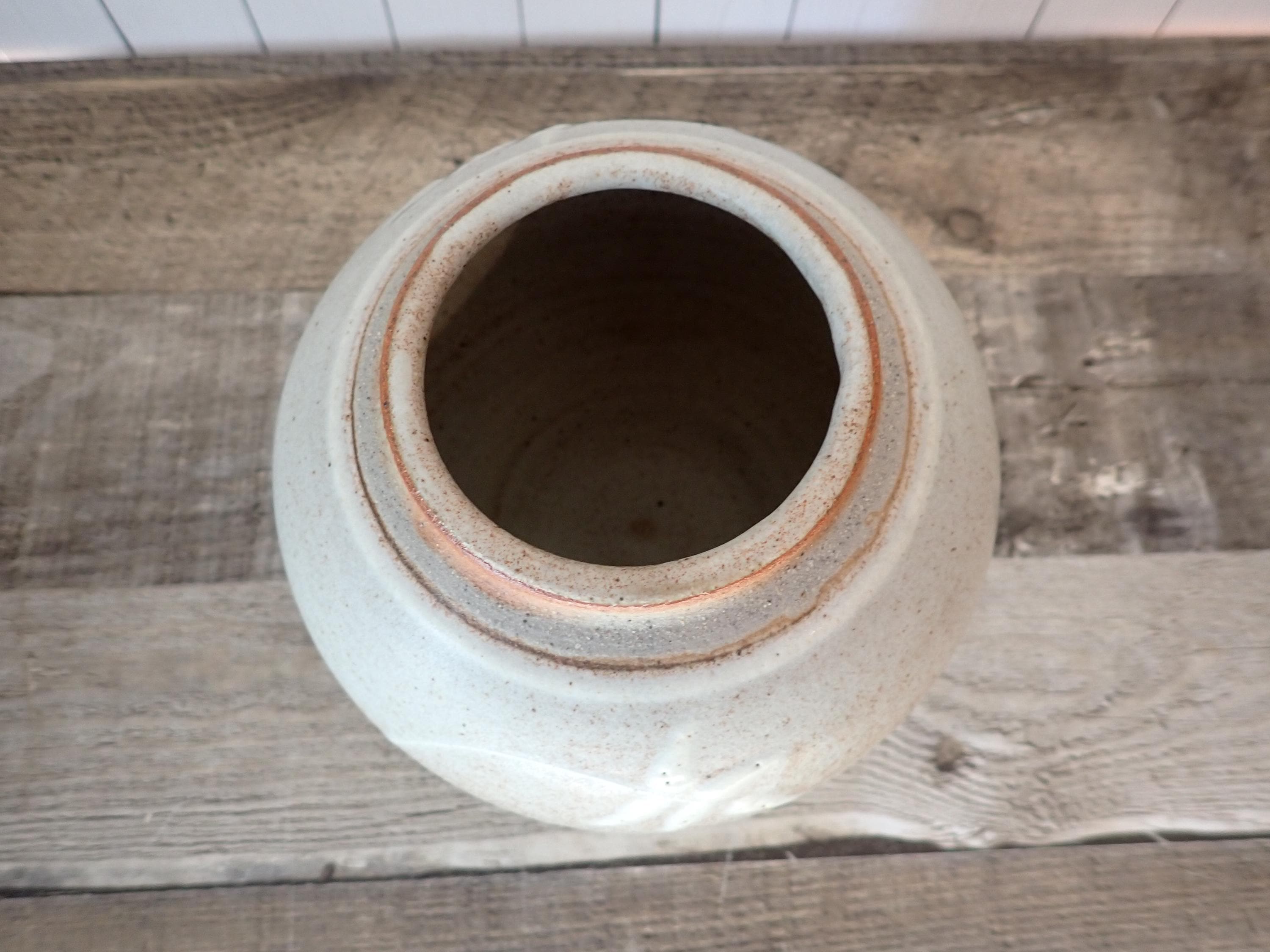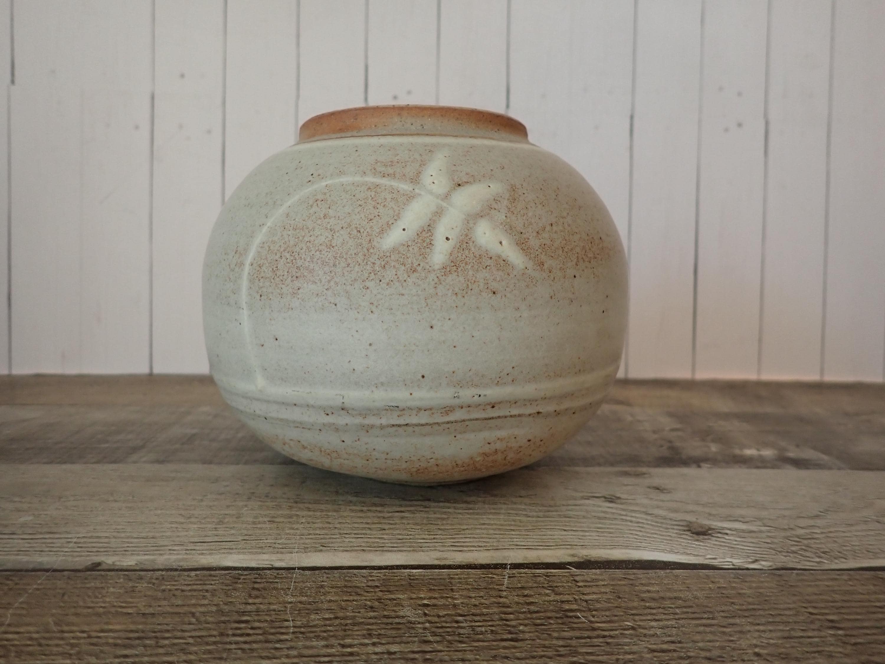 This lovely stoneware planter is 6" in diameter and 5" tall. It is a handmade pottery piece, made of a tan stoneware. The planter has been glazed with a light gray glaze, and decorated with a hand painted design of a white branch with leaves. This pattern is on the front and back of the planter. There are no makers marks on this piece. The planter is in very nice condition with no chips or cracks. There is a light gray scratch on one side of the planter as shown in detail in the last photo. There is no drainage hole in the bottom.