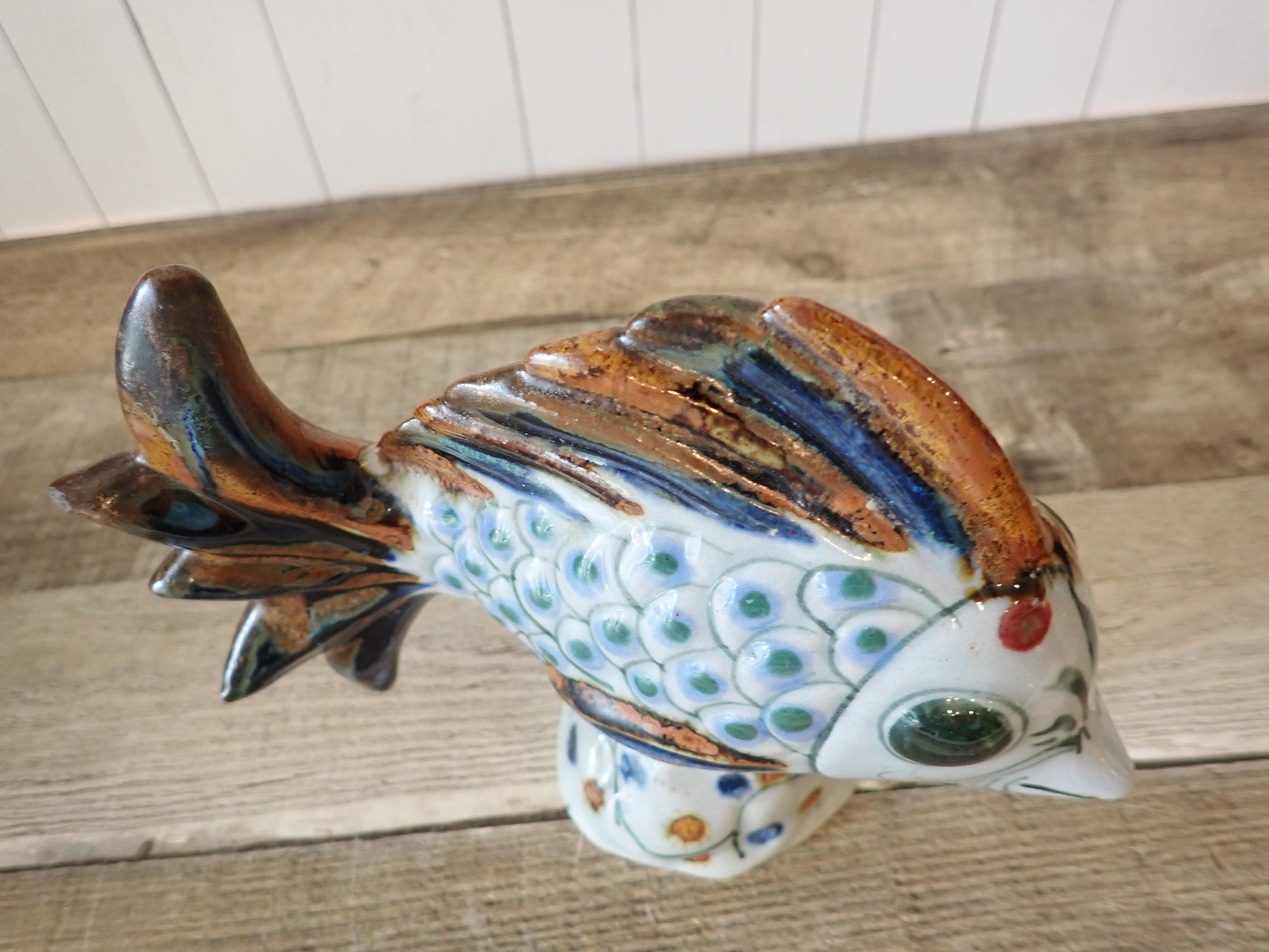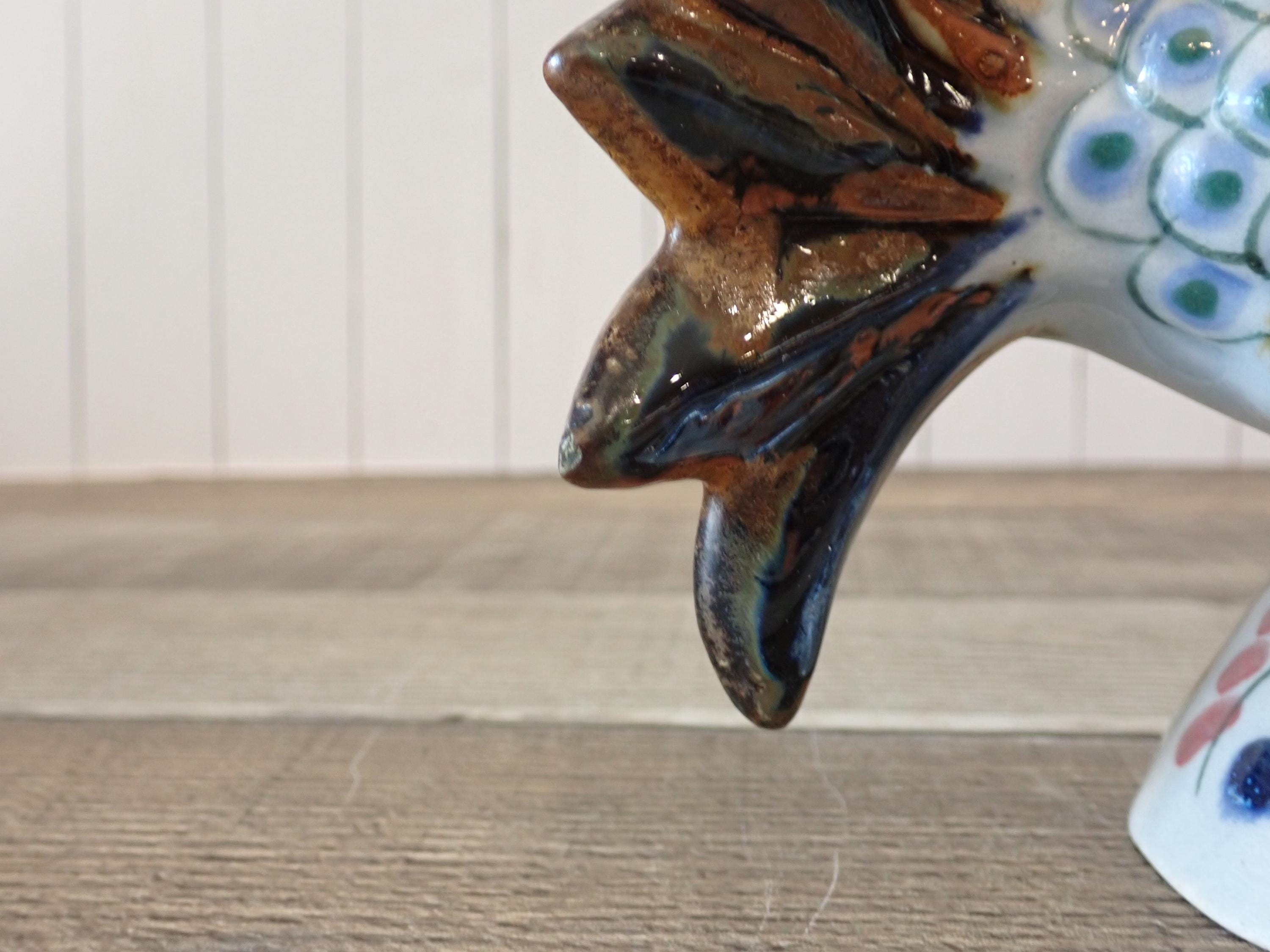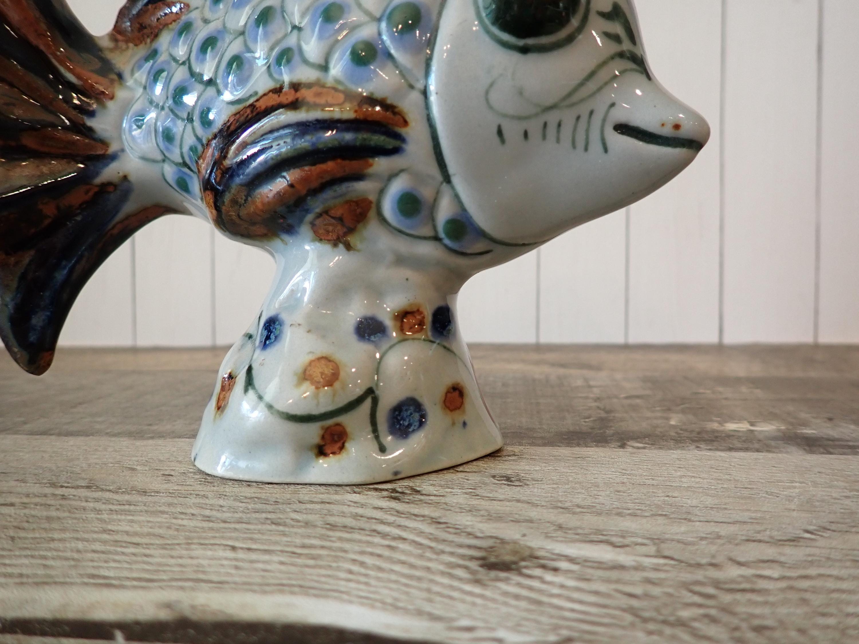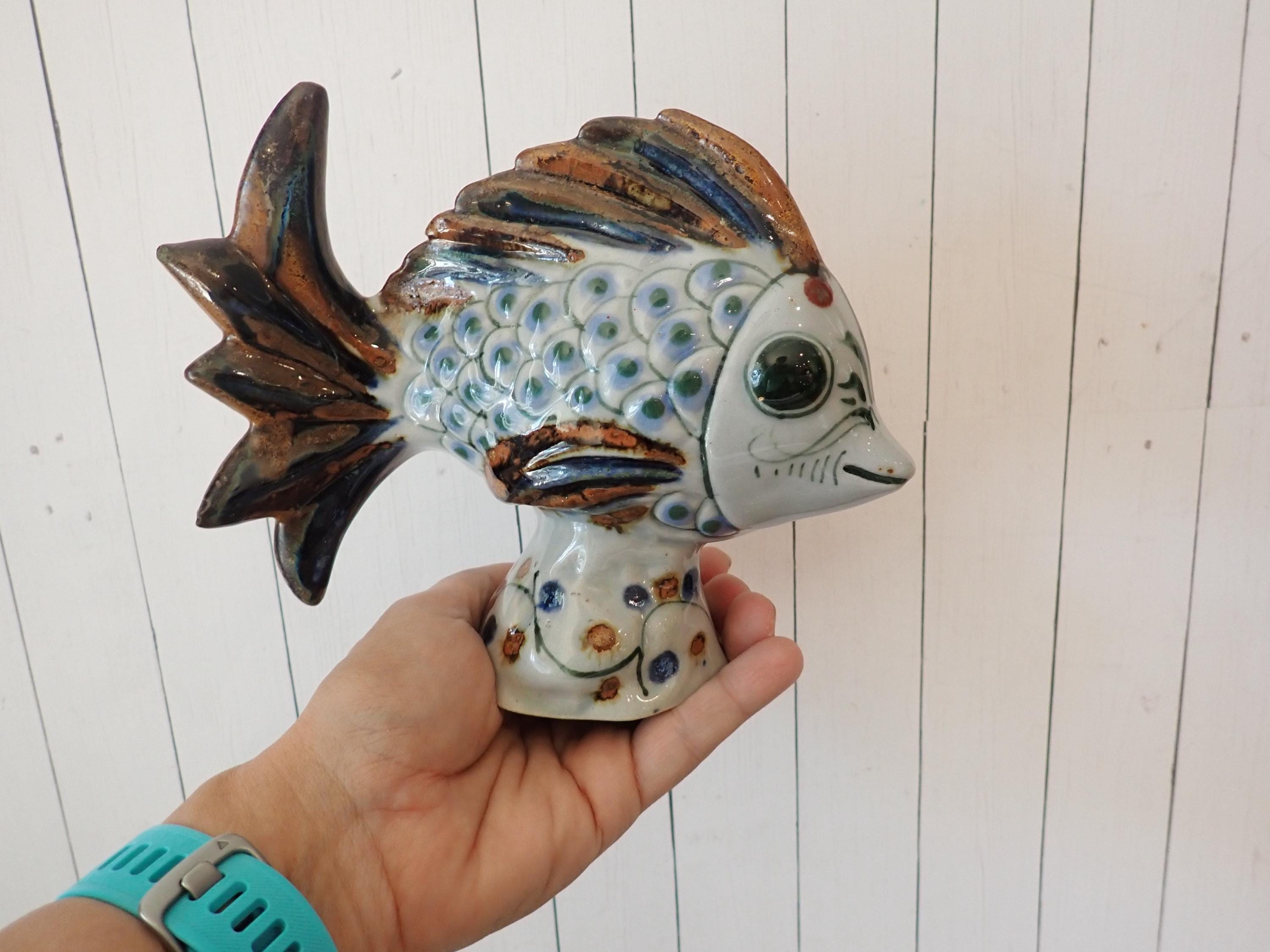 This ceramic fish figurine is 7" long, 3" wide, and 5.75" tall. It is a light gray stoneware and has a blue and brown painted design. The bottoms are signed with KE Mexico. The figurine is in nice condition, however there are 2 small nick on the fish's tail - these are show in in detail in the last 3 photos.