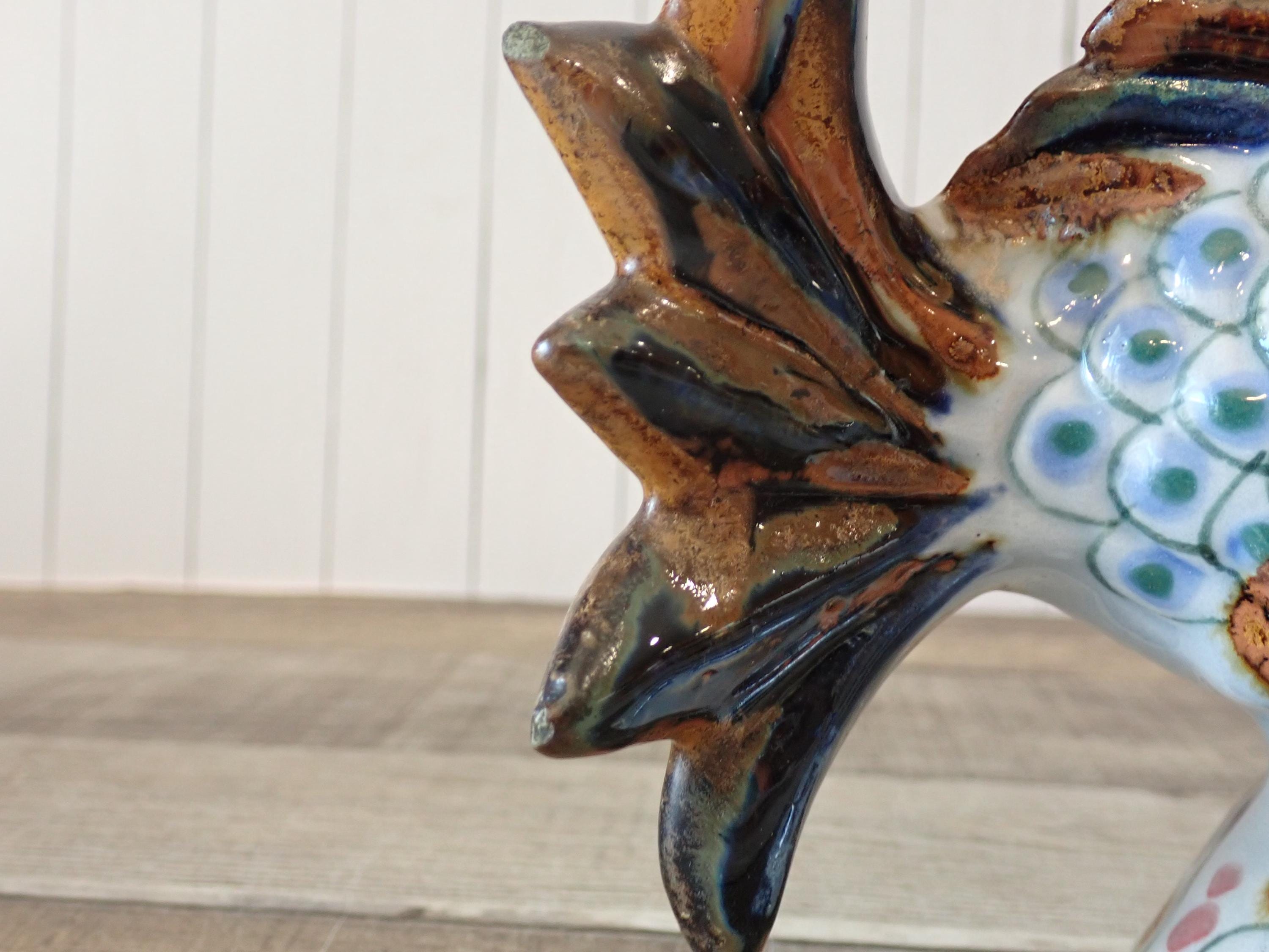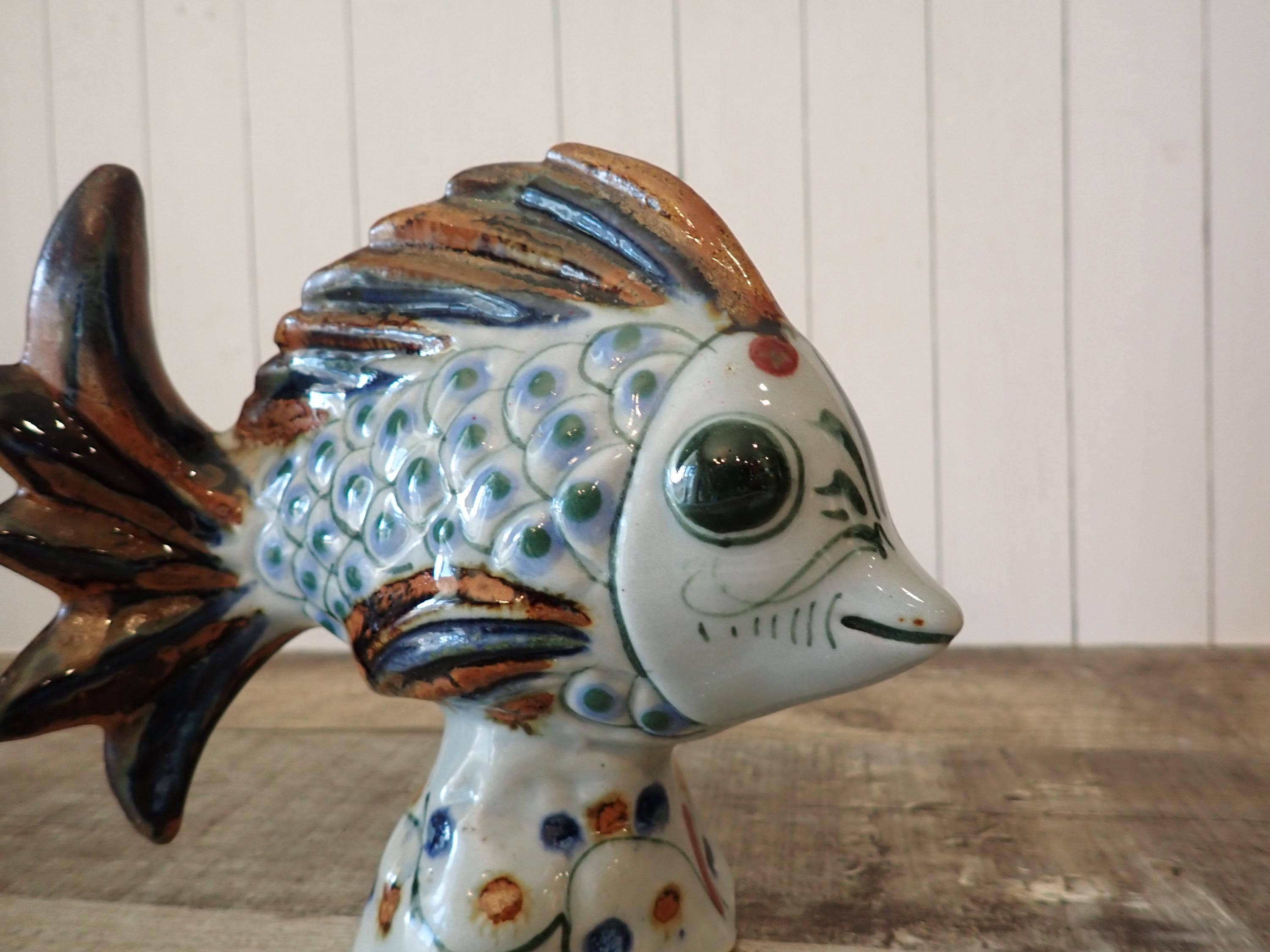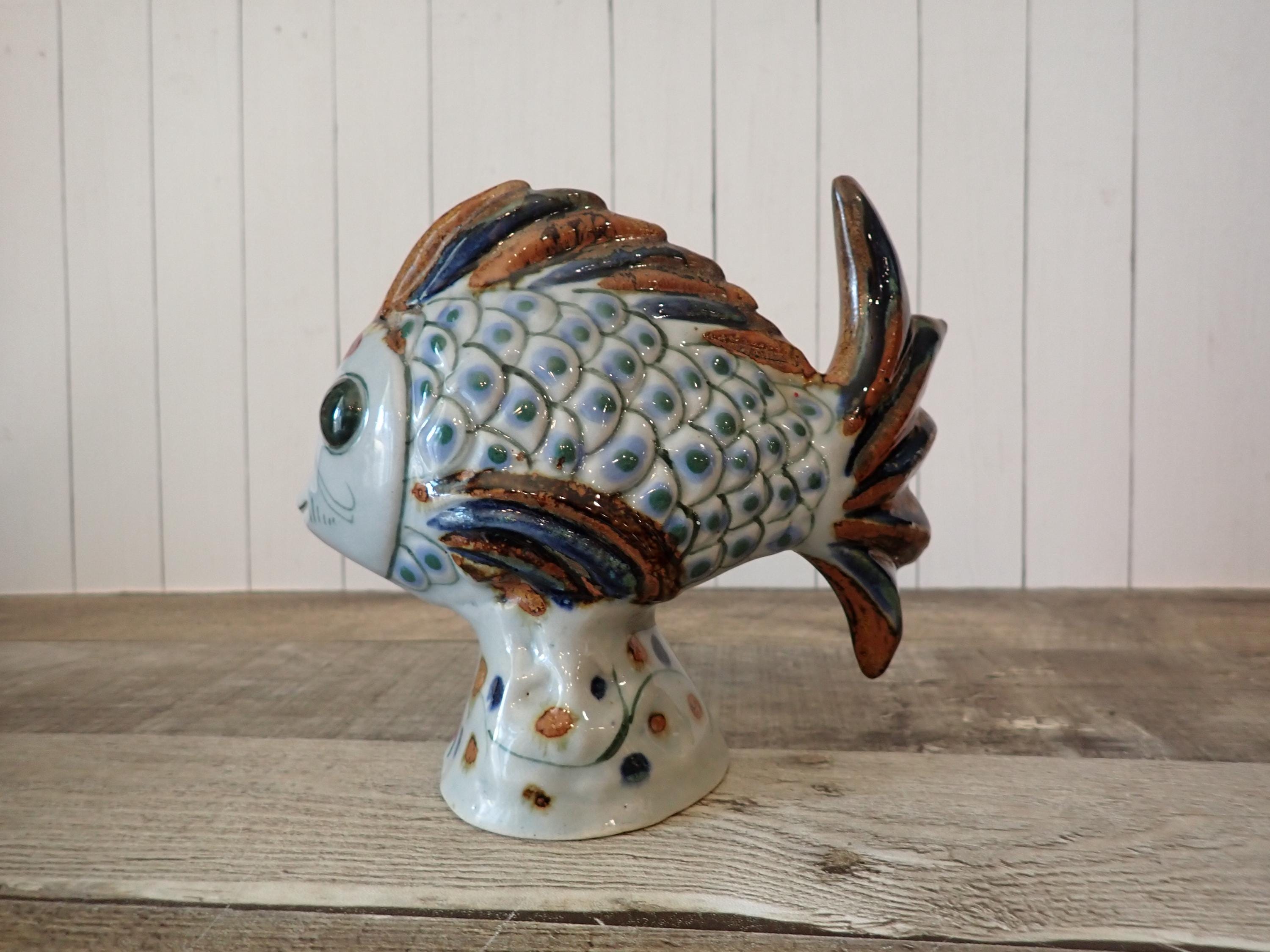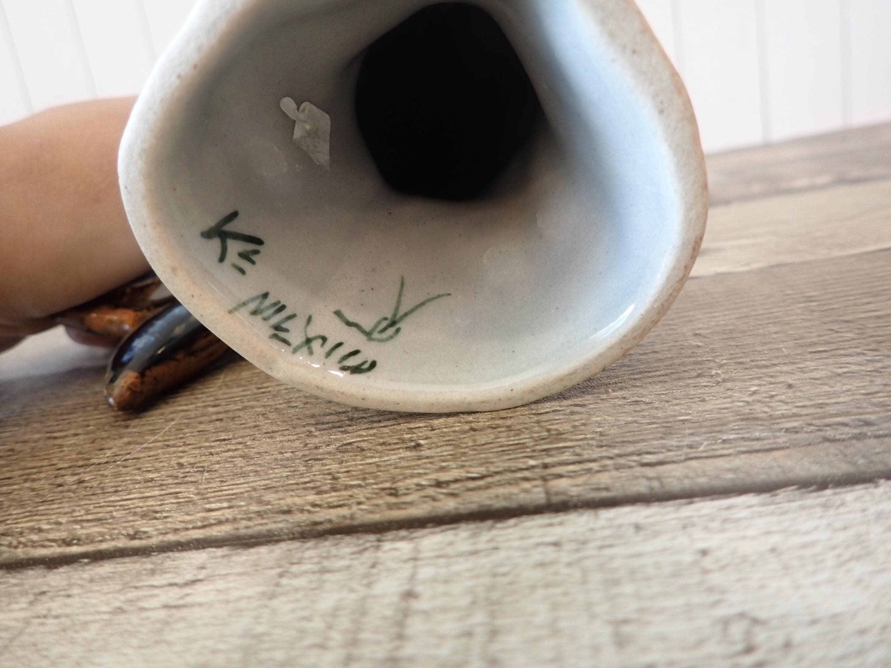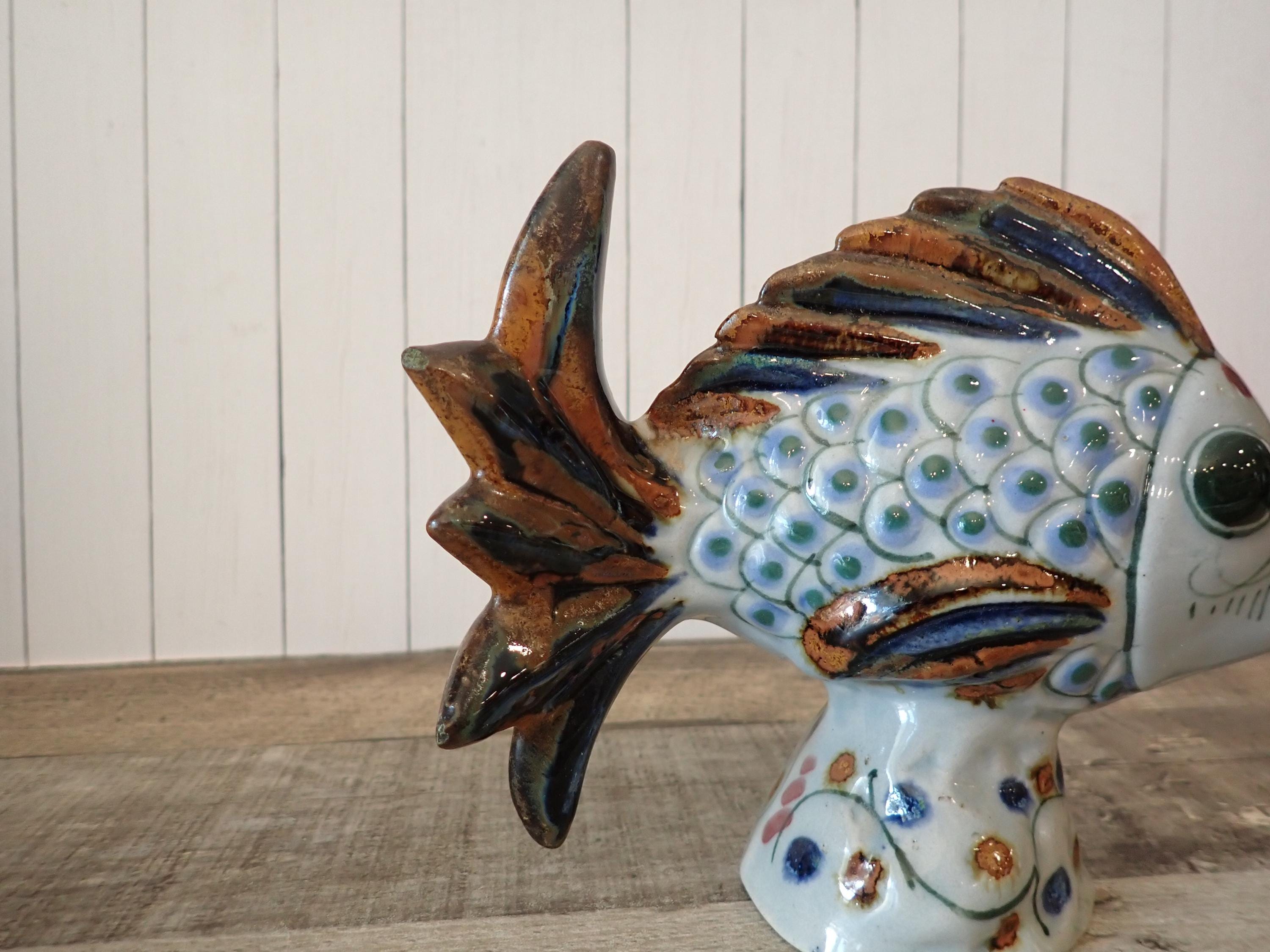 This ceramic fish figurine is 7" long, 3" wide, and 5.75" tall. It is a light gray stoneware and has a blue and brown painted design. The bottoms are signed with KE Mexico. The figurine is in nice condition, however there are 2 small nick on the fish's tail - these are show in in detail in the last 3 photos.