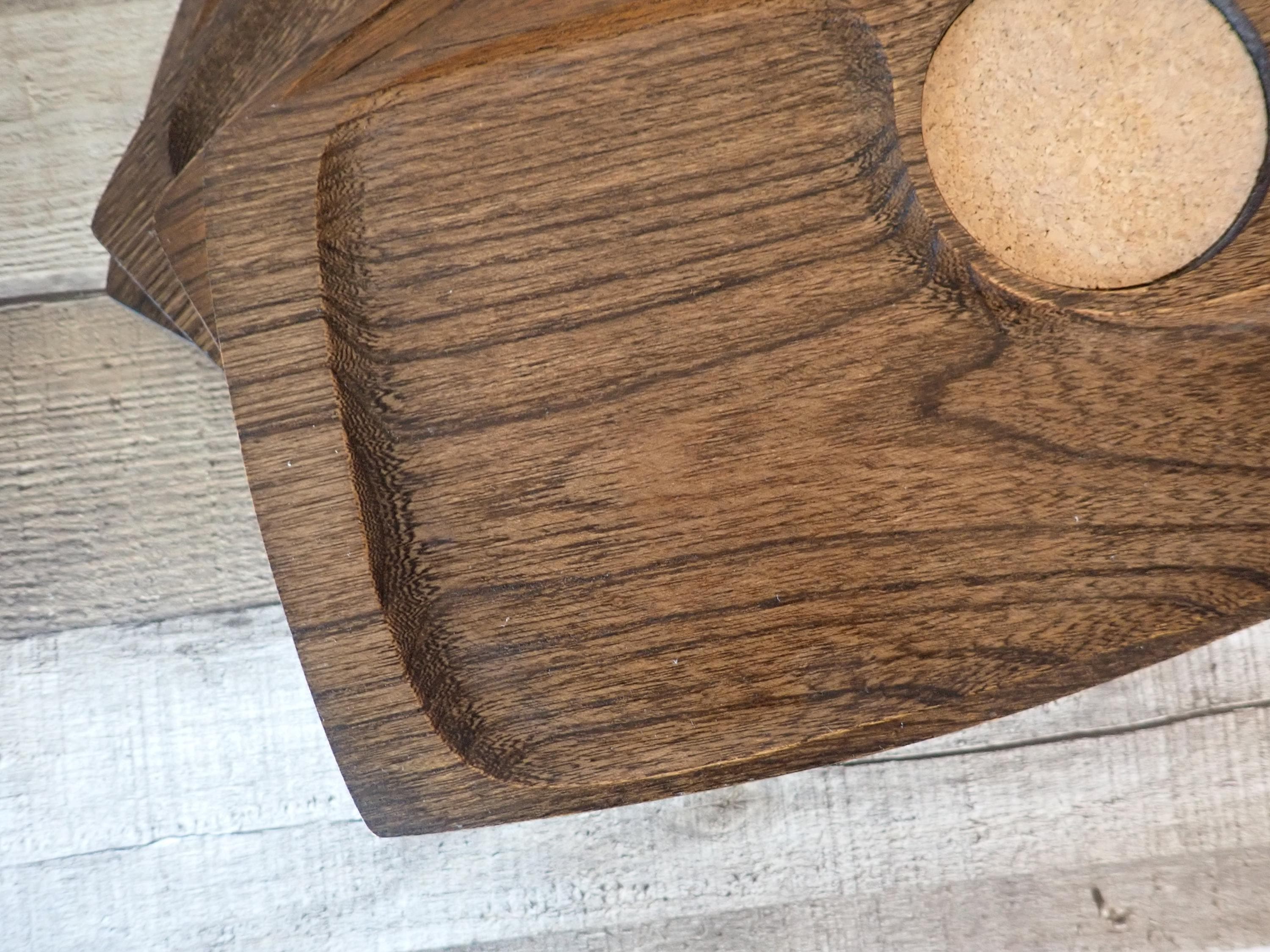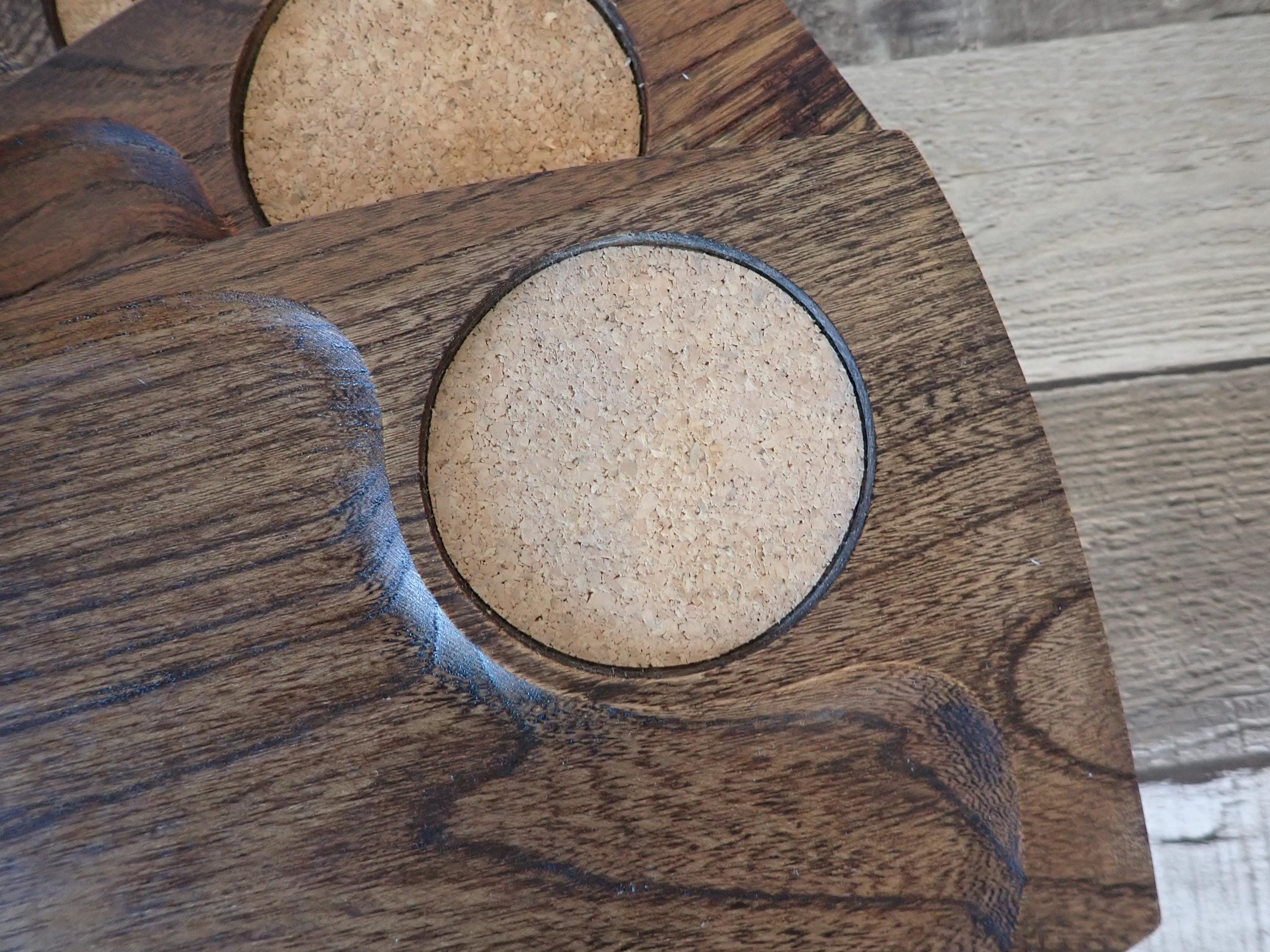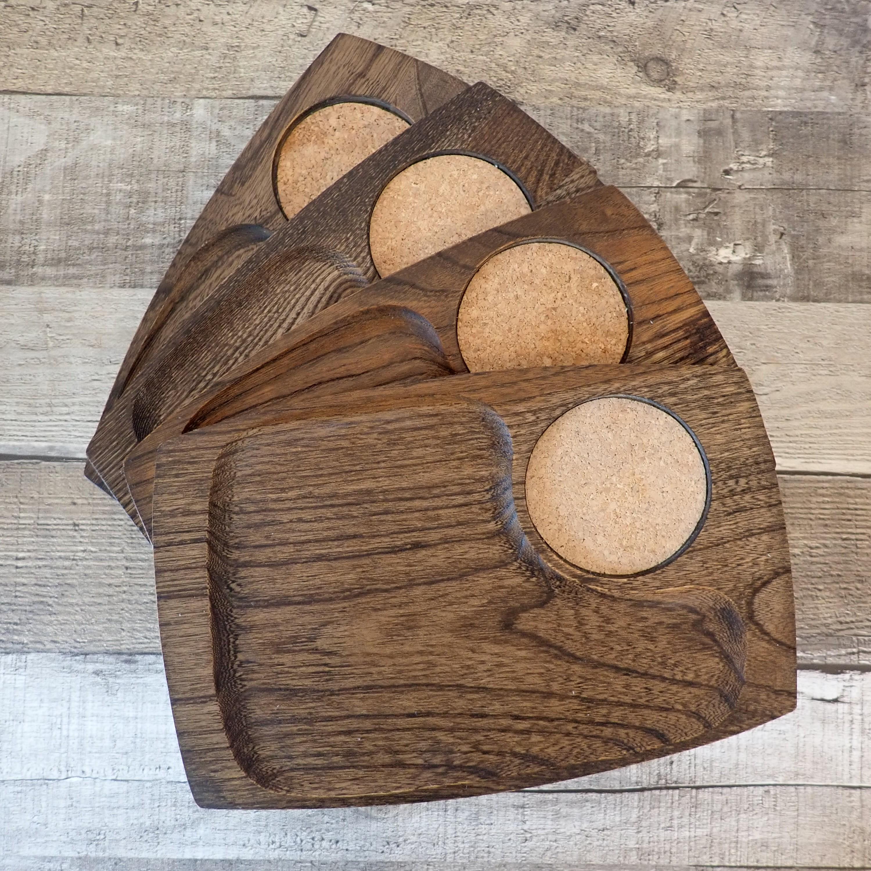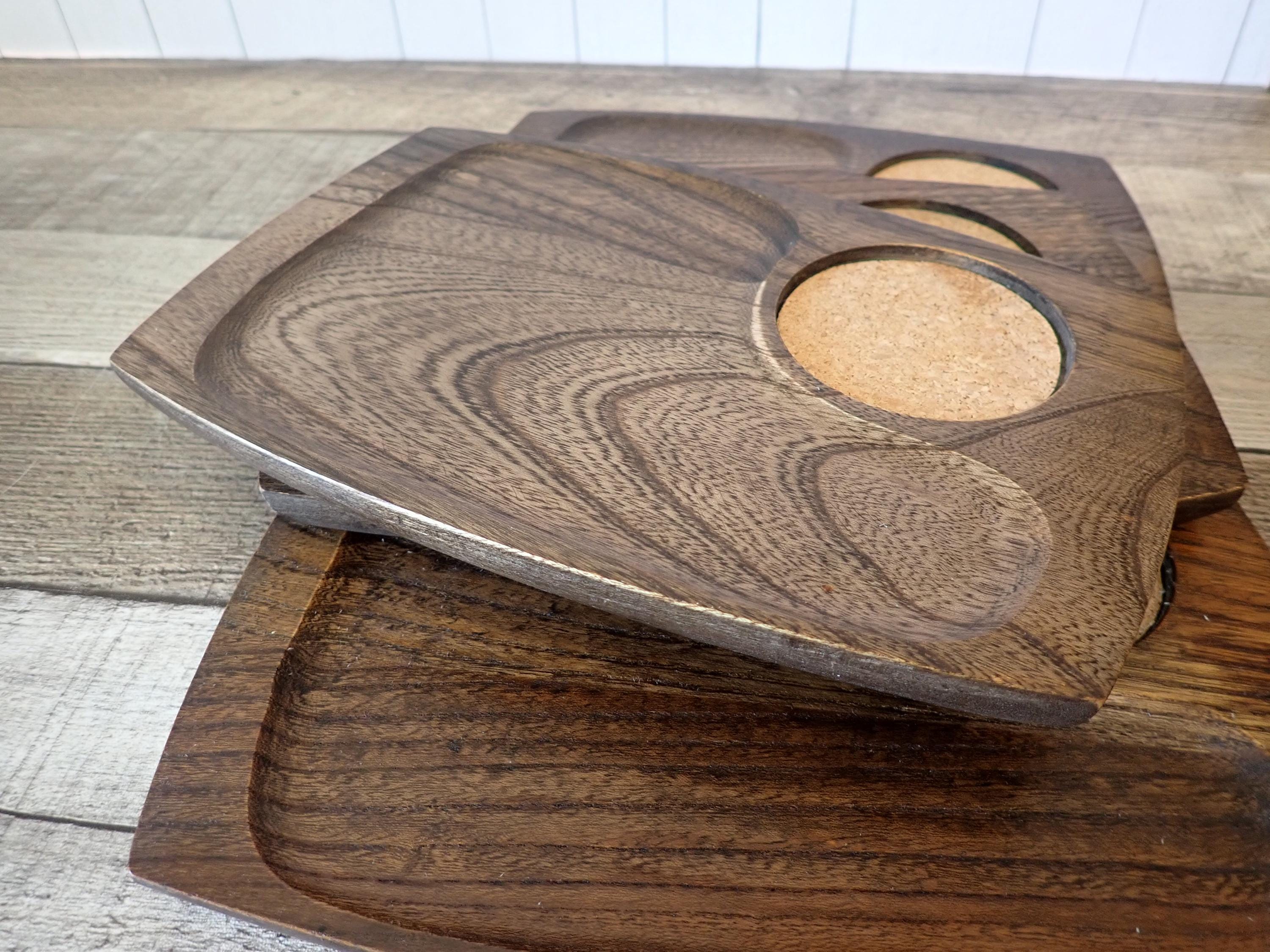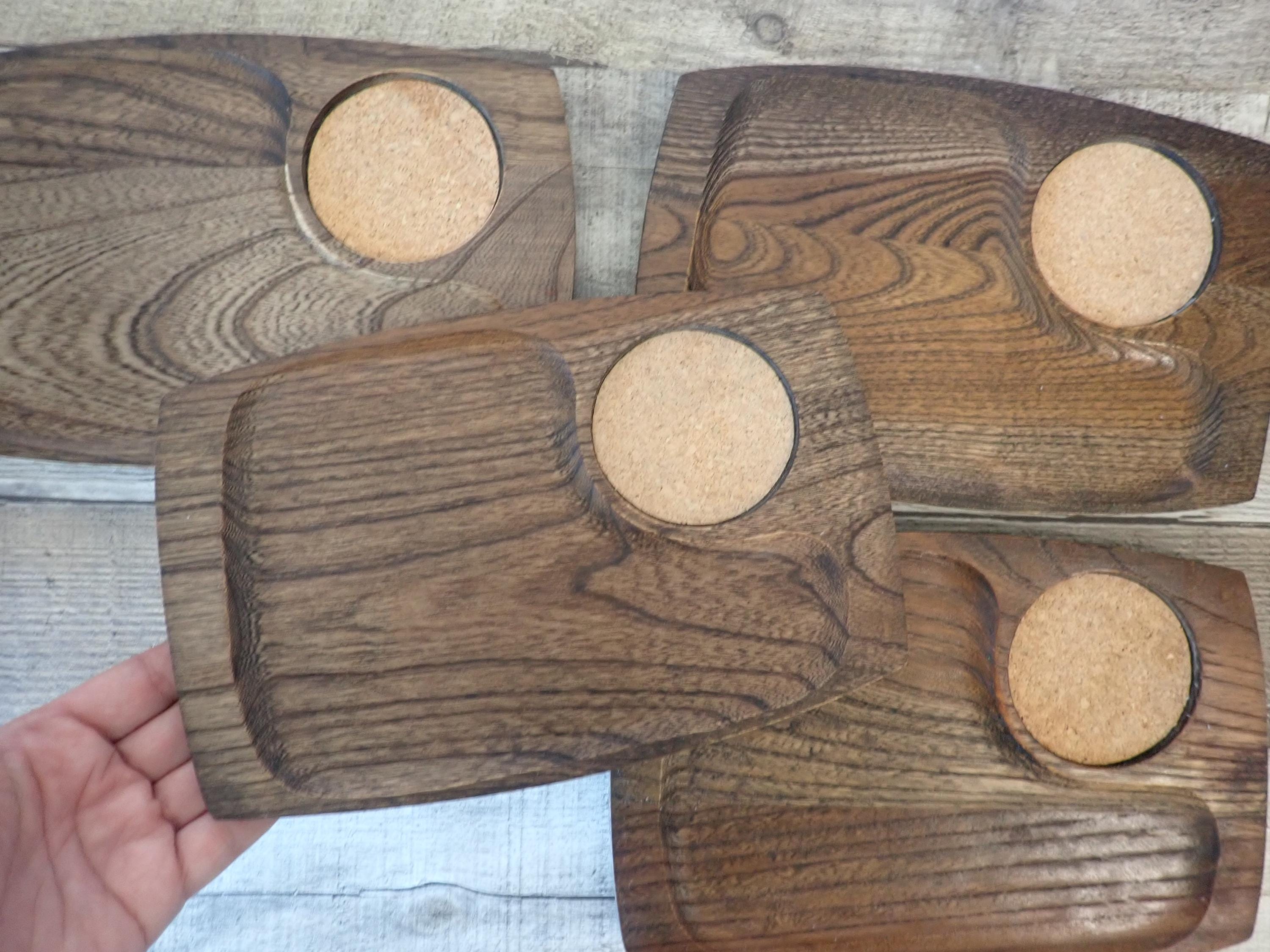This set of wooden trays includes 4 matching snack or appetizer plates. They measure 9.5" log and 6" wide. Theya re rectangular shaped and have a slightly recessed area for snacks, and a round cork area for a drink. These trays are a darker brown wood color. All 4 trays are in very good condition with no nicks, cracks, or cut marks.