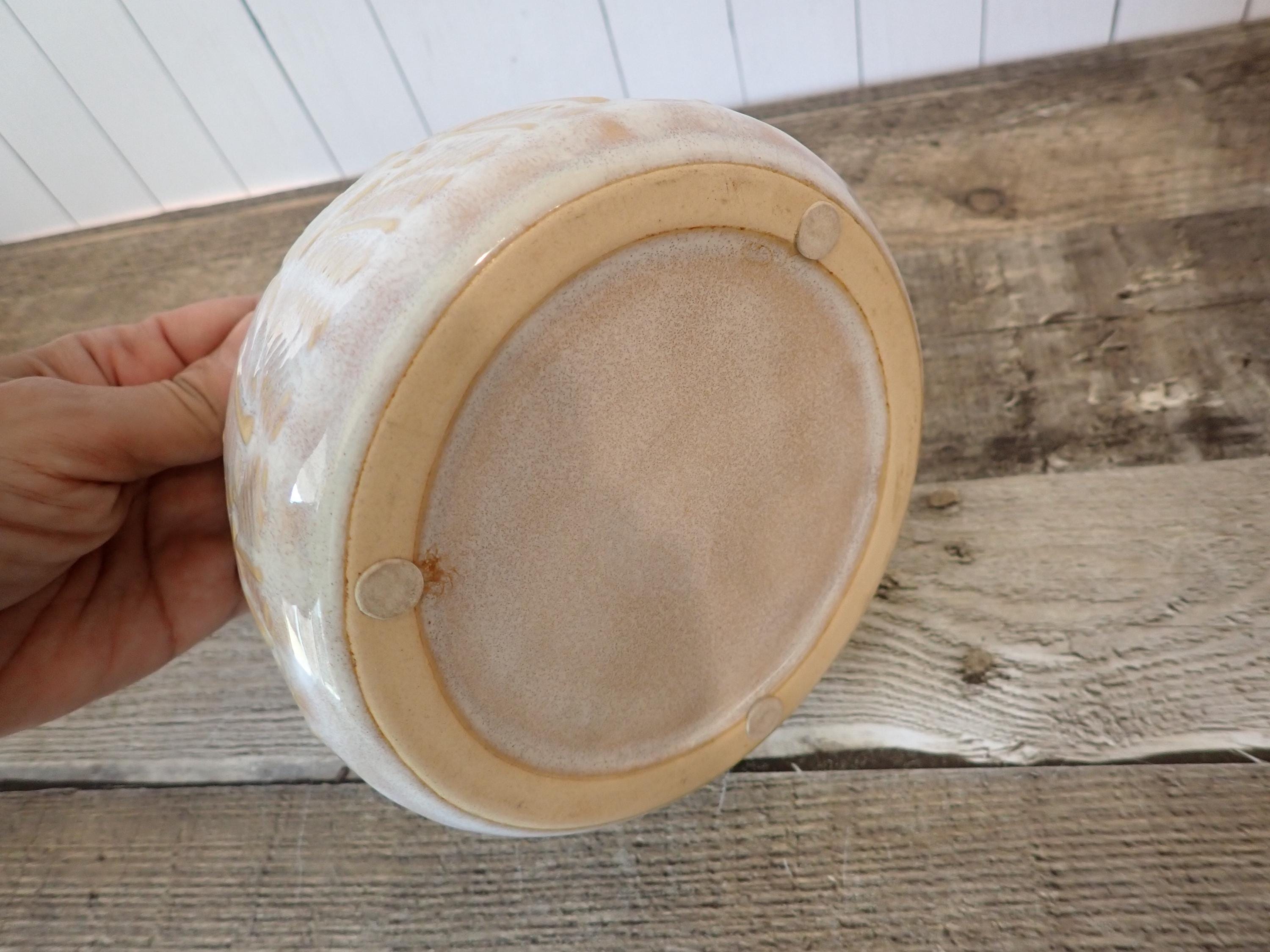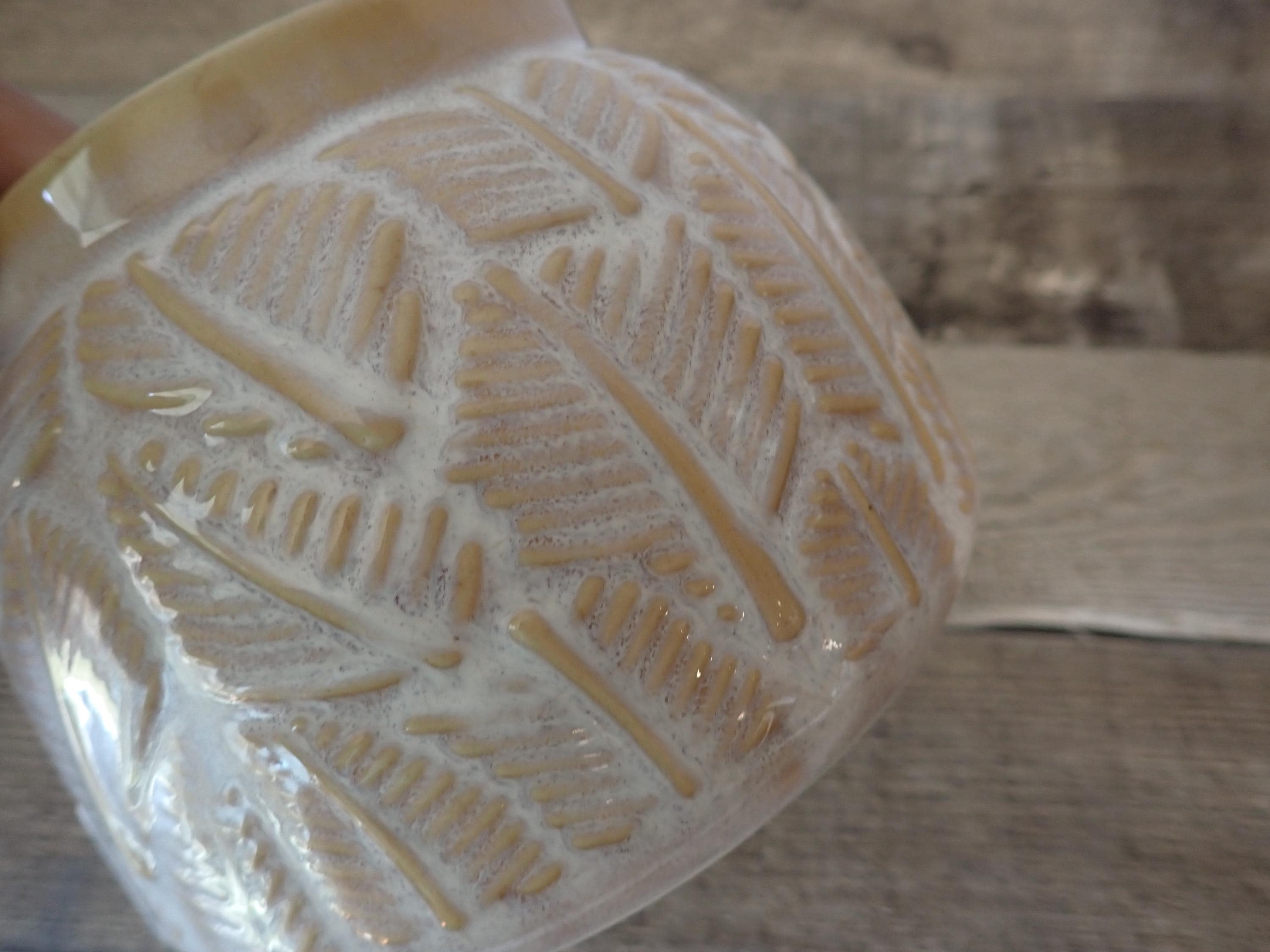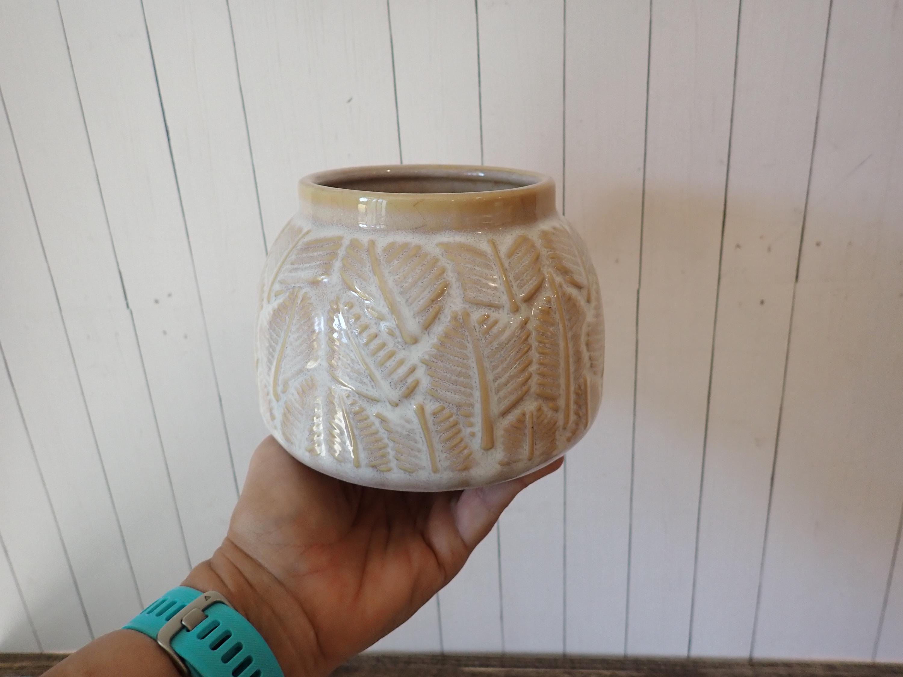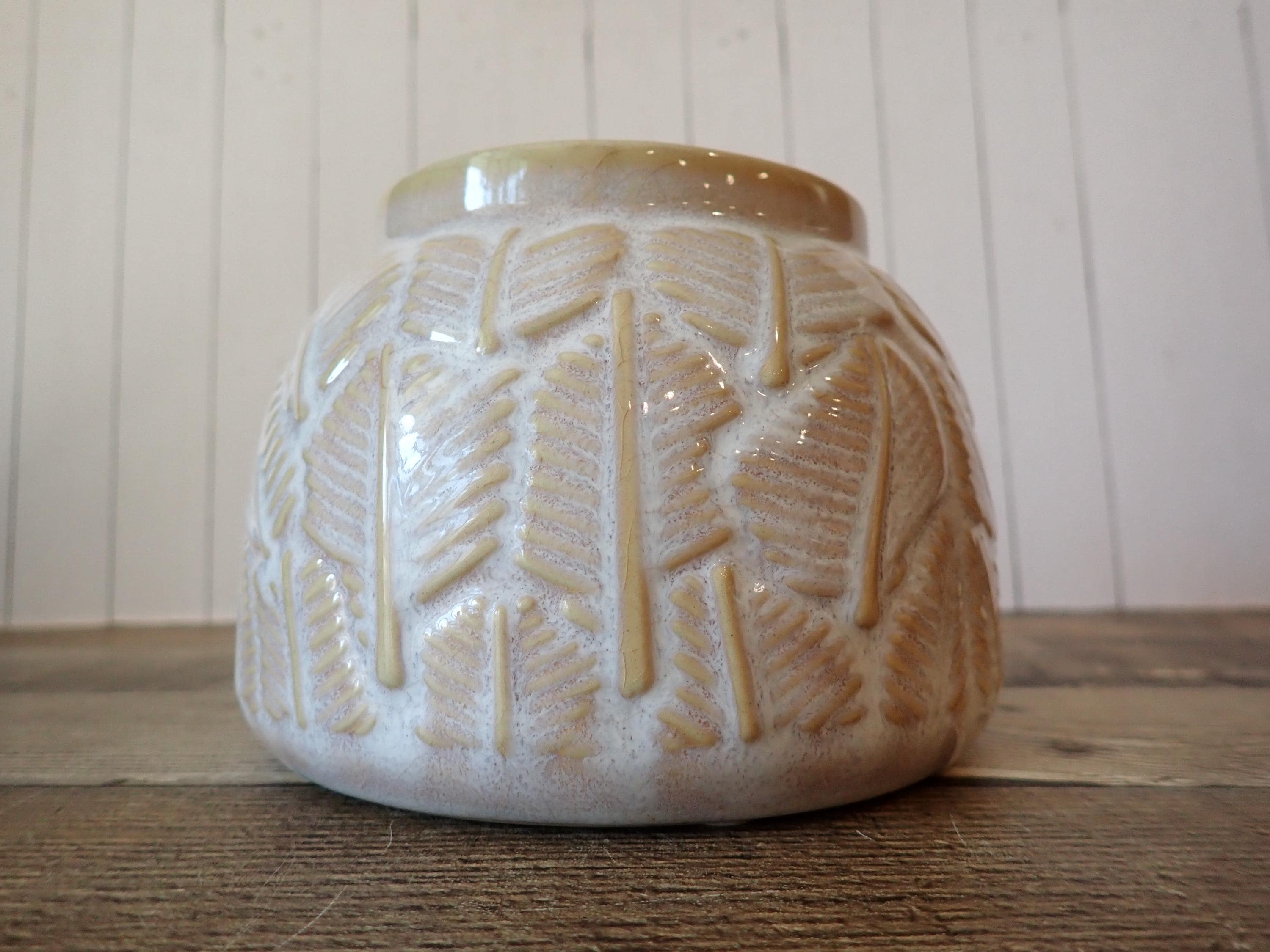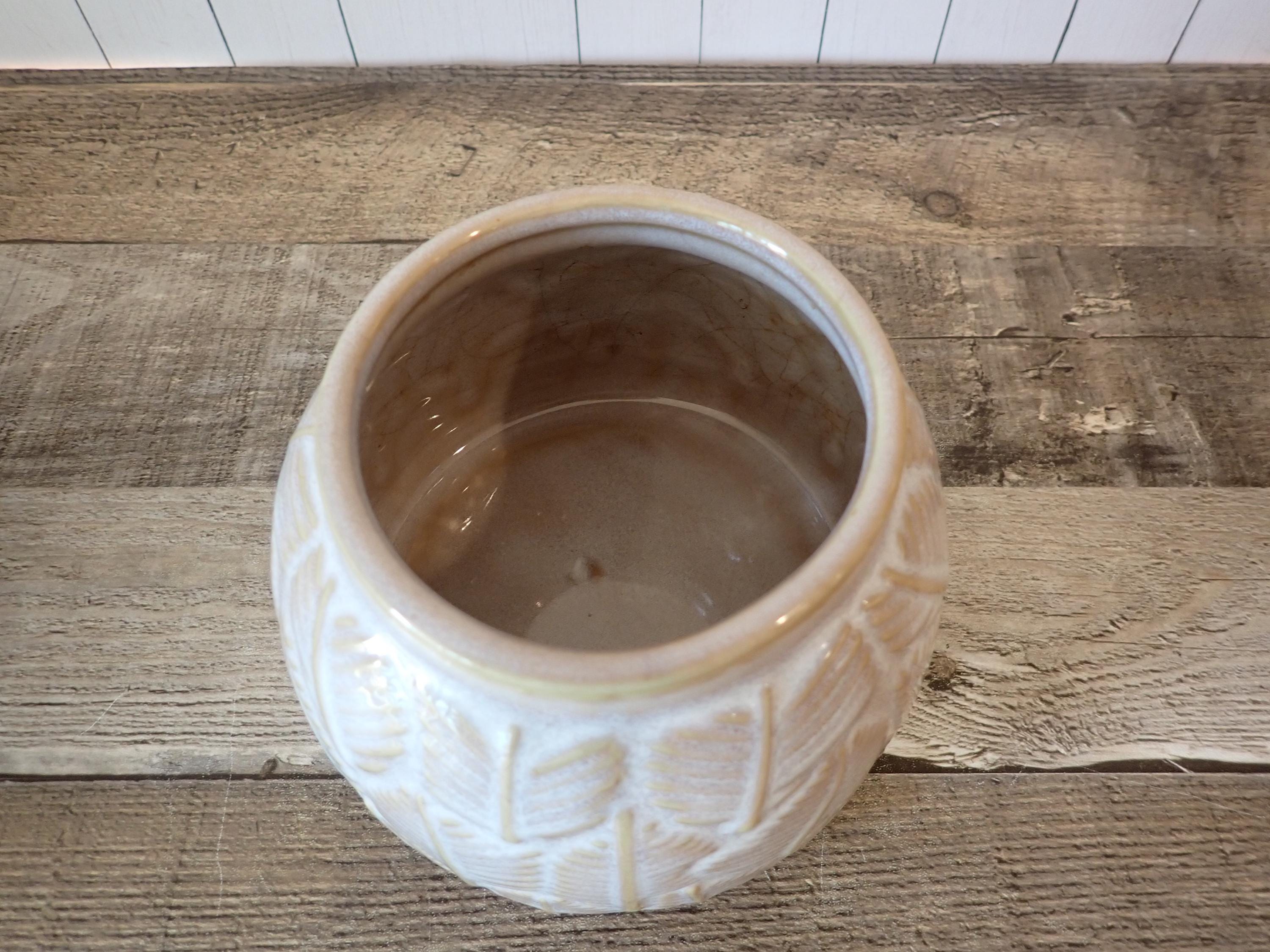 This lovely ceramic planter is 5.75" in diameter and 4.25" tall. It is a tan and white ceramic piece, and is decorated with a raised leaf design around the planter. There are no makers marks on the planter. The planter is in very nice condition with no chips or cracks. There is some crazing in the glaze on the inside of the planter.