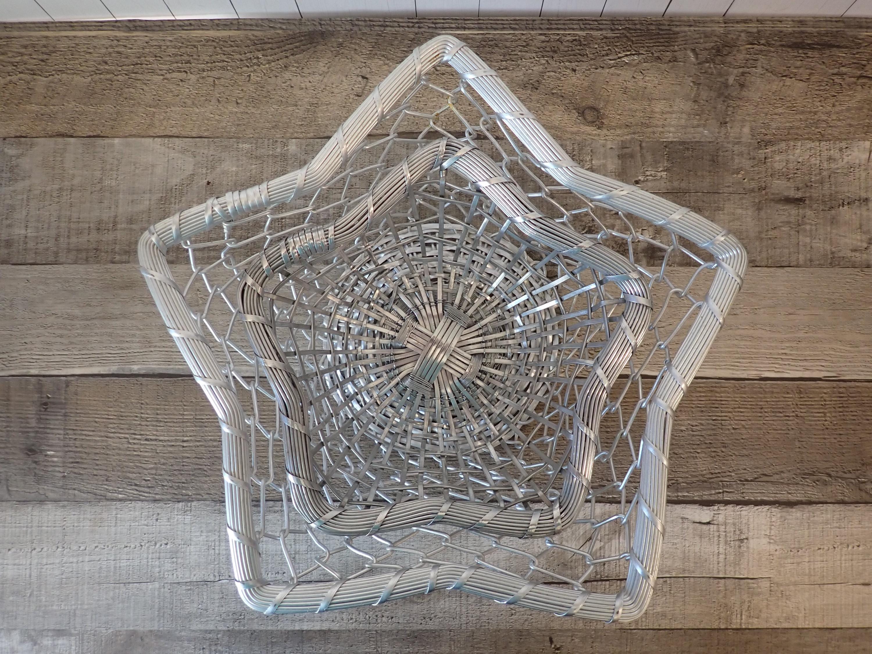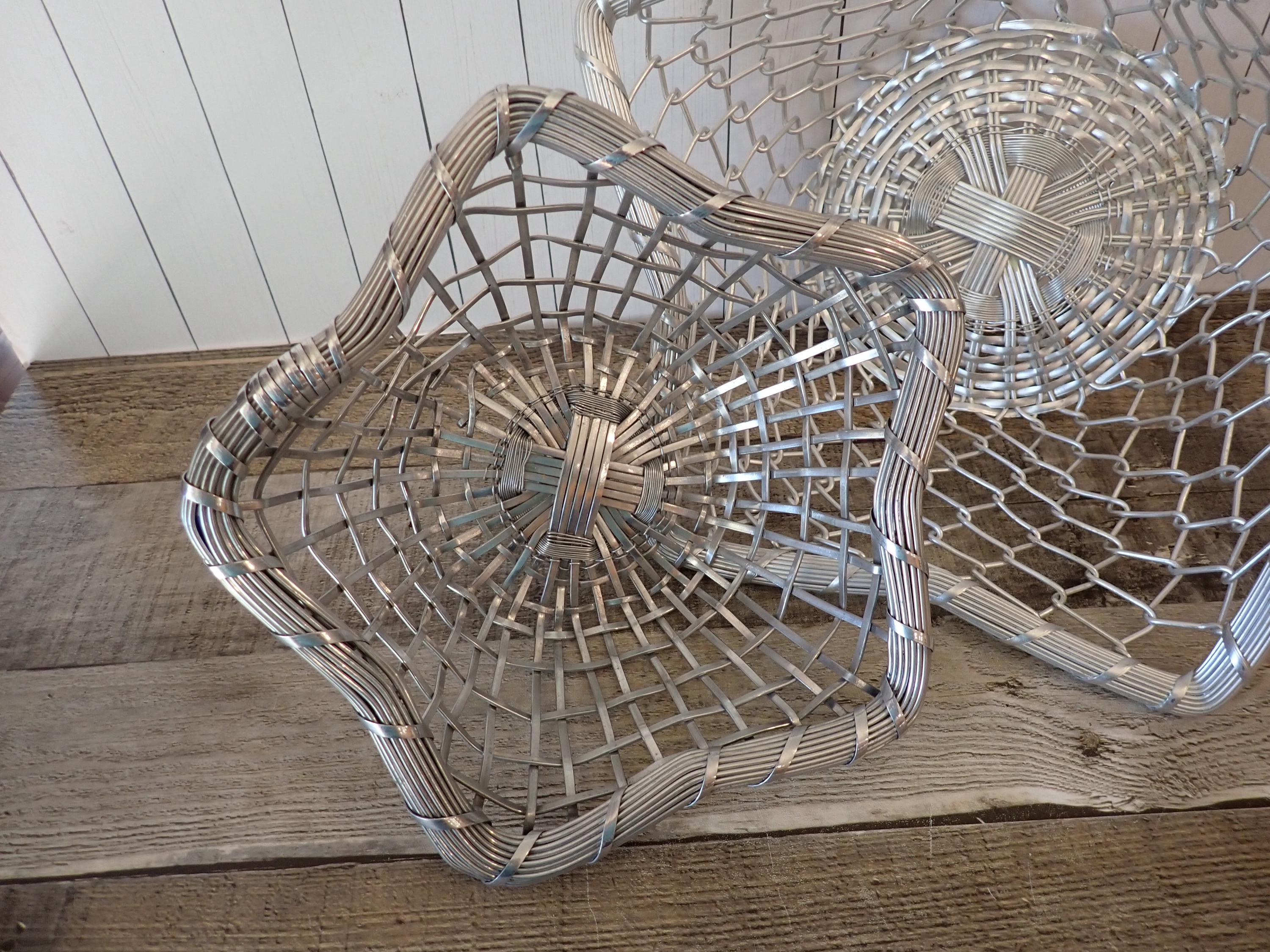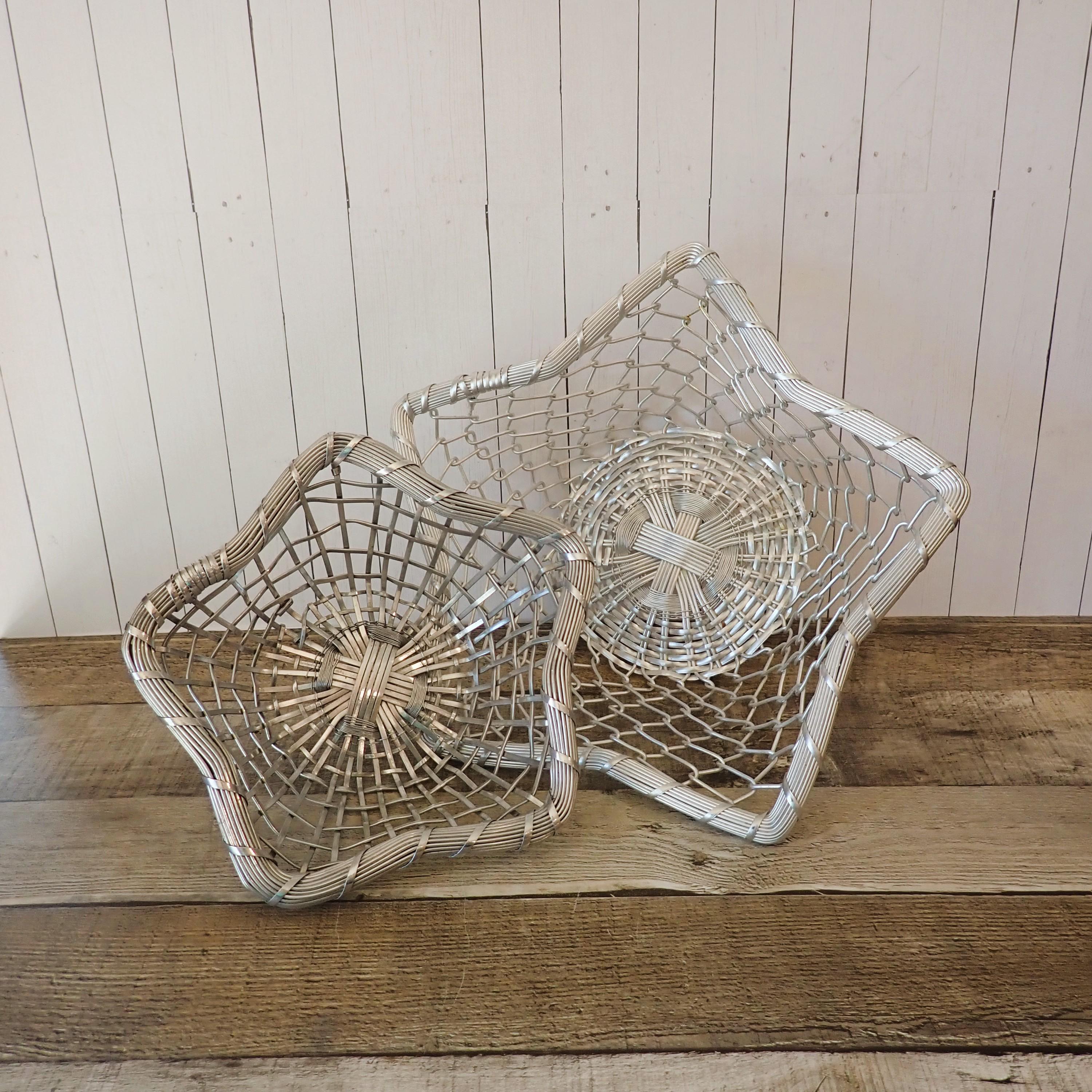 This set of 2 silver metal baskets includes 2 matching baskets in different sizes. The larger basket is 12" wide and 3.5" high, and the smaller basket is 9" wide and 2.75" high. They are both made of woven silver wires and have an intricate design in the circular shaped base. The sides have a woven and twisted wire, which flare outward to create a 5-point star. The rim is made of several pieces of wire banded together. Both baskets are in great condition with no damage to the wire and no areas of missing wire. The silver coloring of the baskets is slightly different - one is a bit lighter than the other.
