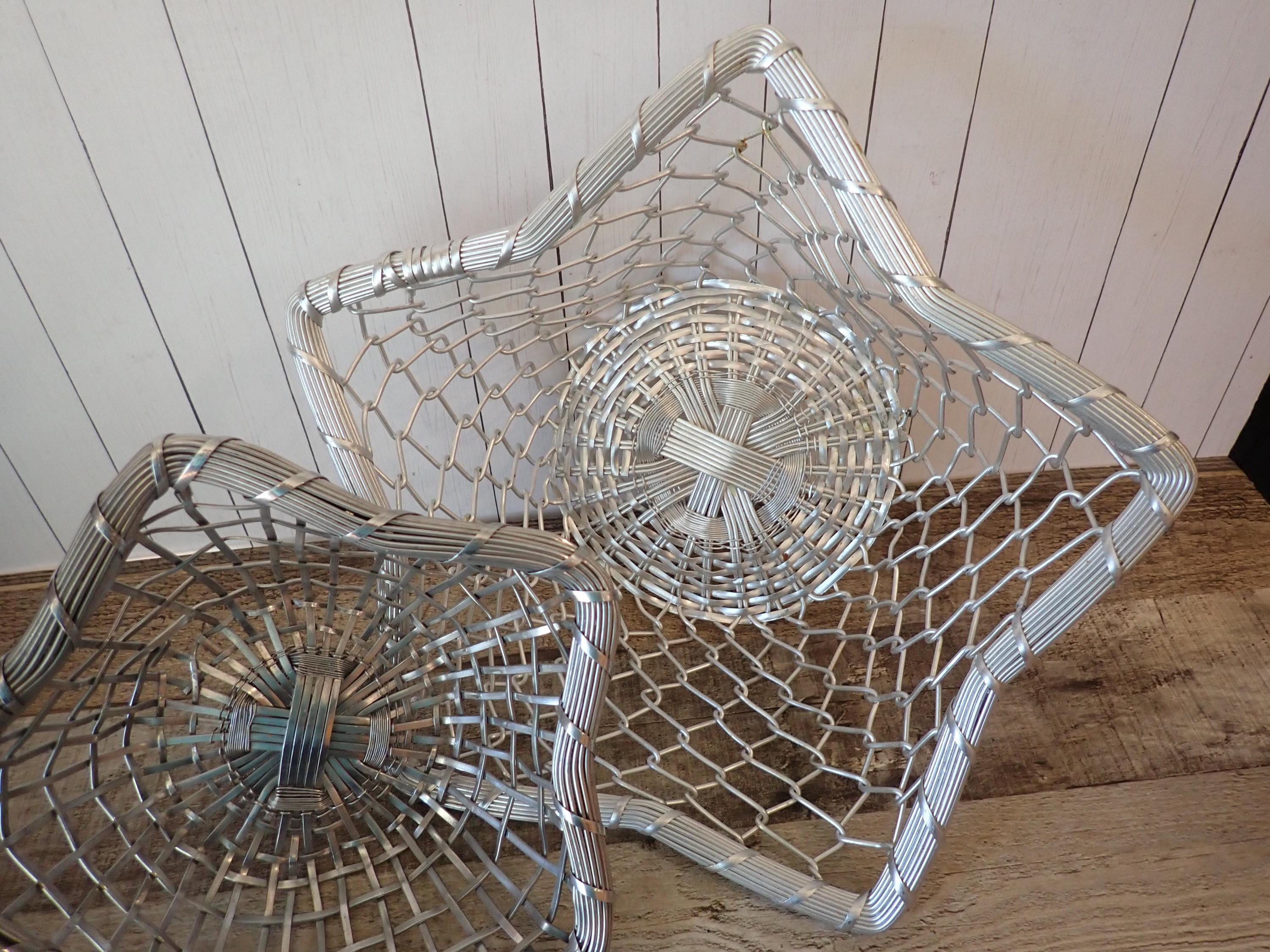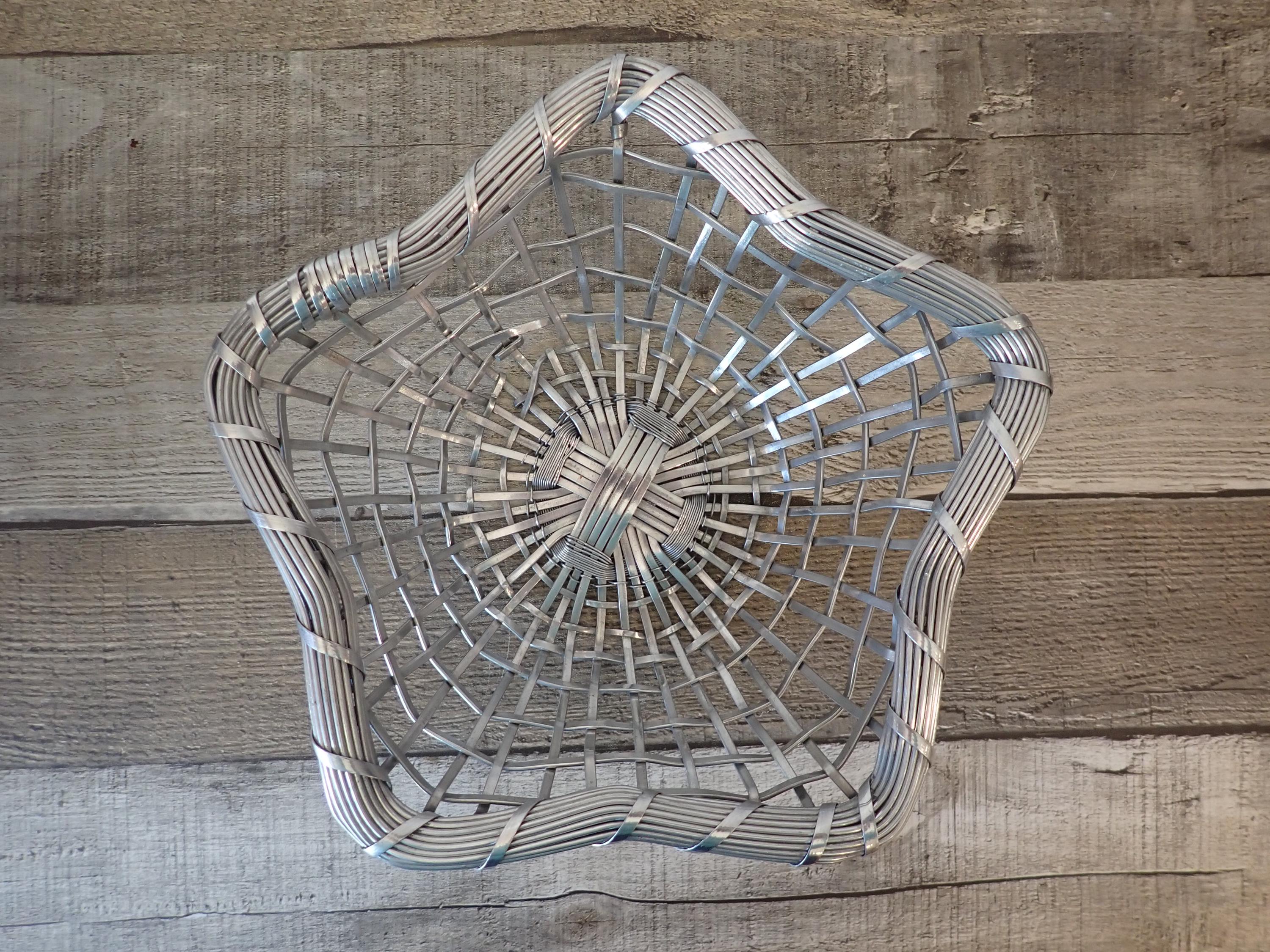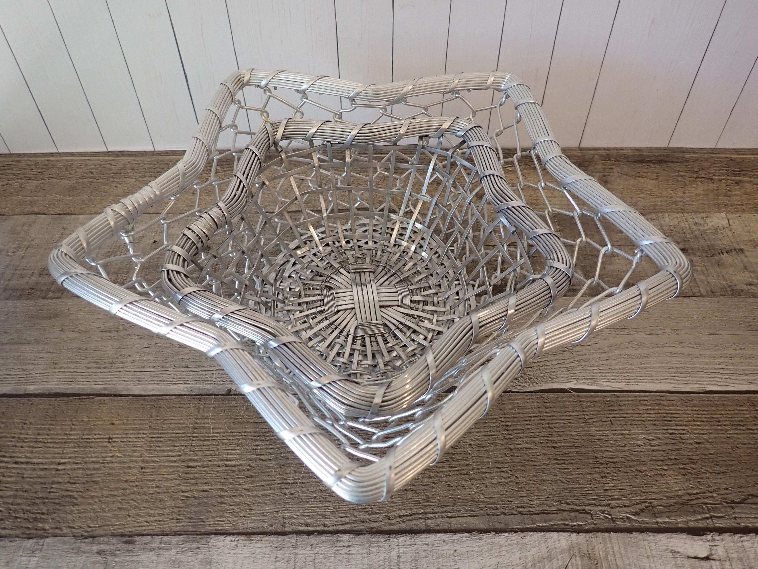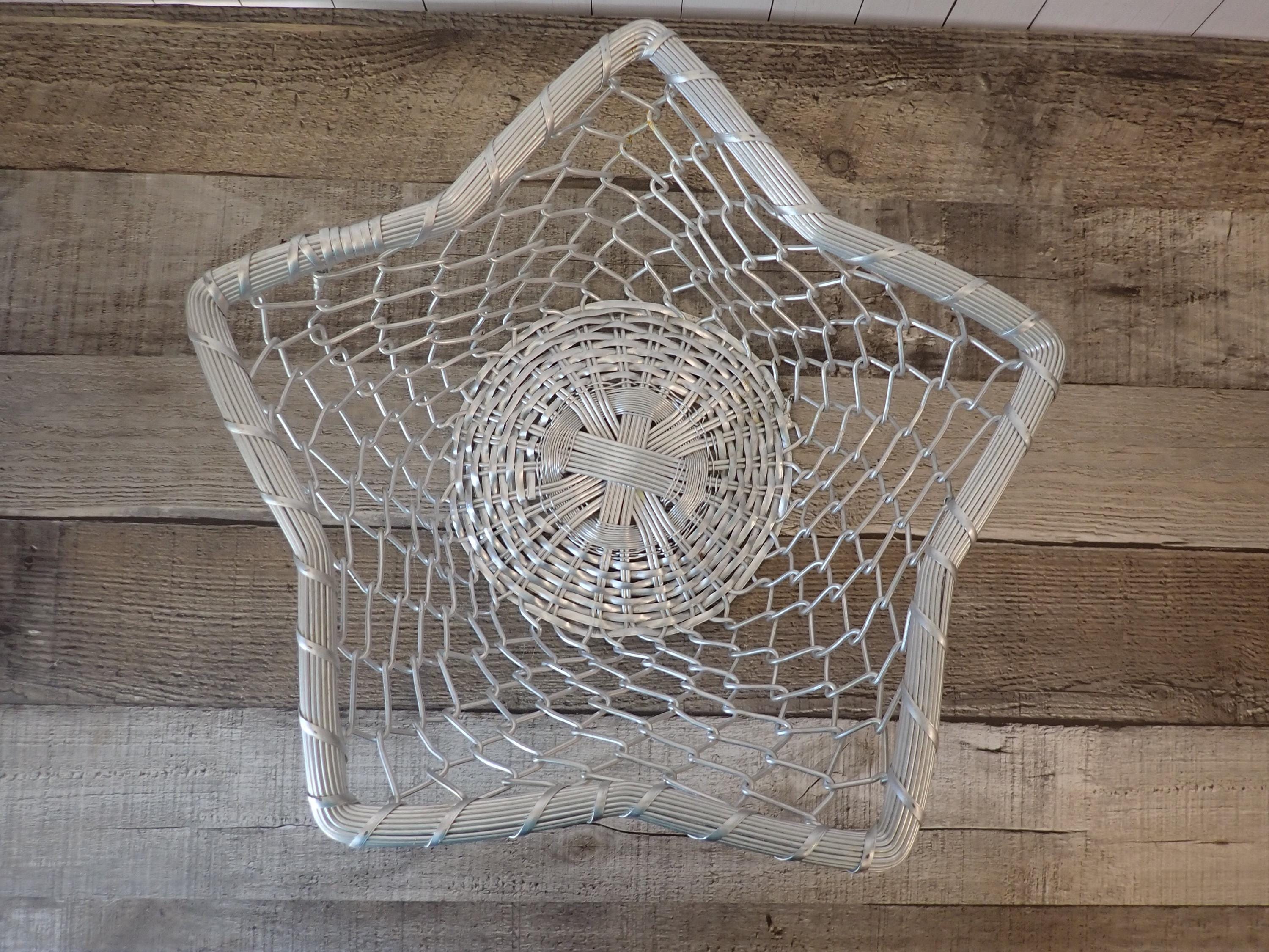 This set of 2 silver metal baskets includes 2 matching baskets in different sizes. The larger basket is 12" wide and 3.5" high, and the smaller basket is 9" wide and 2.75" high. They are both made of woven silver wires and have an intricate design in the circular shaped base. The sides have a woven and twisted wire, which flare outward to create a 5-point star. The rim is made of several pieces of wire banded together. Both baskets are in great condition with no damage to the wire and no areas of missing wire. The silver coloring of the baskets is slightly different - one is a bit lighter than the other.
