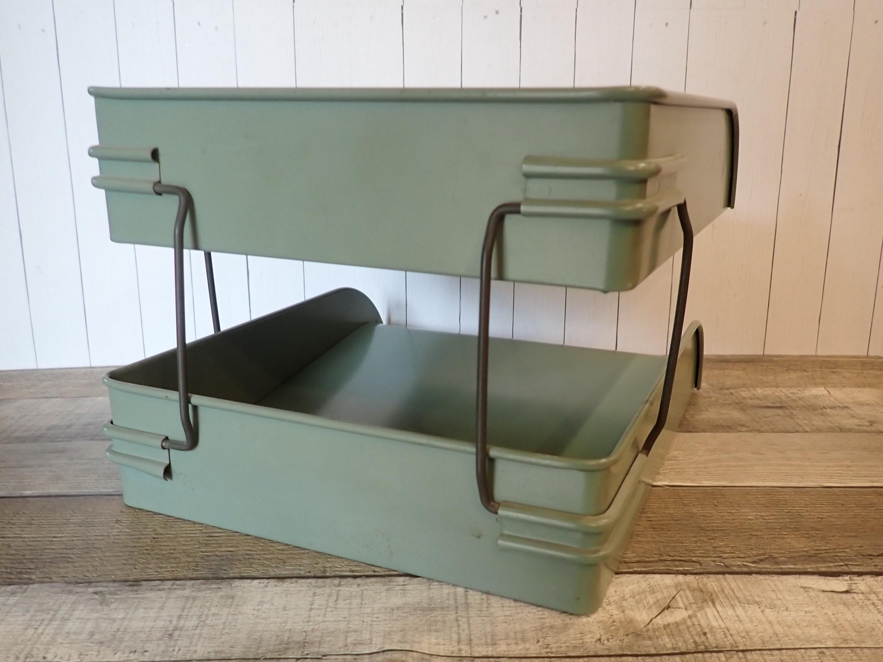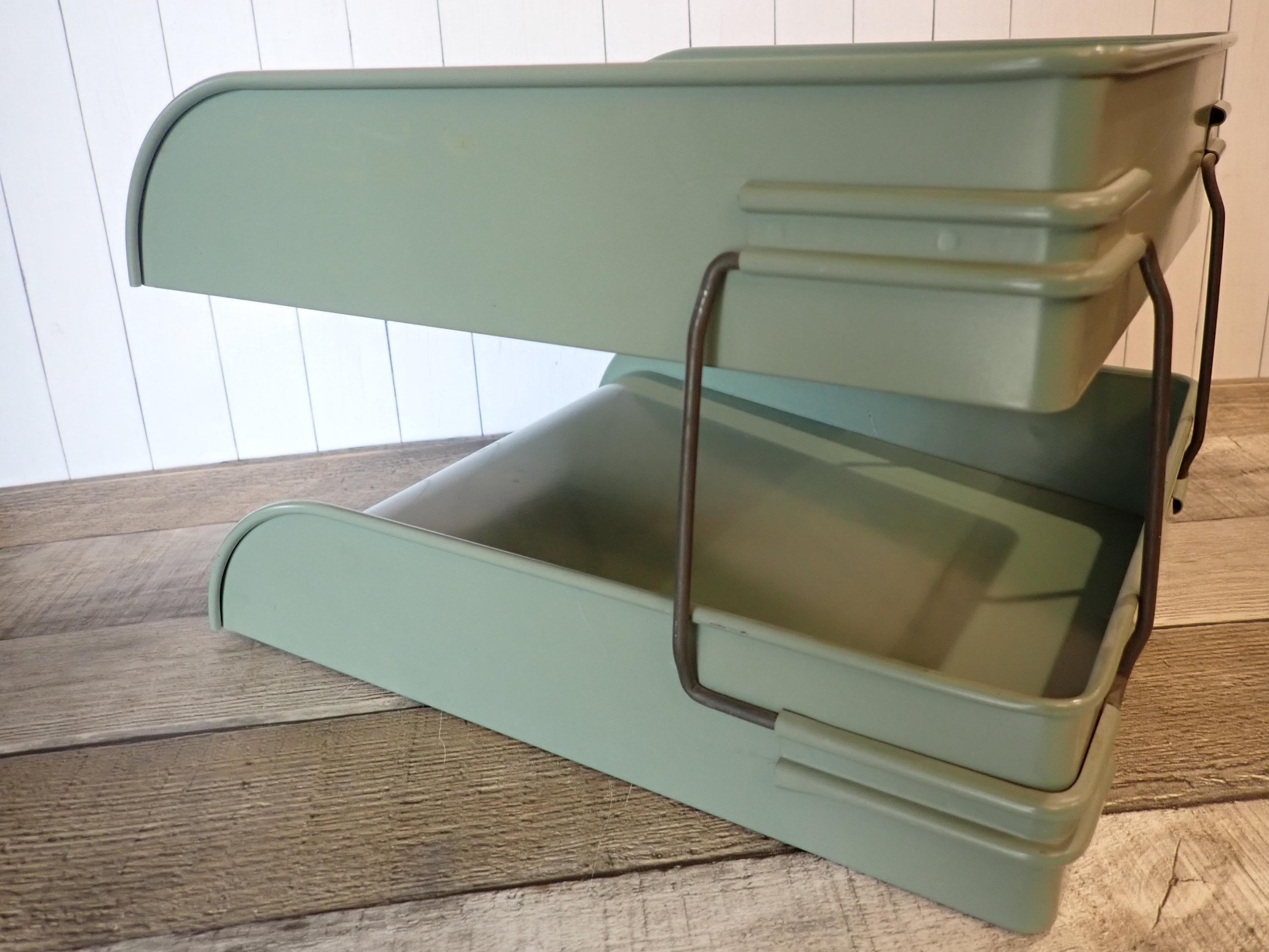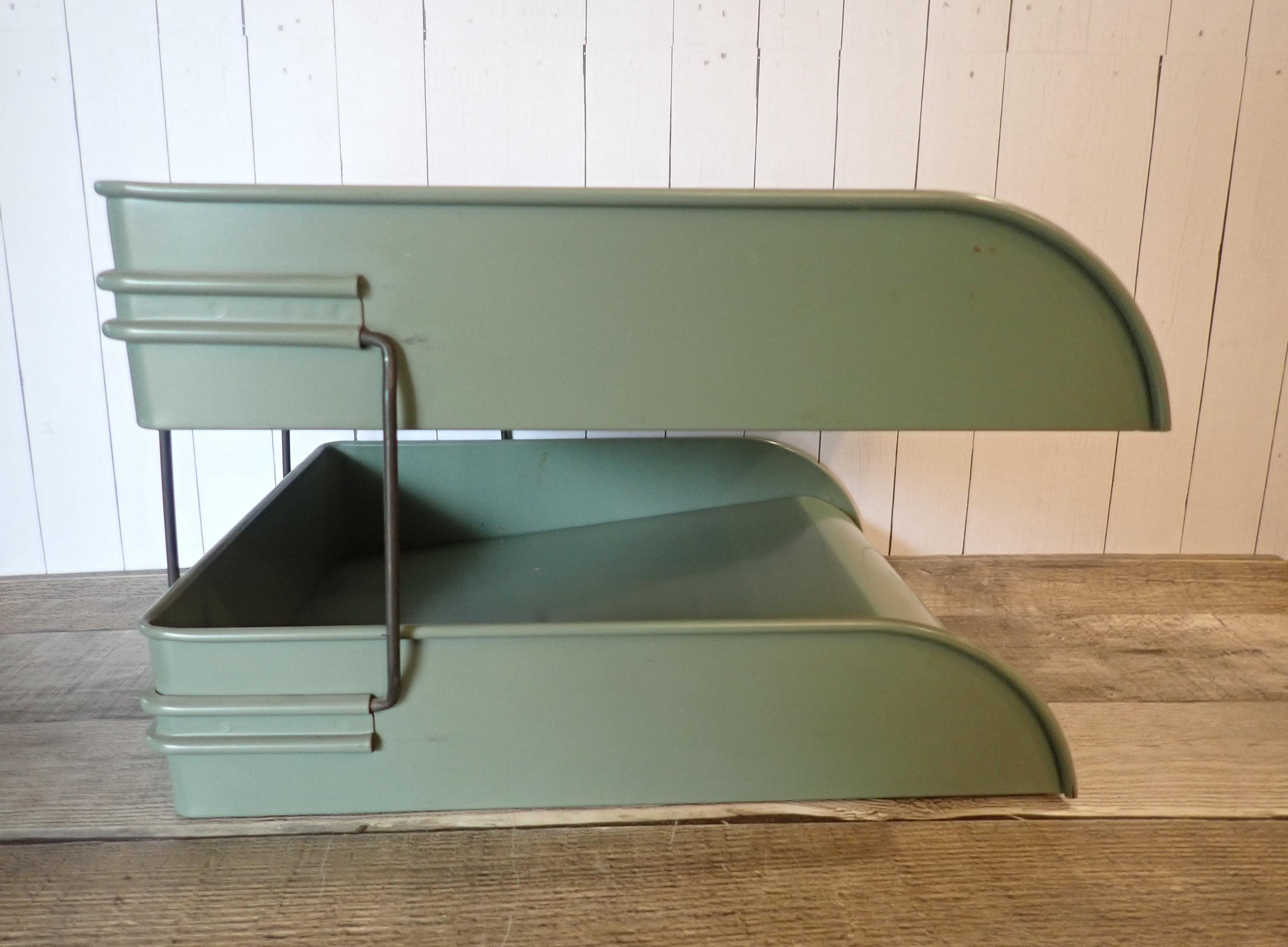 This great 2 tier paper tray is by Globe Wernicke and has 2 metal trays that are stacked with the included metal posts. Each tray is 9.75" wide and 12" long, and together they stand 8" tall. Both trays are marked Globe Wernicke. The trays are a green color. The paper tray is in nice condition but does have some light wear on the metal here and there.