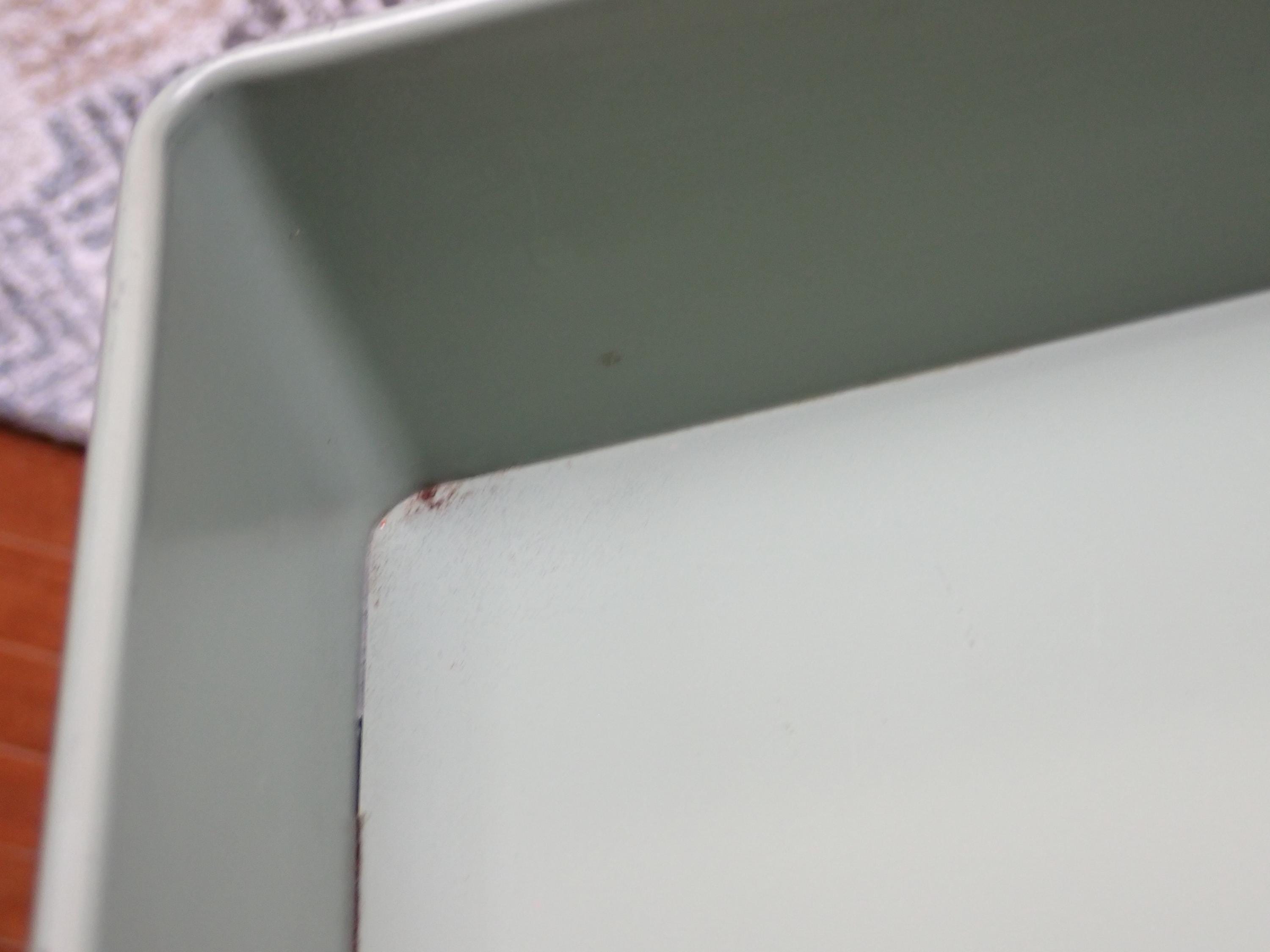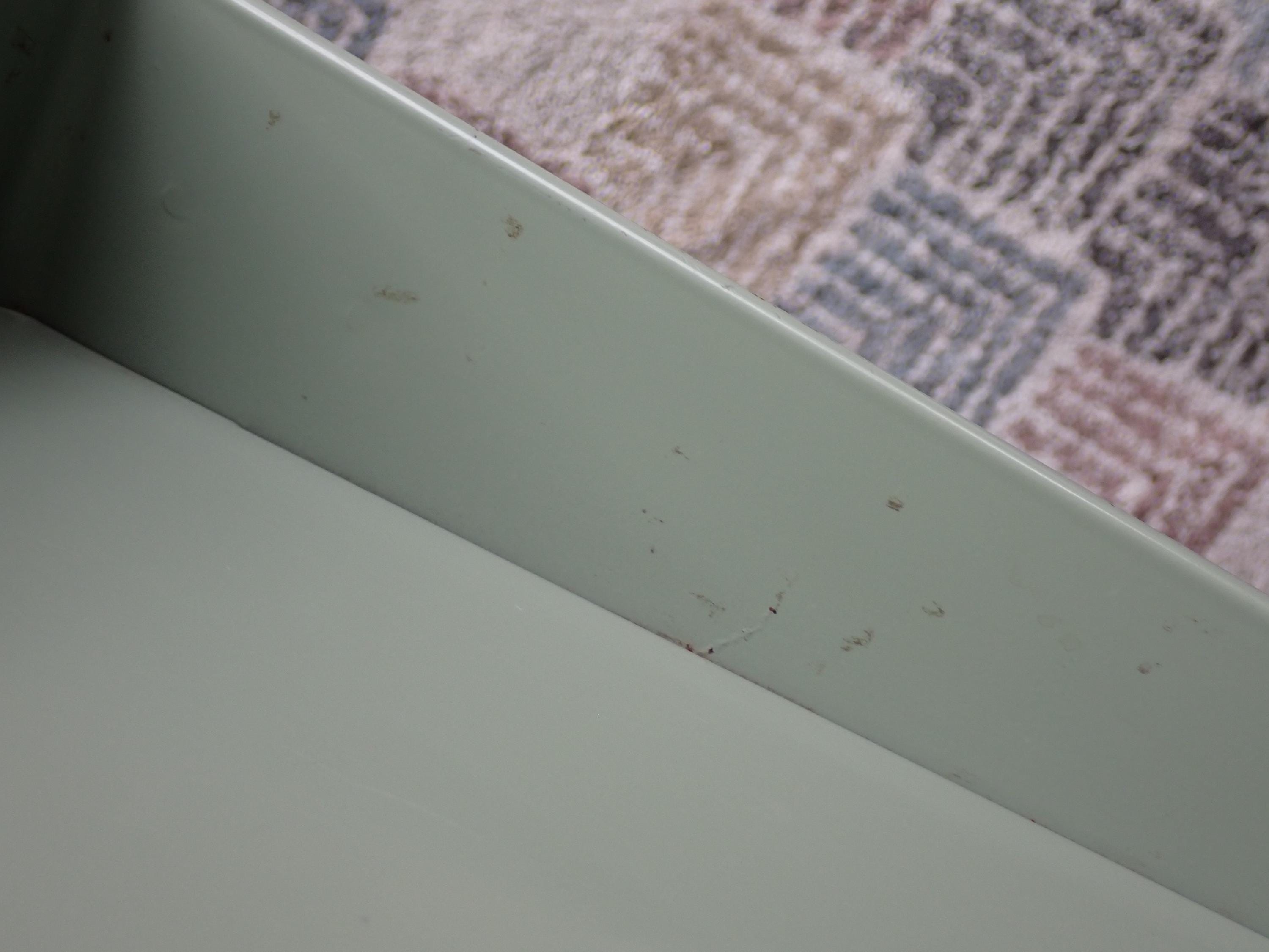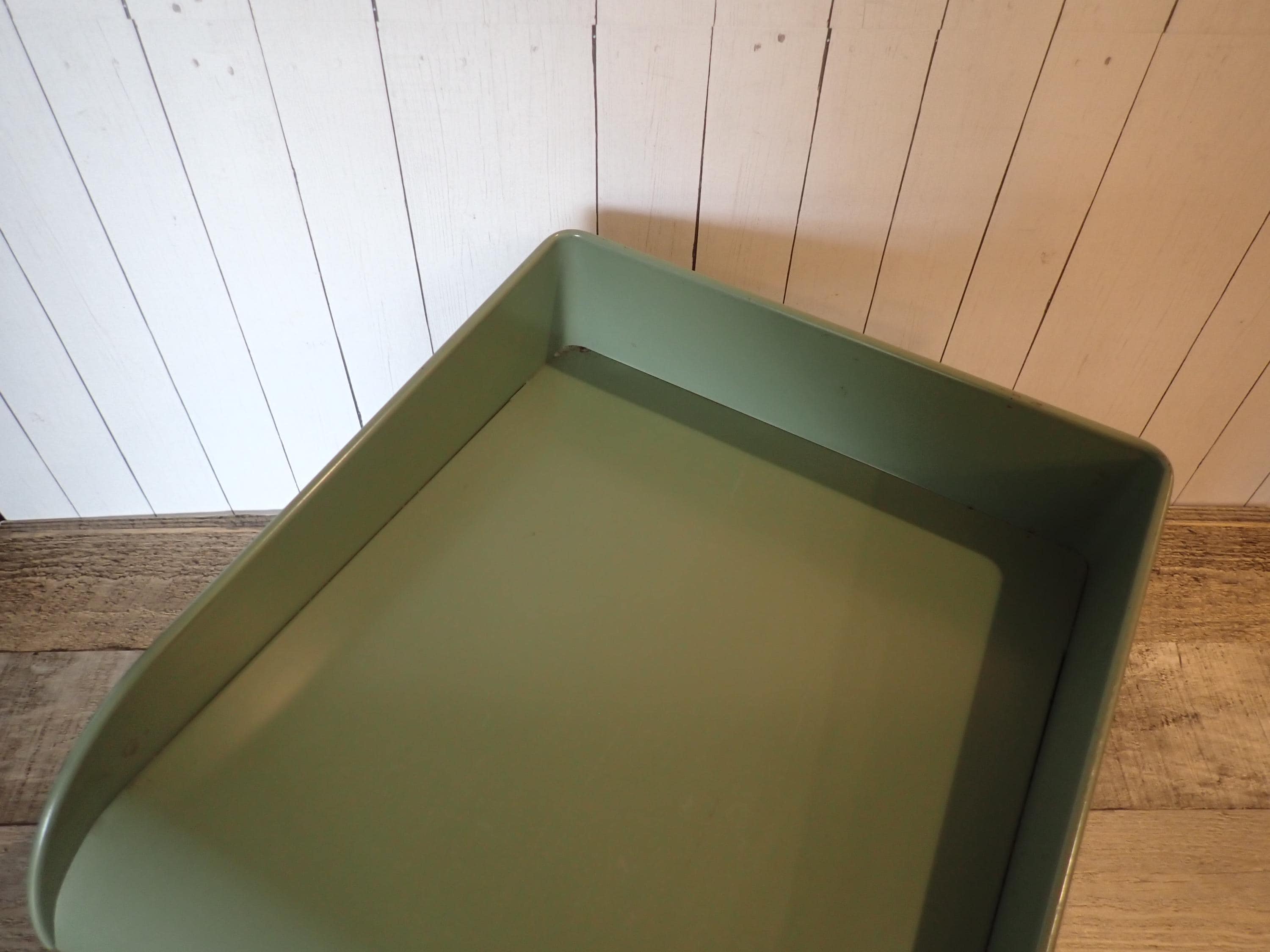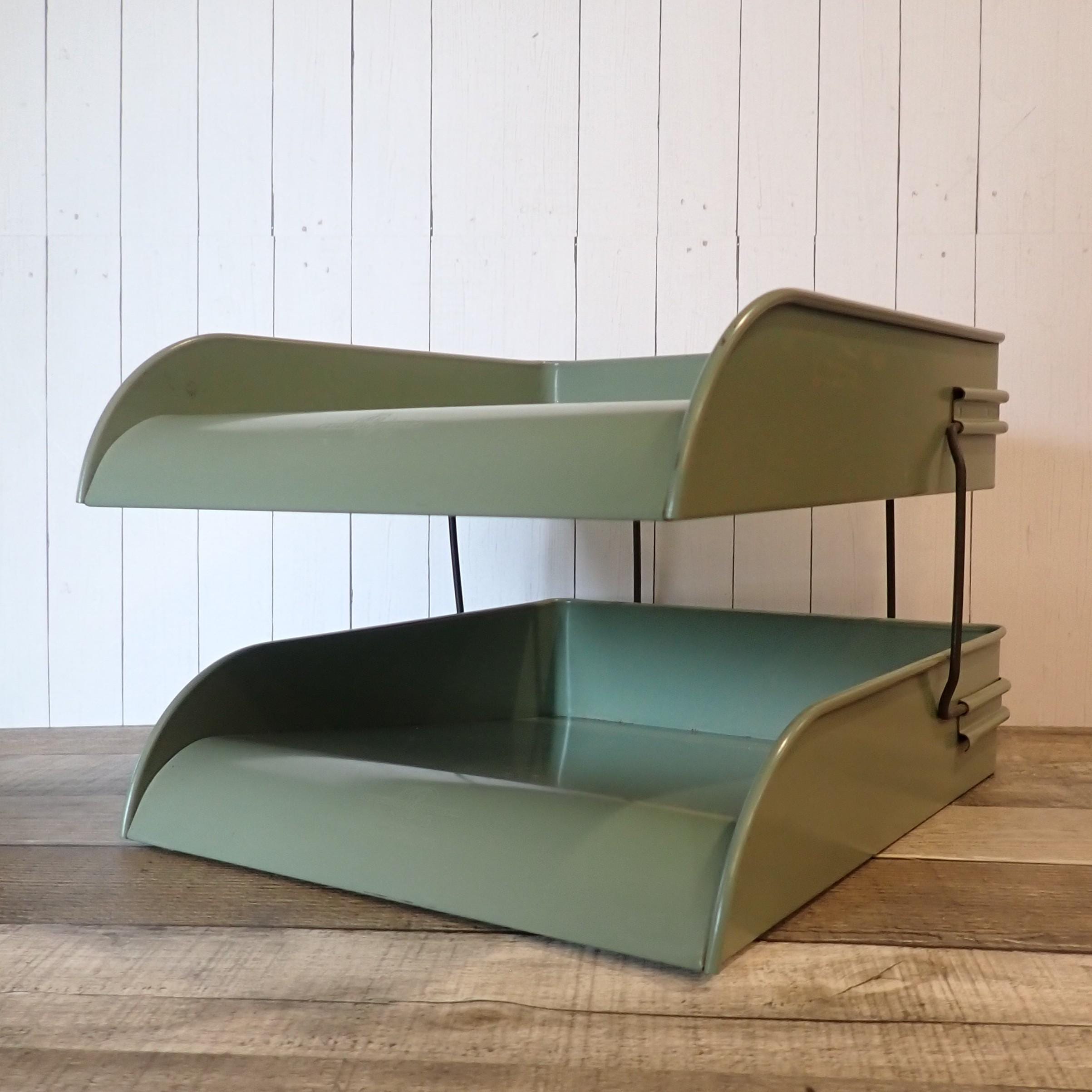 This great 2 tier paper tray is by Globe Wernicke and has 2 metal trays that are stacked with the included metal posts. Each tray is 9.75" wide and 12" long, and together they stand 8" tall. Both trays are marked Globe Wernicke. The trays are a green color. The paper tray is in nice condition but does have some light wear on the metal here and there.