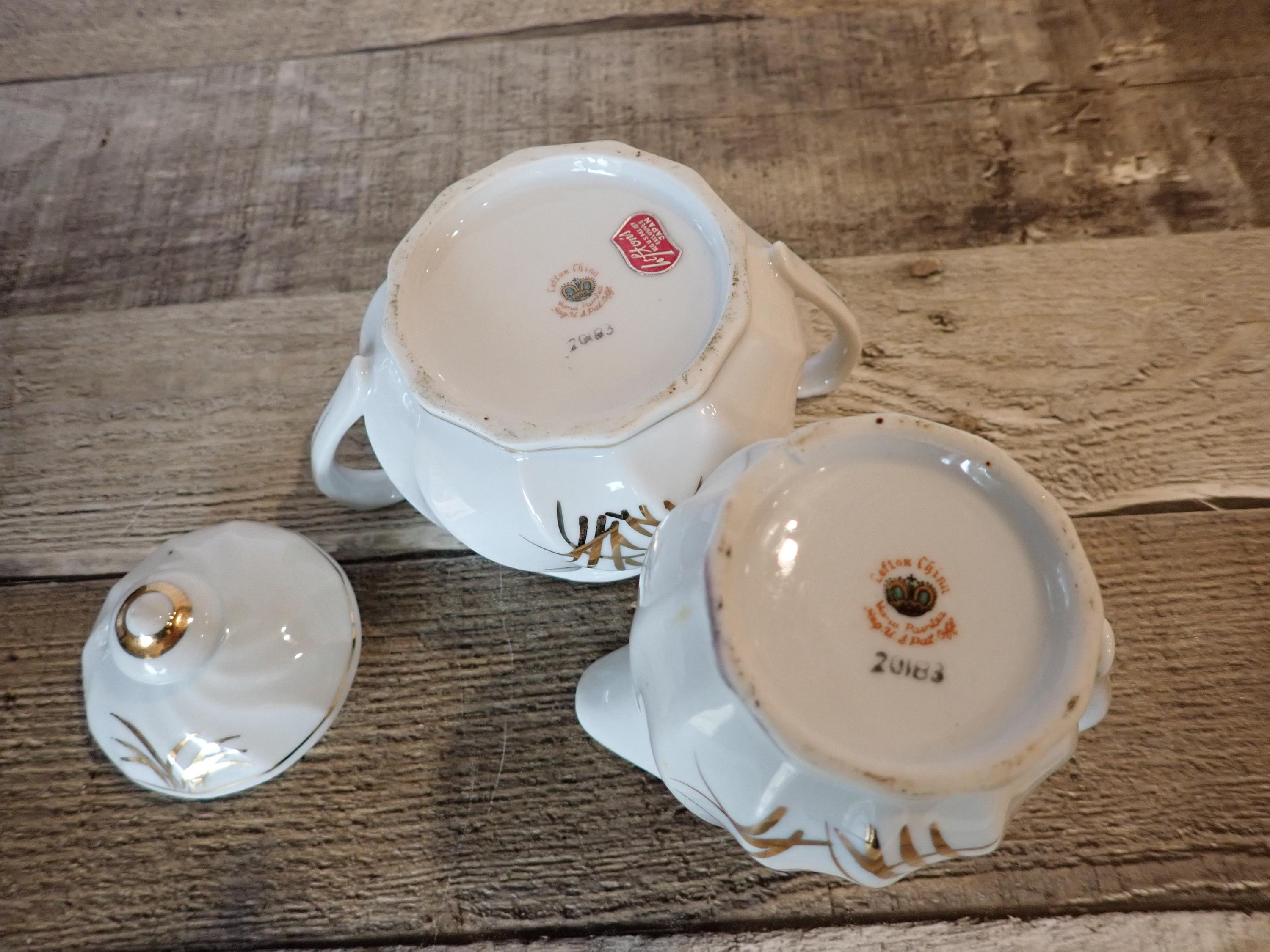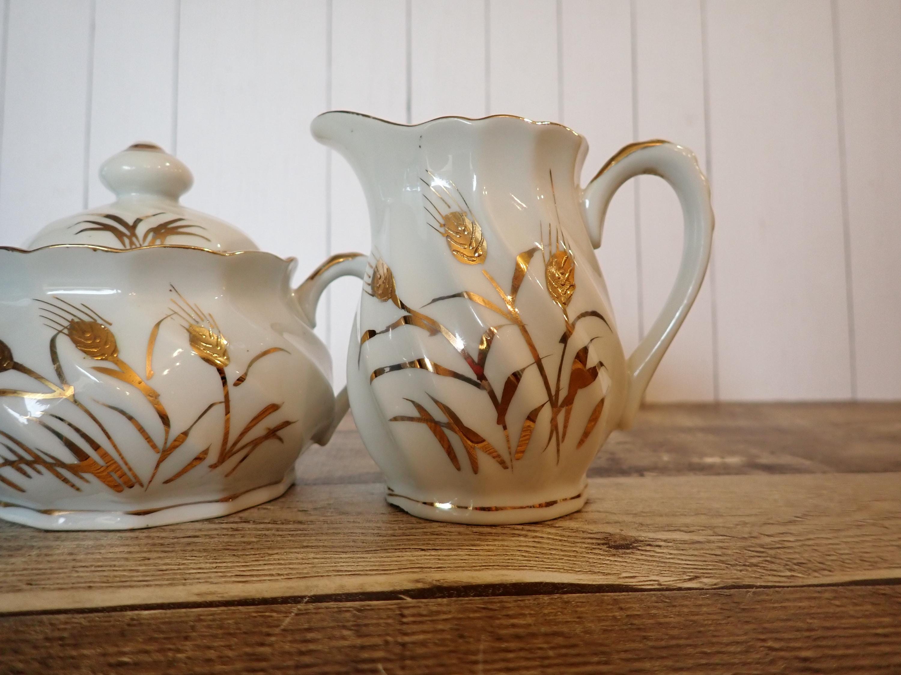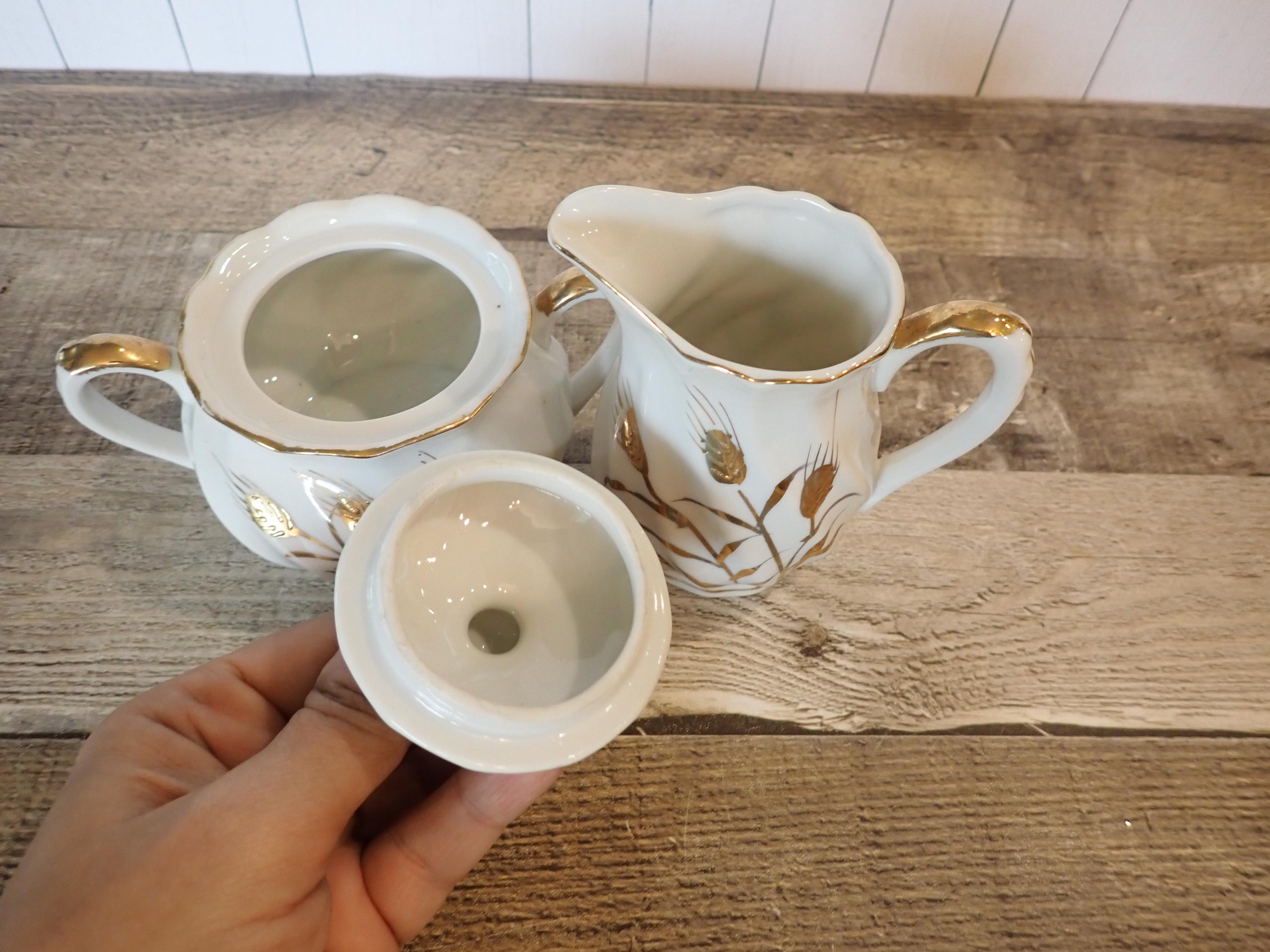 This ceramic sugar and creamer set by Lefton is white ceramic with gold wheat designs. This set includes the sugar bowl and lid, and the matching creamer. They are both marked Lefton on the bottoms. Both pieces are in nice condition, however there is a chip on the bottom of the creamer - this is shown in detail in the last 2 photos.