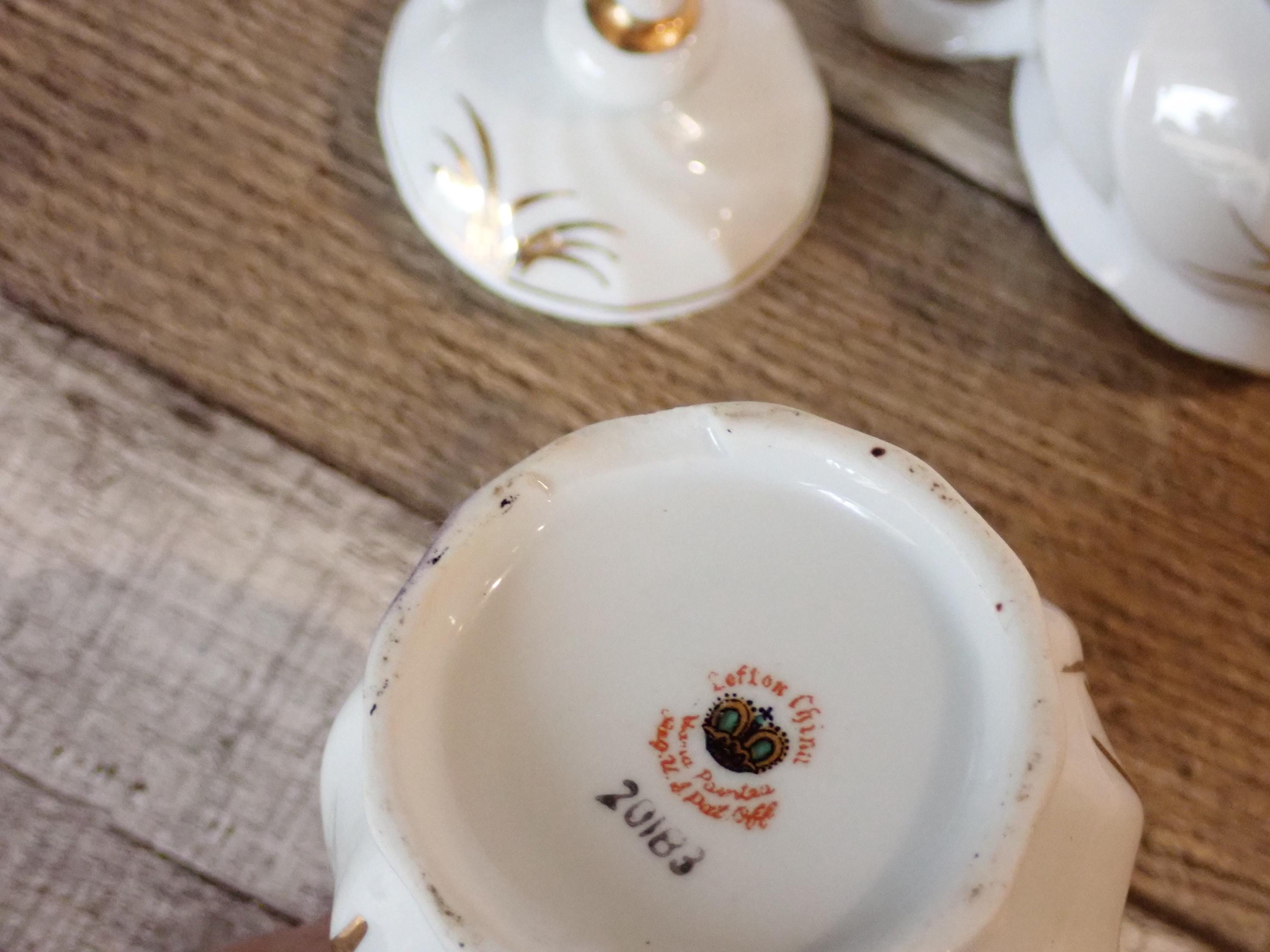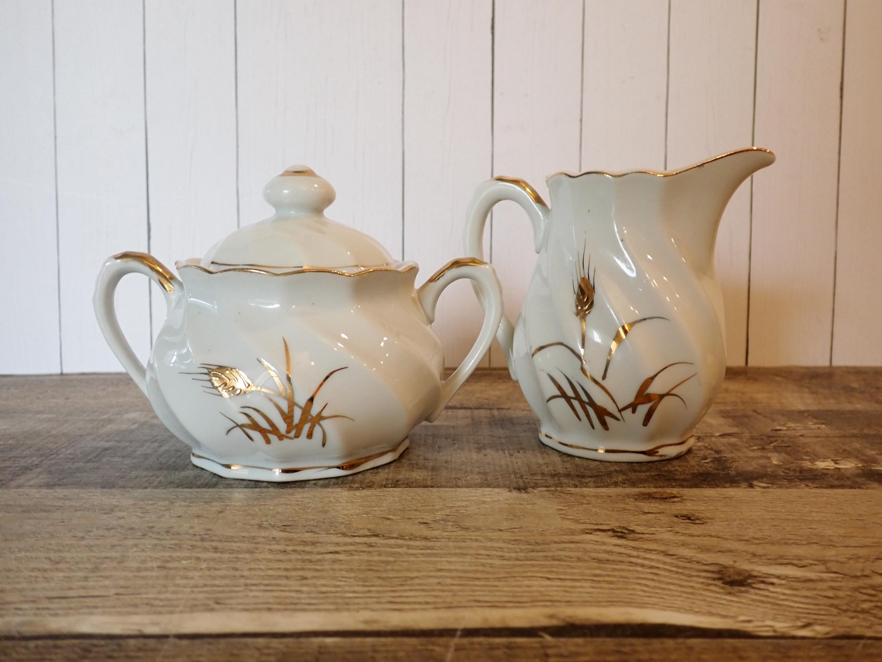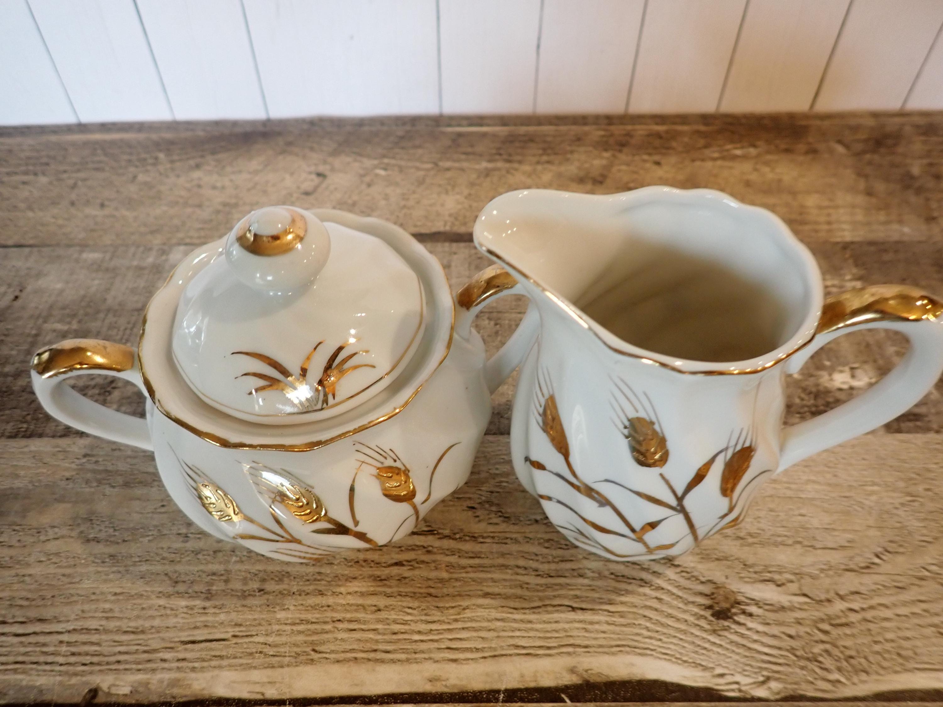 This ceramic sugar and creamer set by Lefton is white ceramic with gold wheat designs. This set includes the sugar bowl and lid, and the matching creamer. They are both marked Lefton on the bottoms. Both pieces are in nice condition, however there is a chip on the bottom of the creamer - this is shown in detail in the last 2 photos.