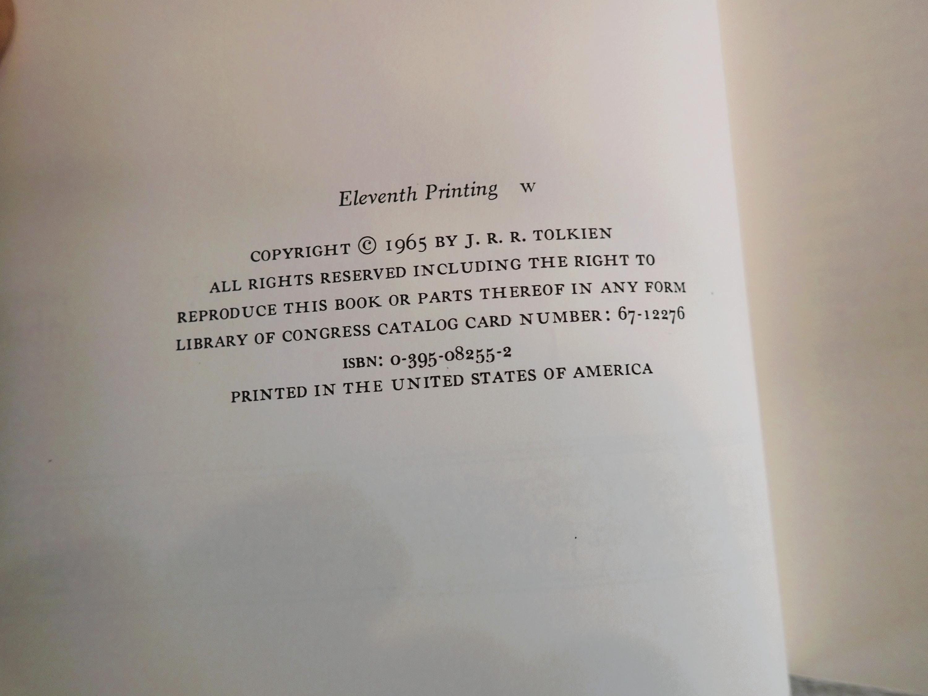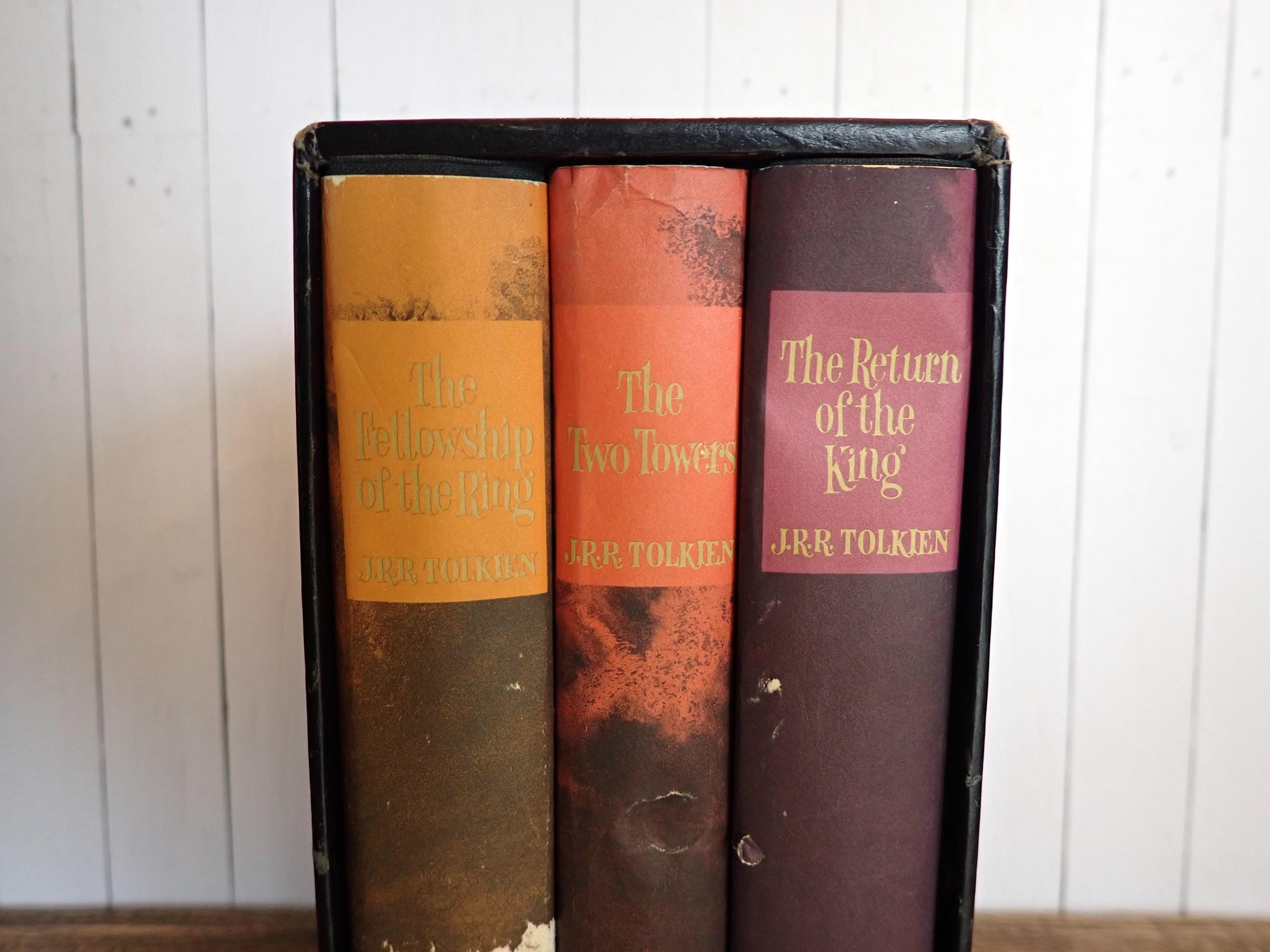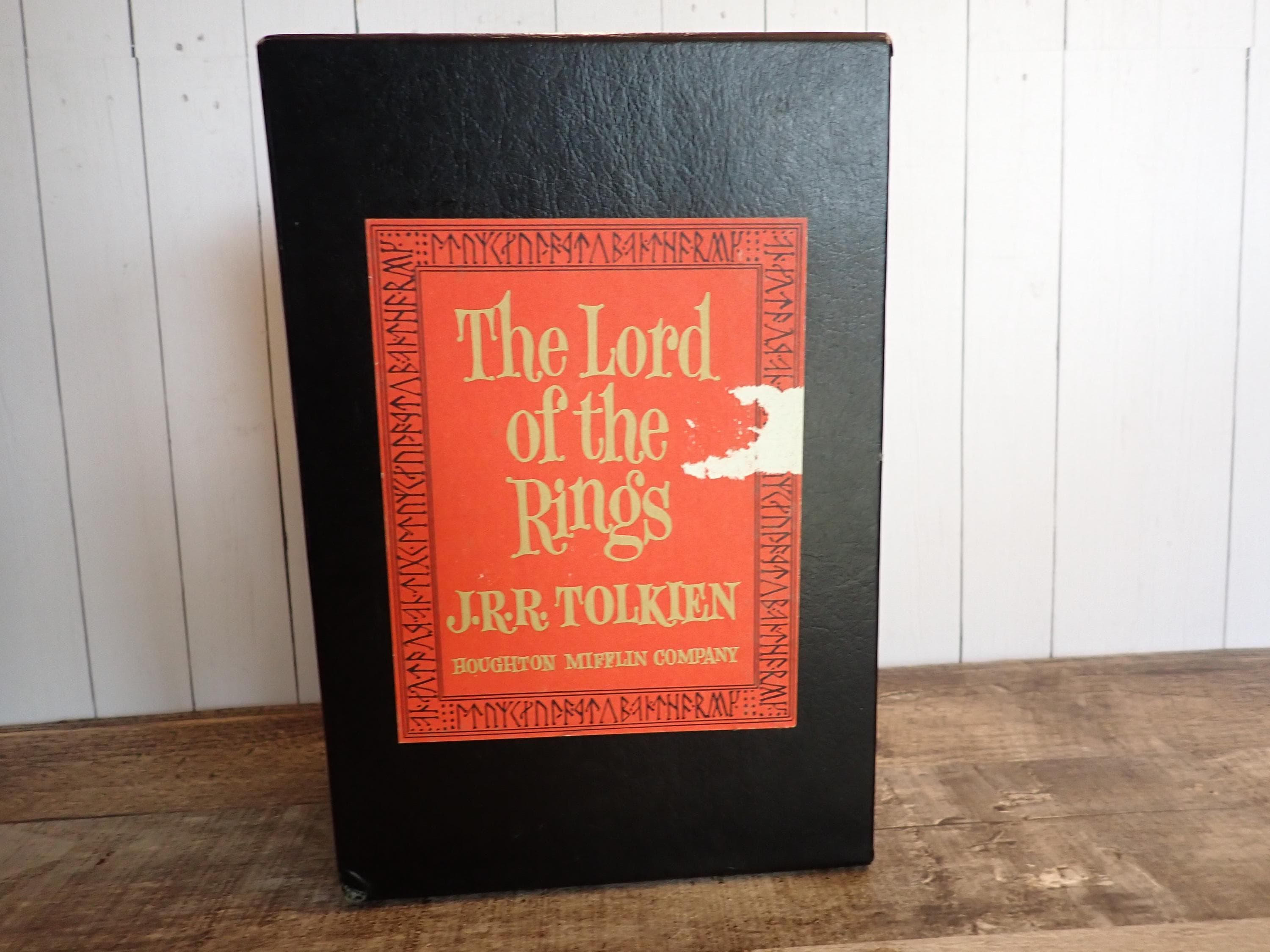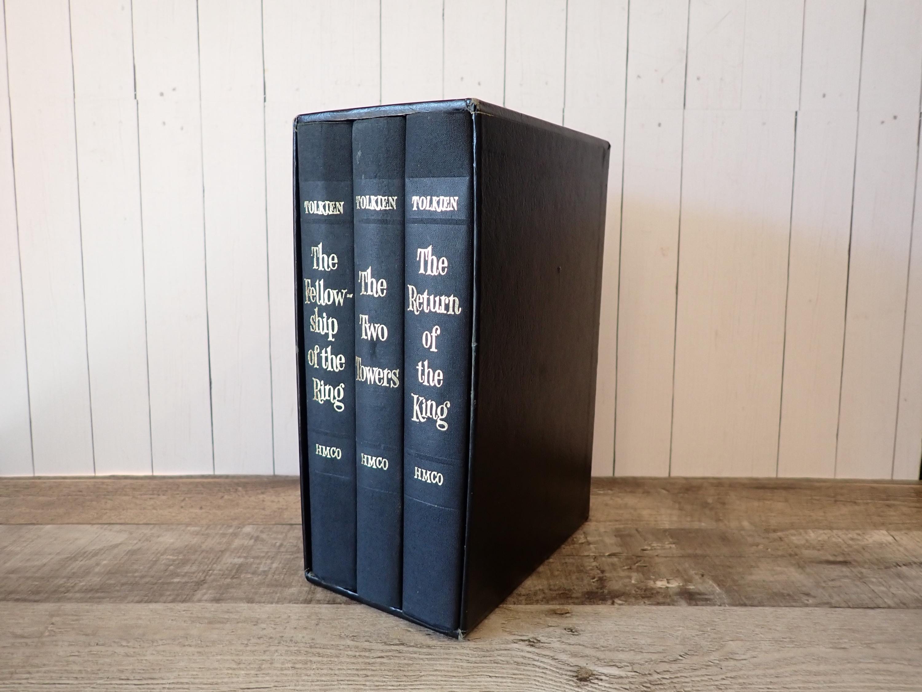 This boxed set of the Lord of the Rings Trilogy is from 1965 and printed by Houghton Mifflin Co. This set includes the 3 books and the cardboard sleeve. All 3 books have their paper dust jackets, or can be displayed without the covers with the black cloth binding with gold lettering. The boxed set measures 9.25" tall, 4" wide, and 6.25" deep. The set is in nice condition but it is not perfect - there is areas of the paper label missing on the front of the box as well as one of the dust jacket spines of the paper covers. There is some light damage to the two other dust jackets as well. All 3 books have their attached maps at the end of each book. Two of the books have writing (a name and date) on the inside cover page. There is some light discoloration here and there on the back fabric of the books - most noticeable on number 2.