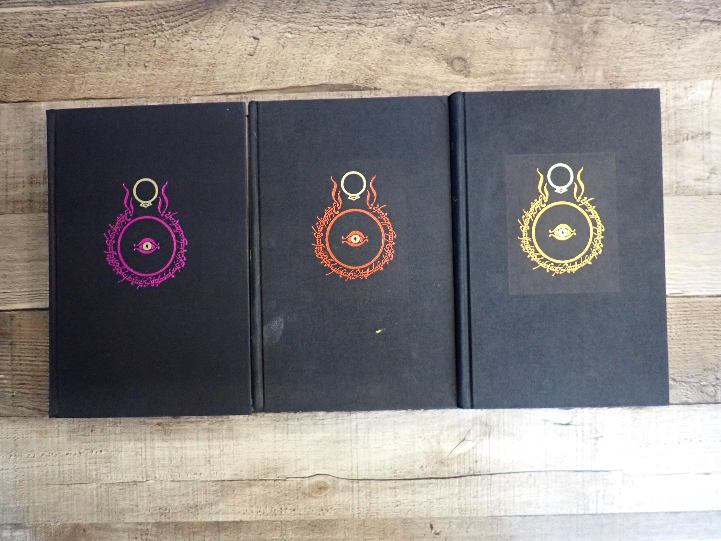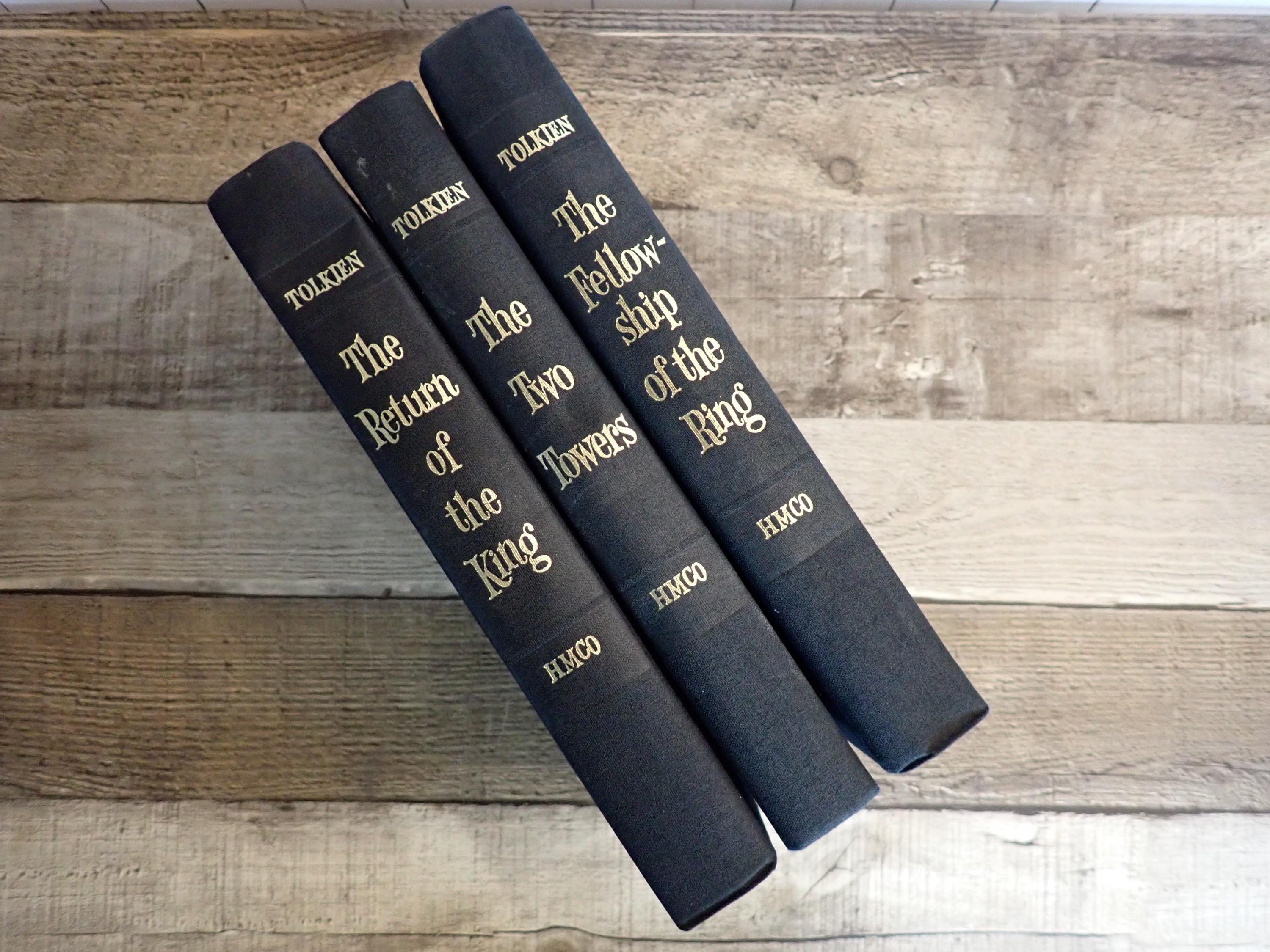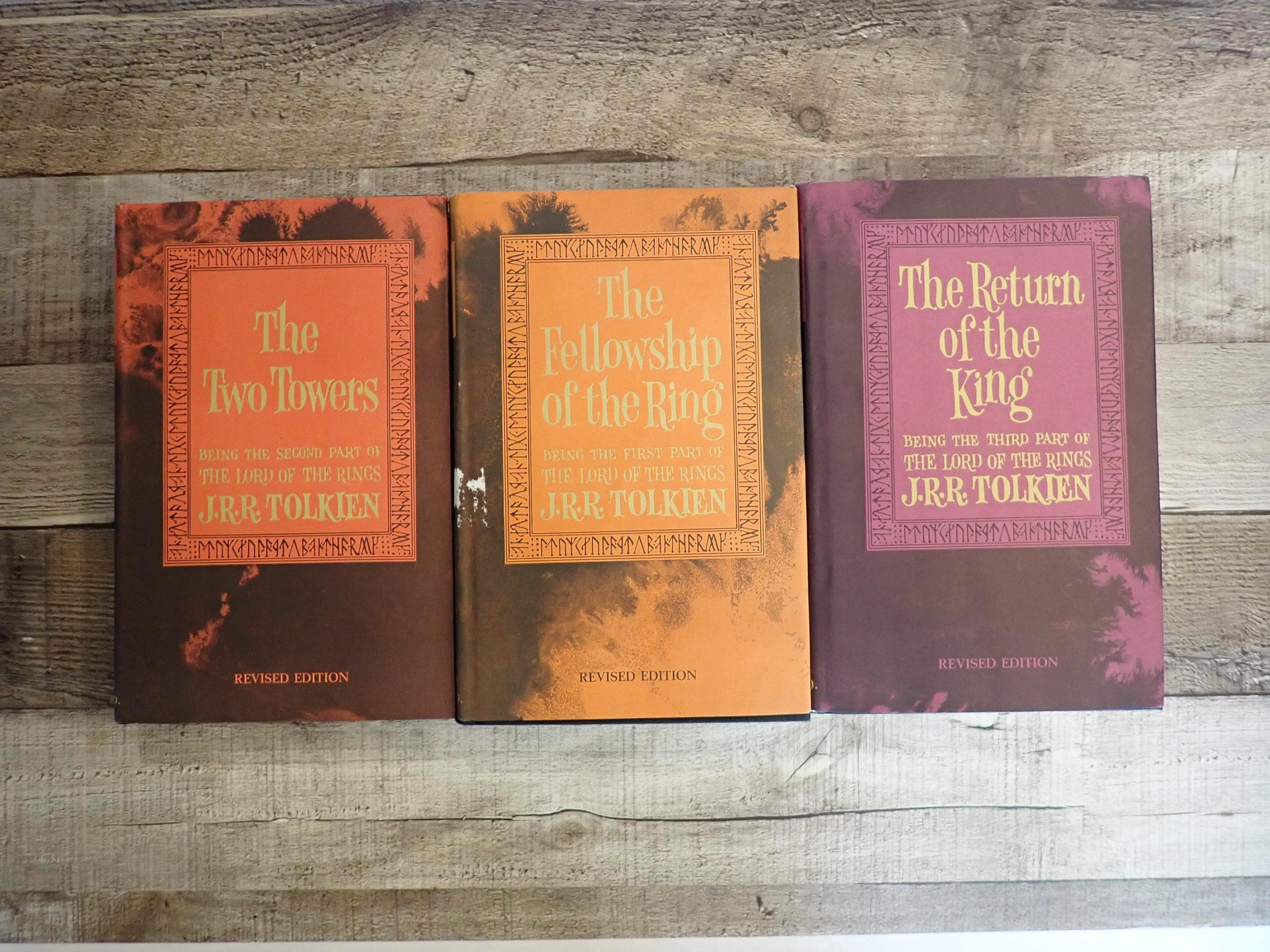 This boxed set of the Lord of the Rings Trilogy is from 1965 and printed by Houghton Mifflin Co. This set includes the 3 books and the cardboard sleeve. All 3 books have their paper dust jackets, or can be displayed without the covers with the black cloth binding with gold lettering. The boxed set measures 9.25" tall, 4" wide, and 6.25" deep. The set is in nice condition but it is not perfect - there is areas of the paper label missing on the front of the box as well as one of the dust jacket spines of the paper covers. There is some light damage to the two other dust jackets as well. All 3 books have their attached maps at the end of each book. Two of the books have writing (a name and date) on the inside cover page. There is some light discoloration here and there on the back fabric of the books - most noticeable on number 2.