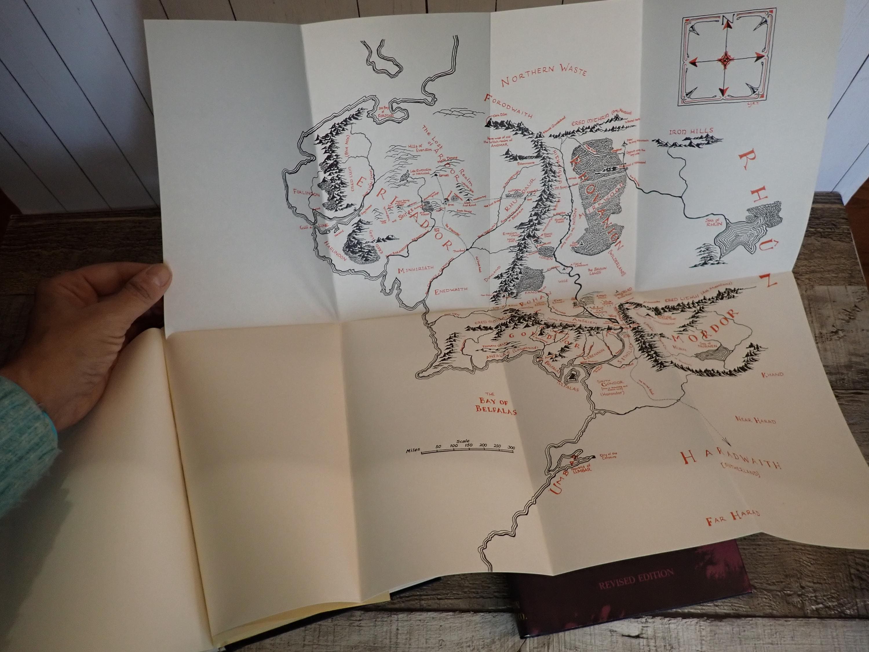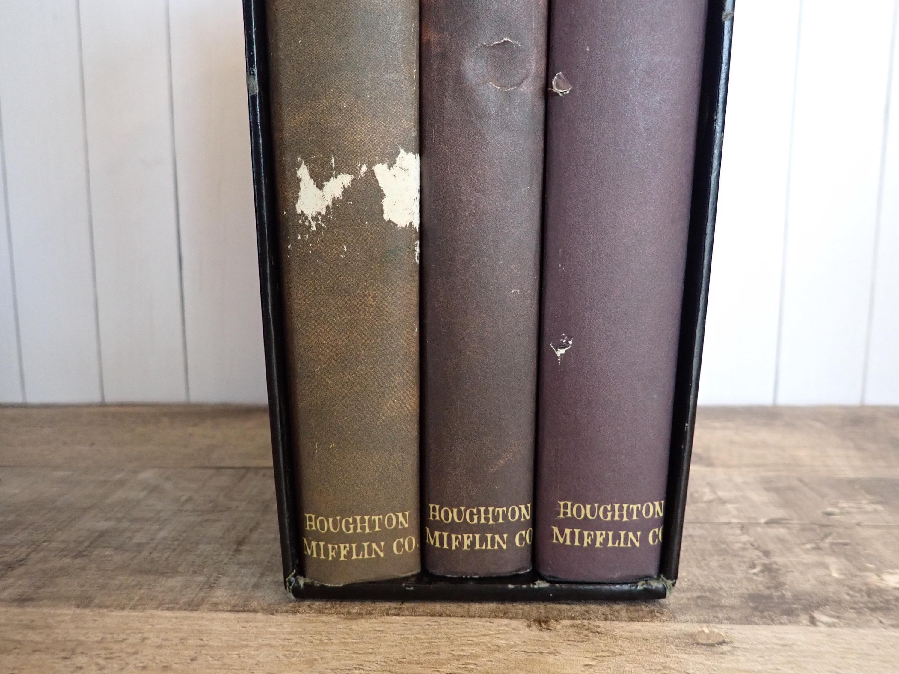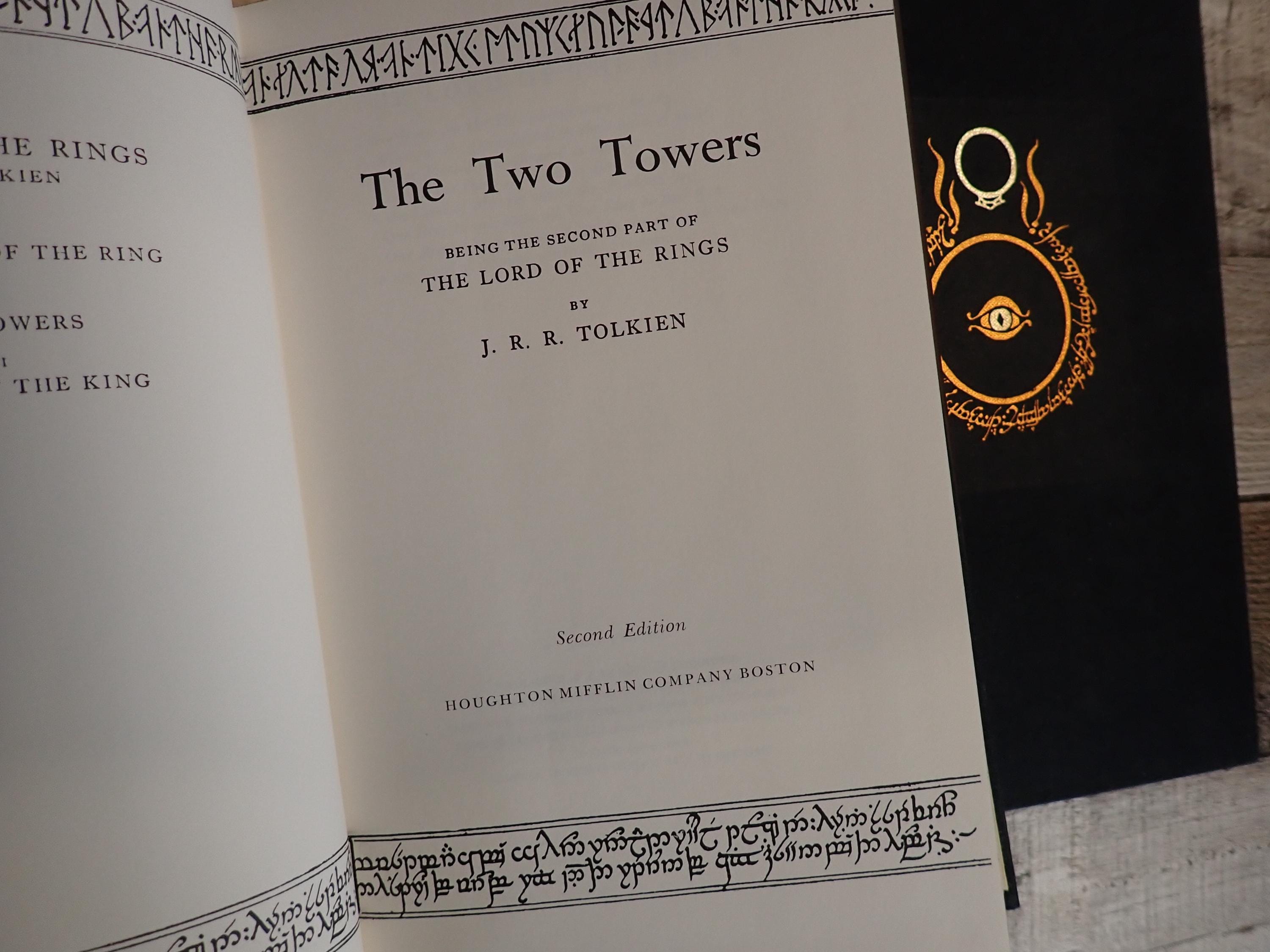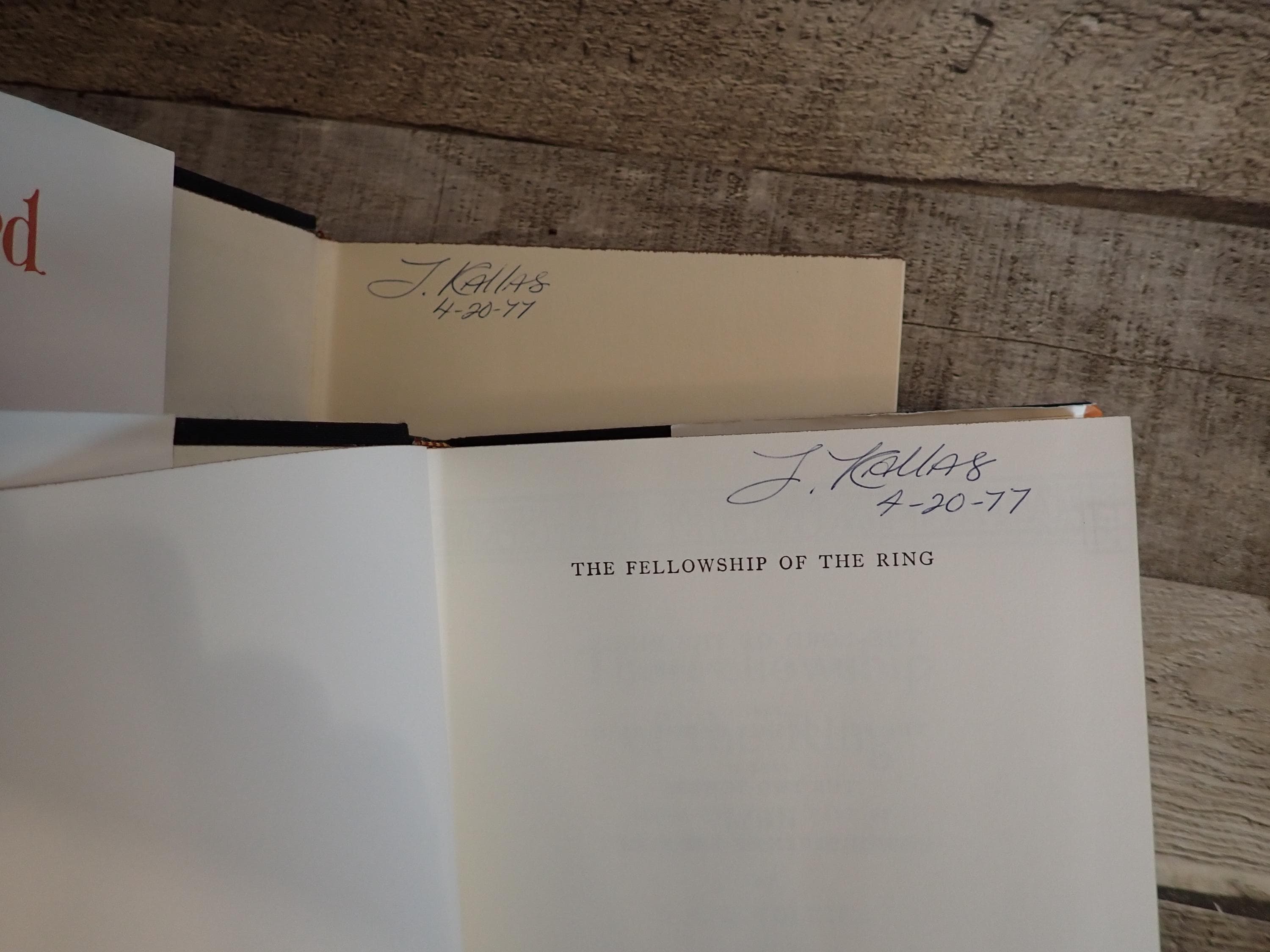 This boxed set of the Lord of the Rings Trilogy is from 1965 and printed by Houghton Mifflin Co. This set includes the 3 books and the cardboard sleeve. All 3 books have their paper dust jackets, or can be displayed without the covers with the black cloth binding with gold lettering. The boxed set measures 9.25" tall, 4" wide, and 6.25" deep. The set is in nice condition but it is not perfect - there is areas of the paper label missing on the front of the box as well as one of the dust jacket spines of the paper covers. There is some light damage to the two other dust jackets as well. All 3 books have their attached maps at the end of each book. Two of the books have writing (a name and date) on the inside cover page. There is some light discoloration here and there on the back fabric of the books - most noticeable on number 2.