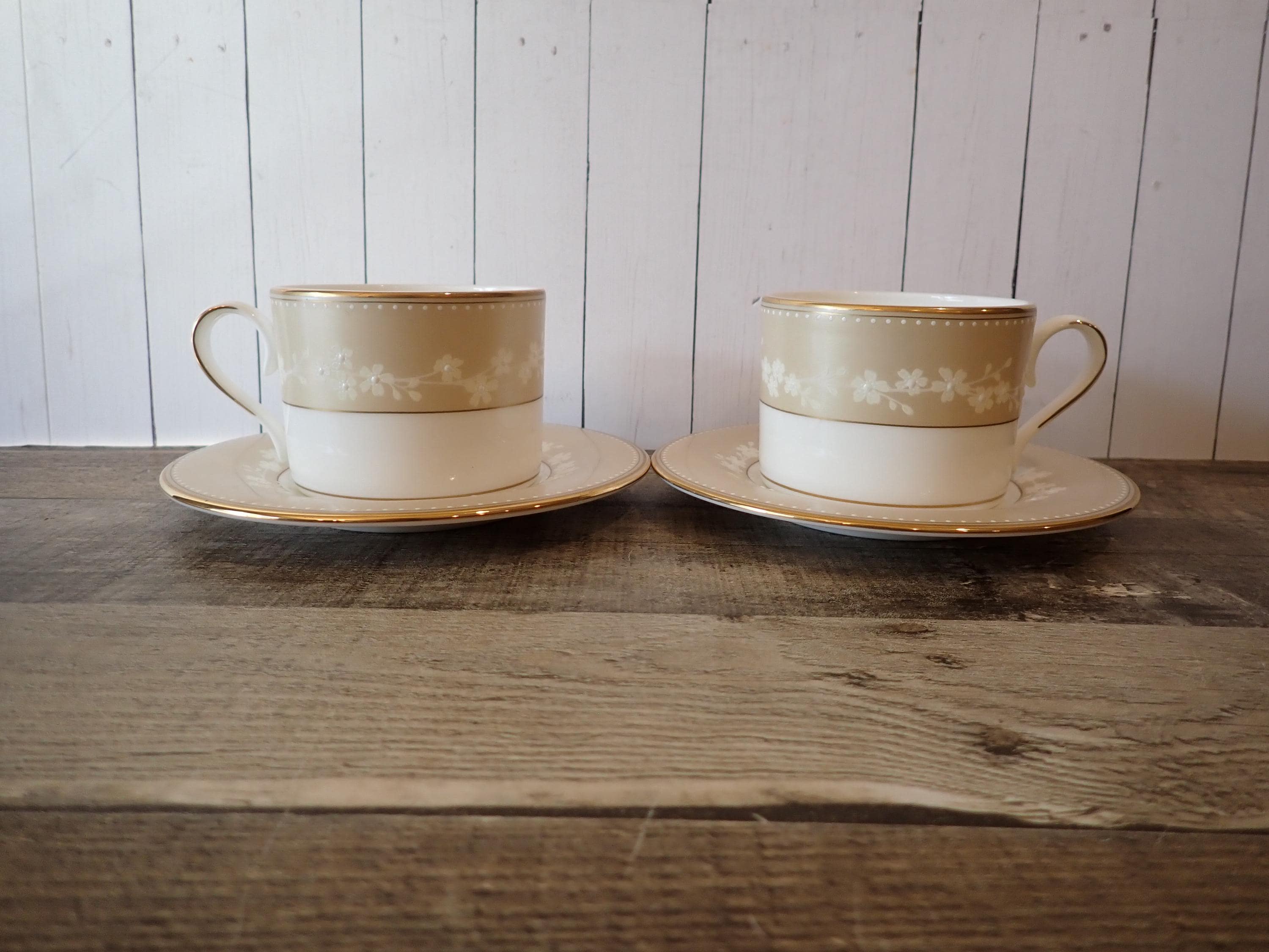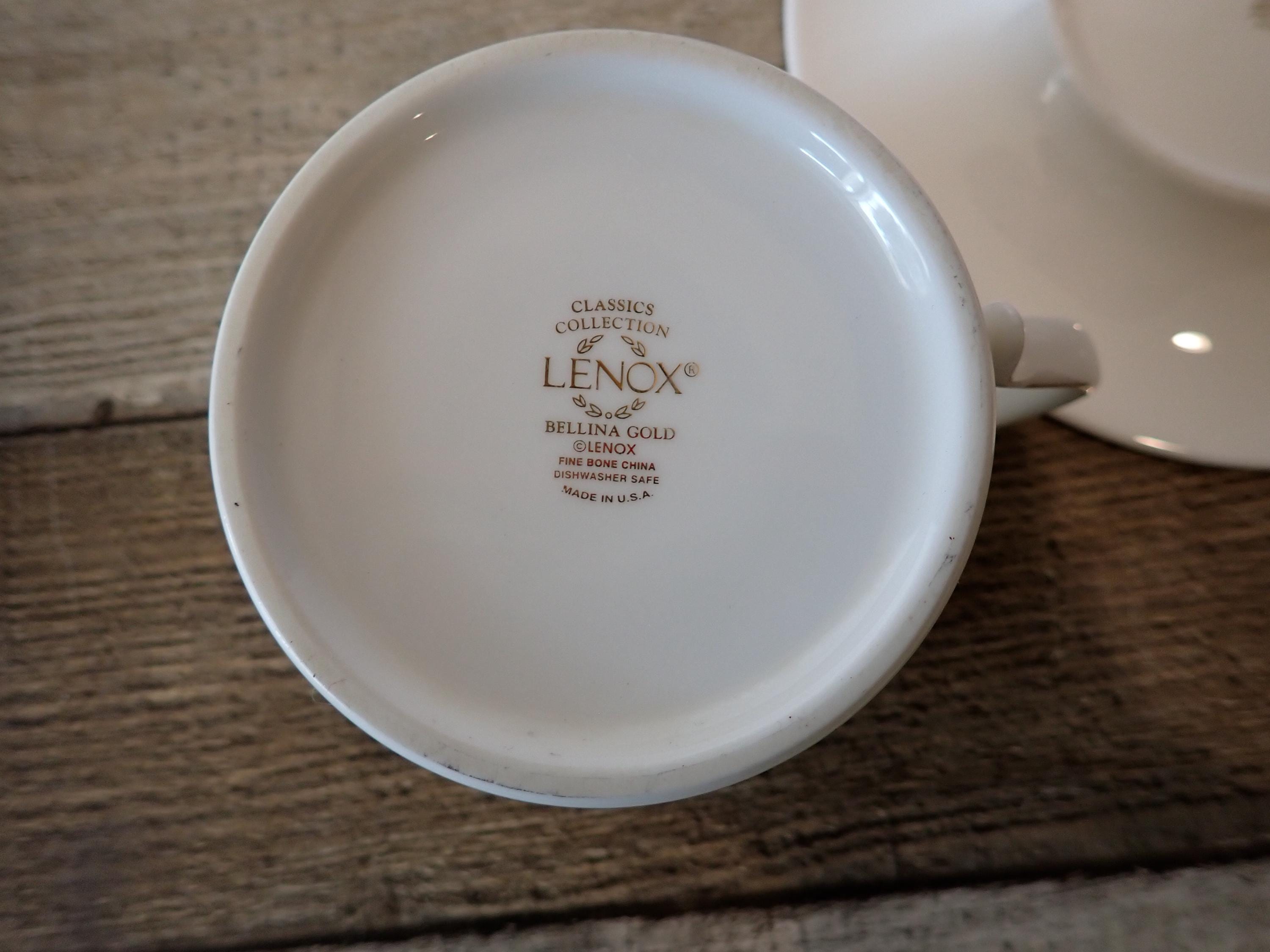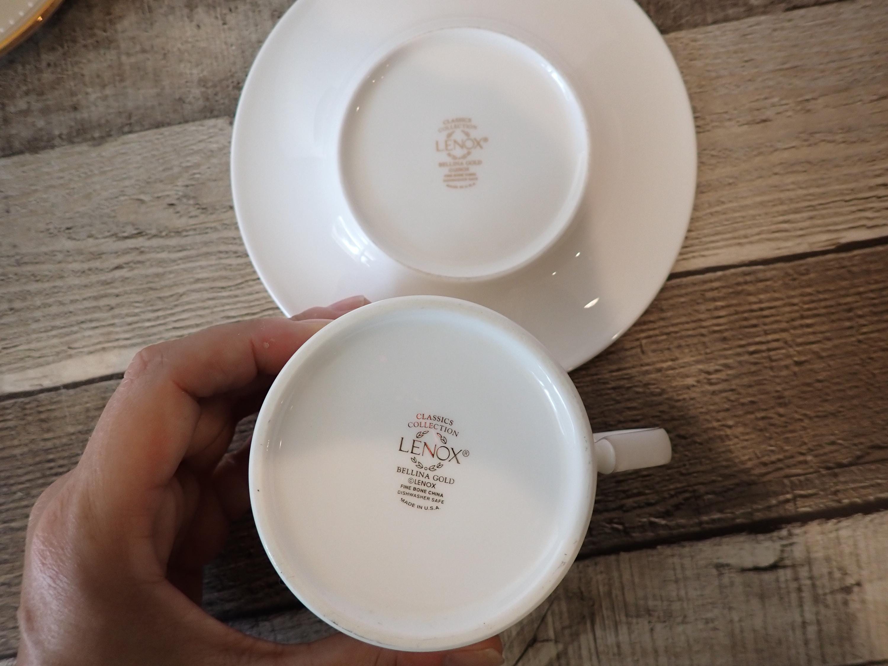 This lovely set of teacups and saucers by Lenox are in the Bellina Gold pattern. They are white with a tan band, and small white flowers in the tan band. They are accented with a gold band around the rim. The bottoms are marked: CLASSICS COLLECTION / LENOX / BELLINA GOLD / LENOX FINE BONE CHINA / DISHWASHER SAFE / MADE IN USA. Both cups and saucers are in very good condition with no chips or cracks.