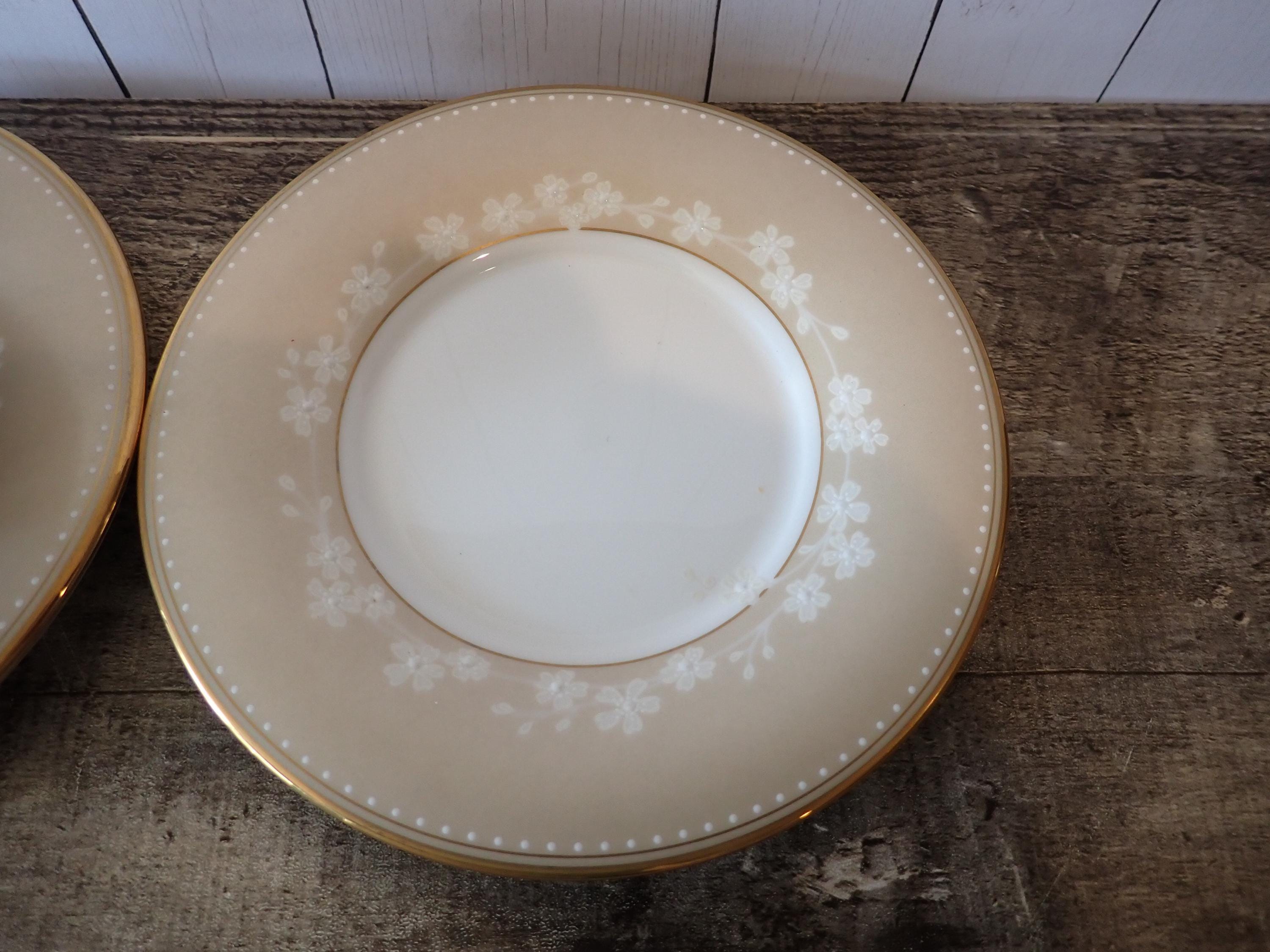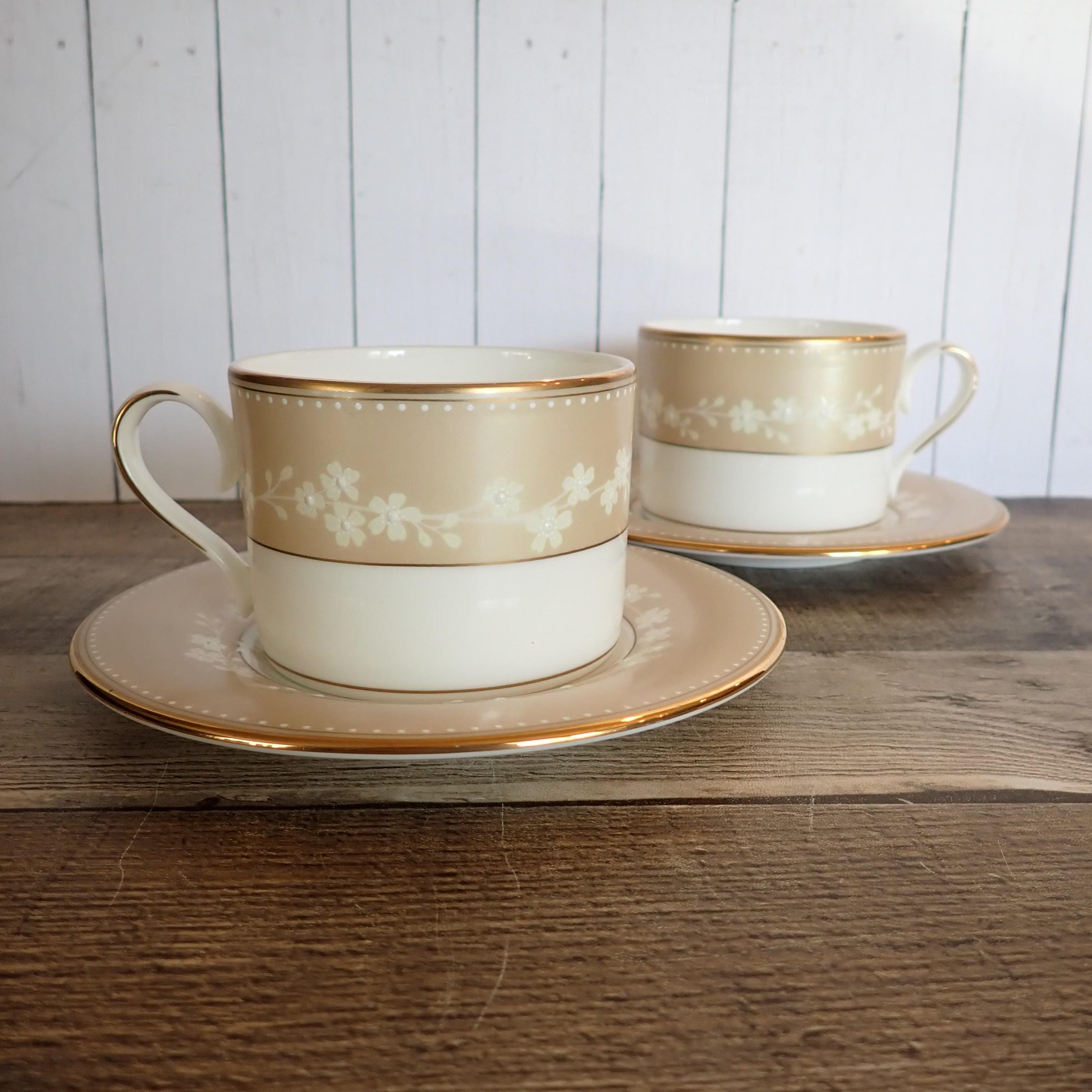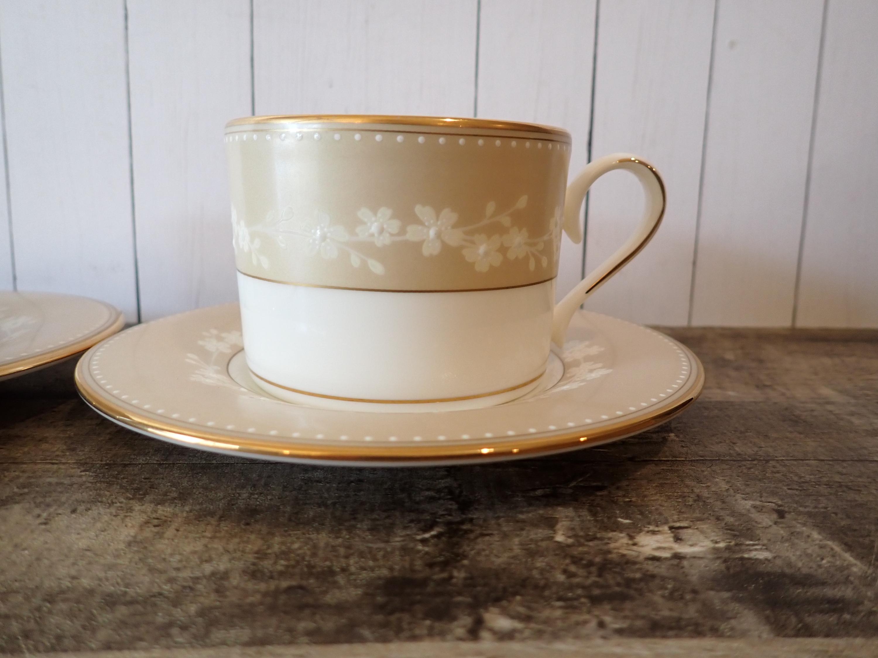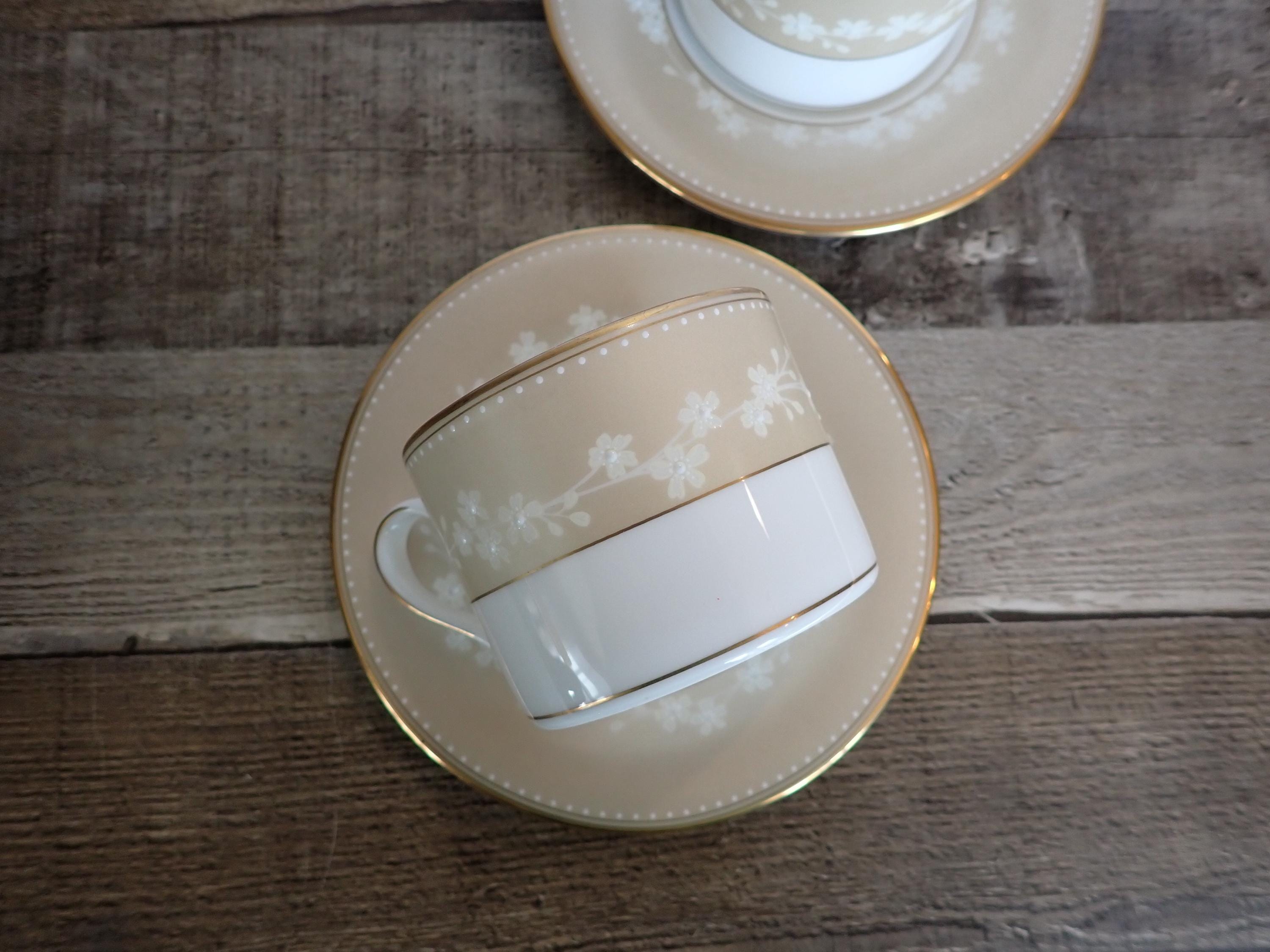 This lovely set of teacups and saucers by Lenox are in the Bellina Gold pattern. They are white with a tan band, and small white flowers in the tan band. They are accented with a gold band around the rim. The bottoms are marked: CLASSICS COLLECTION / LENOX / BELLINA GOLD / LENOX FINE BONE CHINA / DISHWASHER SAFE / MADE IN USA. Both cups and saucers are in very good condition with no chips or cracks.