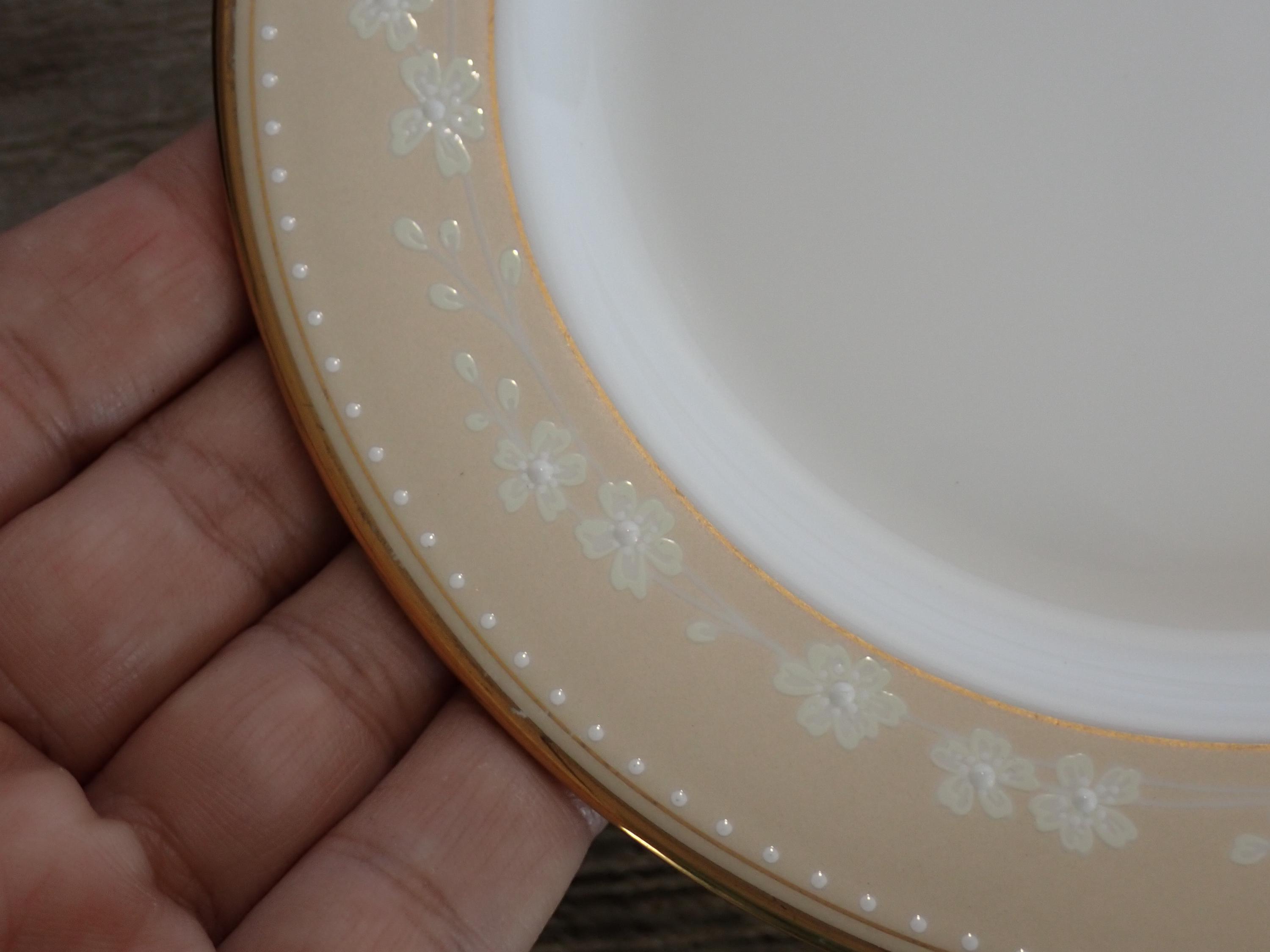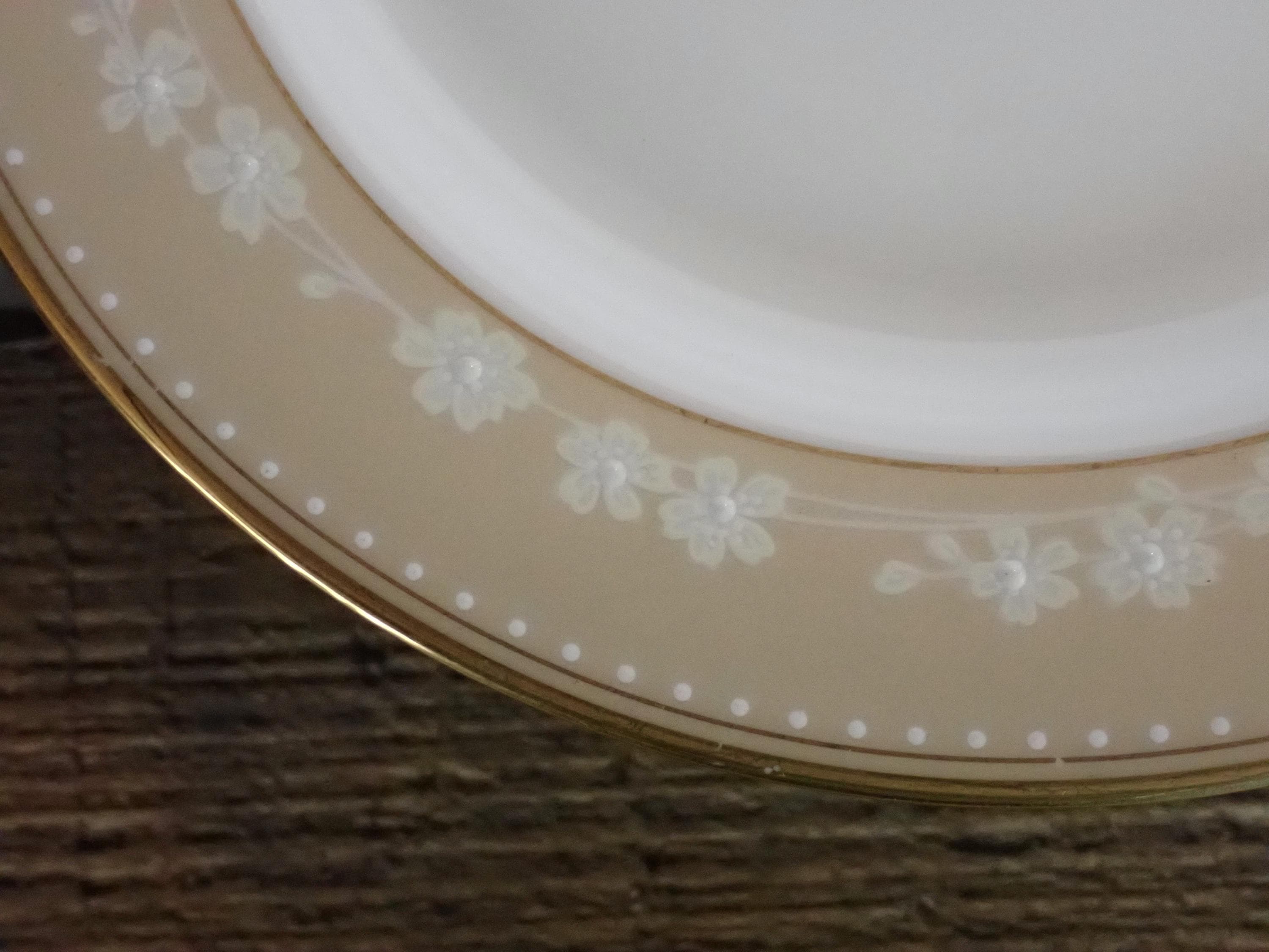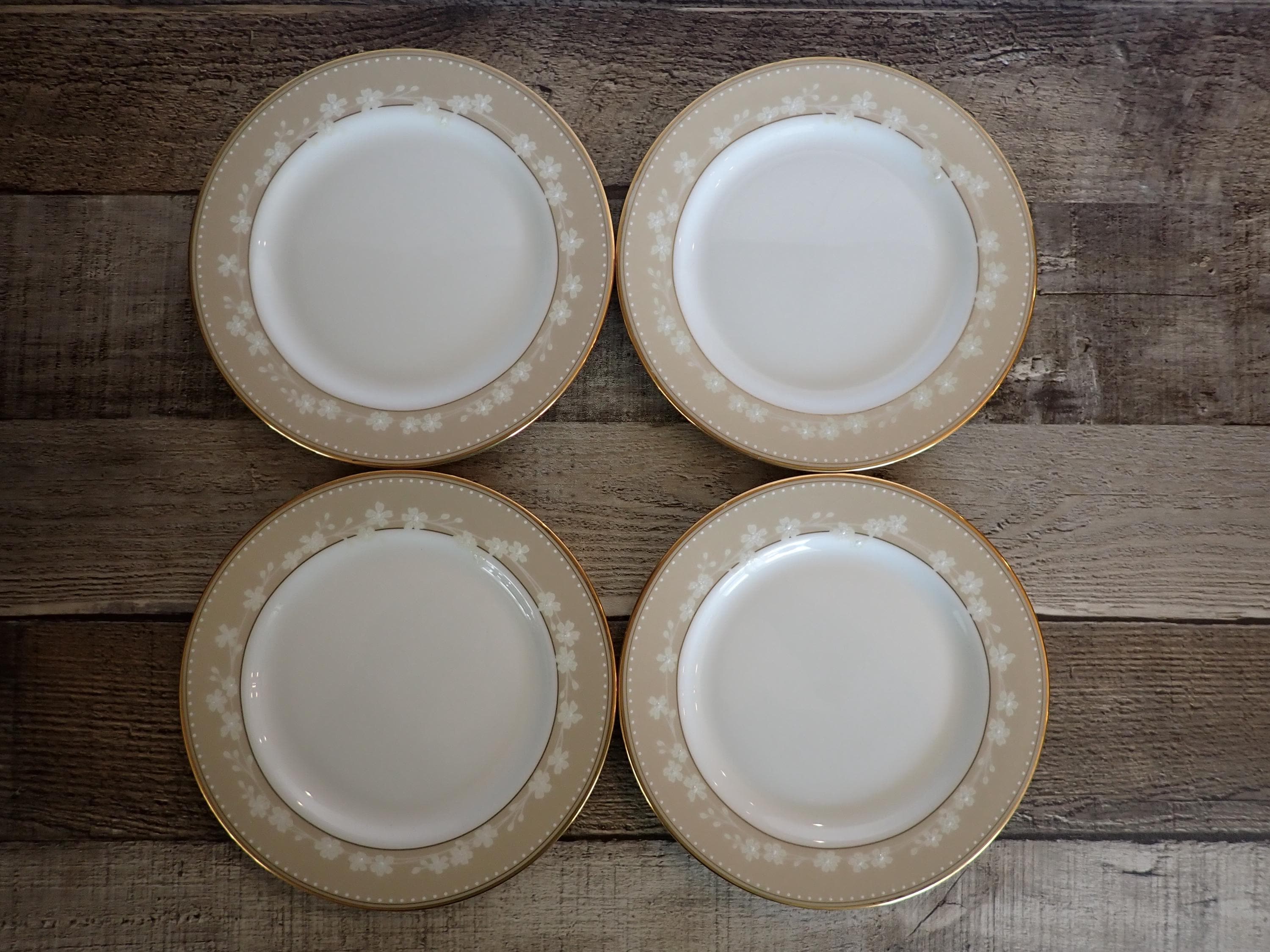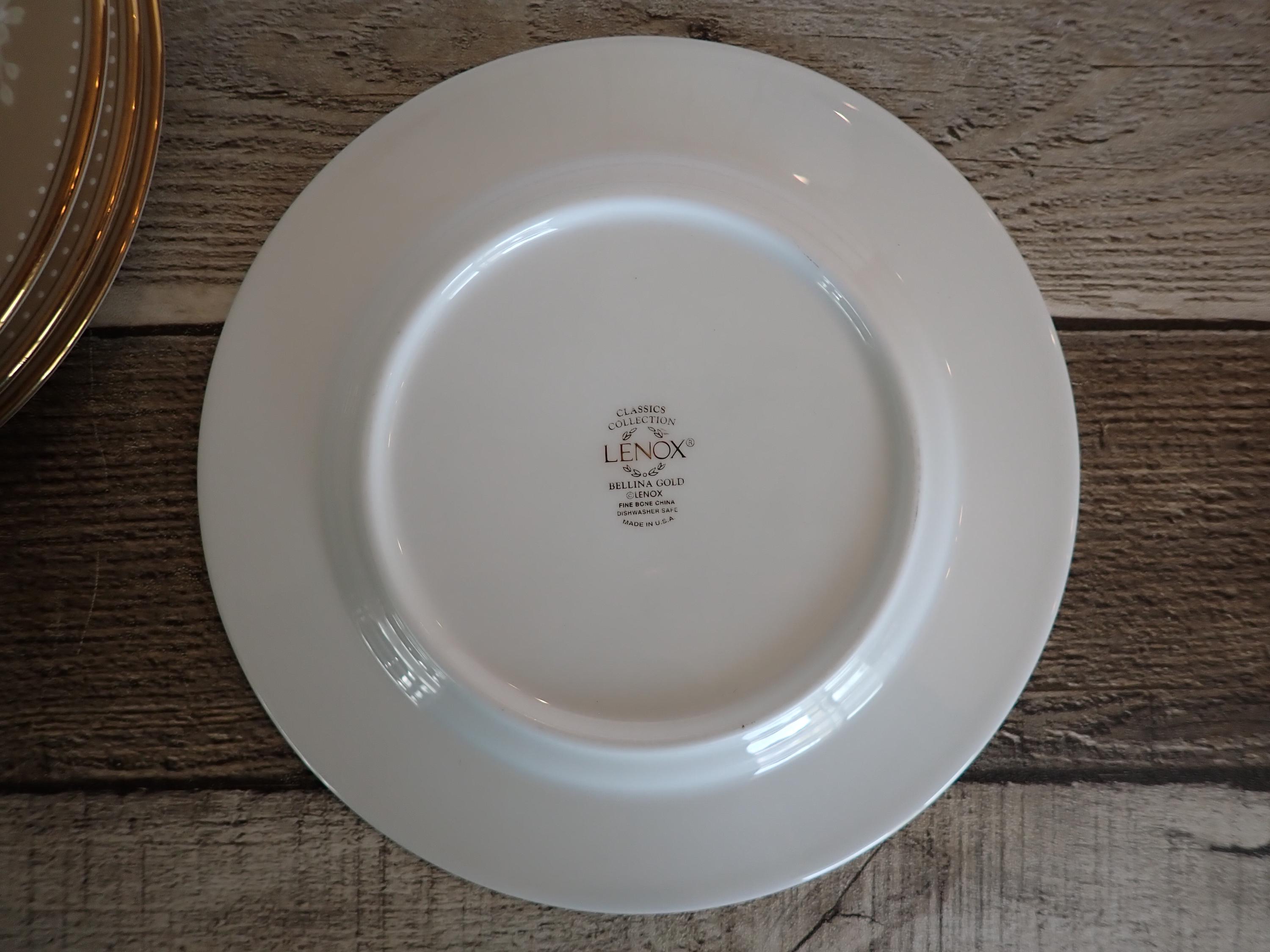 This set of 4 bread plates by Lenox is in the Bellina Gold pattern and are 6.65" in diameter. The plates are white with a tan band around the rim - in this tan band are small snite flowers. The rim of the plate is accented with a gold band. The bottoms are marked: CLASSICS COLLECTION / LENOX / BELLINA GOLD / LENOX FINE BONE CHINA / DISHWASHER SAFE / MADE IN USA. All 4 plates are in very good condition with no chips or cracks. All of the graphics are bright and clear.