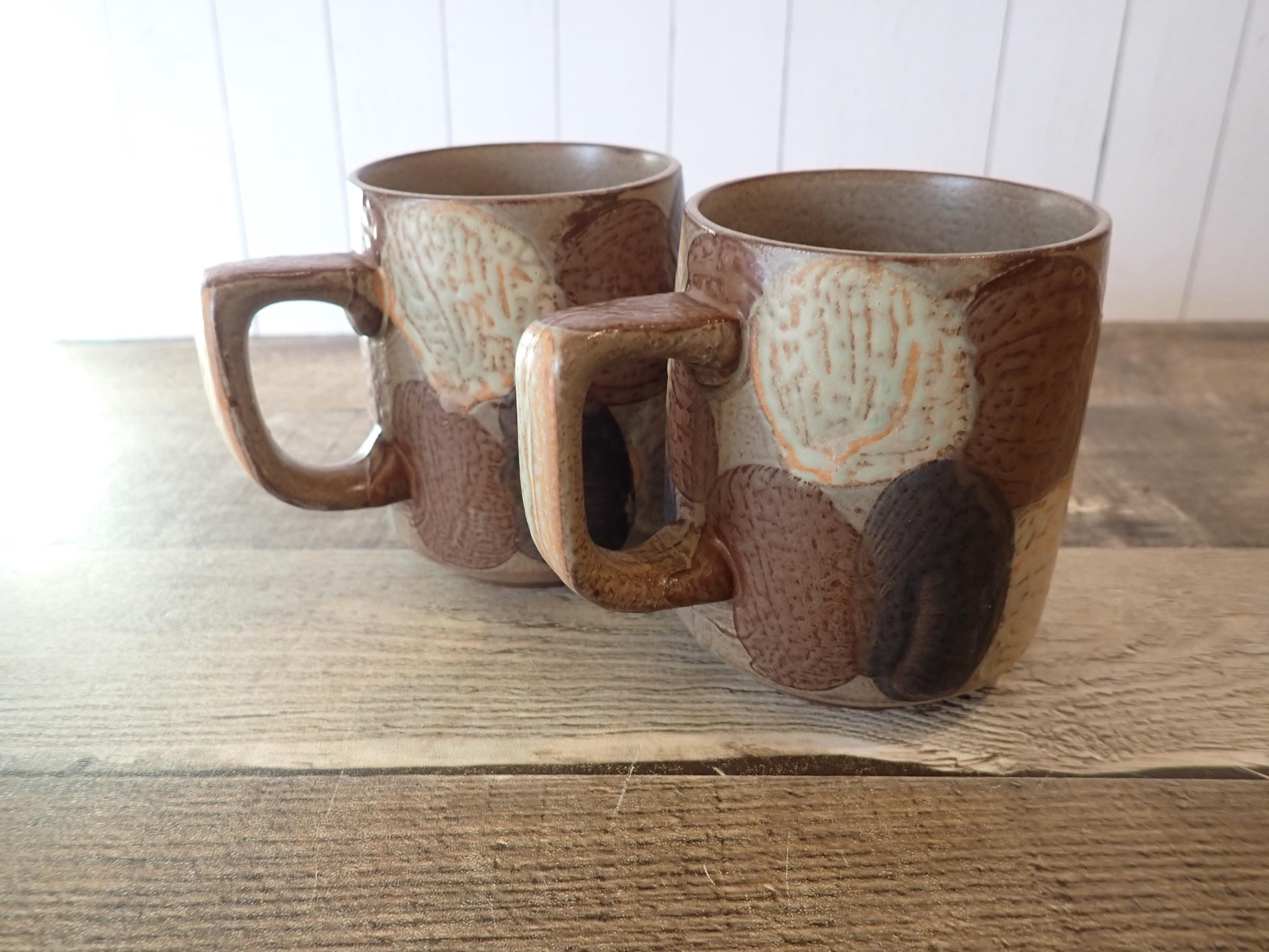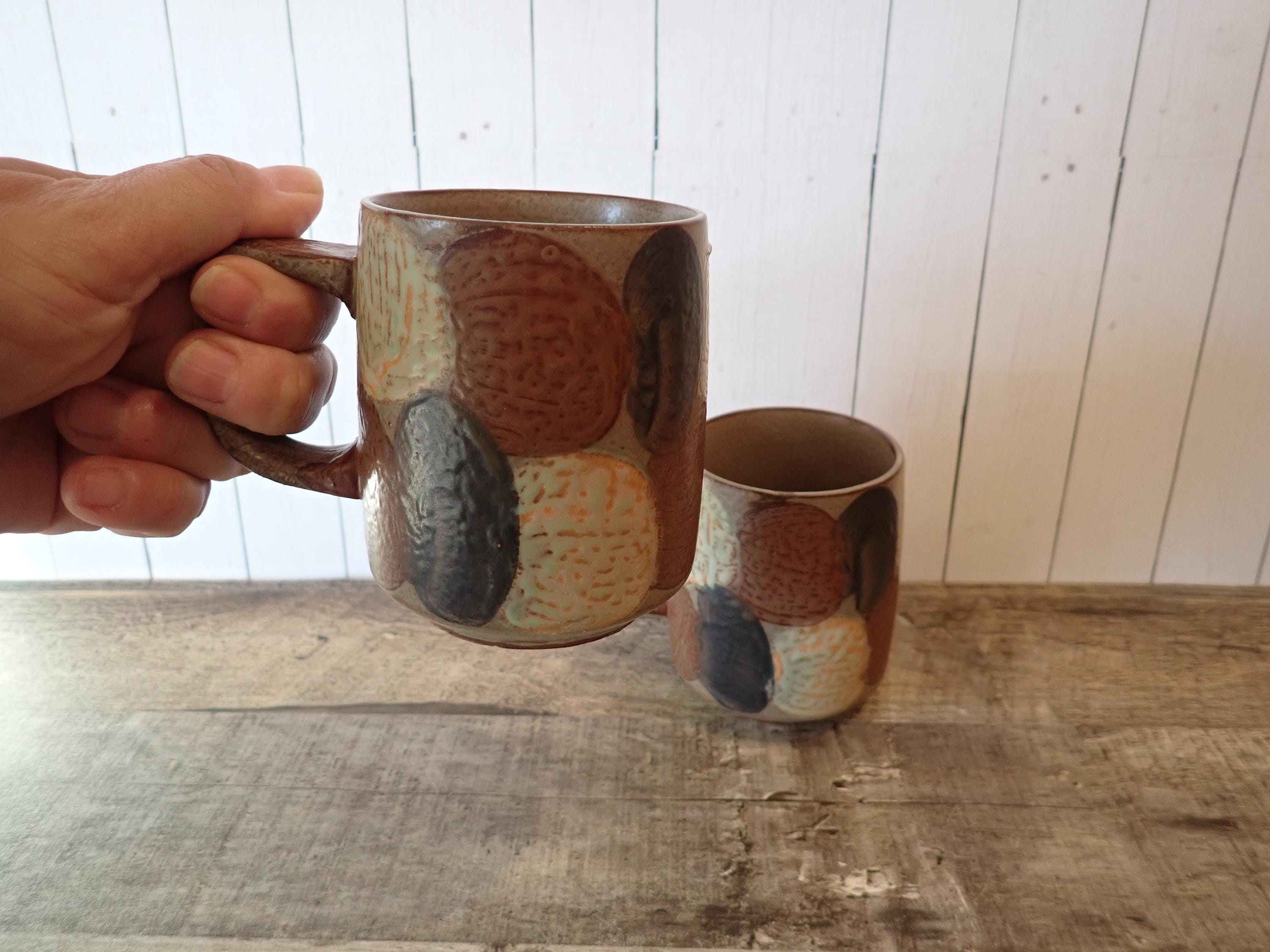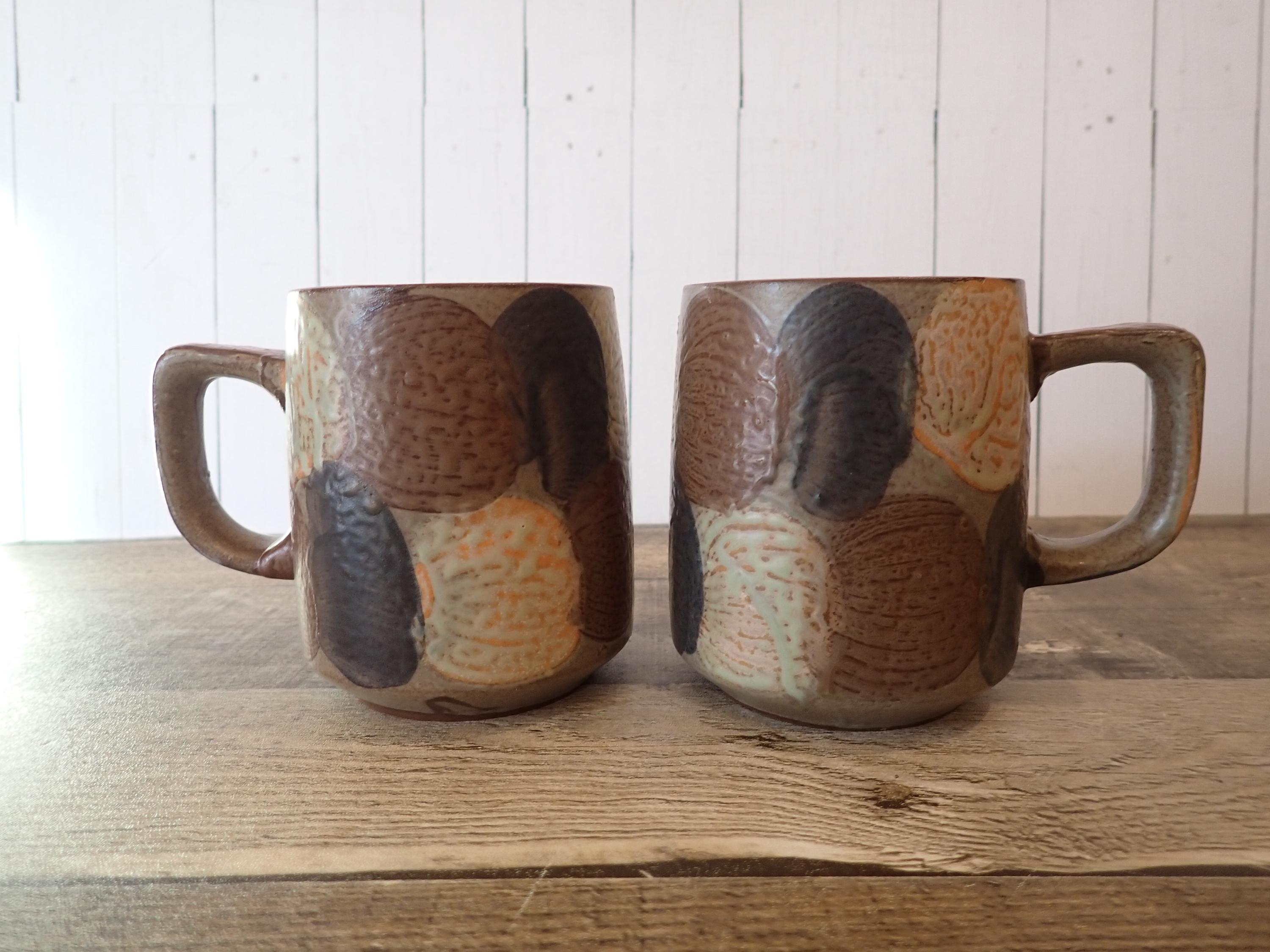 This set of mugs includes 2 matching brown stoneware mugs with a white and blue dot or circle designs. The mugs are 3.75" tall and 3" in diameter, and are 4.75" wide with the handle. The mugs have the dot pattern all of the way around the mug. There are no makers marks on these mugs. Both of the mugs are in very good condition, with no chips or cracks. There is a small production flaw on the front of one mug as shown in the last photo.