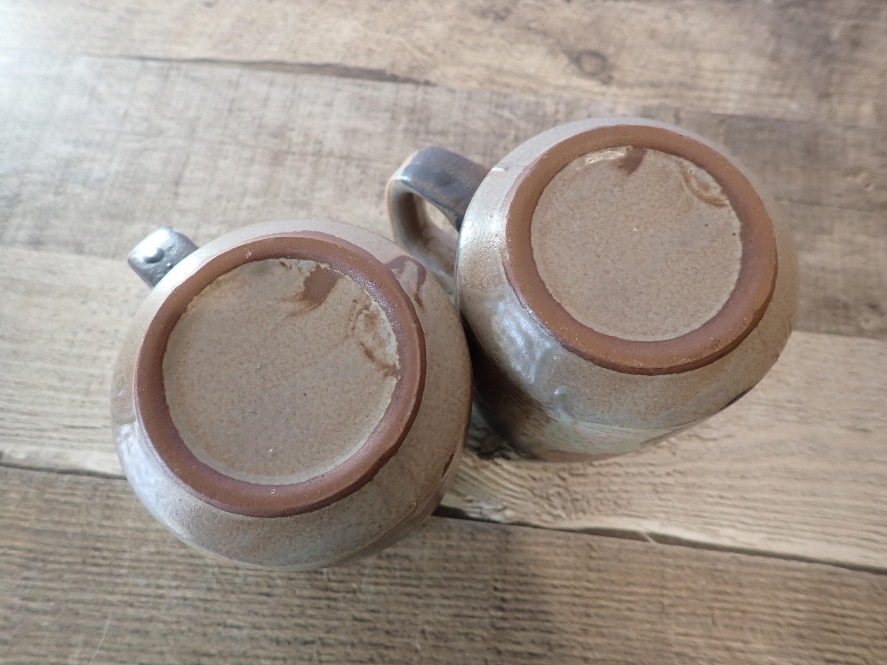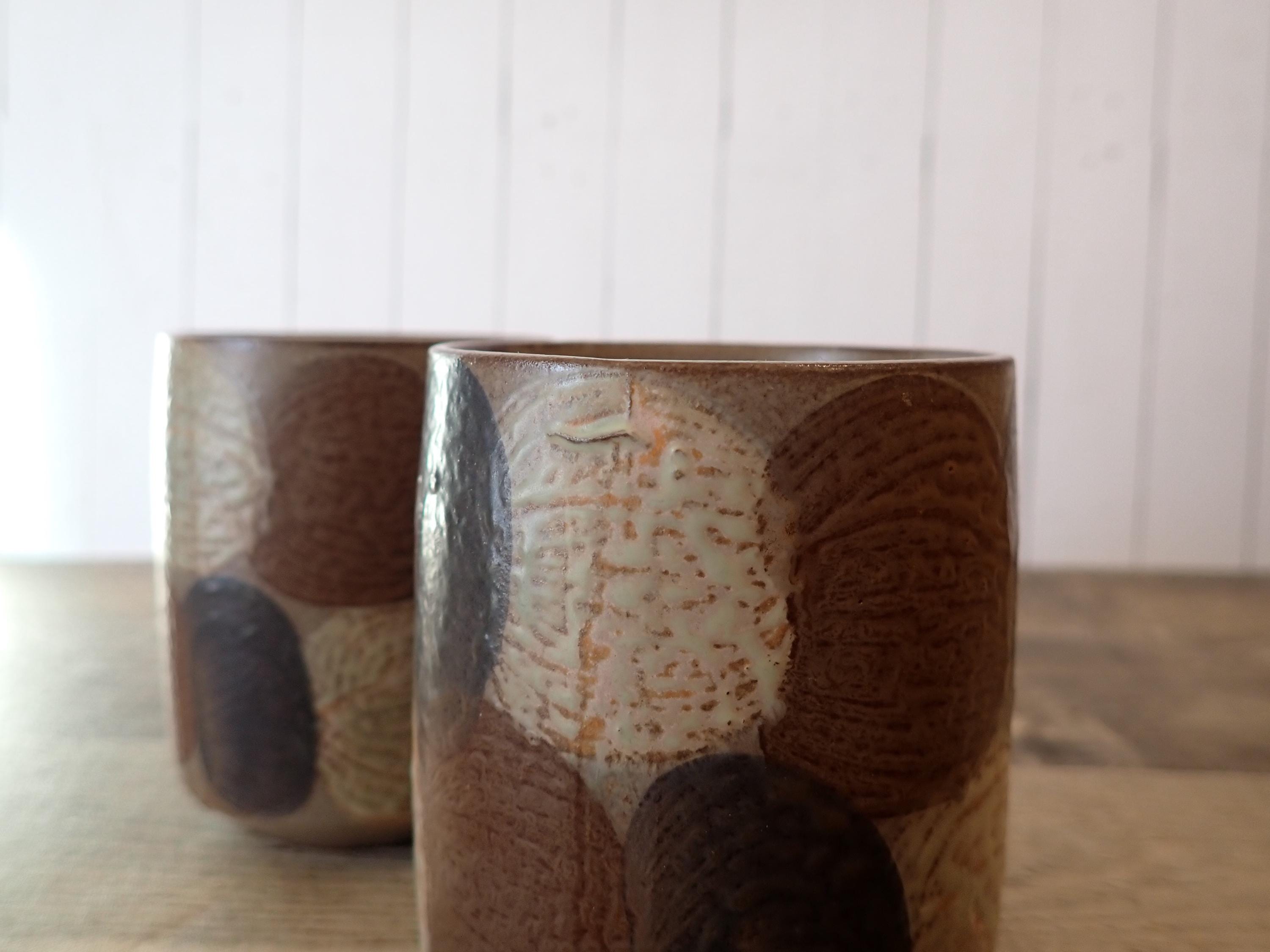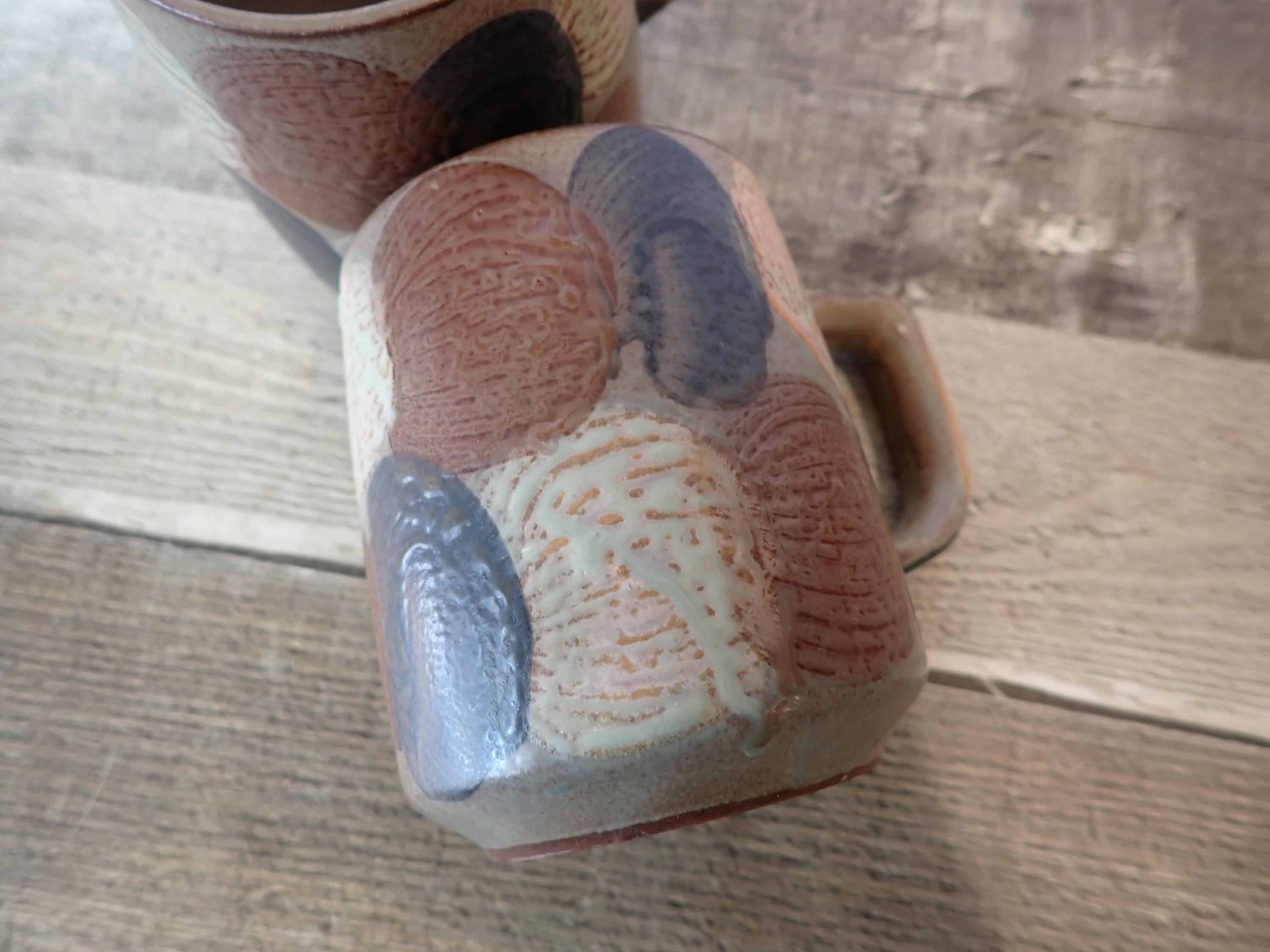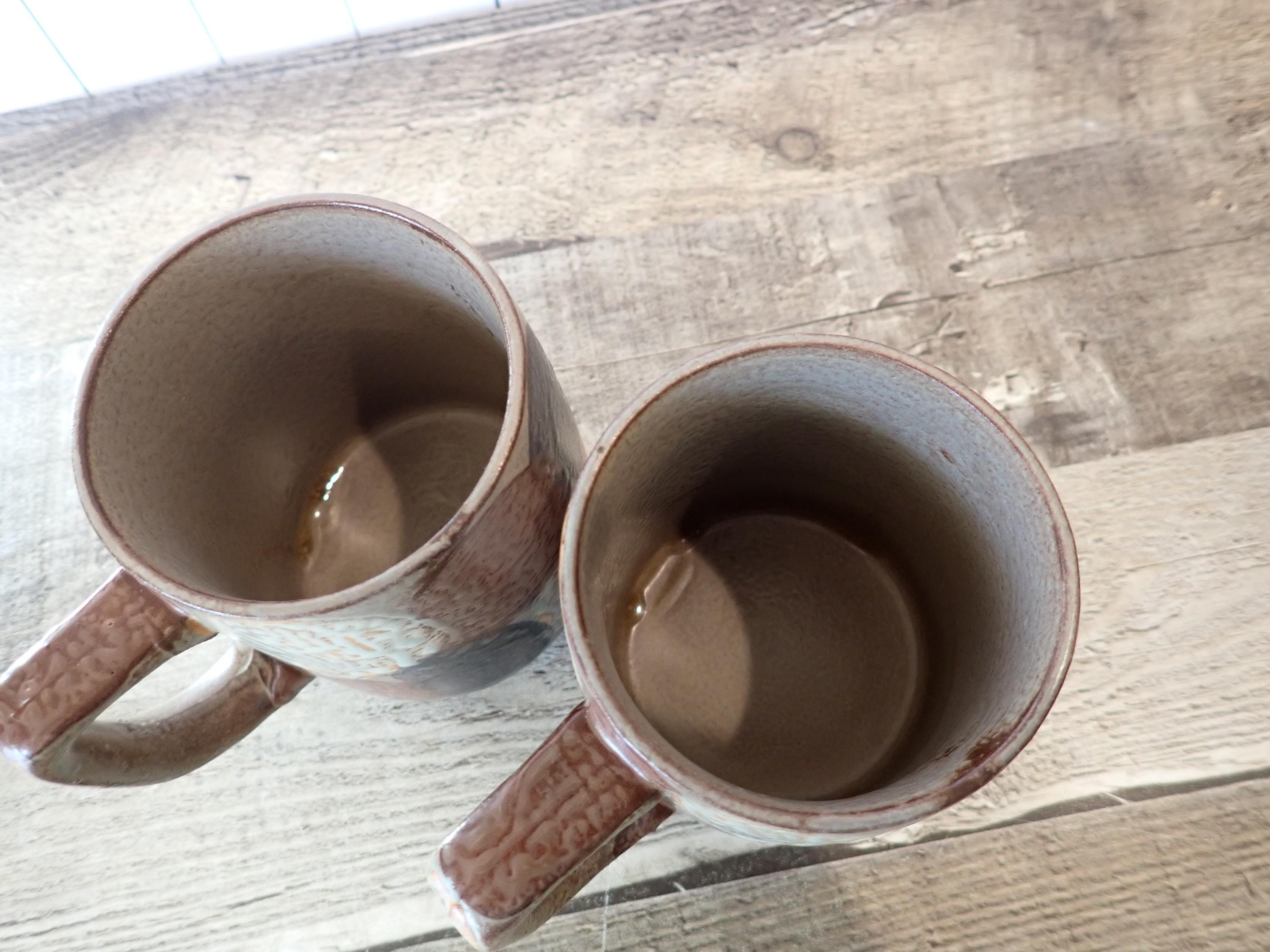 This set of mugs includes 2 matching brown stoneware mugs with a white and blue dot or circle designs. The mugs are 3.75" tall and 3" in diameter, and are 4.75" wide with the handle. The mugs have the dot pattern all of the way around the mug. There are no makers marks on these mugs. Both of the mugs are in very good condition, with no chips or cracks. There is a small production flaw on the front of one mug as shown in the last photo.