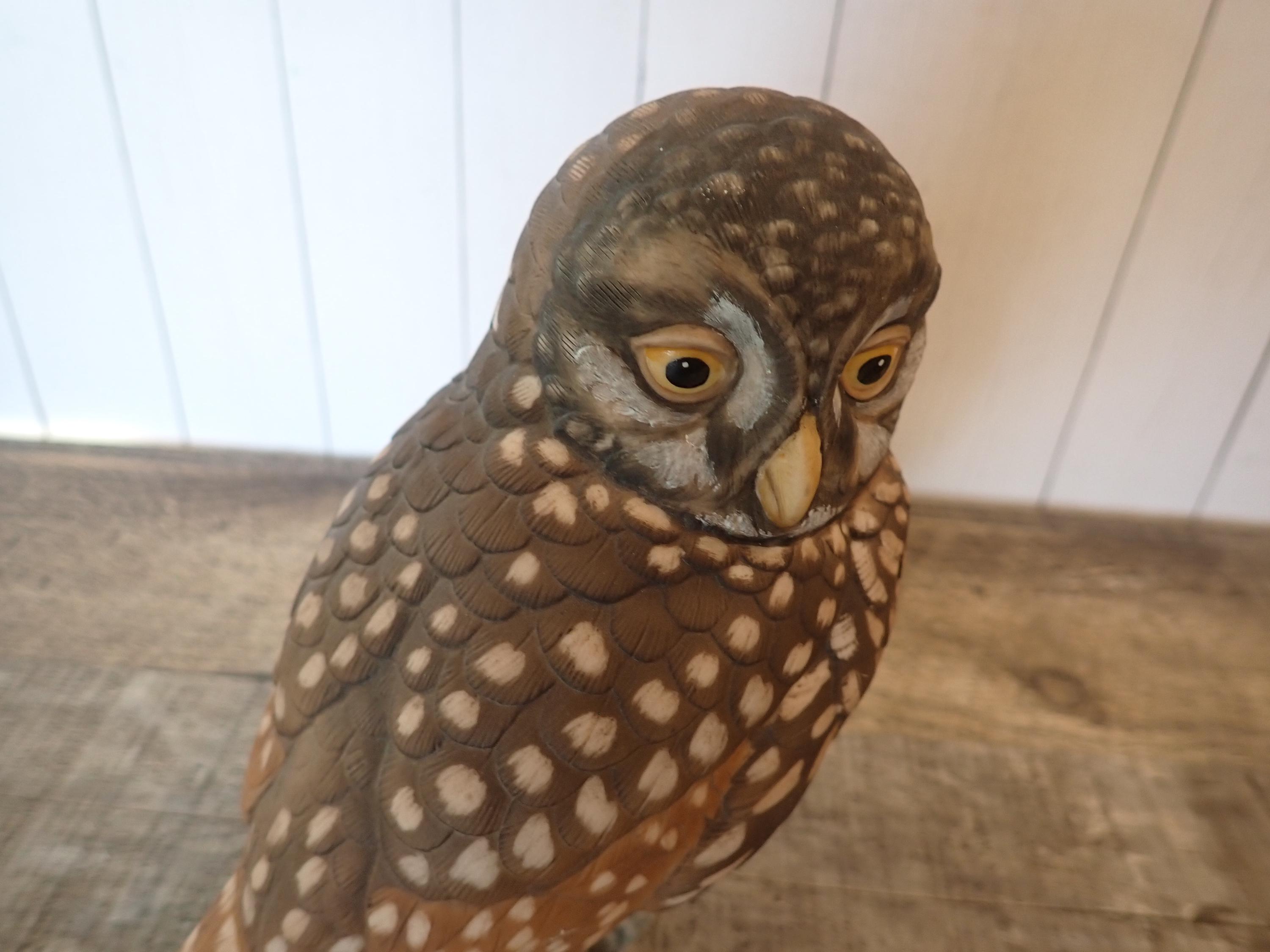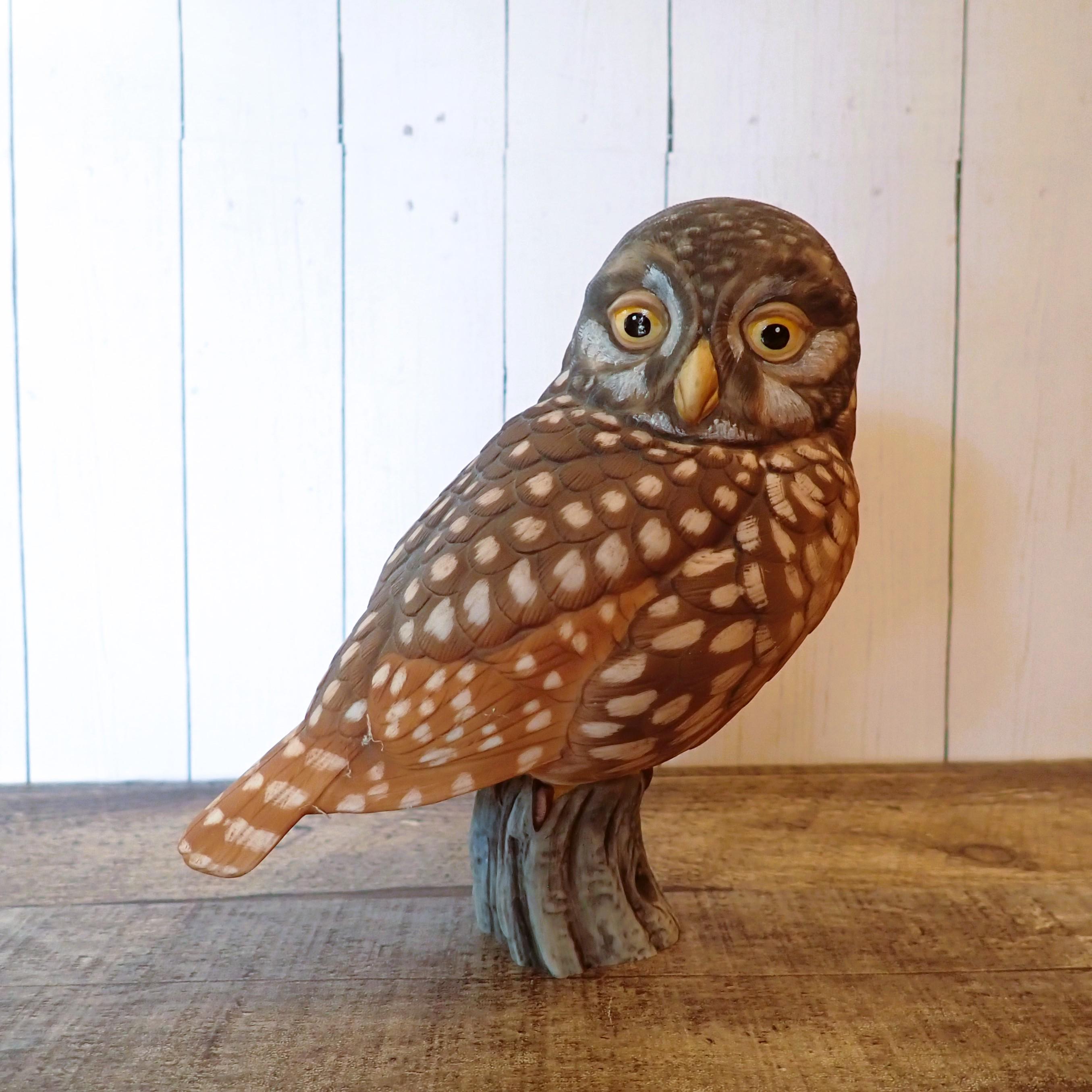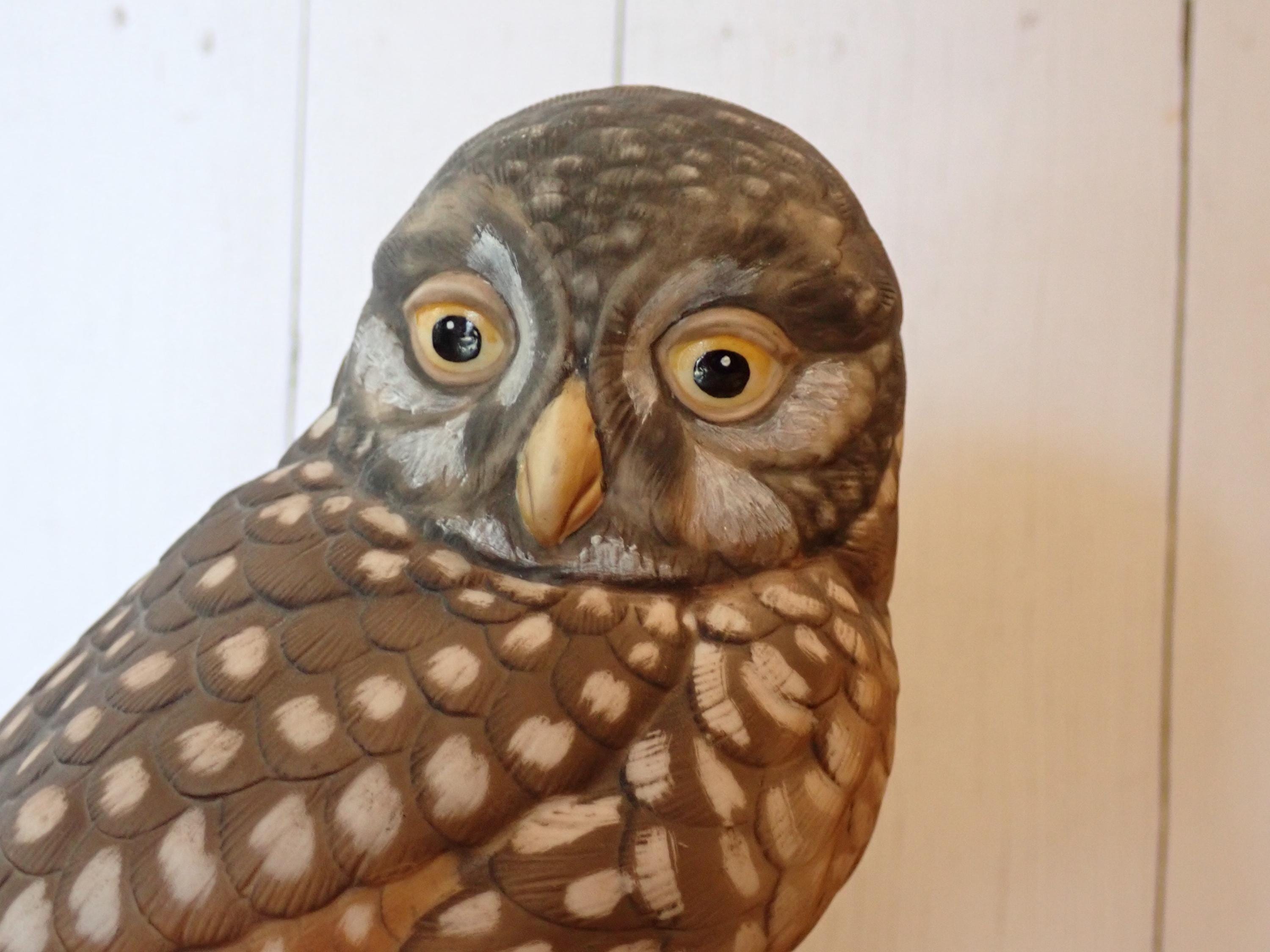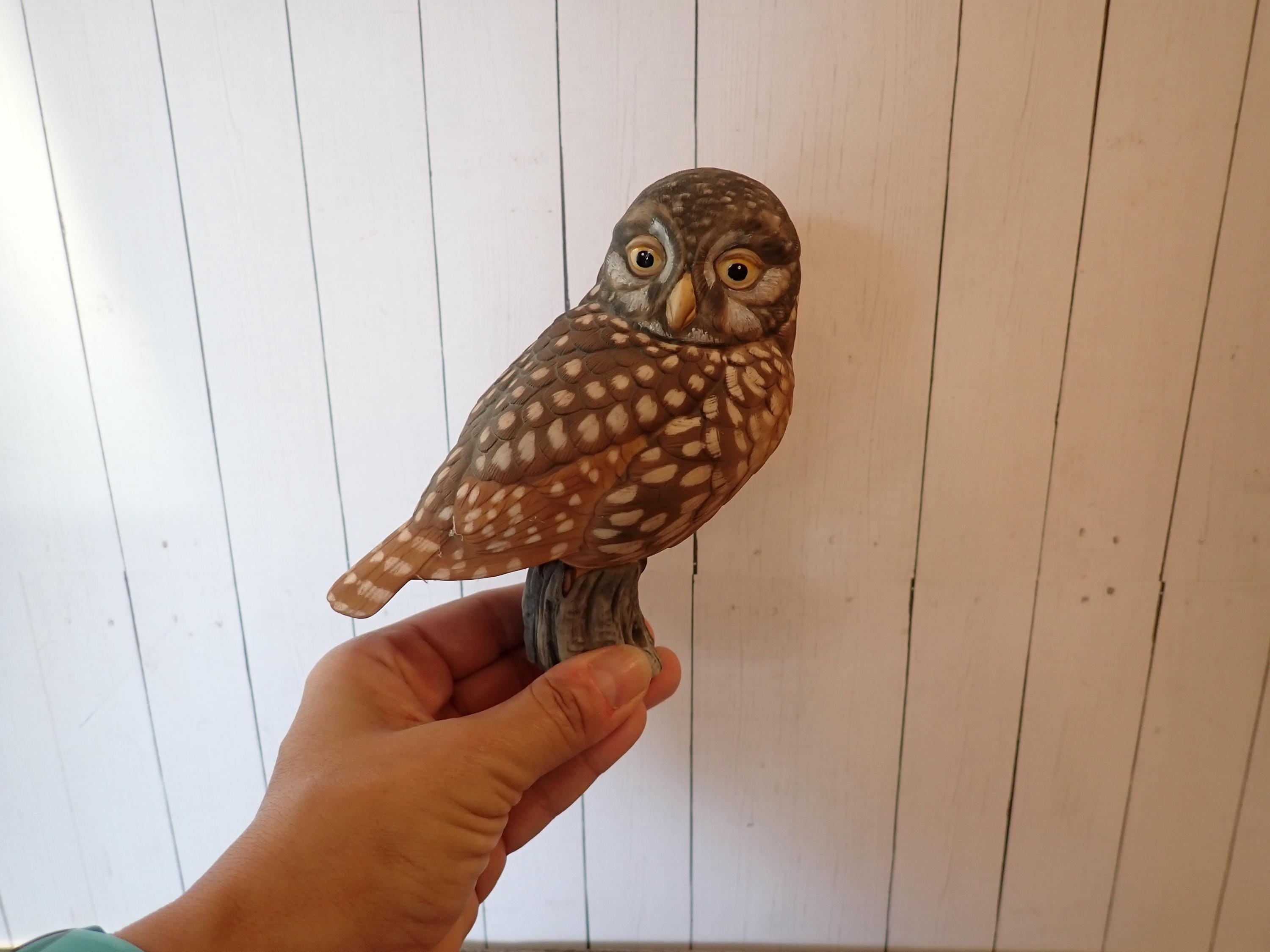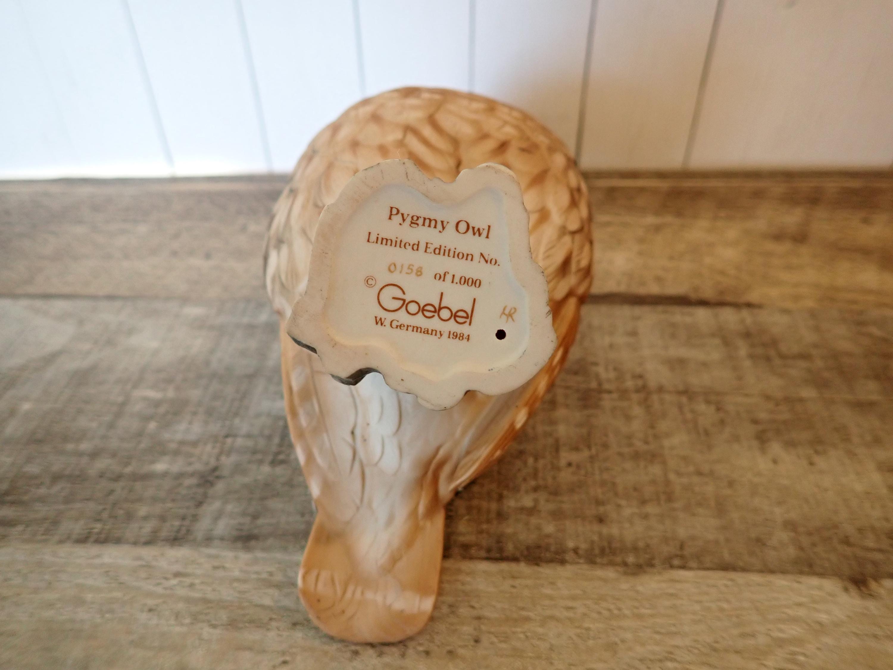 This ceramic owl figurine by Goebel is the 1984 Pygmy Owl. It is 5.5" tall, 5" wide, and 3.5" deep. It is a brown and tan piece and is nicely detailed with etched feathers on the owl's body. The owl has black eyes and sits perched on a branch. The bottom is marked: Pygmy Owl / LIMITED EDITION / 158 of 1000 / GOEBEL / W. Germany 1984. The owl is in very good condition with no chips or cracks.