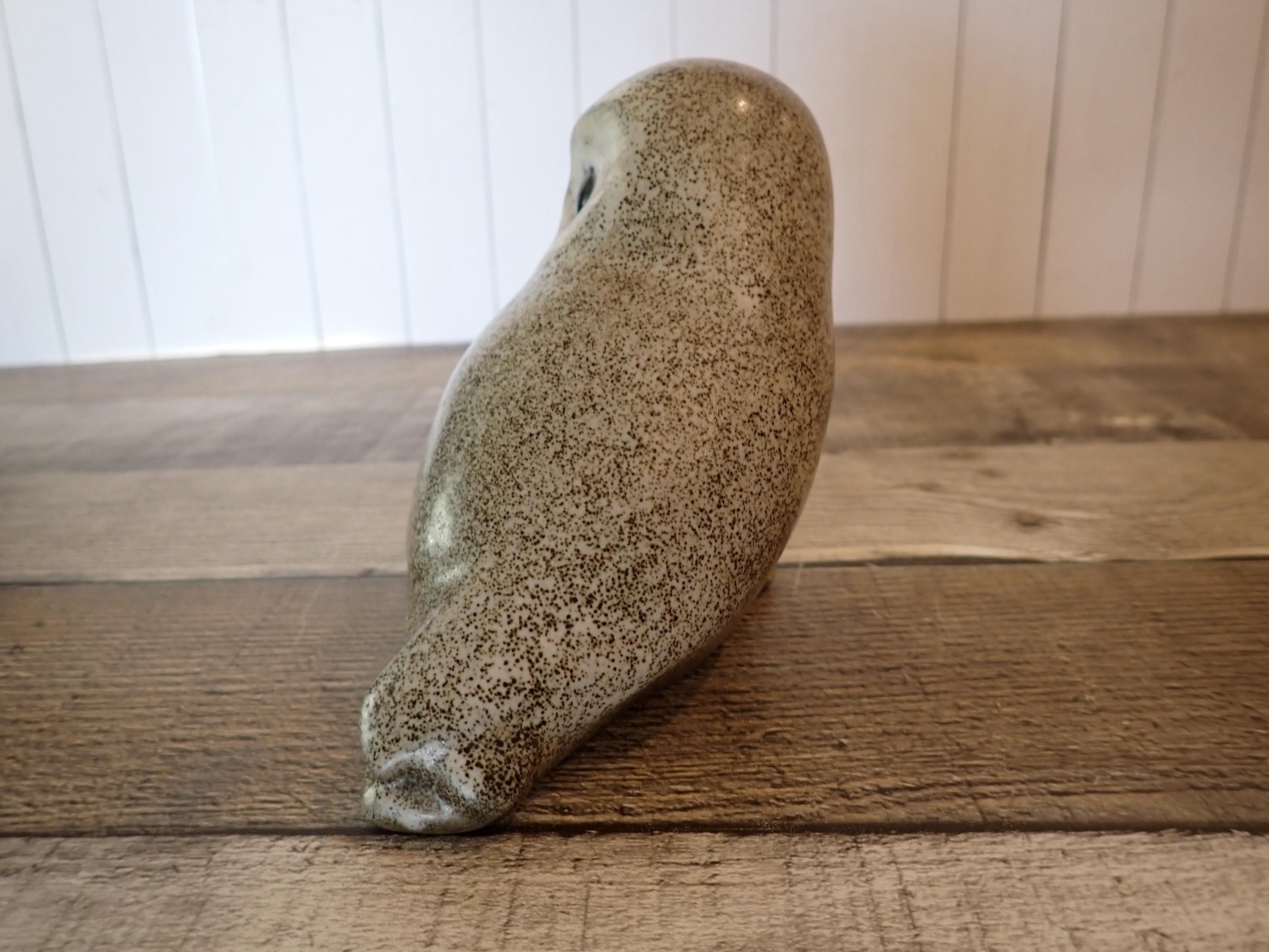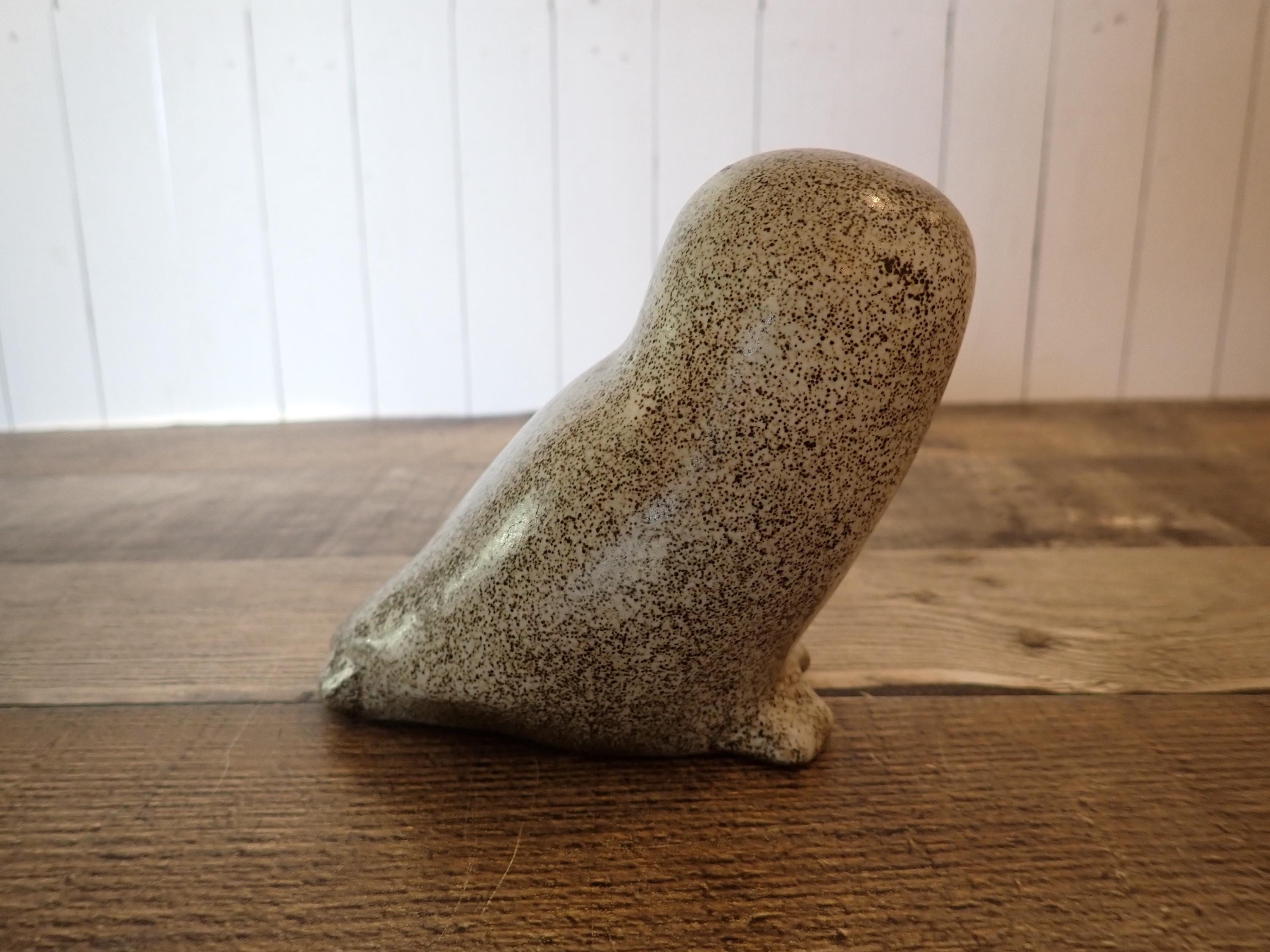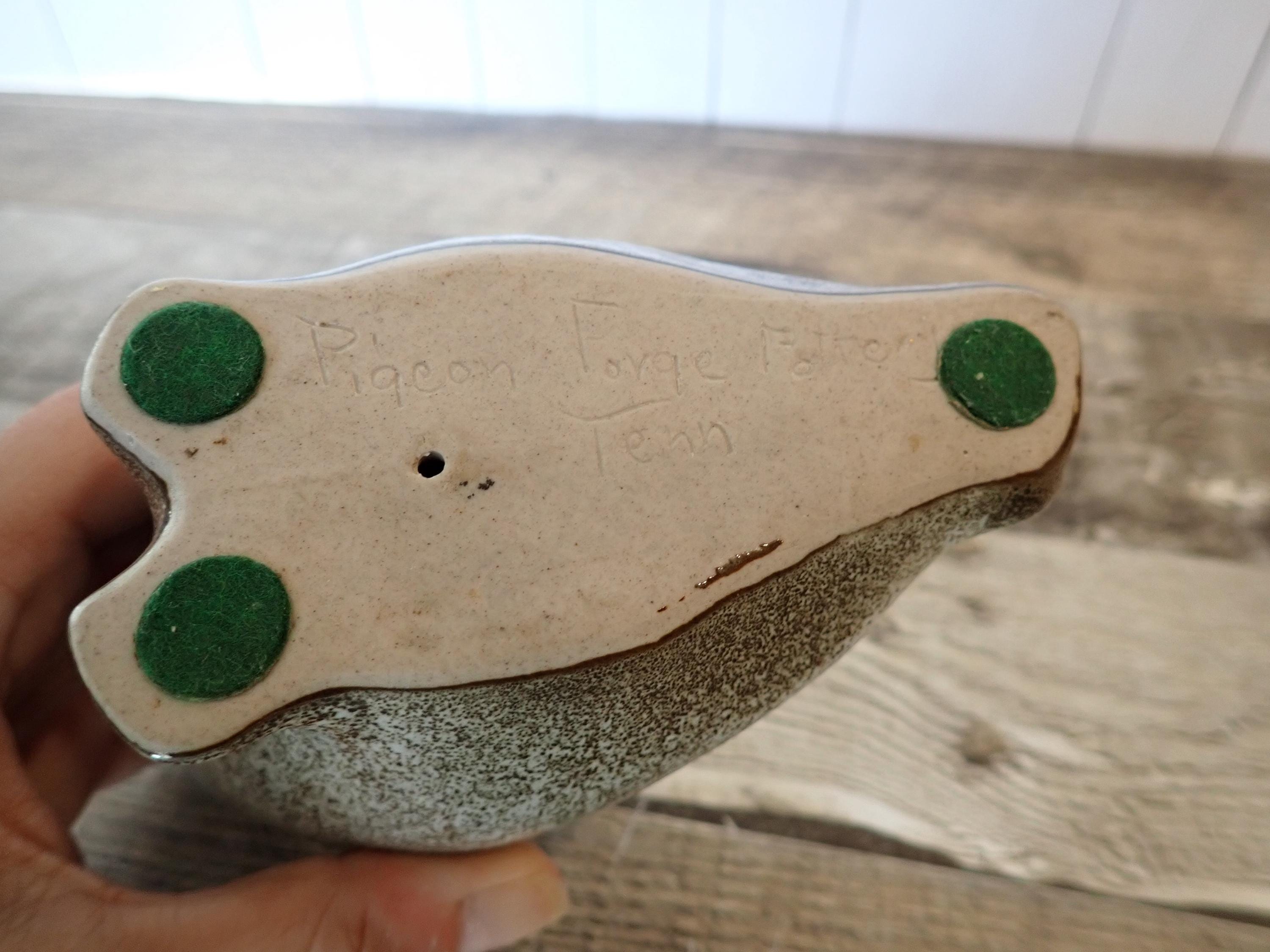 This owl figurine by Pigeon Forge Pottery is a gray , white and black pottery piece. The owl is 5" long, 25" wide, and 4.5" tall. The bottom is marked: PIGEON FORGE POTTERY TENN. The owl is in very good condition with no chip or cracks.