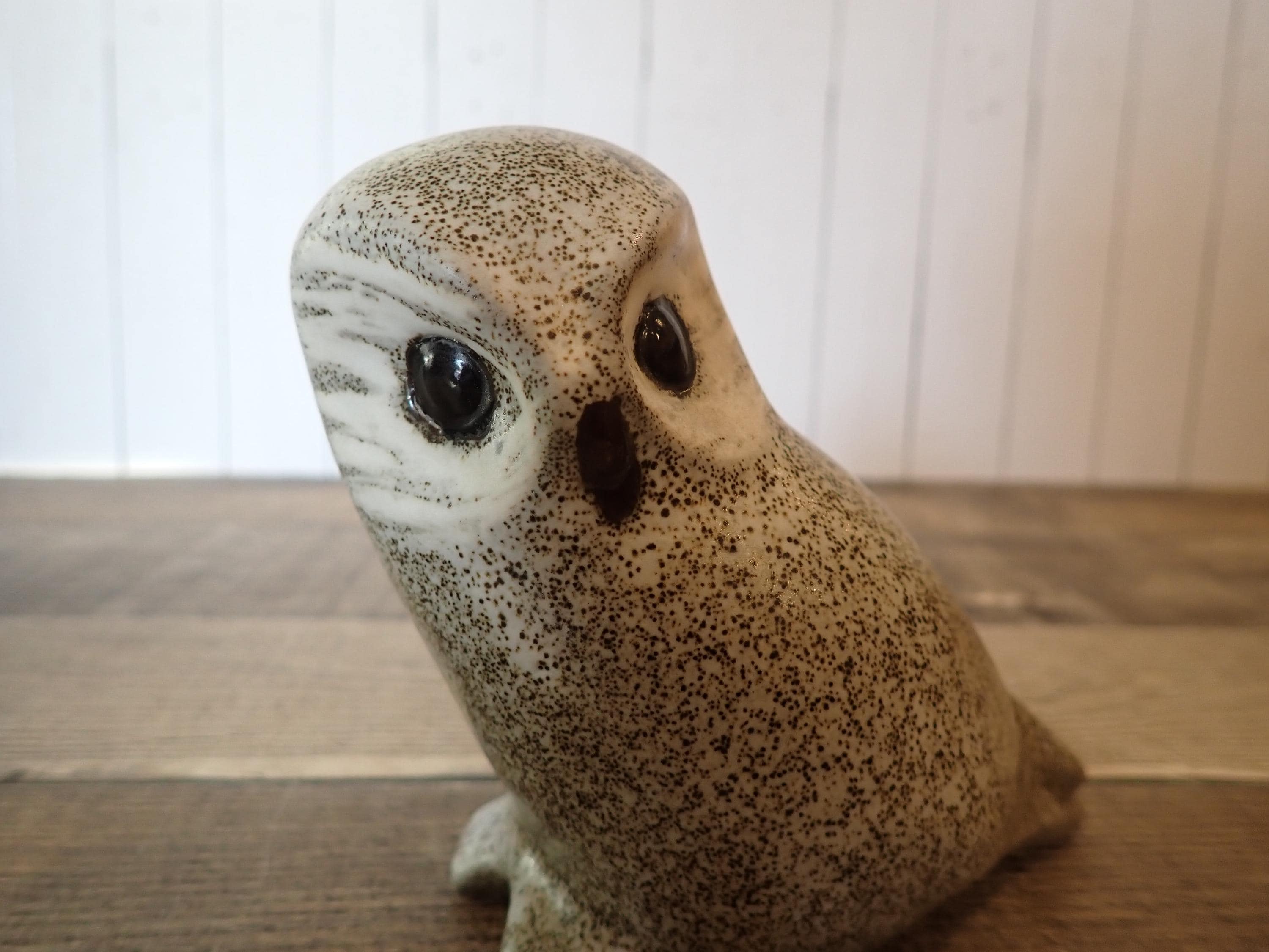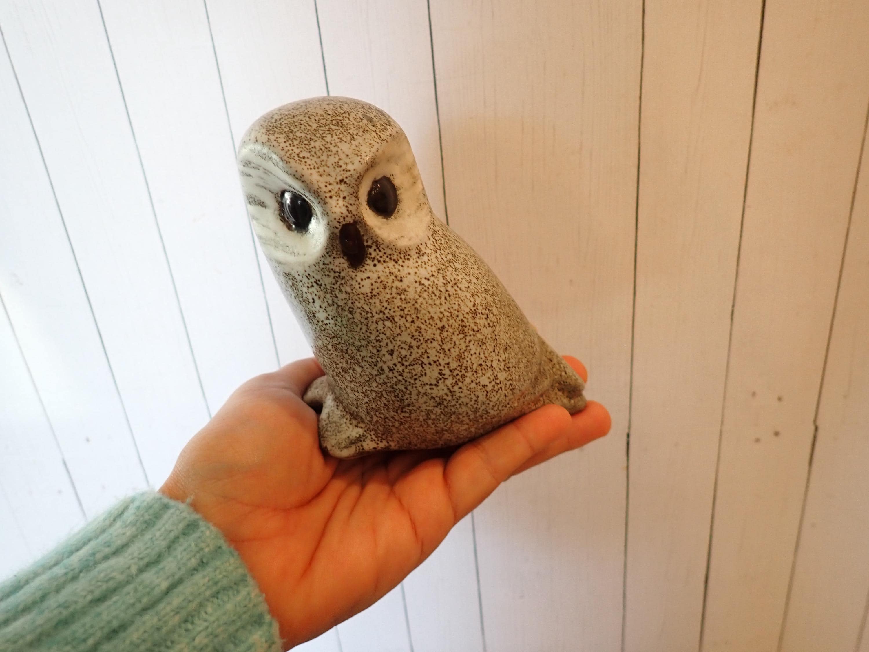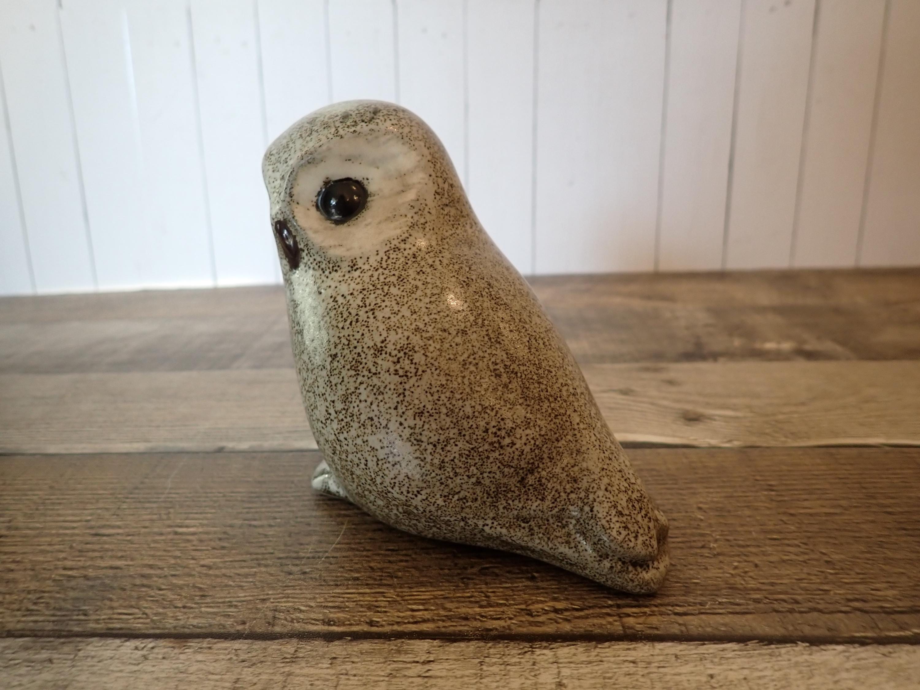 This owl figurine by Pigeon Forge Pottery is a gray , white and black pottery piece. The owl is 5" long, 25" wide, and 4.5" tall. The bottom is marked: PIGEON FORGE POTTERY TENN. The owl is in very good condition with no chip or cracks.
