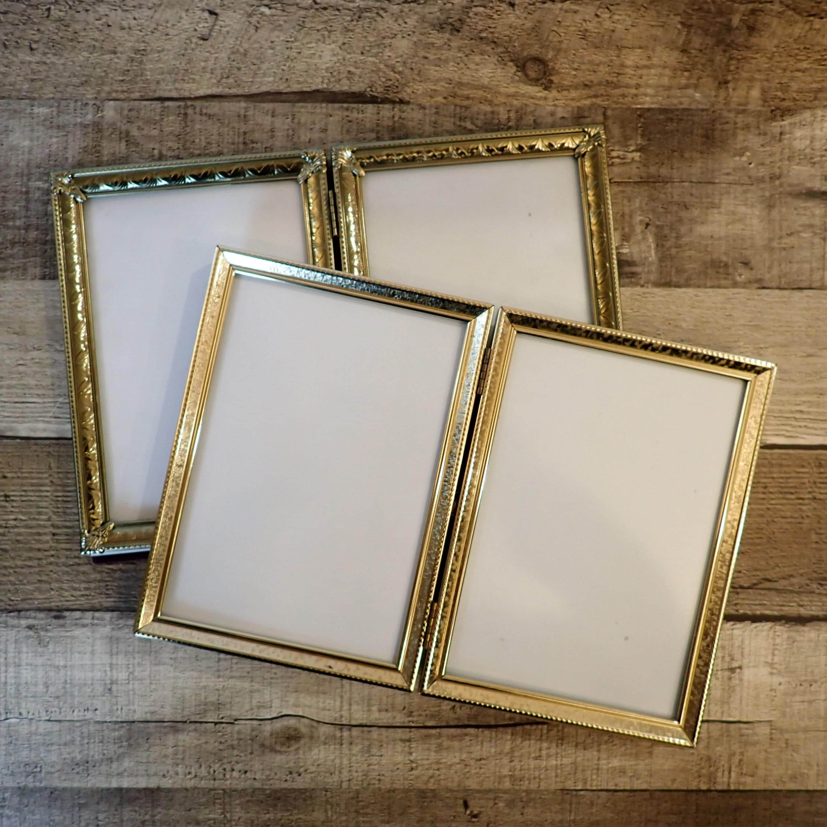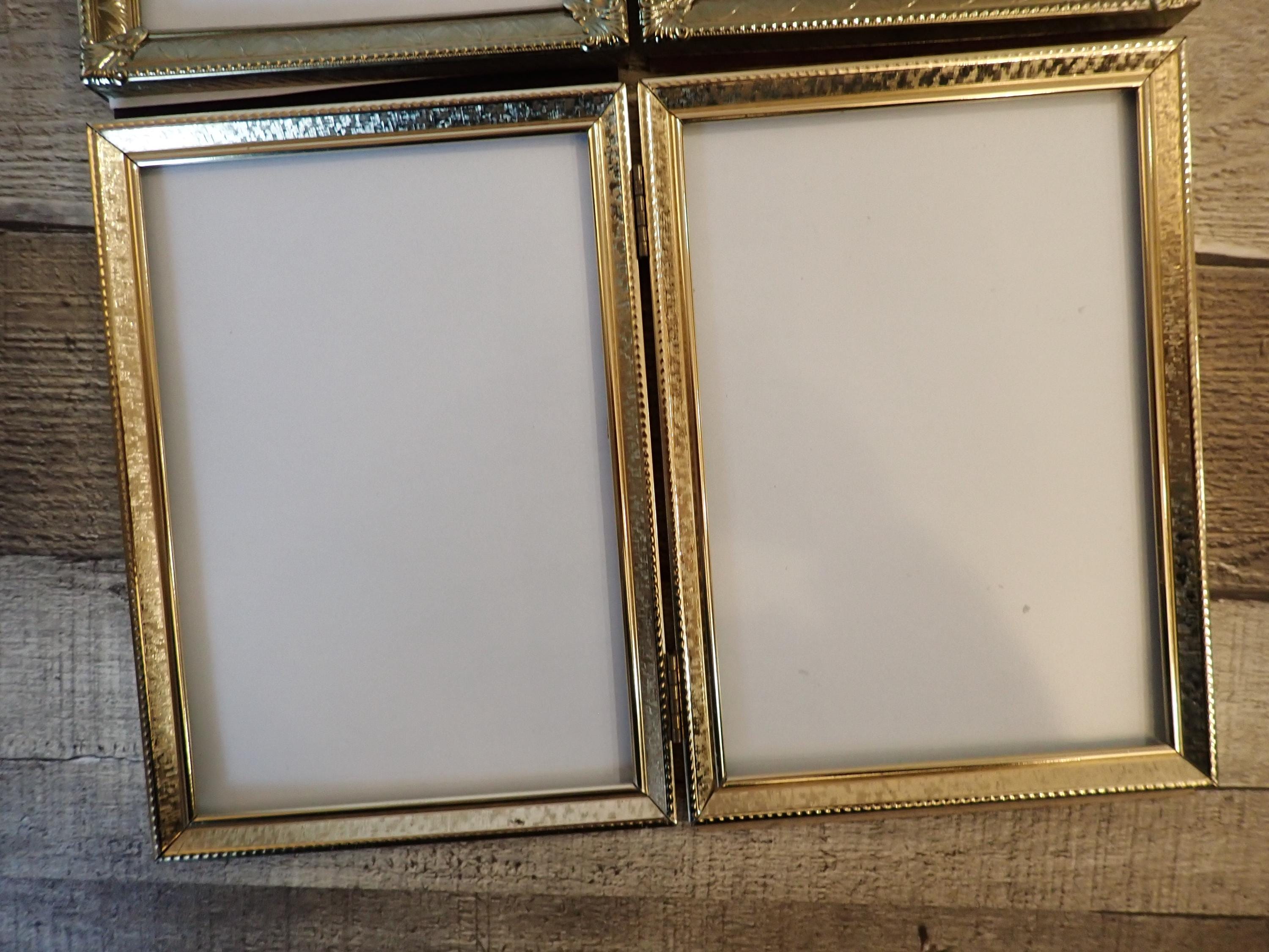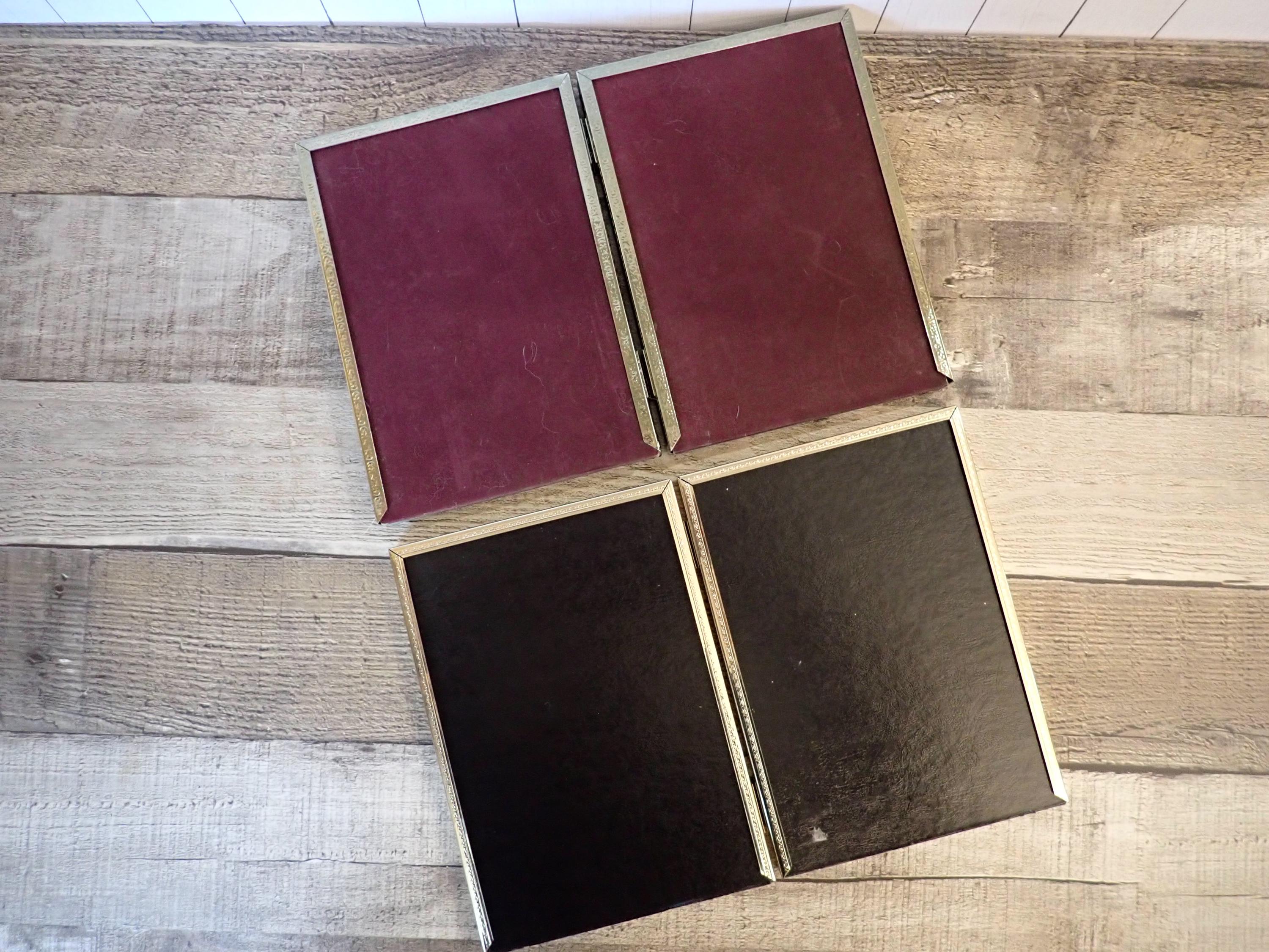 This set of brass colored metal frames includes two 5x7 double hinged frames, in two different designs and patterns. They are both a golden brass colored metal, and have nicely detailed designs around the edges. The overall dimensions of the frames are 10.25" wide by 7.25" tall. They each have a clear glass insert that covers the photo opening. There is some light tarnish on some of the frames here and there. Great set of vintage brass frames!