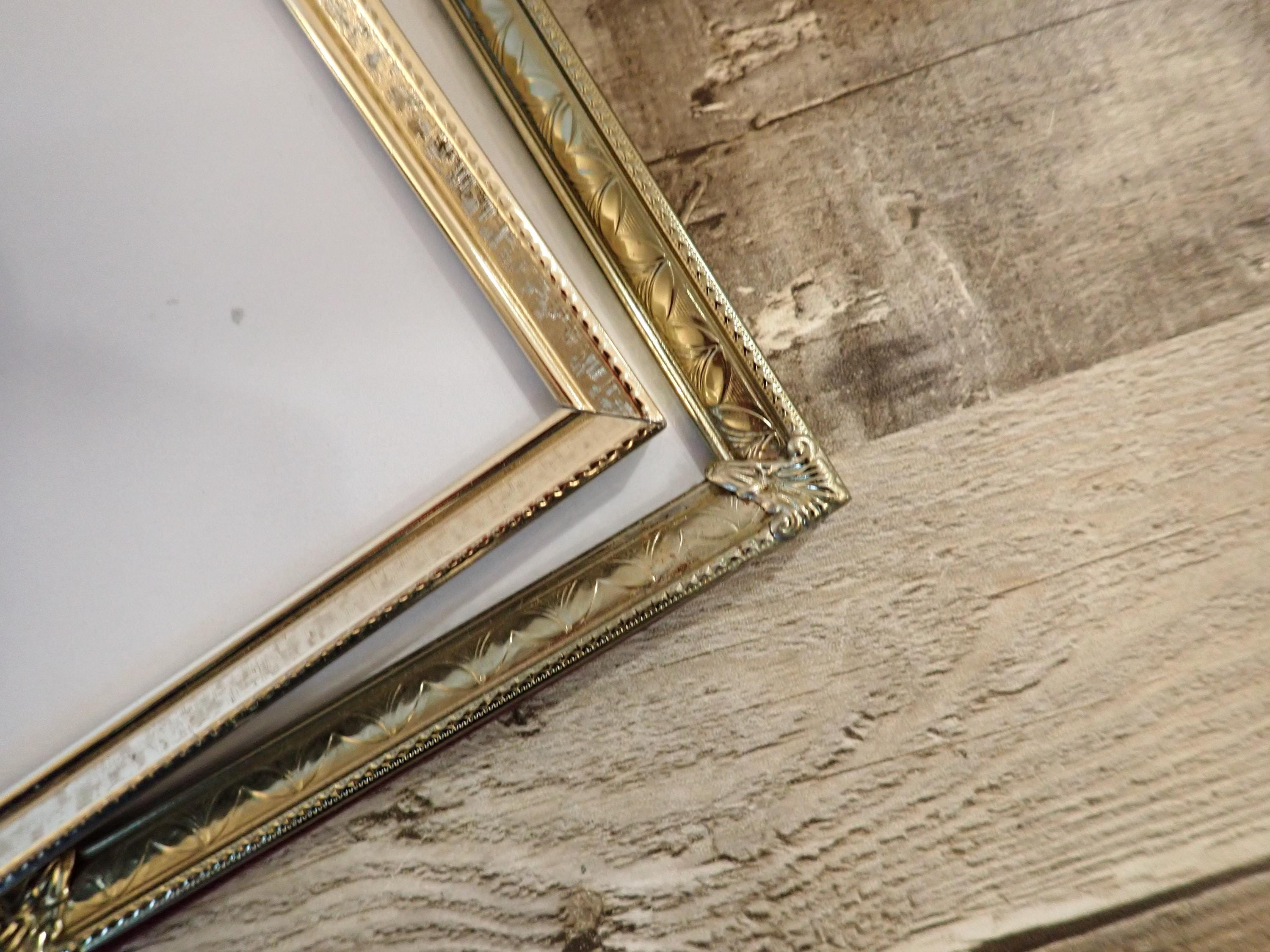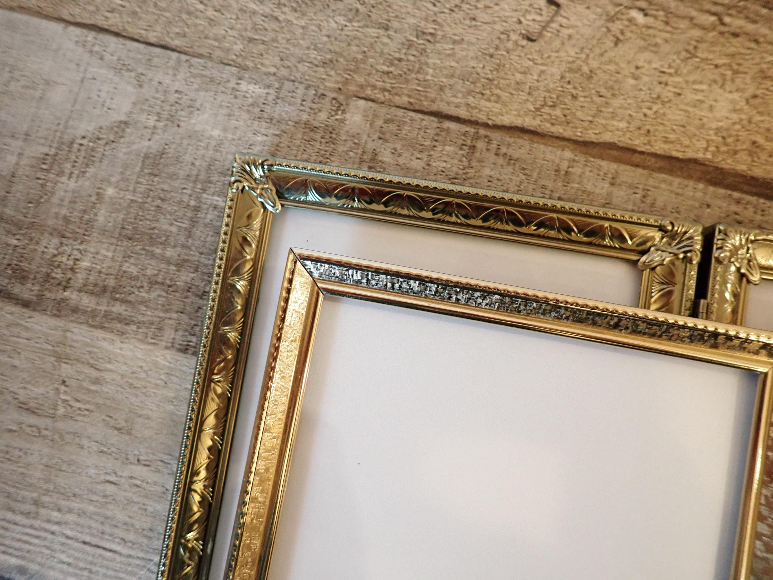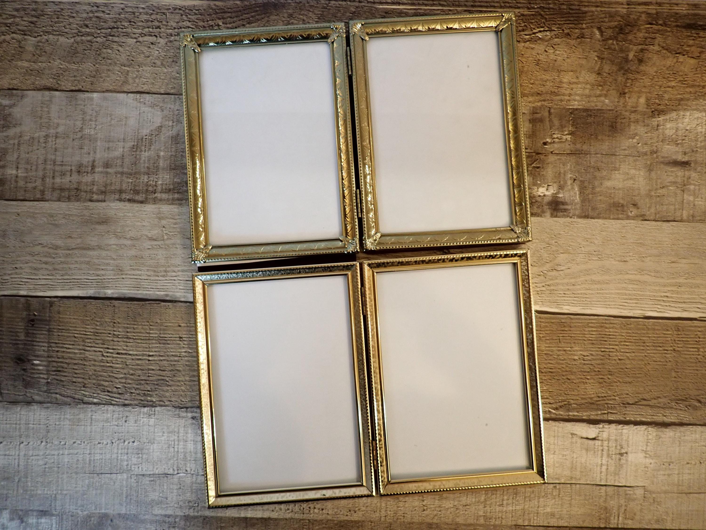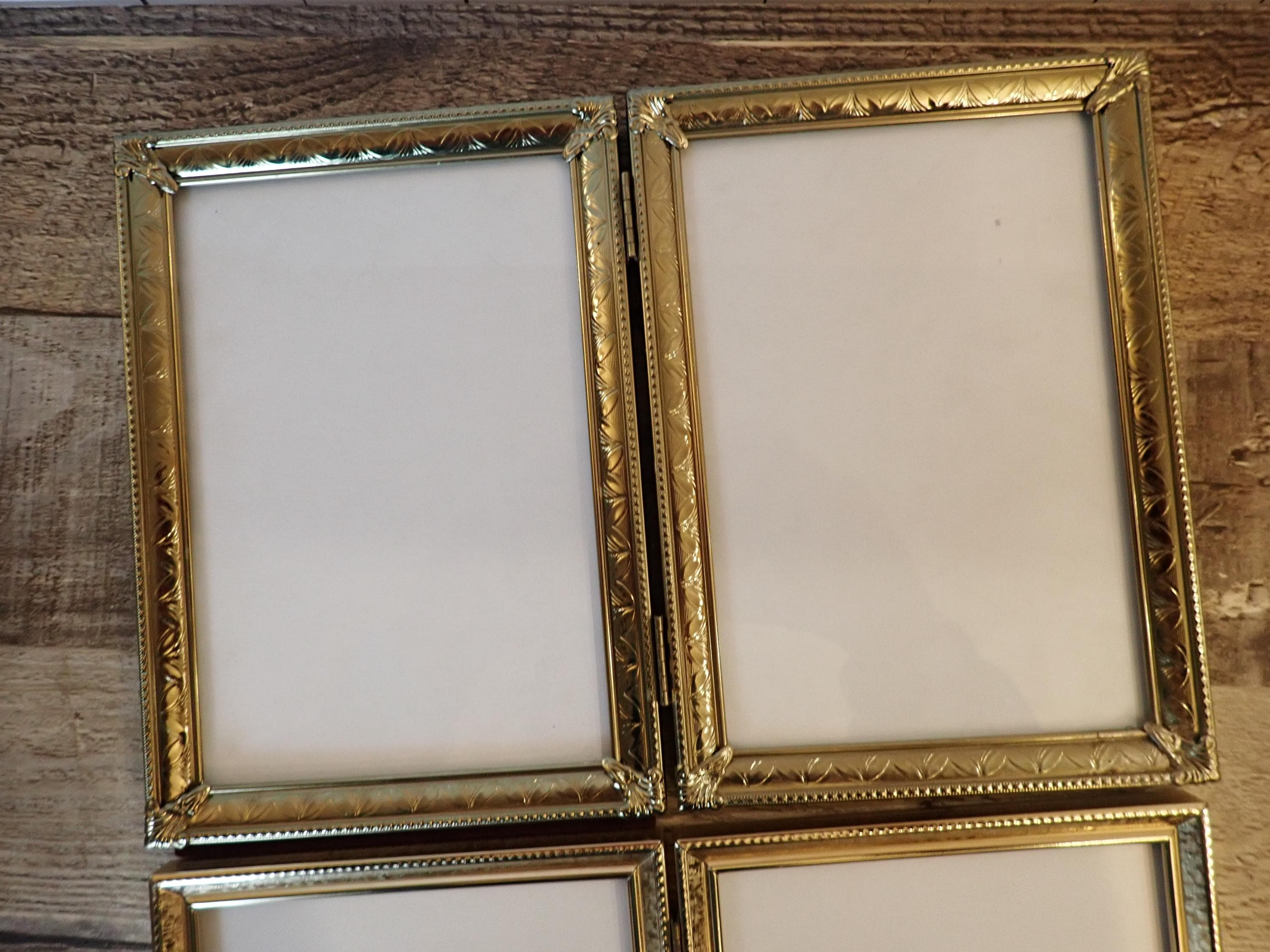 This set of brass colored metal frames includes two 5x7 double hinged frames, in two different designs and patterns. They are both a golden brass colored metal, and have nicely detailed designs around the edges. The overall dimensions of the frames are 10.25" wide by 7.25" tall. They each have a clear glass insert that covers the photo opening. There is some light tarnish on some of the frames here and there. Great set of vintage brass frames!