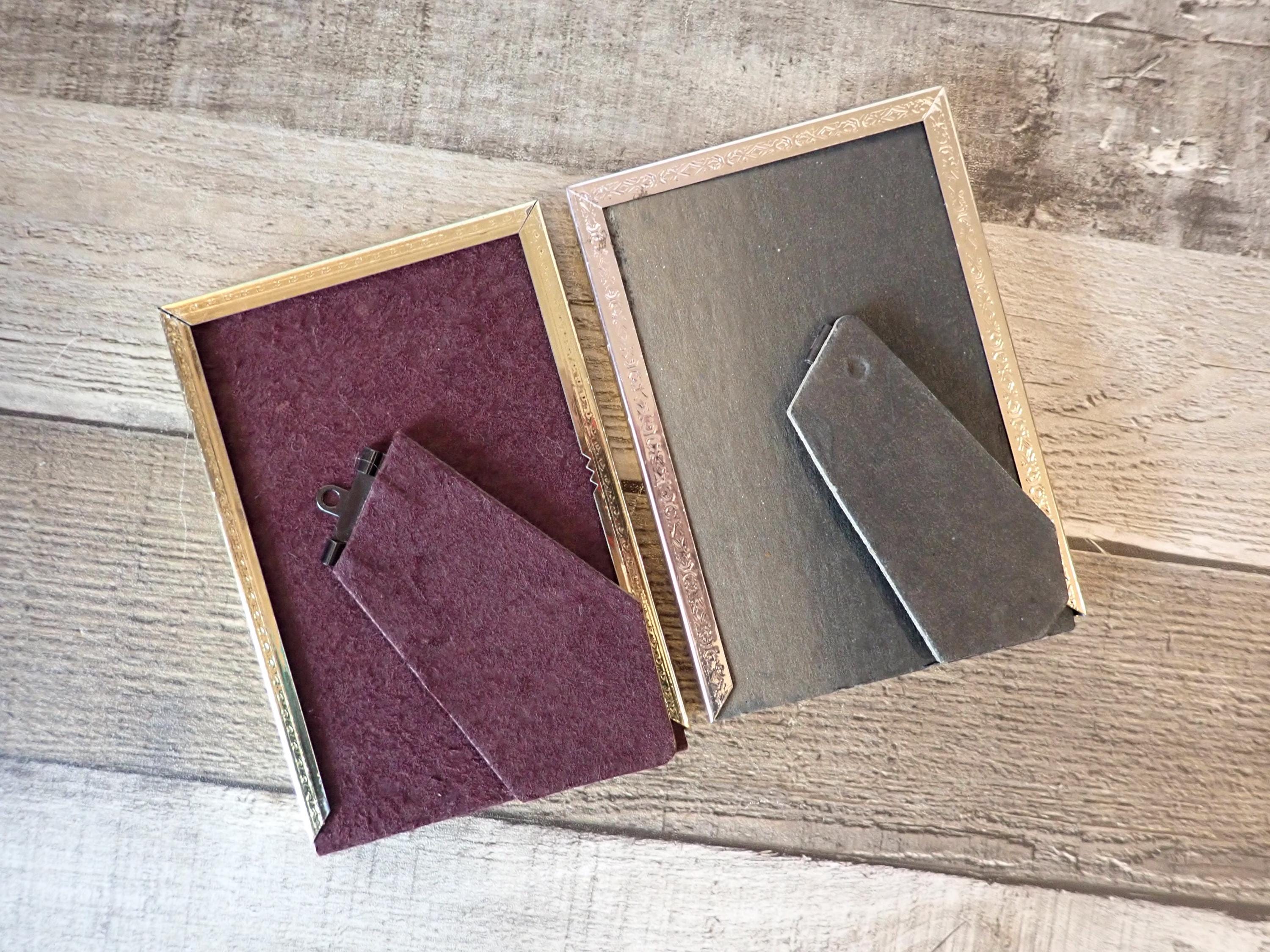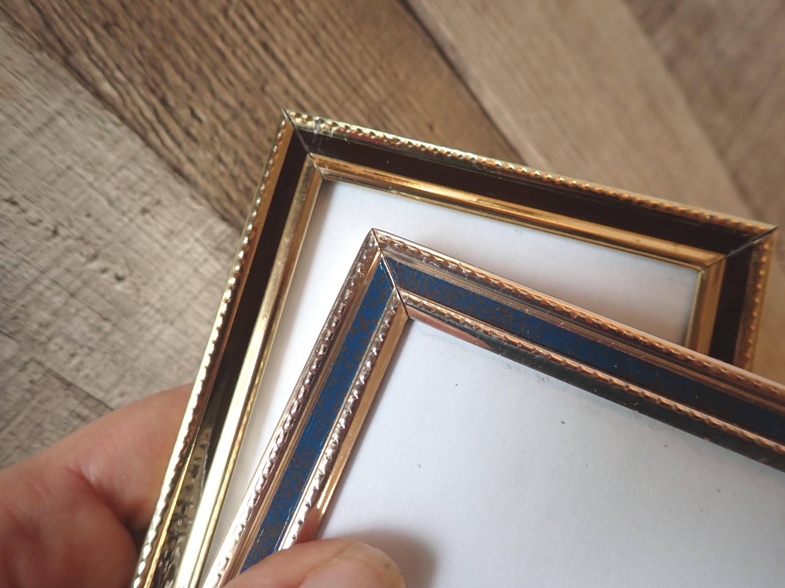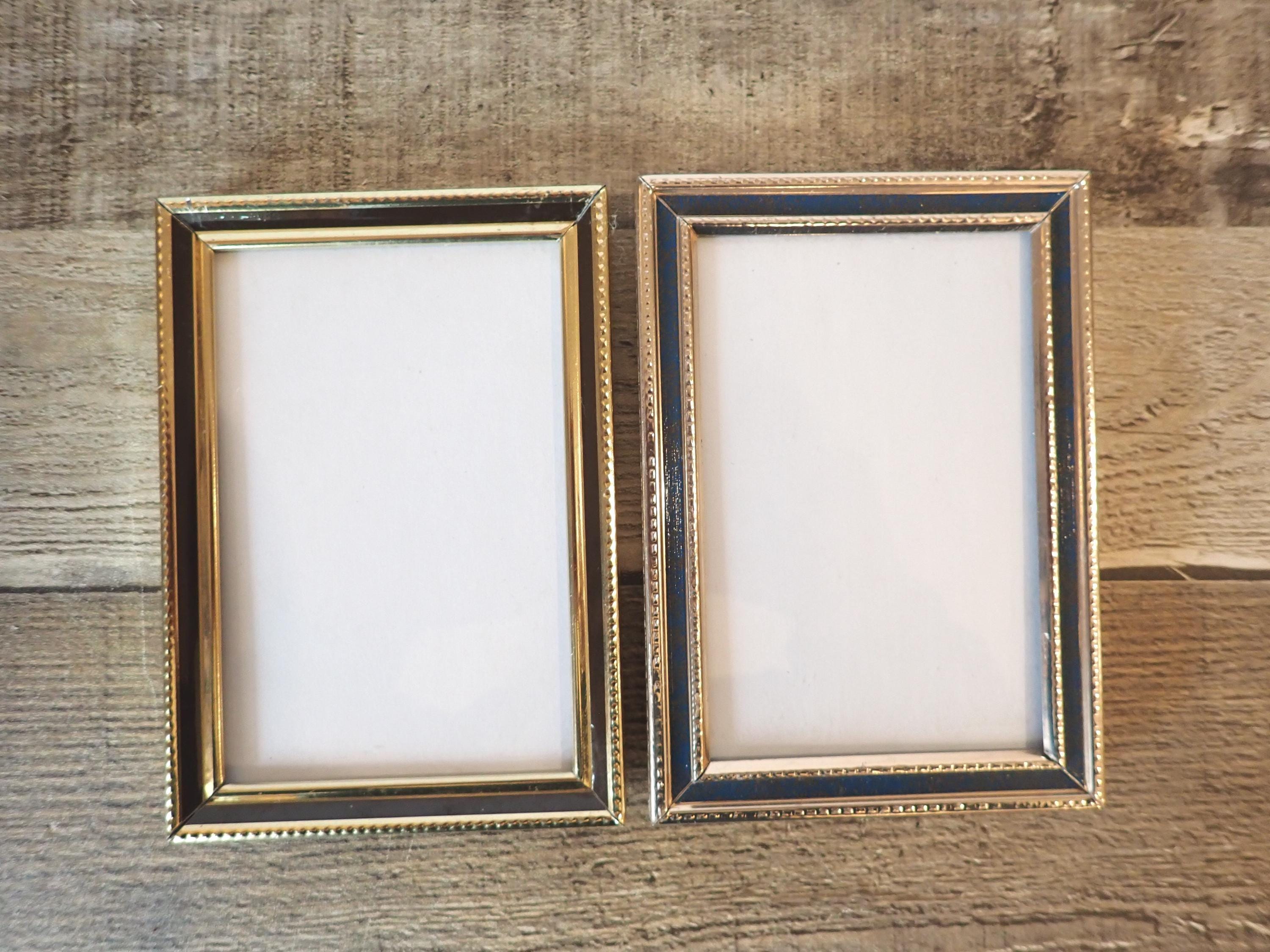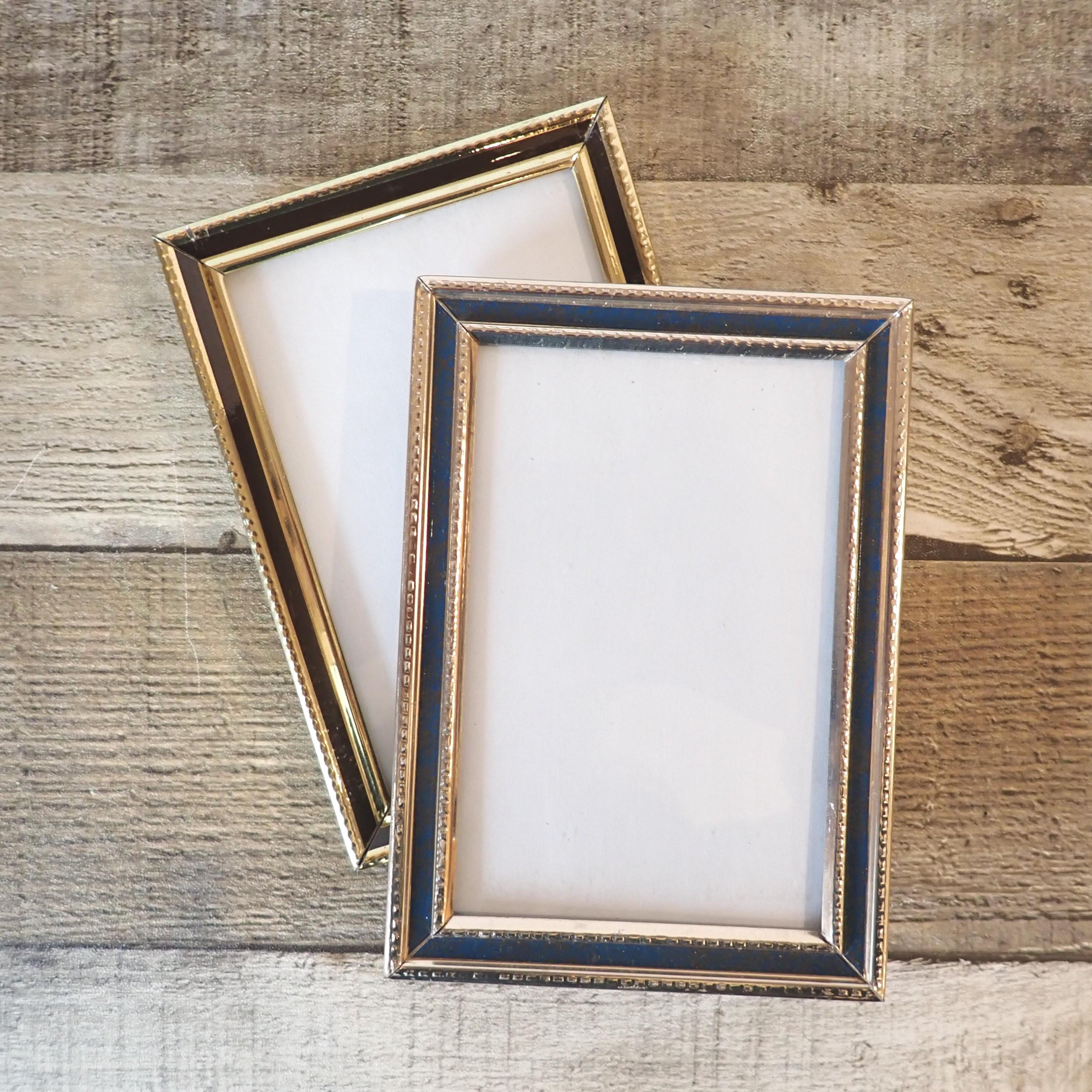 This set of brass frames includes two 3.5" x 5" frames in different designs and patterns. They are all a golden/brass colored metal, and have nicely detailed designs around the edges - one of the frames is accented with a blue band and one with a brown band around the inner rim. The overall dimensions of the frames are 3.75" by 5". They each have a clear glass insert that covers the photo opening, and a cardboard backing piece with a photo stand. There is some light tarnish on the frames here and there. Great set of vintage brass frames!