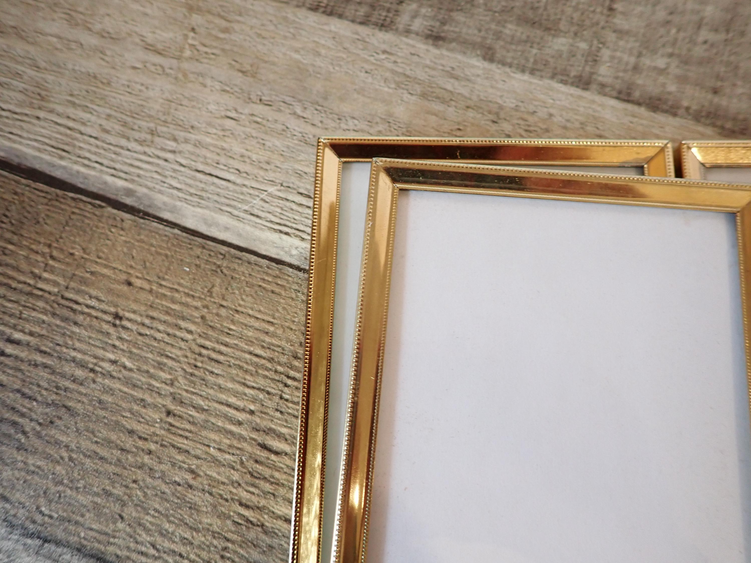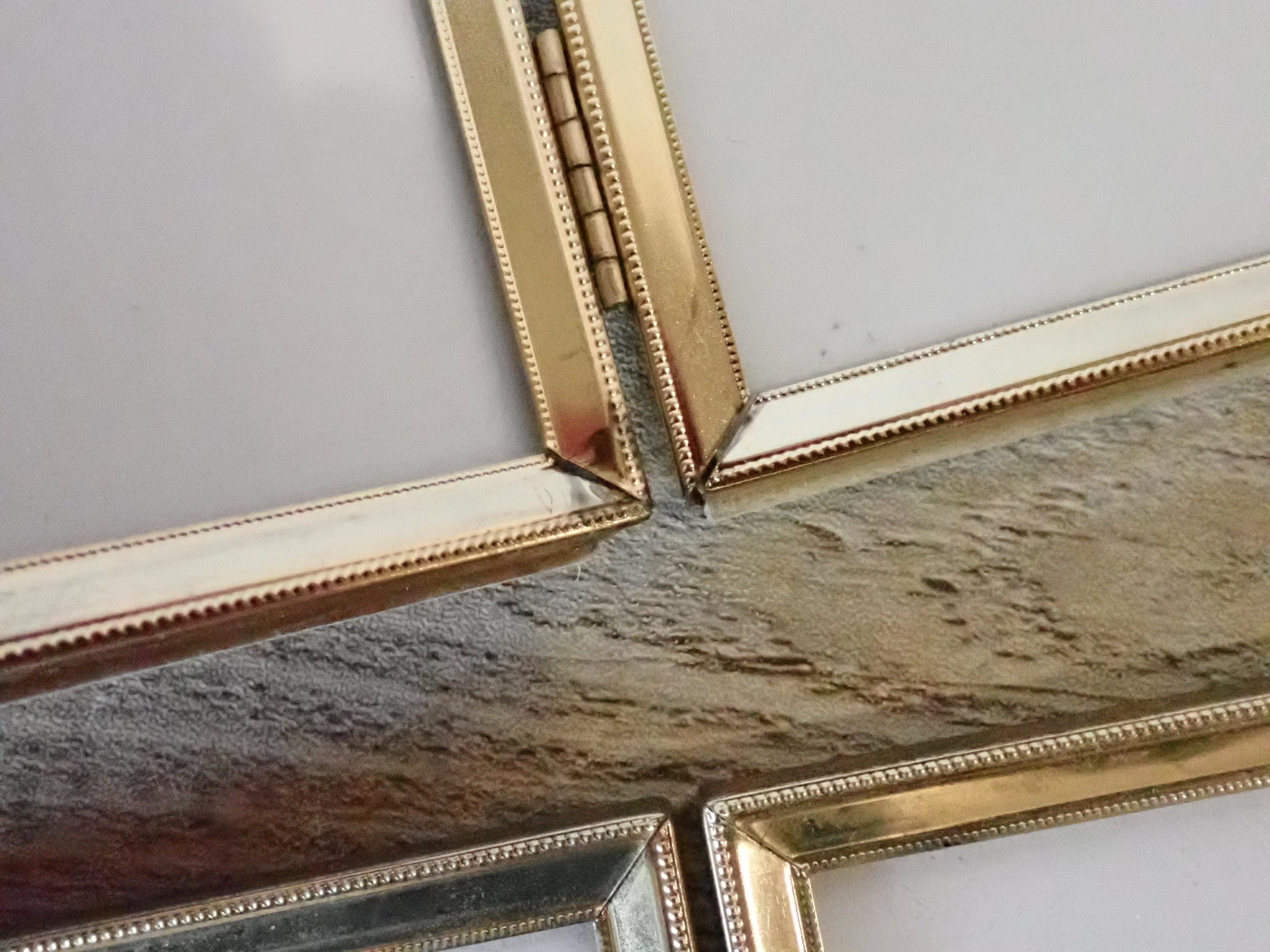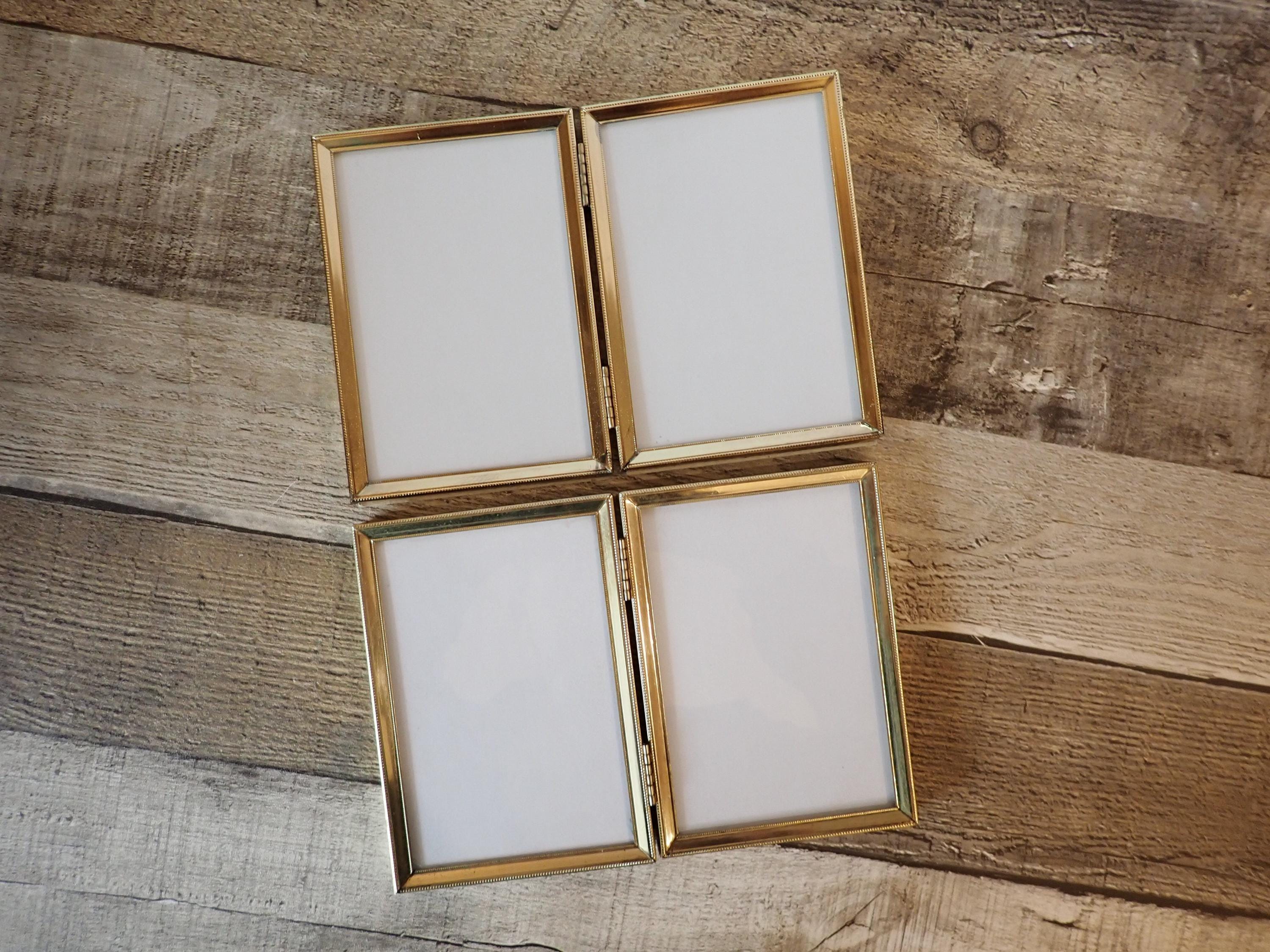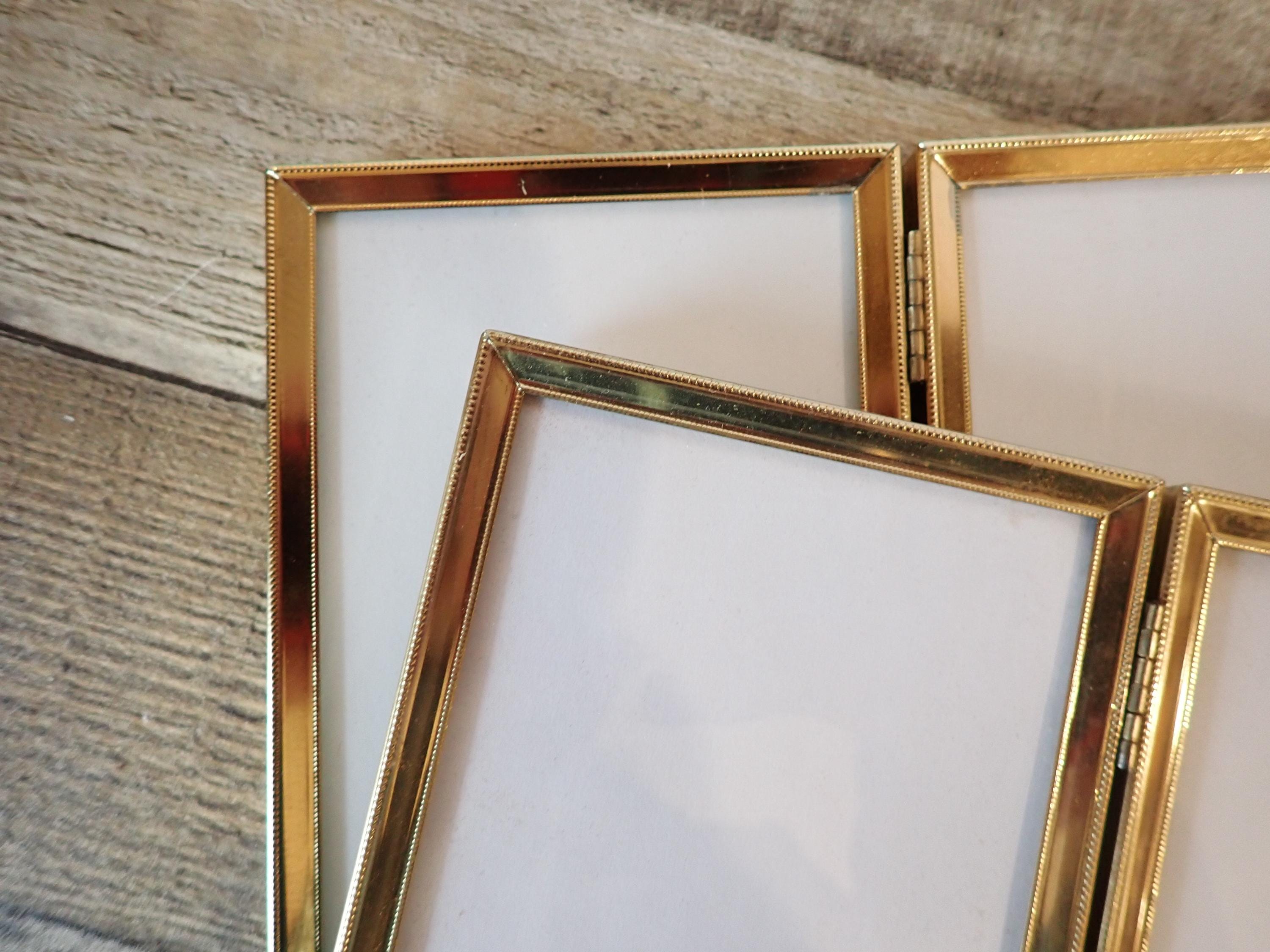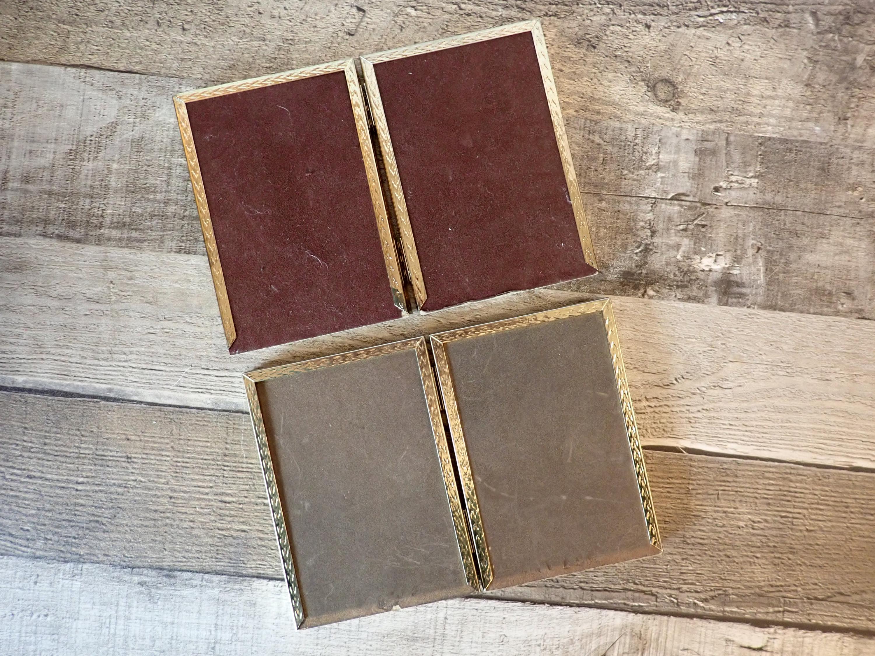 This set of brass frames includes two 3 1/2" x 5" double hinged frames in the same pattern. They are both a golden brass colored metal, and have nicely detailed designs around the edges. The overall dimensions of the frames are 7 1/2" wide by 5 1/4" tall. They each have a clear glass insert that covers the photo opening. Great set of vintage brass frames!