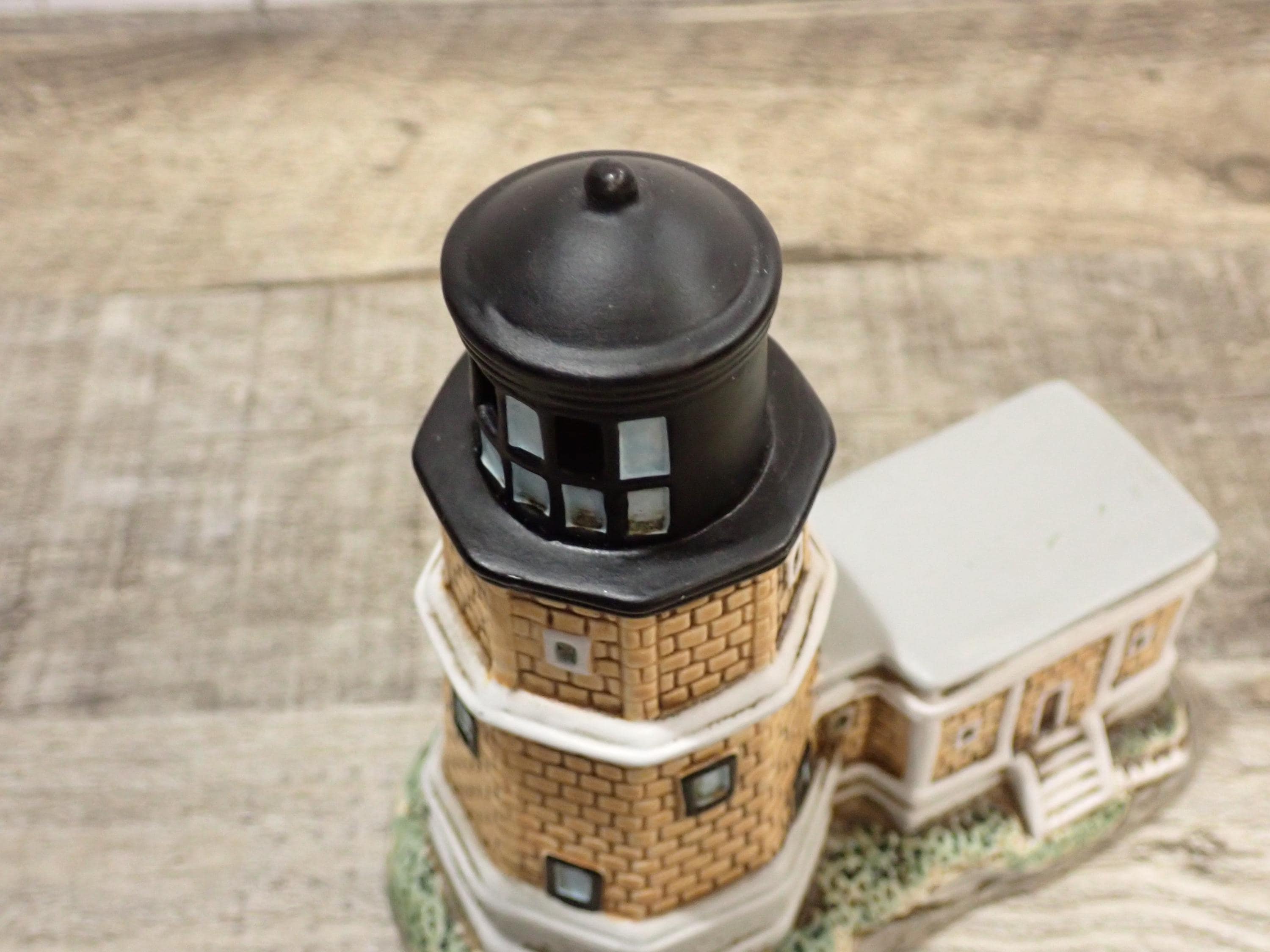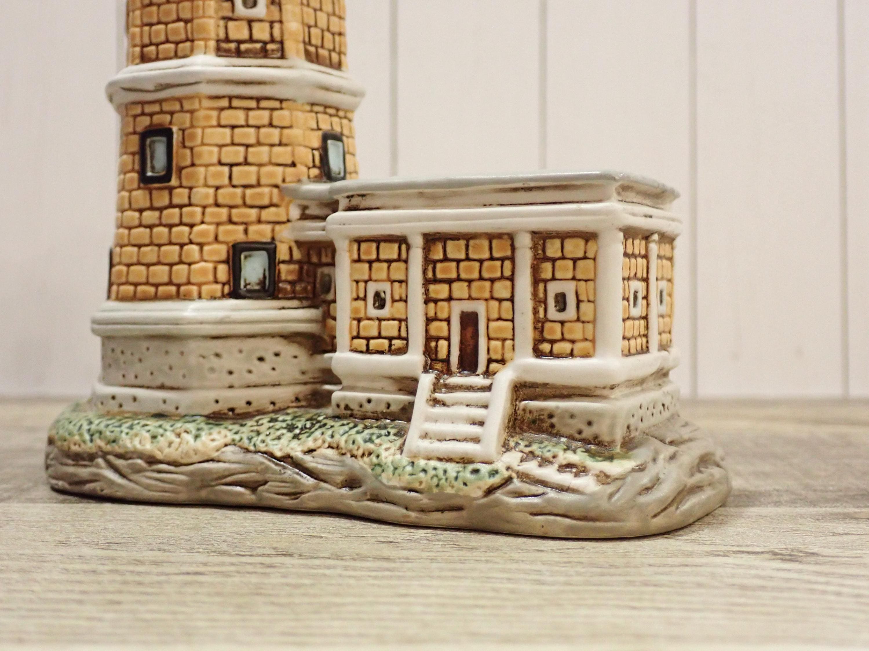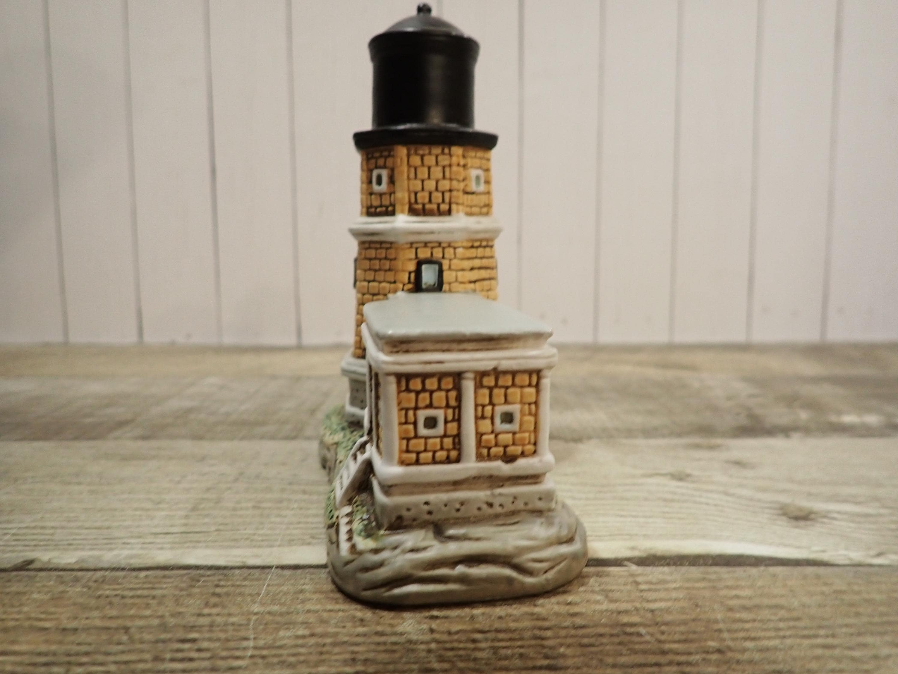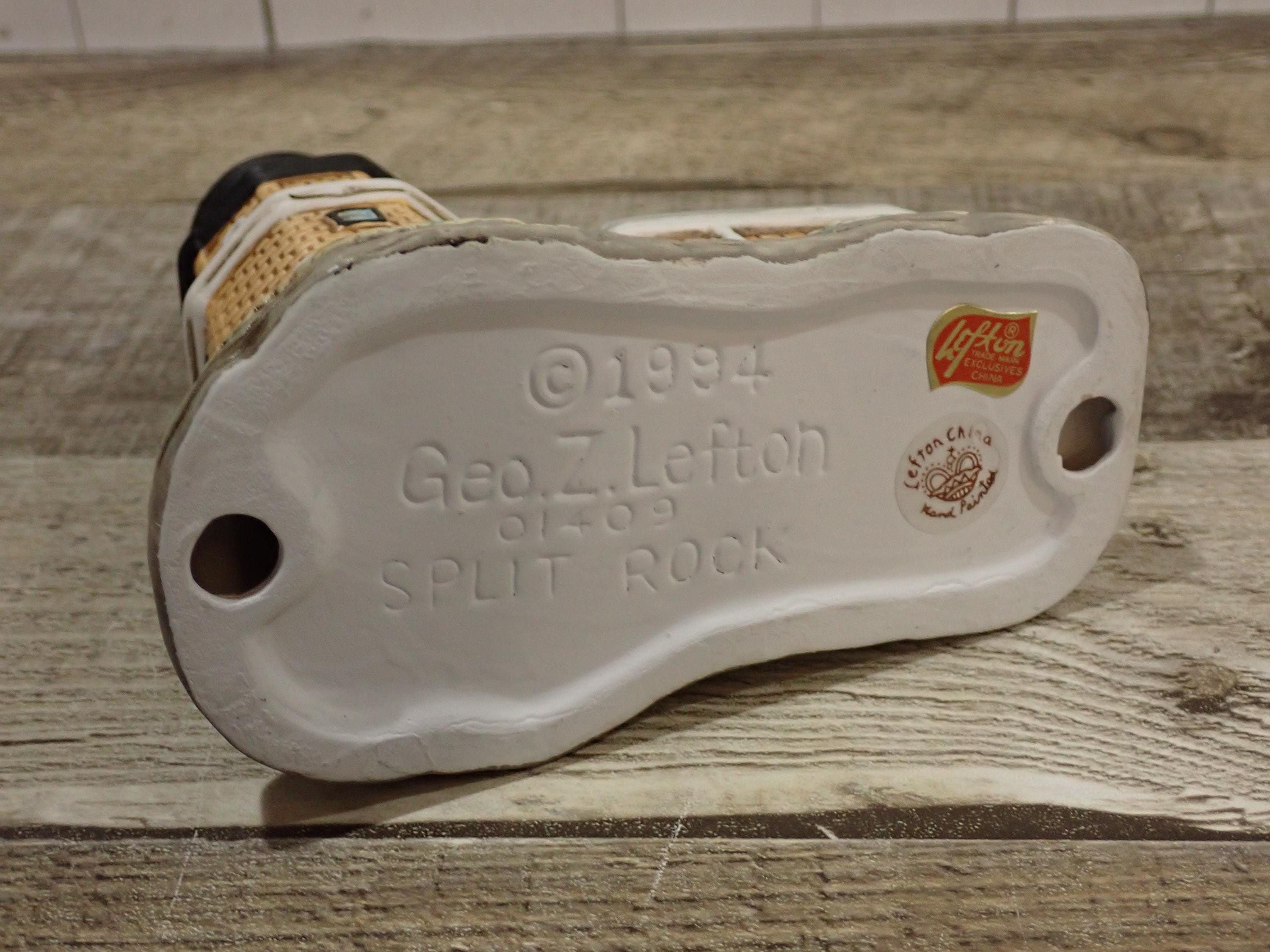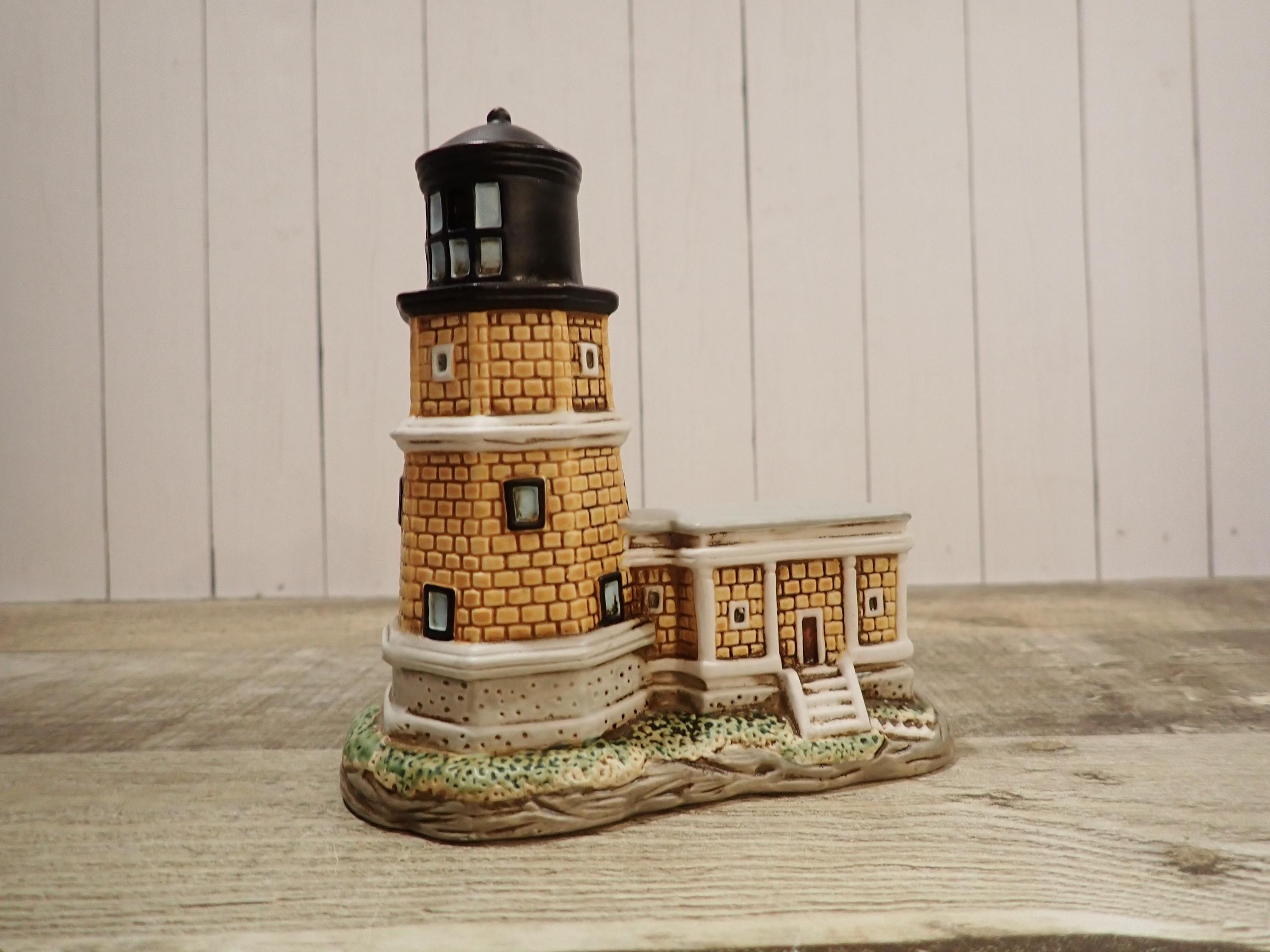 This small ceramic by Lefton is the Split Rock Lighthouse from the Great Lakes Lighthouses series. It is 5" tall and 4.75" wide. It is a ceramic lighthouse with tan brick design. The bottom is marked: 1994 / Geo. Z. Lefton / 01409/ SPLIT ROCK. There is also an original Lefton label. The lighthouse is in very good condition with no chips or cracks.